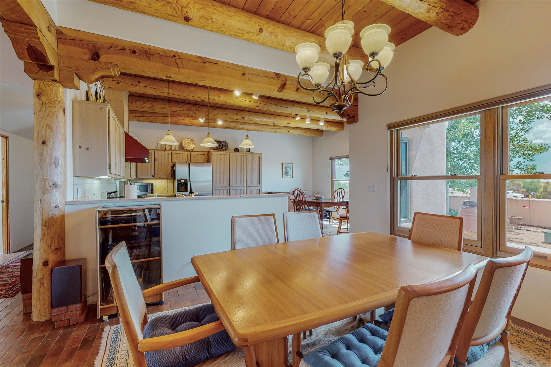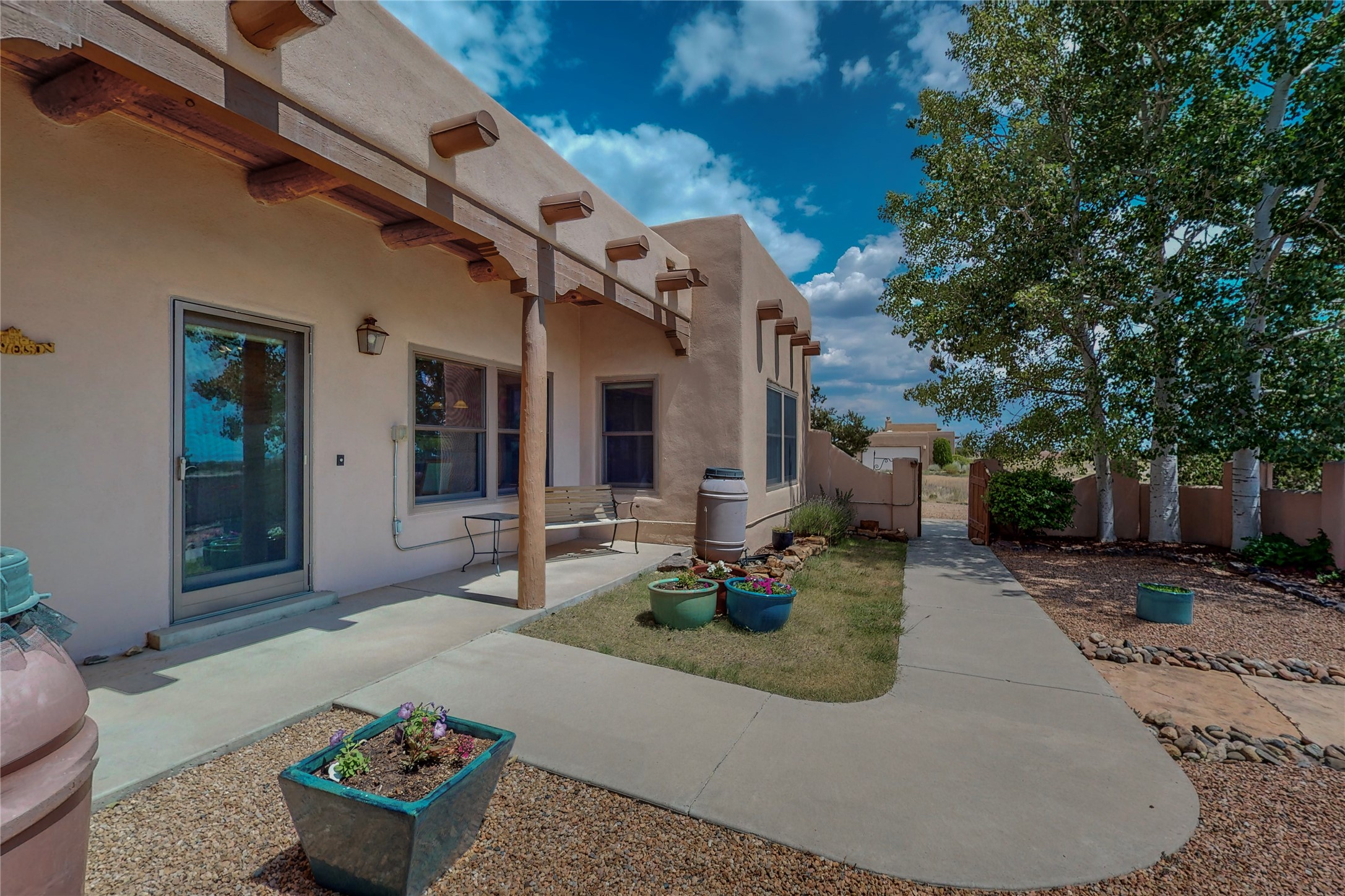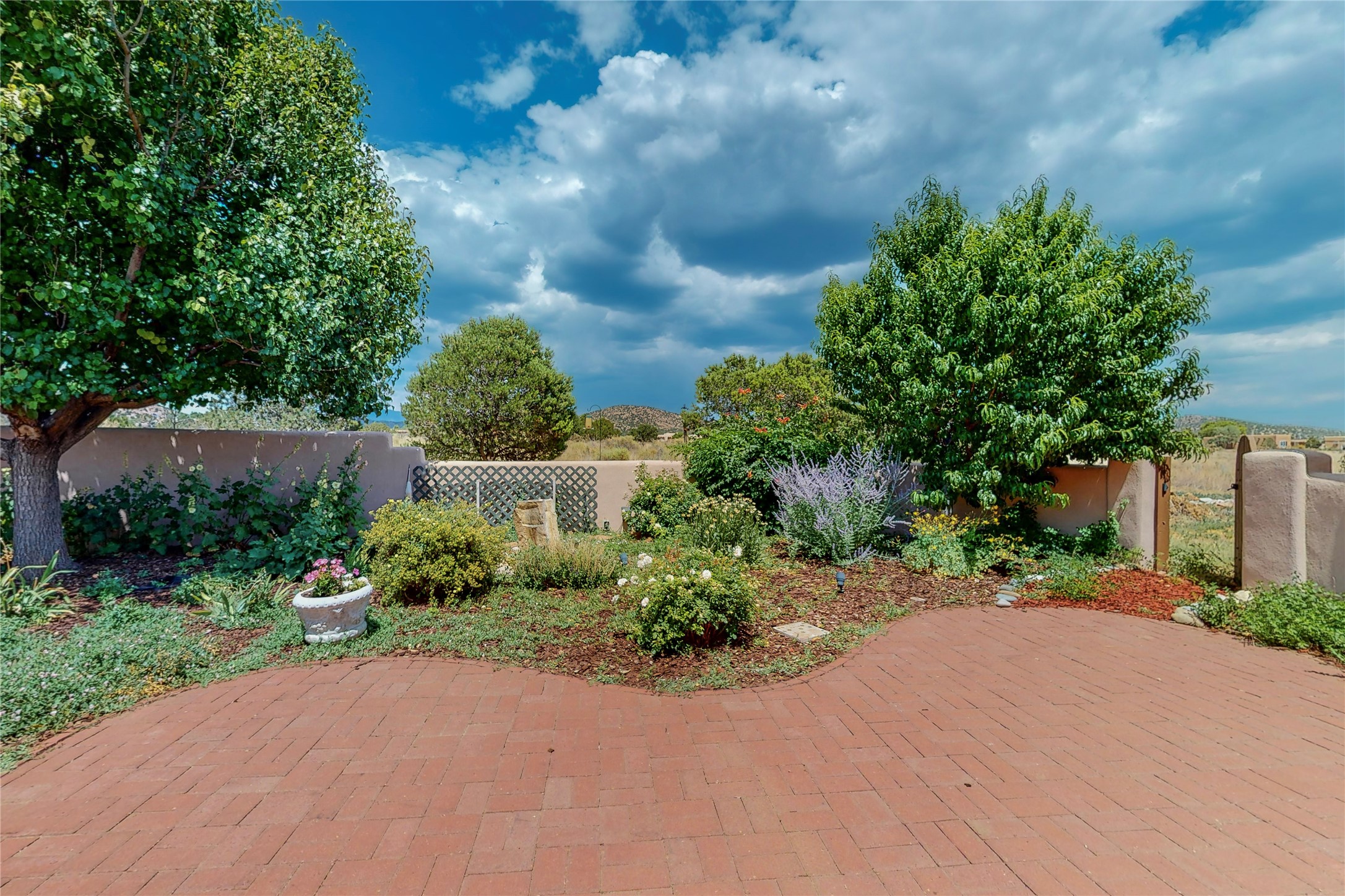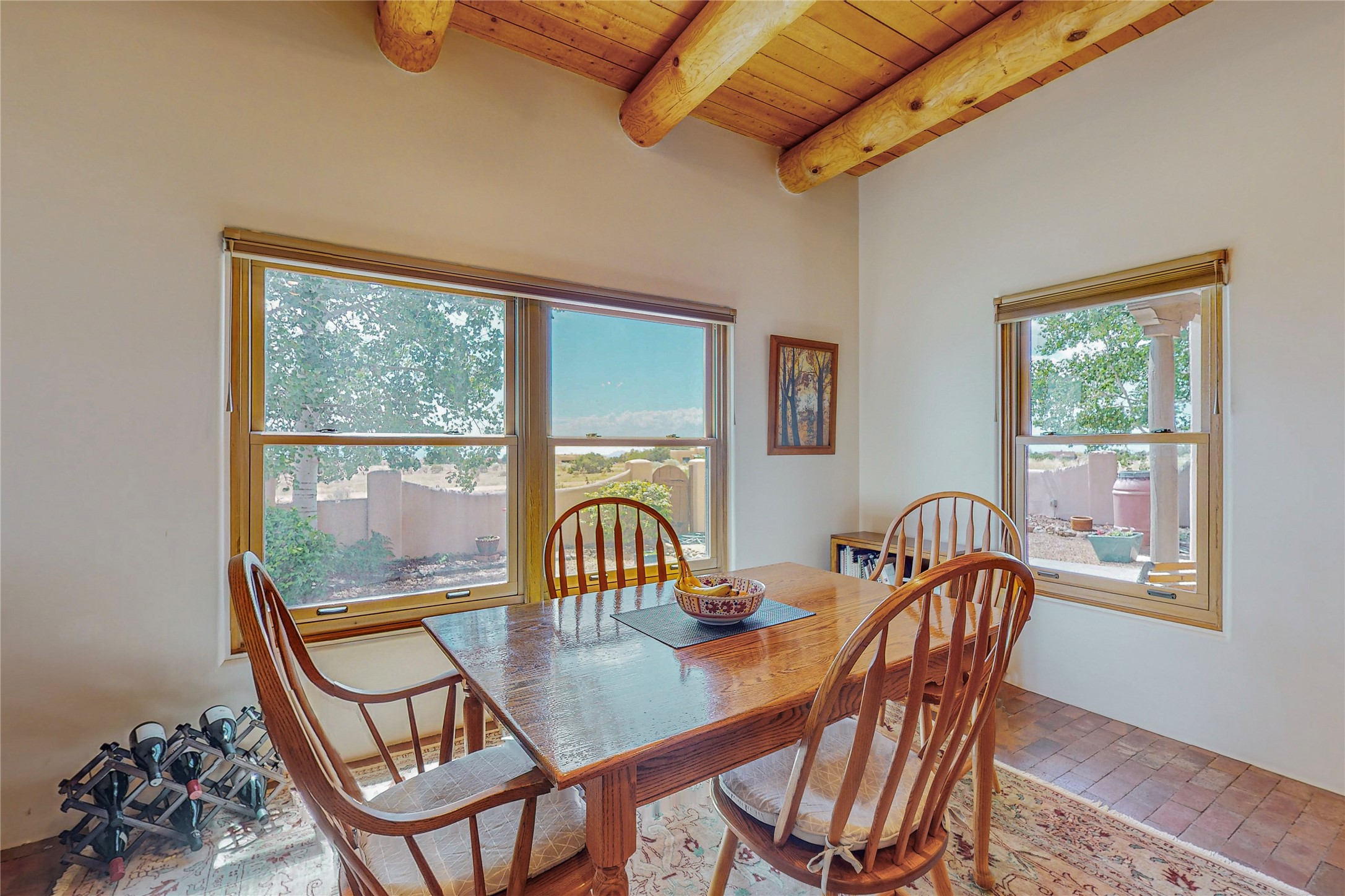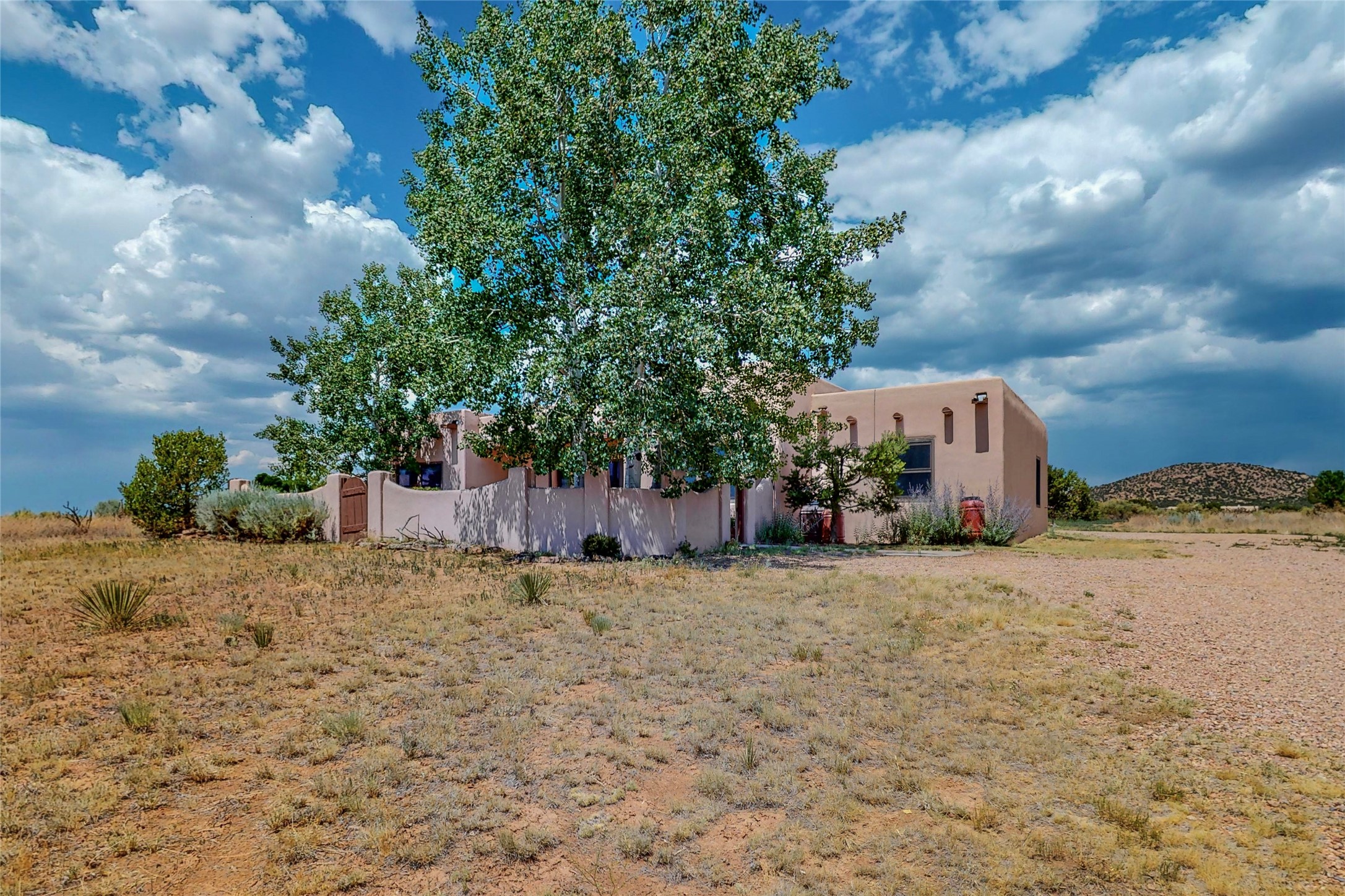 Outstanding mountain views from this lovely custom designed and built Eldorado home. Split 3 bedroom, 2 full bath open floorplan with high ceilings creating a welcoming light and spacious feel throughout. The living areas are graced with viga beam ceilings and dramatic kiva fireplace. An entertainers kitchen features an impressive Viking range and hood plus tons of cabinetry storage and is open to a large formal dining area. A poetic barrel ceiling gallery hallway connects the guest suite and office totally separate to the owners suite. There is a 6 zone, natural gas radiant heating system and a swamp cooler for the summer heat. Gracious walled gardens, portal and patios with expansive mountain views to the north, west and southwest sunsets to help you relax and enjoy country living. This carefully maintained home is close to local shopping, accesses the main roads into Santa Fe and also is close to all the trails, pool, parks and many recreational amenities Eldorado provides its members. Come be a part of our vibrant, active welcoming Eldorado community.
