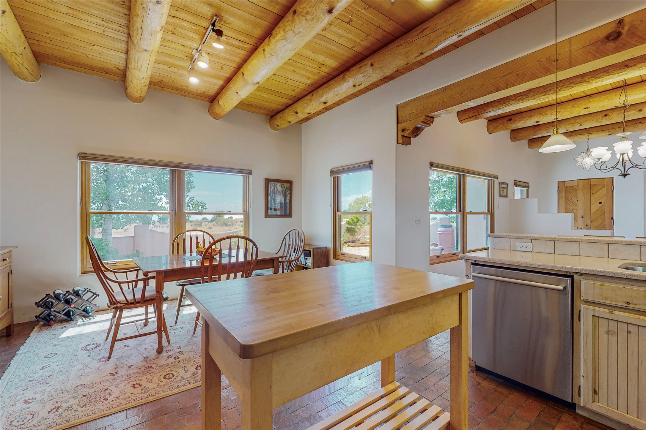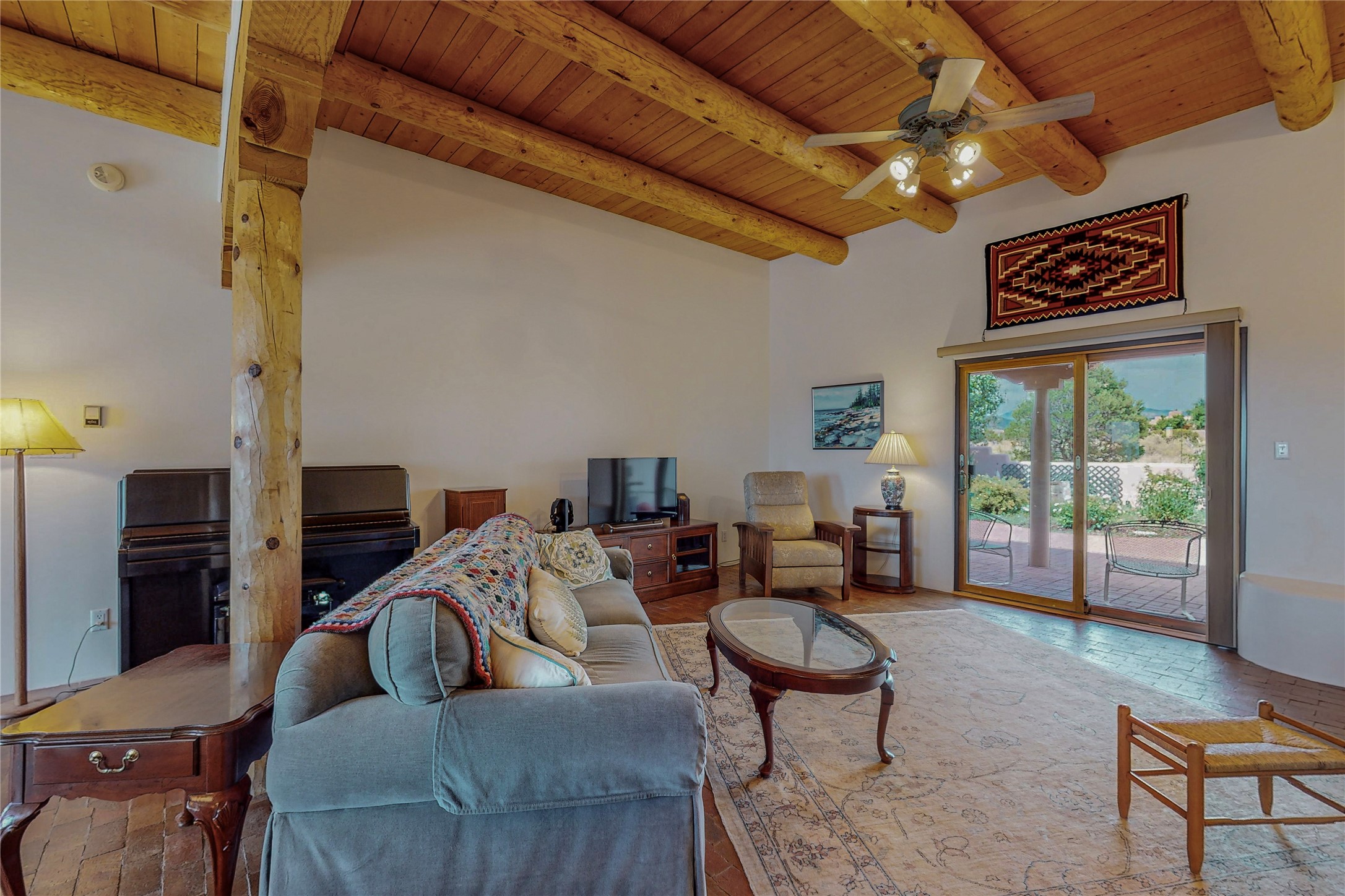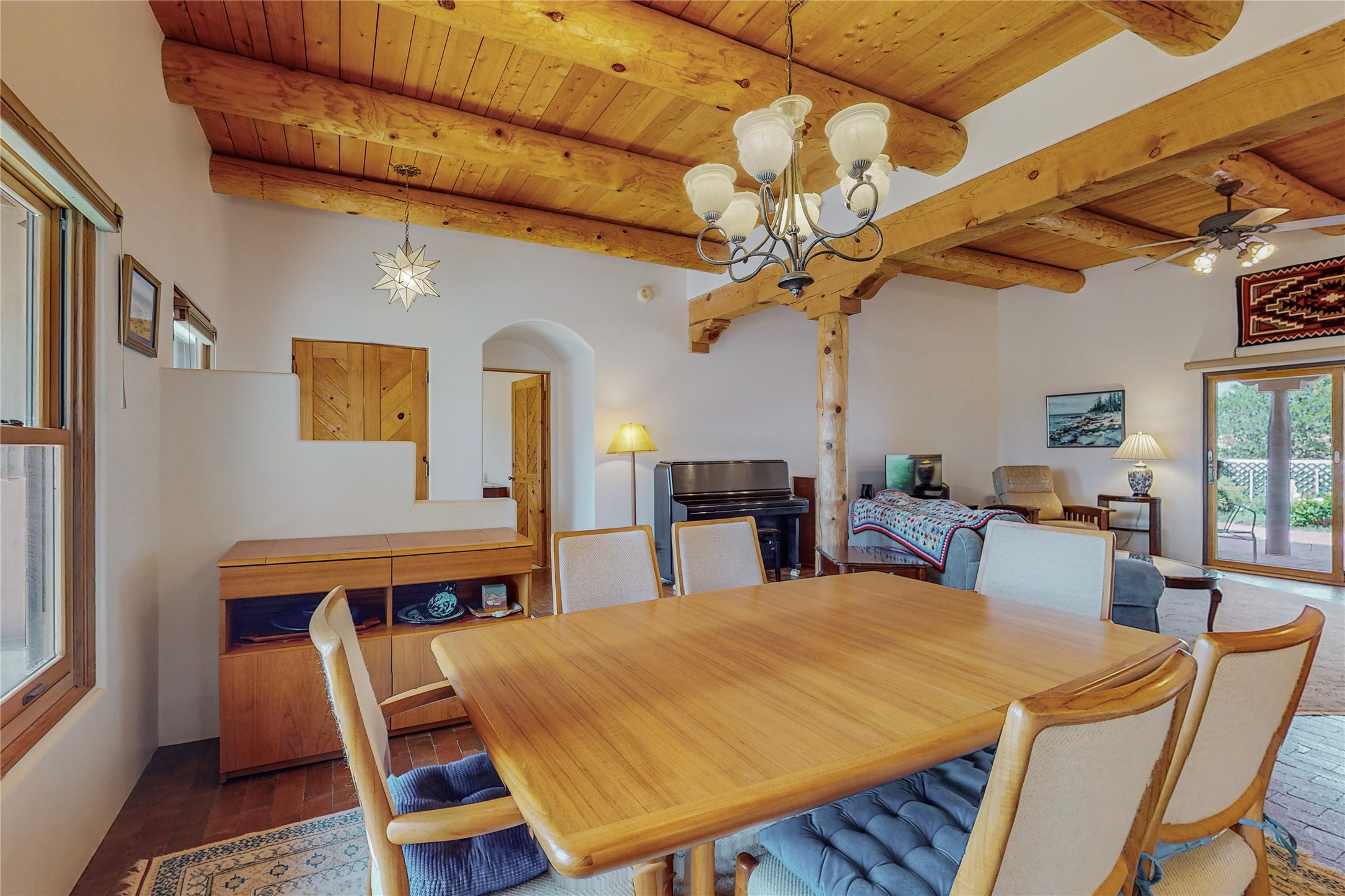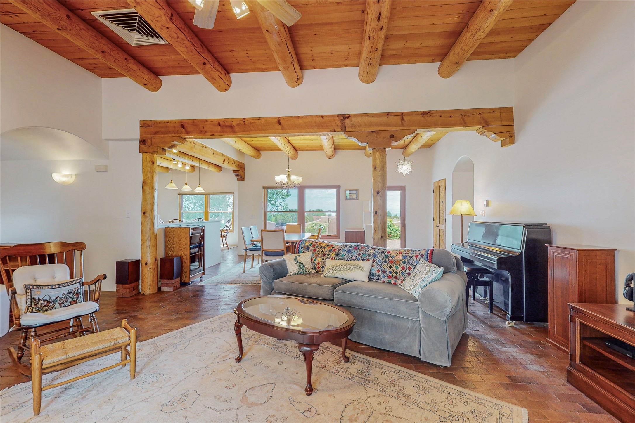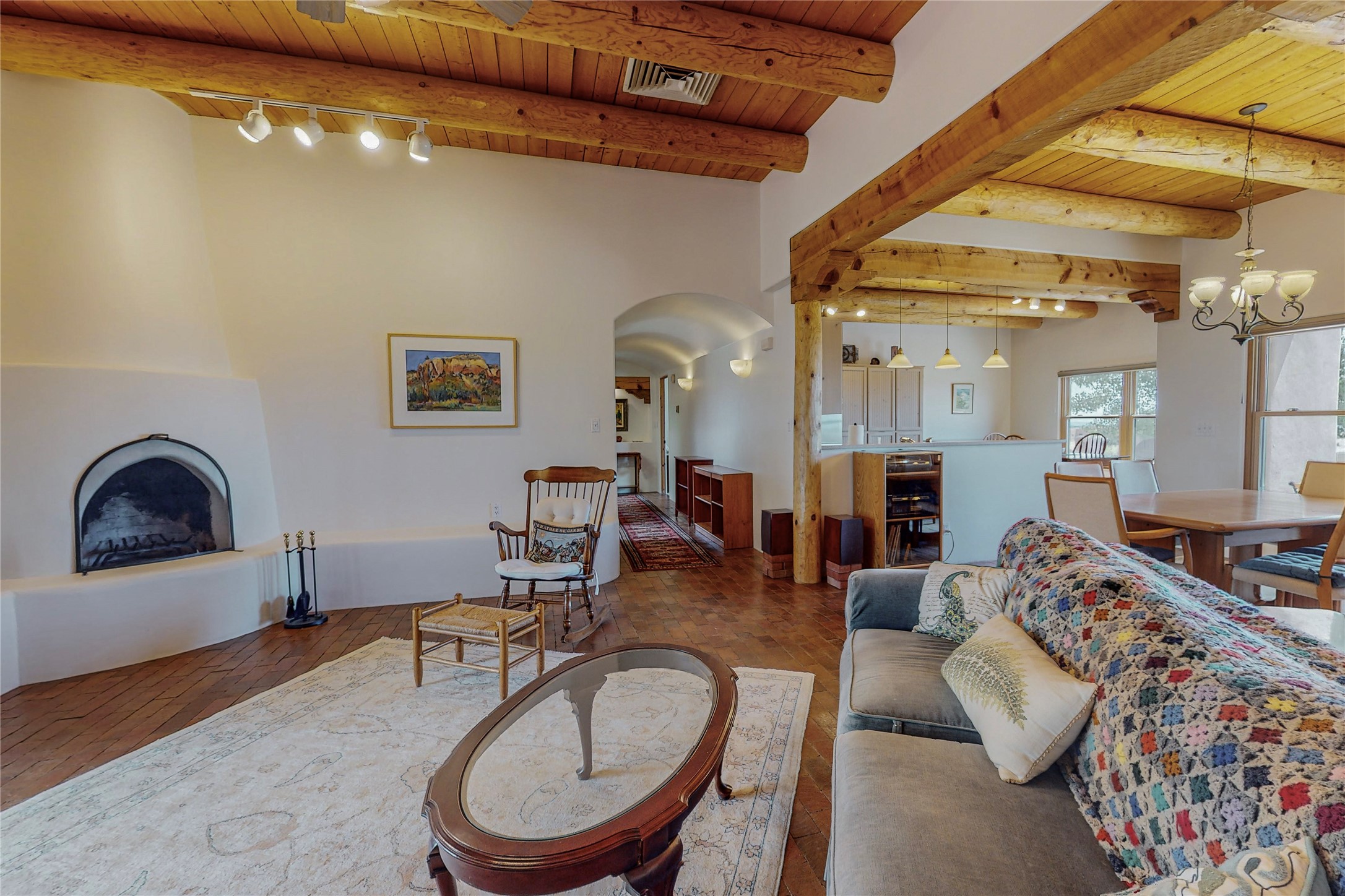 Outstanding mountain views from this lovely custom designed and built Eldorado home. Split 3 bedroom, 2 full bath open floorplan with high ceilings creating a welcoming light and spacious feel throughout. The living areas are graced with viga beam ceilings and dramatic kiva fireplace. An entertainers kitchen features an impressive Viking range and hood plus tons of cabinetry storage and is open to a large formal dining area. A poetic barrel ceiling gallery hallway connects the guest suite and office totally separate to the owners suite. There is a 6 zone, natural gas radiant heating system and a swamp cooler for the summer heat. Gracious walled gardens, portal and patios with expansive mountain views to the north, west and southwest sunsets to help you relax and enjoy country living. This carefully maintained home is close to local shopping, accesses the main roads into Santa Fe and also is close to all the trails, pool, parks and many recreational amenities Eldorado provides its members. Come be a part of our vibrant, active welcoming Eldorado community.