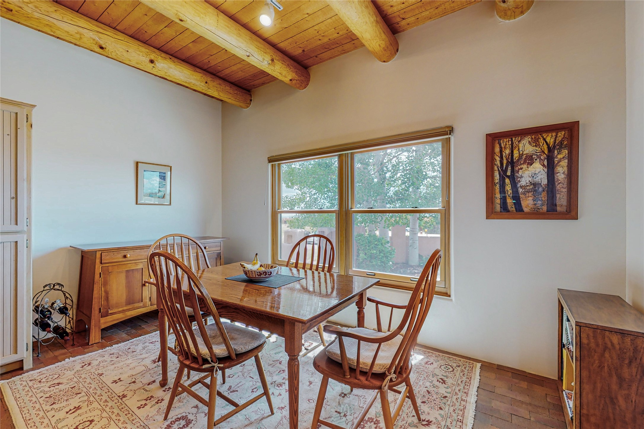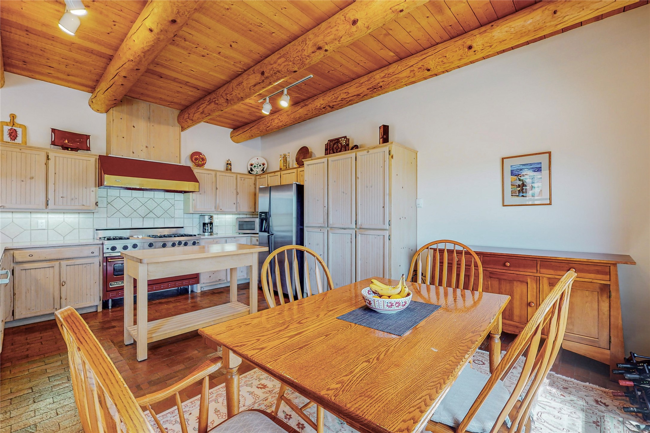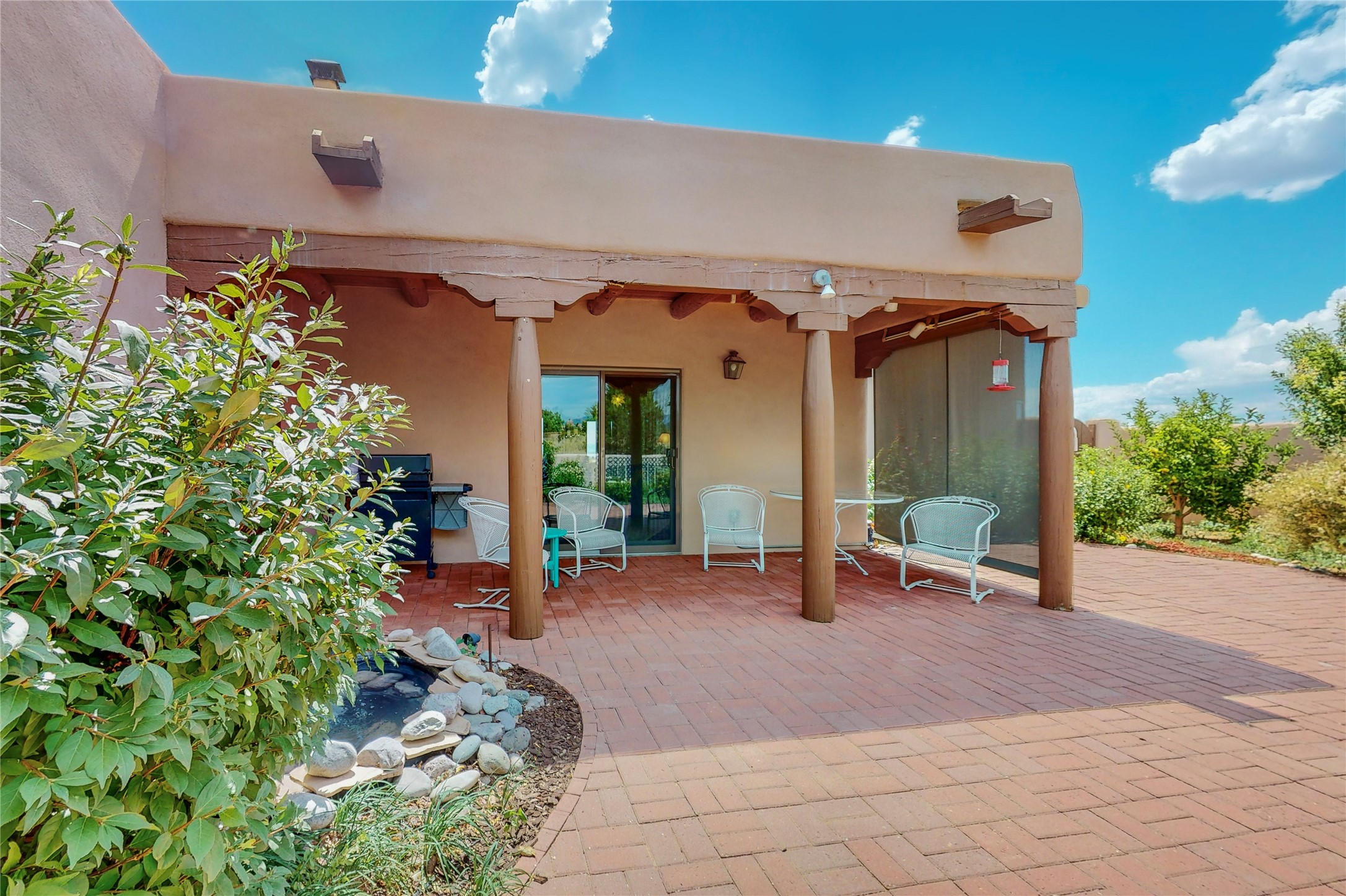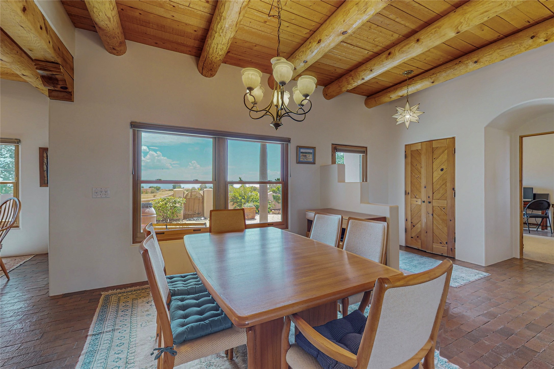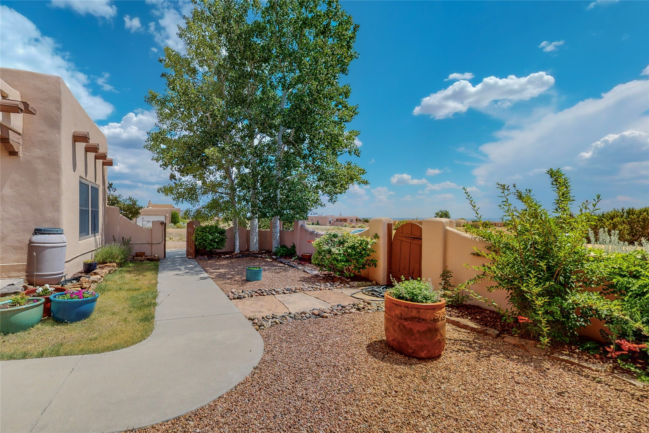 Outstanding mountain views from this lovely custom designed and built Eldorado home. Split 3 bedroom, 2 full bath open floorplan with high ceilings creating a welcoming light and spacious feel throughout. The living areas are graced with viga beam ceilings and dramatic kiva fireplace. An entertainers kitchen features an impressive Viking range and hood plus tons of cabinetry storage and is open to a large formal dining area. A poetic barrel ceiling gallery hallway connects the guest suite and office totally separate to the owners suite. There is a 6 zone, natural gas radiant heating system and a swamp cooler for the summer heat. Gracious walled gardens, portal and patios with expansive mountain views to the north, west and southwest sunsets to help you relax and enjoy country living. This carefully maintained home is close to local shopping, accesses the main roads into Santa Fe and also is close to all the trails, pool, parks and many recreational amenities Eldorado provides its members. Come be a part of our vibrant, active welcoming Eldorado community.