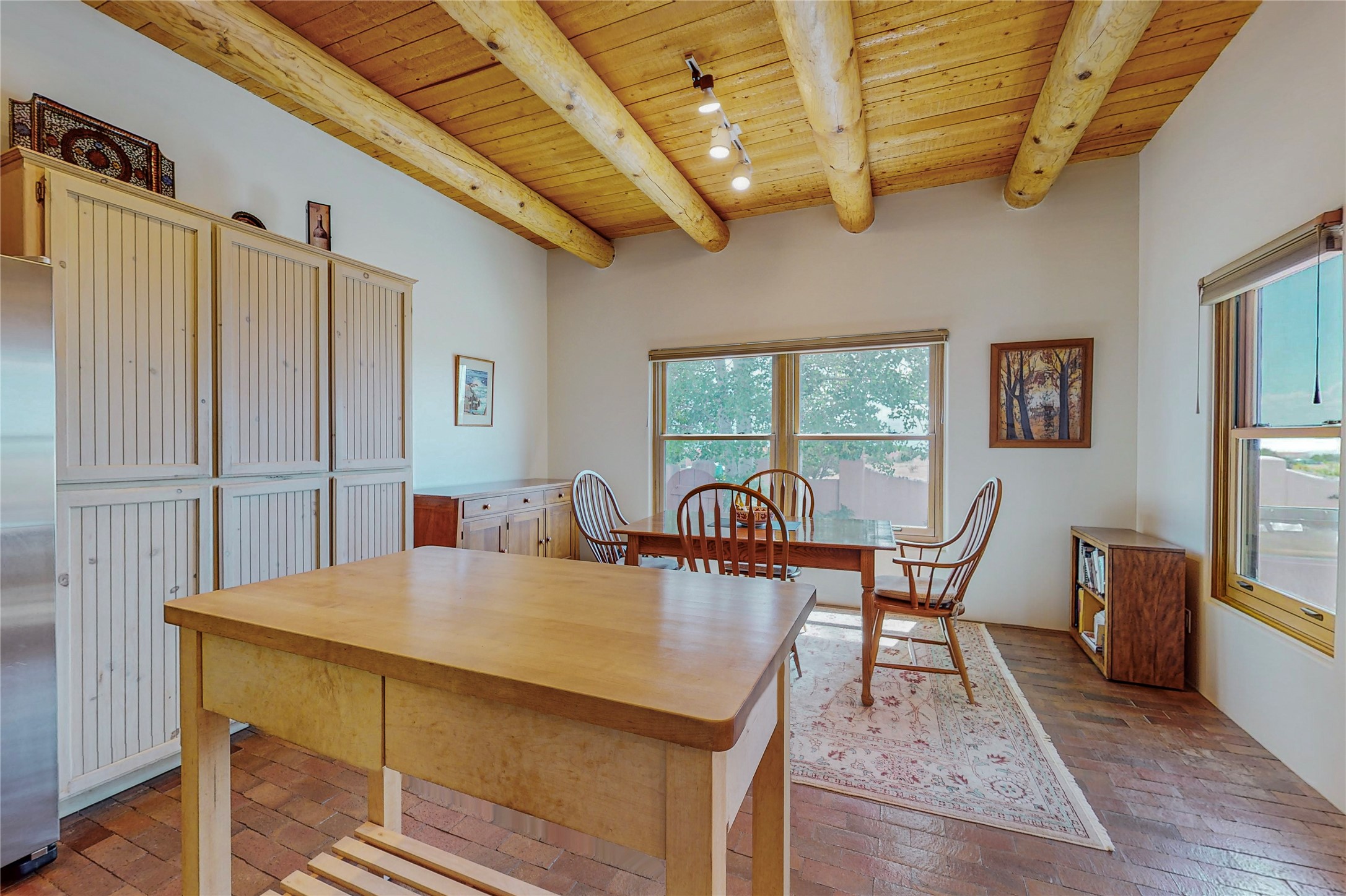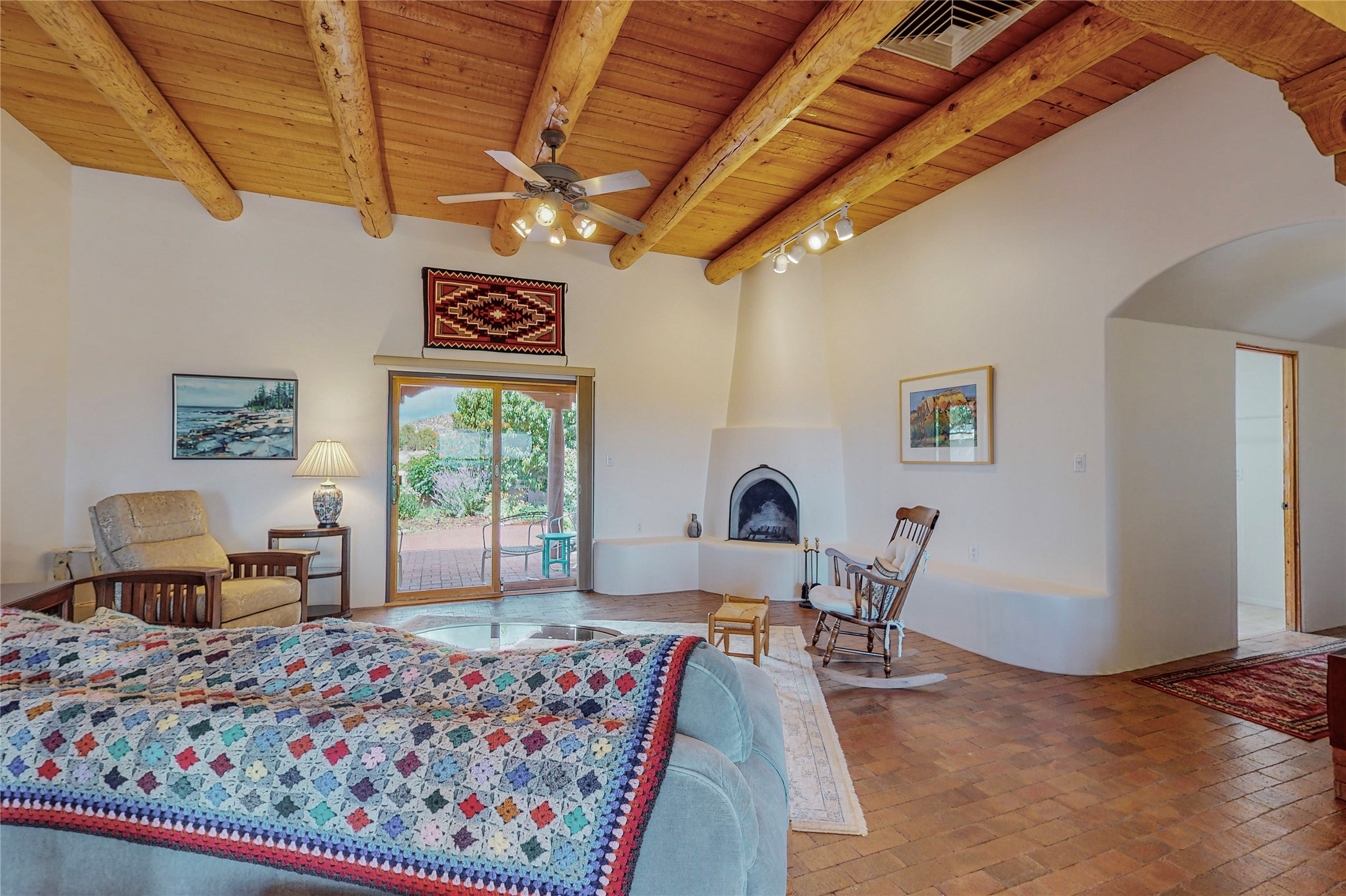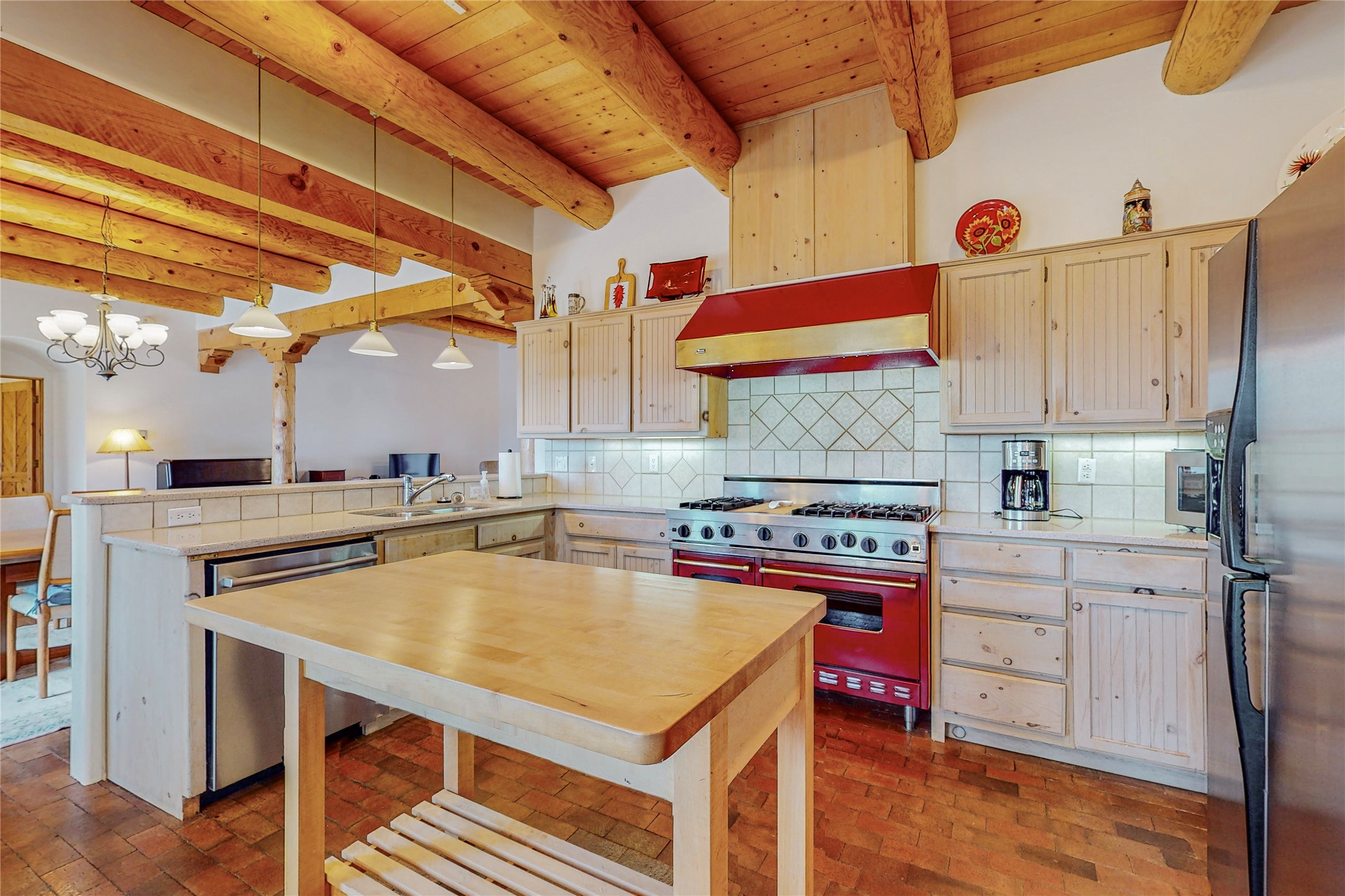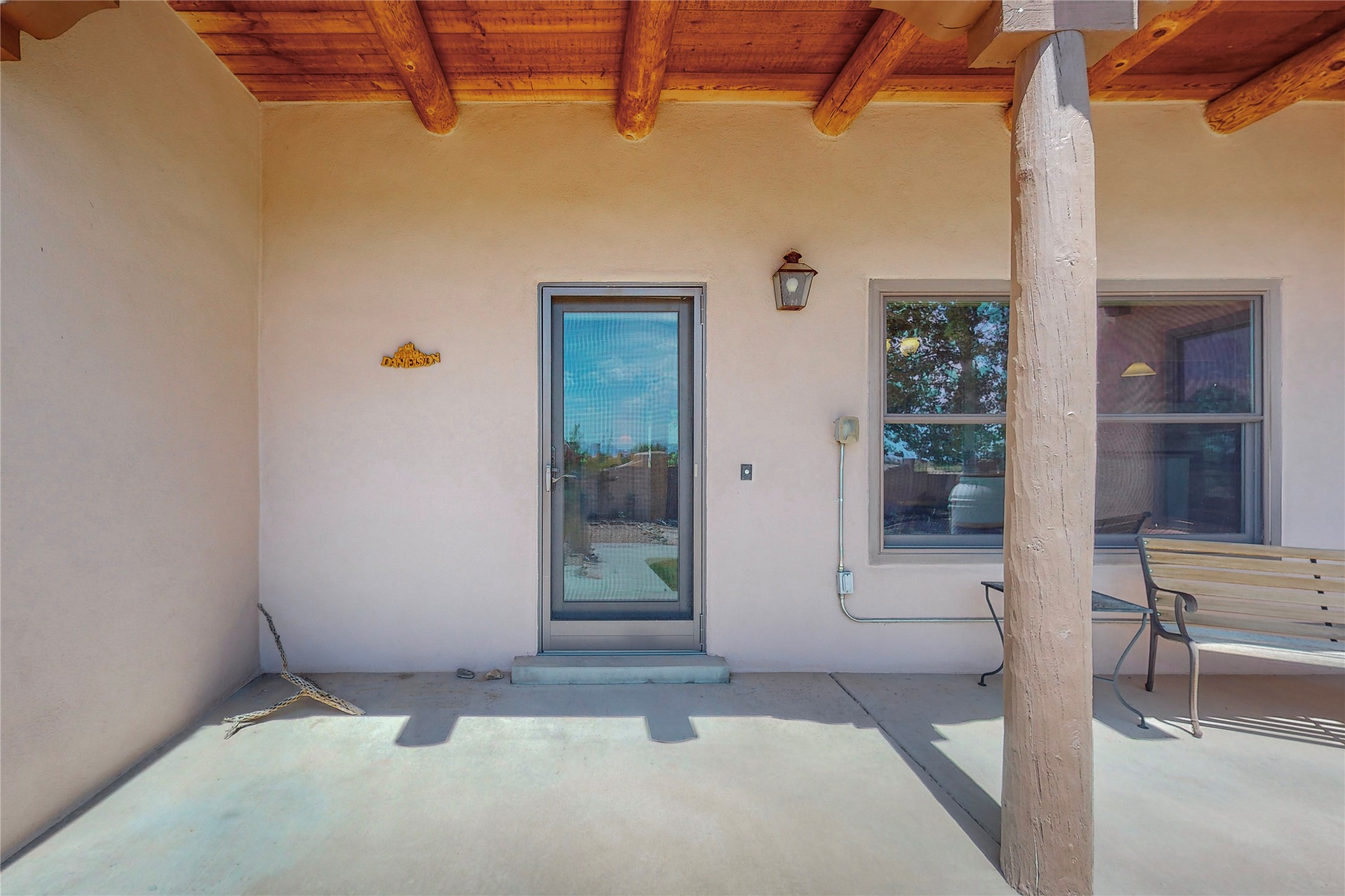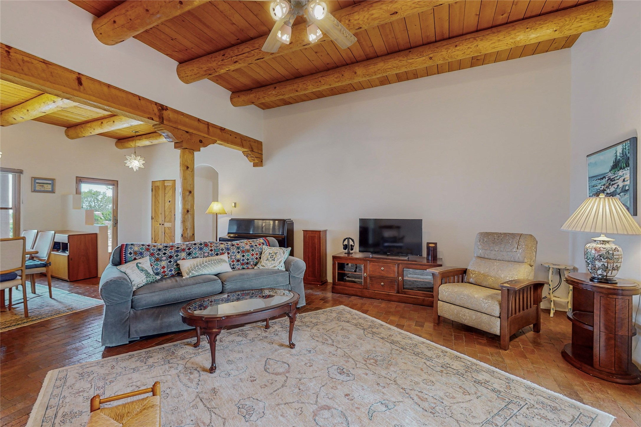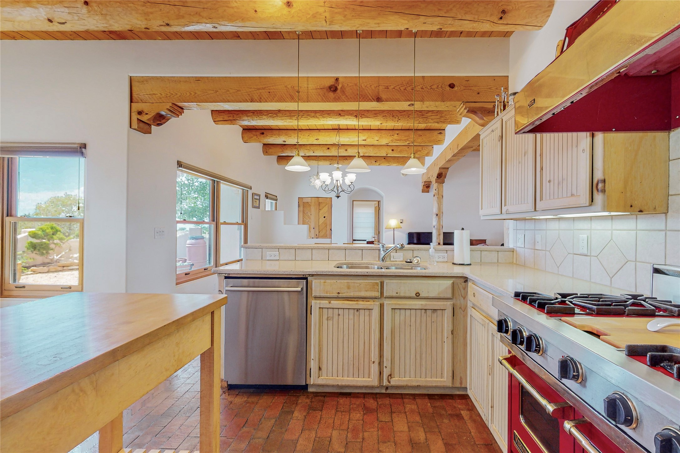 Outstanding mountain views from this lovely custom designed and built Eldorado home. Split 3 bedroom, 2 full bath open floorplan with high ceilings creating a welcoming light and spacious feel throughout. The living areas are graced with viga beam ceilings and dramatic kiva fireplace. An entertainers kitchen features an impressive Viking range and hood plus tons of cabinetry storage and is open to a large formal dining area. A poetic barrel ceiling gallery hallway connects the guest suite and office totally separate to the owners suite. There is a 6 zone, natural gas radiant heating system and a swamp cooler for the summer heat. Gracious walled gardens, portal and patios with expansive mountain views to the north, west and southwest sunsets to help you relax and enjoy country living. This carefully maintained home is close to local shopping, accesses the main roads into Santa Fe and also is close to all the trails, pool, parks and many recreational amenities Eldorado provides its members. Come be a part of our vibrant, active welcoming Eldorado community.