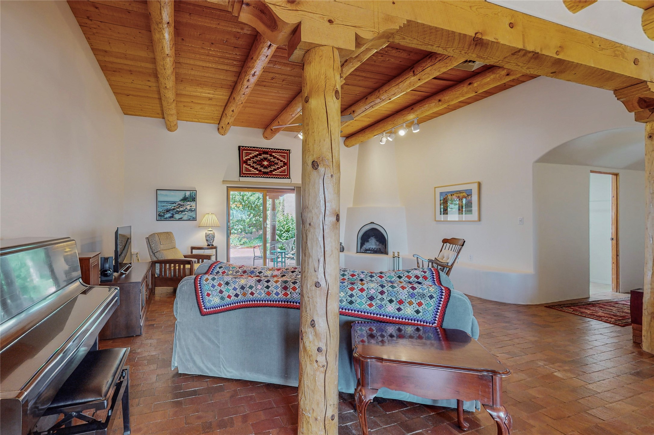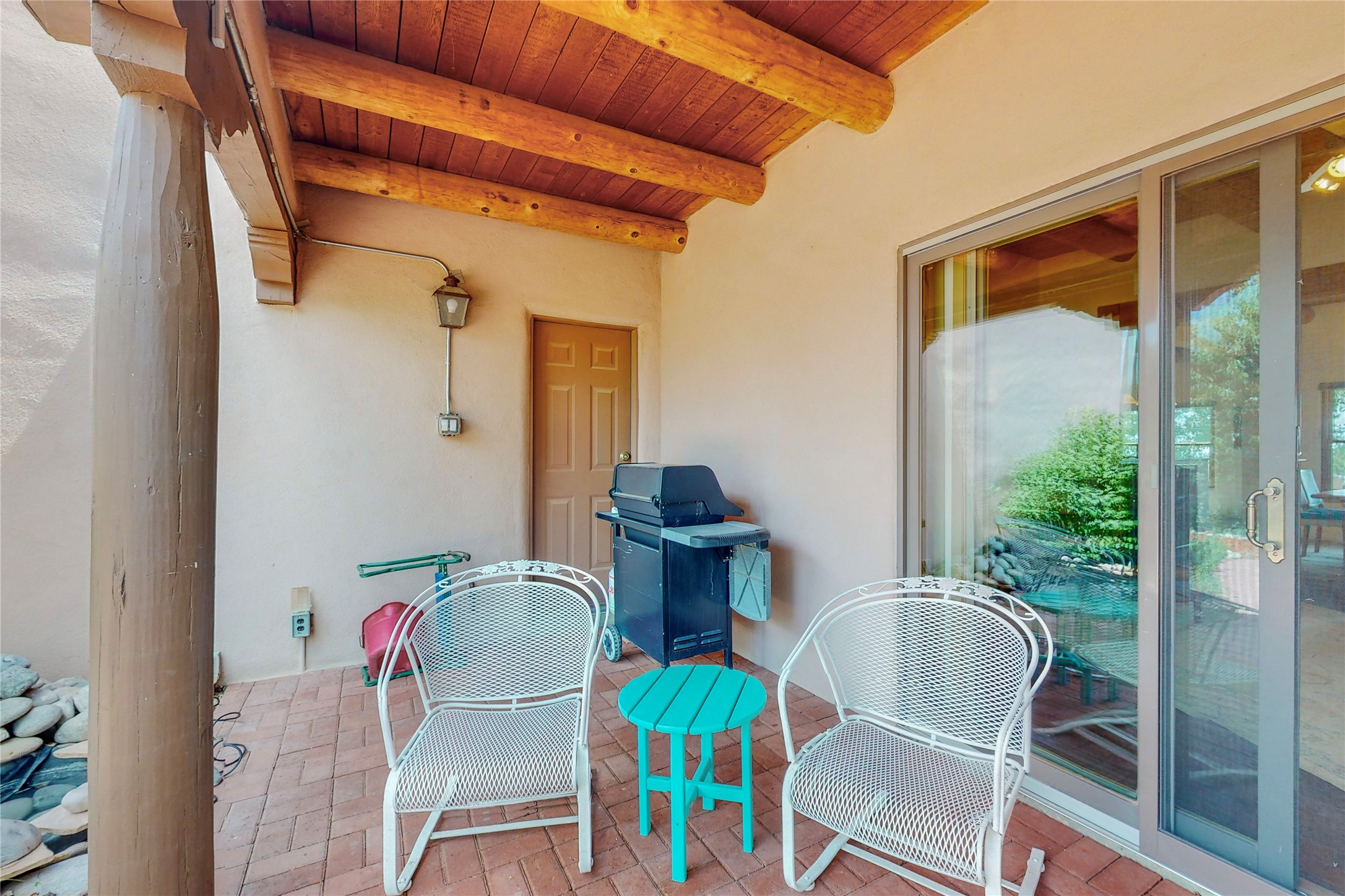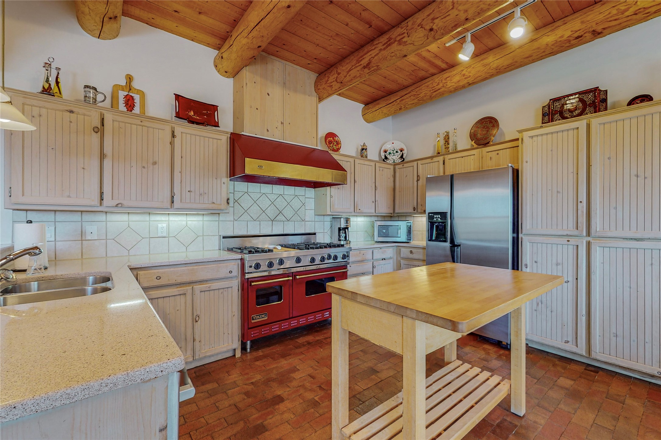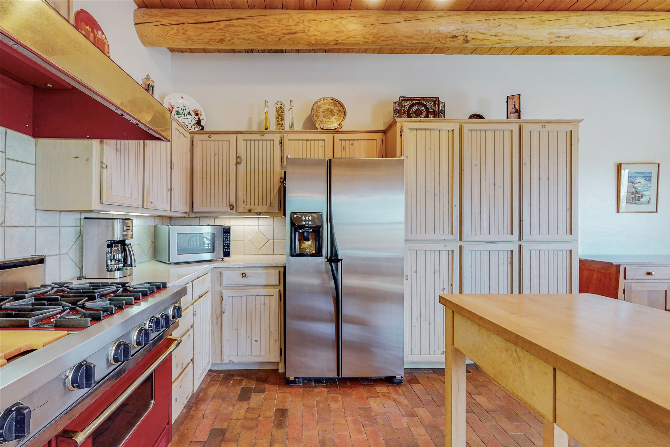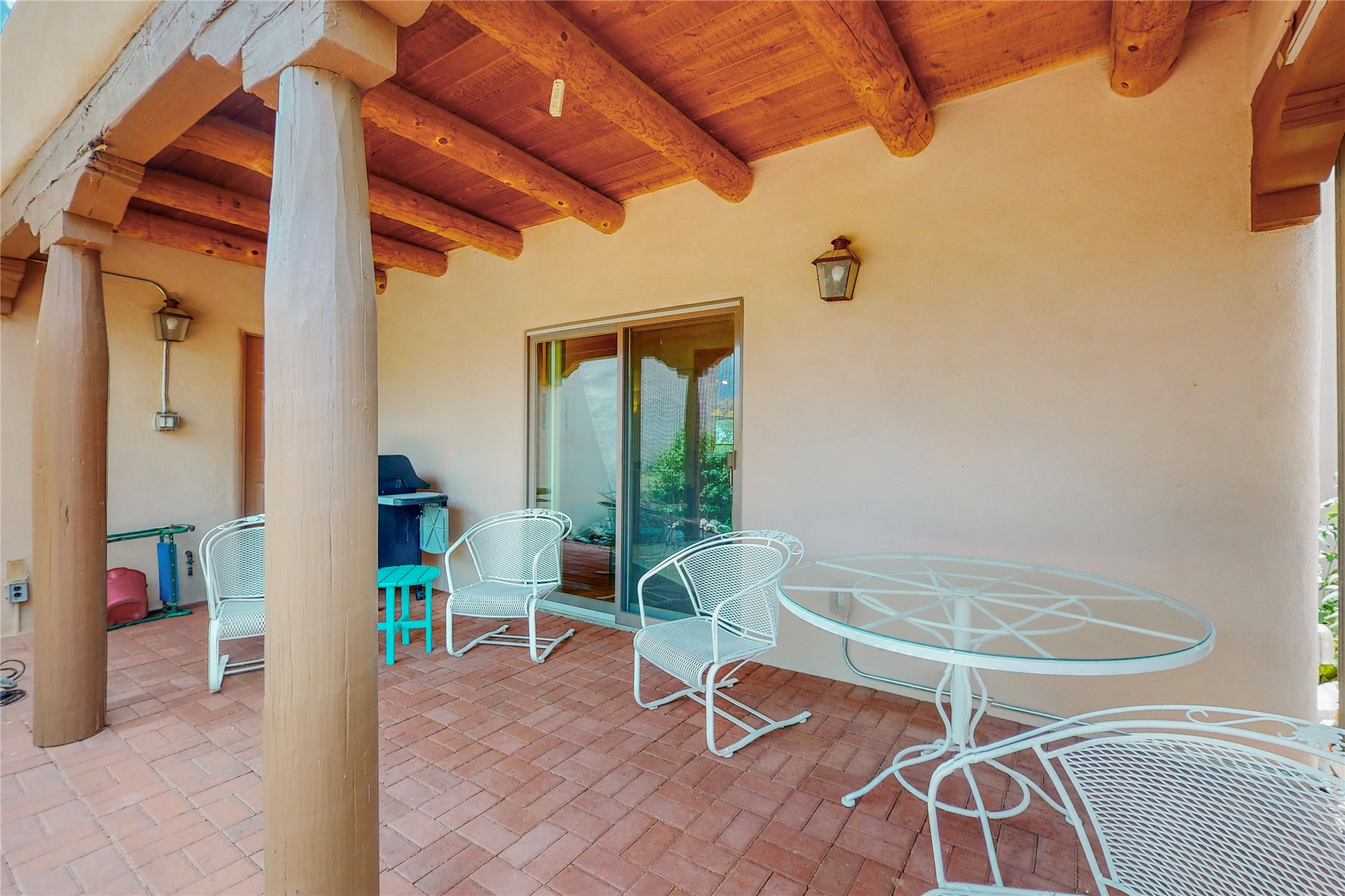 Outstanding mountain views from this lovely custom designed and built Eldorado home. Split 3 bedroom, 2 full bath open floorplan with high ceilings creating a welcoming light and spacious feel throughout. The living areas are graced with viga beam ceilings and dramatic kiva fireplace. An entertainers kitchen features an impressive Viking range and hood plus tons of cabinetry storage and is open to a large formal dining area. A poetic barrel ceiling gallery hallway connects the guest suite and office totally separate to the owners suite. There is a 6 zone, natural gas radiant heating system and a swamp cooler for the summer heat. Gracious walled gardens, portal and patios with expansive mountain views to the north, west and southwest sunsets to help you relax and enjoy country living. This carefully maintained home is close to local shopping, accesses the main roads into Santa Fe and also is close to all the trails, pool, parks and many recreational amenities Eldorado provides its members. Come be a part of our vibrant, active welcoming Eldorado community.