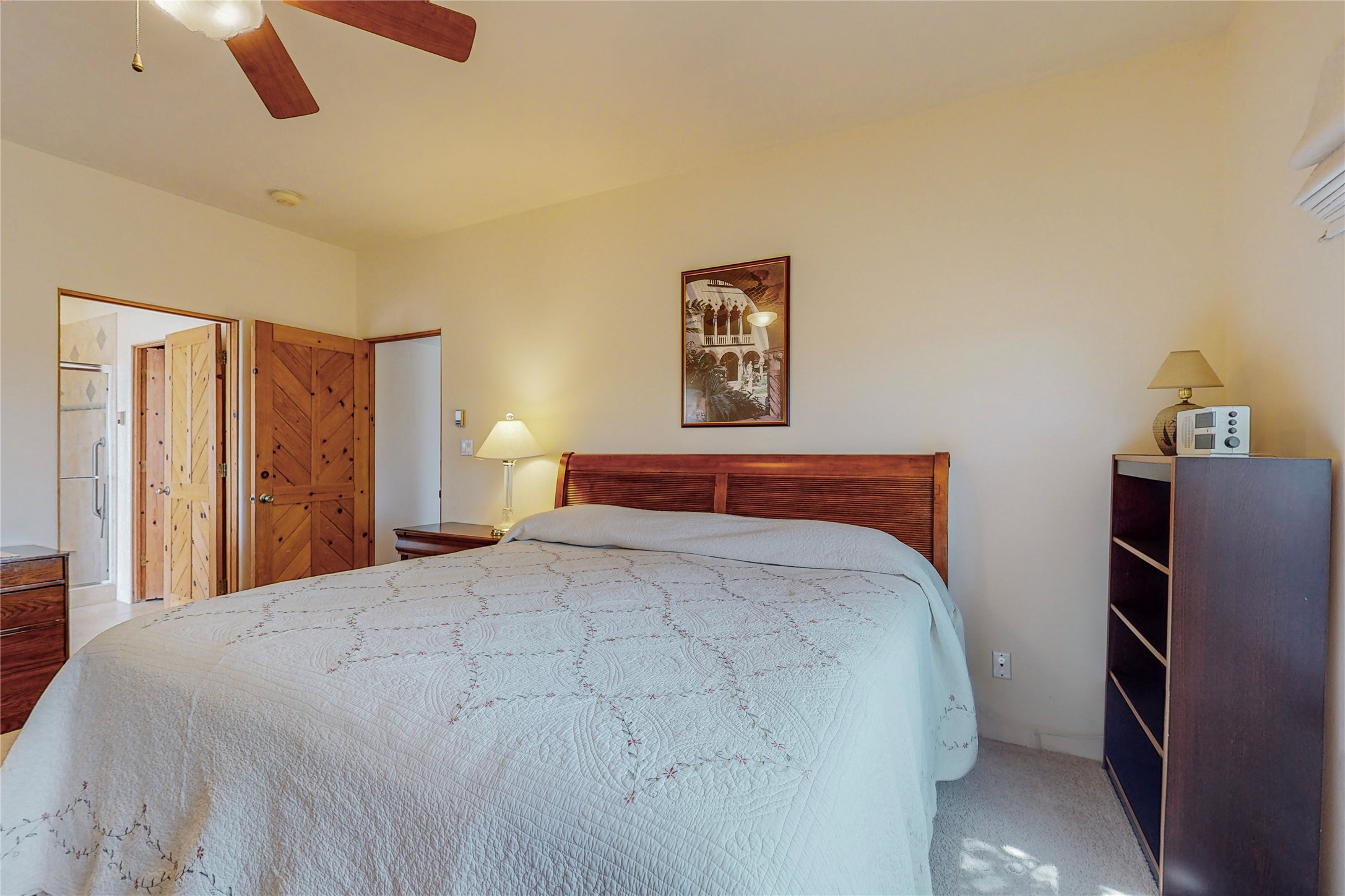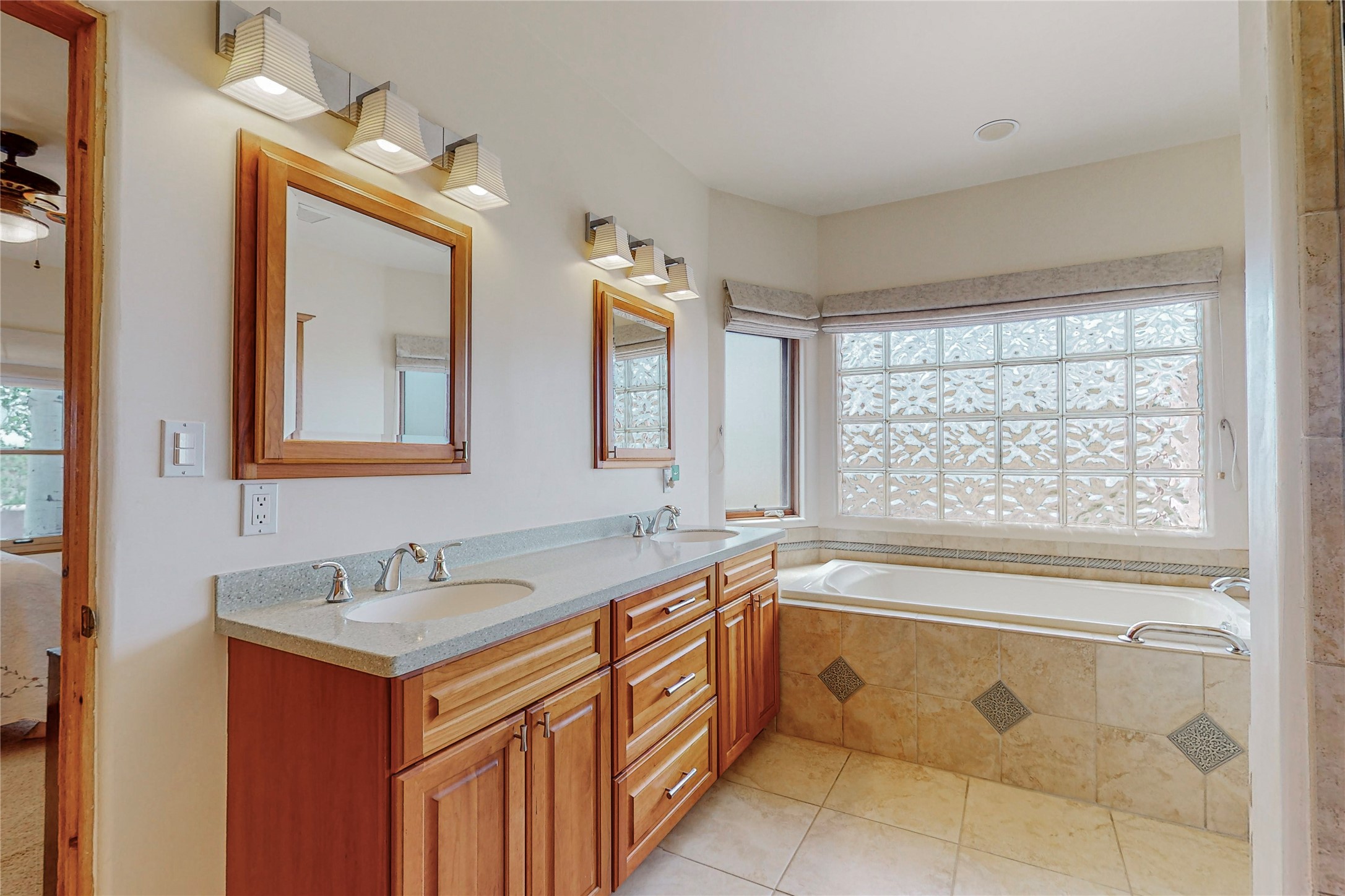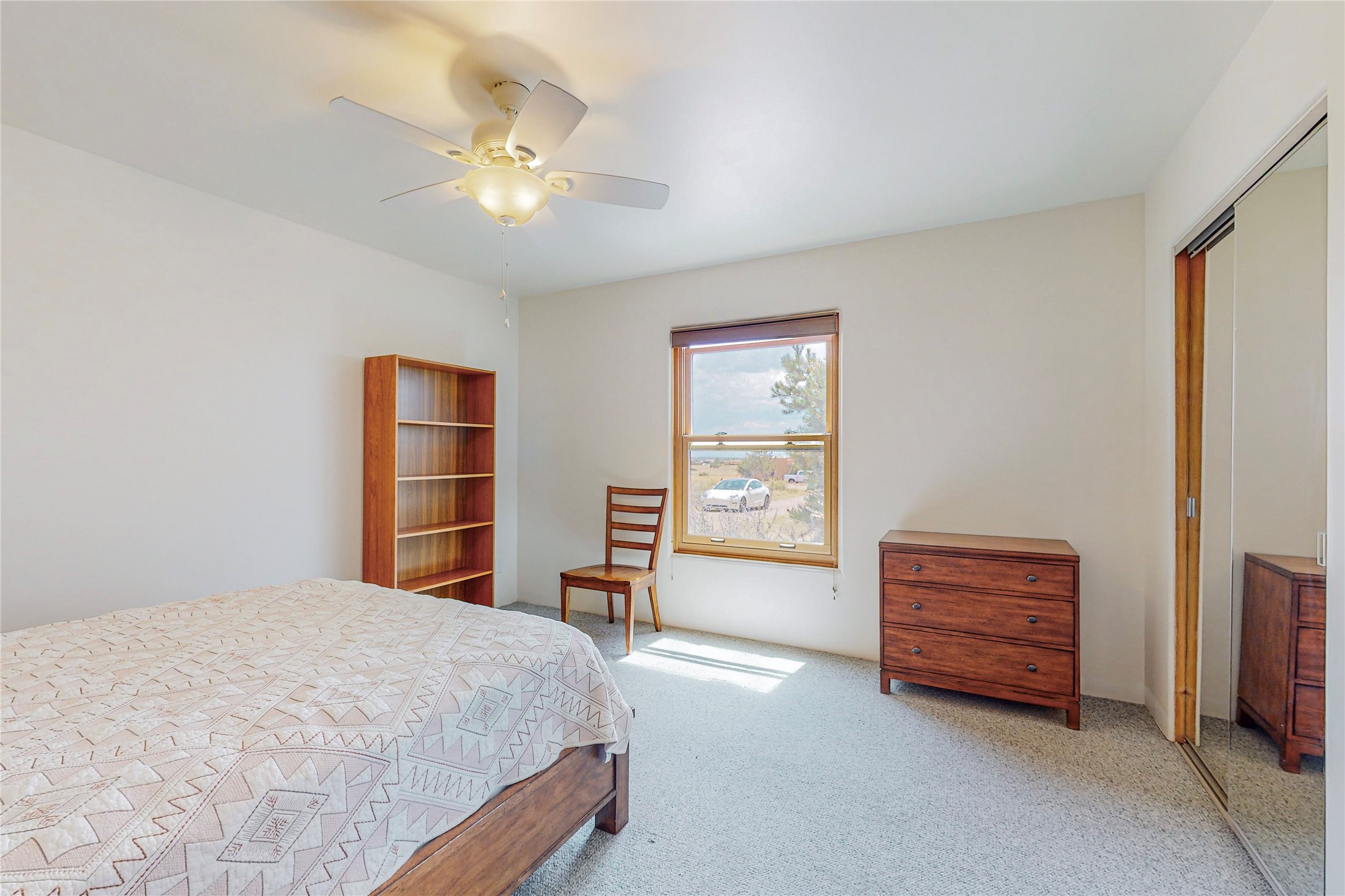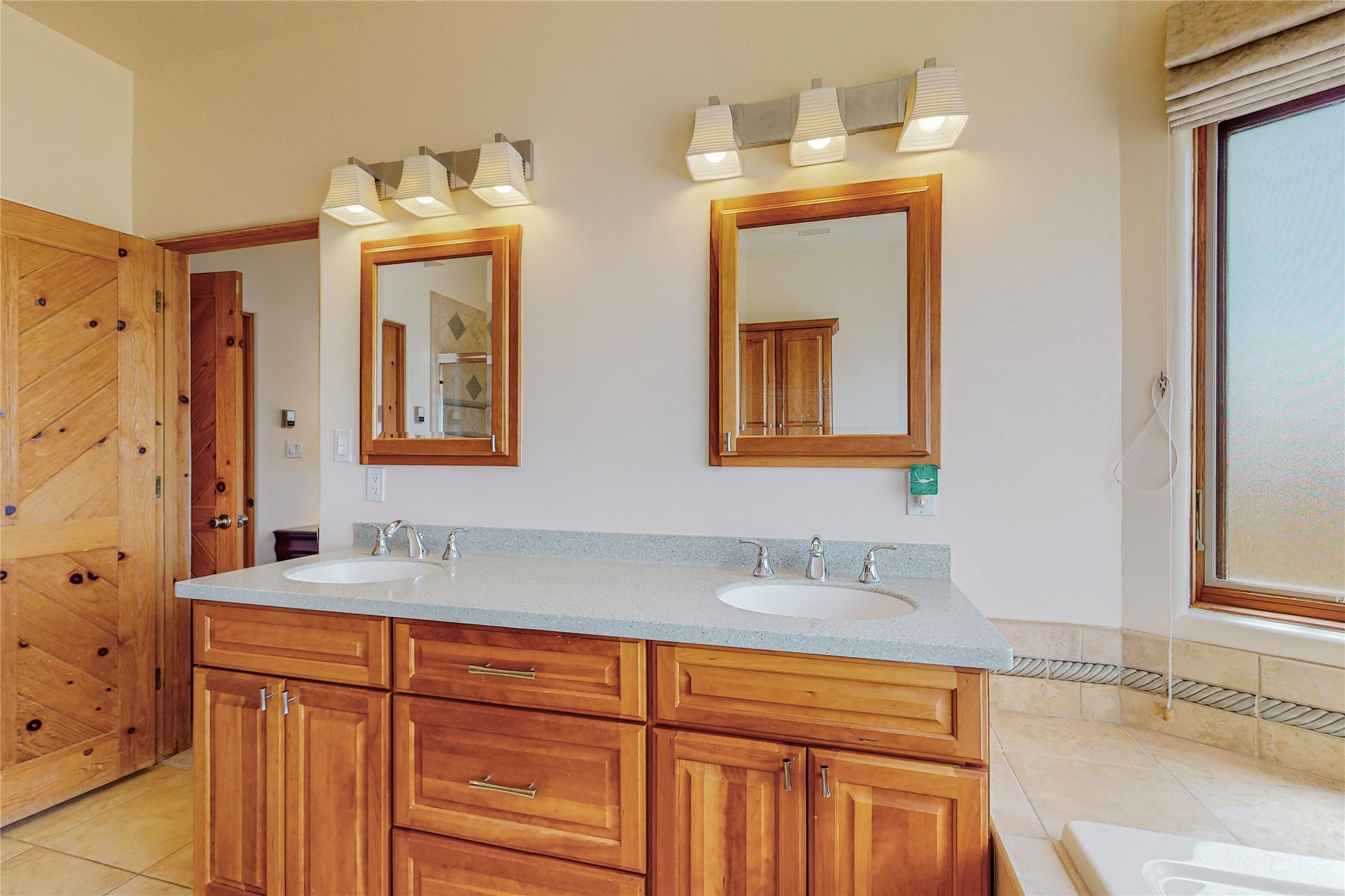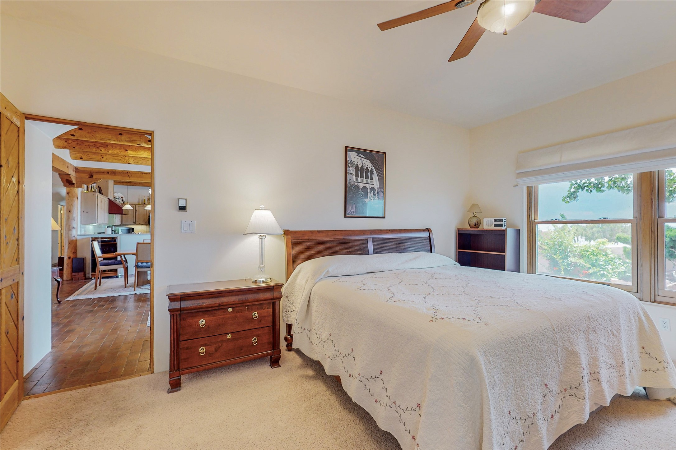 Outstanding mountain views from this lovely custom designed and built Eldorado home. Split 3 bedroom, 2 full bath open floorplan with high ceilings creating a welcoming light and spacious feel throughout. The living areas are graced with viga beam ceilings and dramatic kiva fireplace. An entertainers kitchen features an impressive Viking range and hood plus tons of cabinetry storage and is open to a large formal dining area. A poetic barrel ceiling gallery hallway connects the guest suite and office totally separate to the owners suite. There is a 6 zone, natural gas radiant heating system and a swamp cooler for the summer heat. Gracious walled gardens, portal and patios with expansive mountain views to the north, west and southwest sunsets to help you relax and enjoy country living. This carefully maintained home is close to local shopping, accesses the main roads into Santa Fe and also is close to all the trails, pool, parks and many recreational amenities Eldorado provides its members. Come be a part of our vibrant, active welcoming Eldorado community.