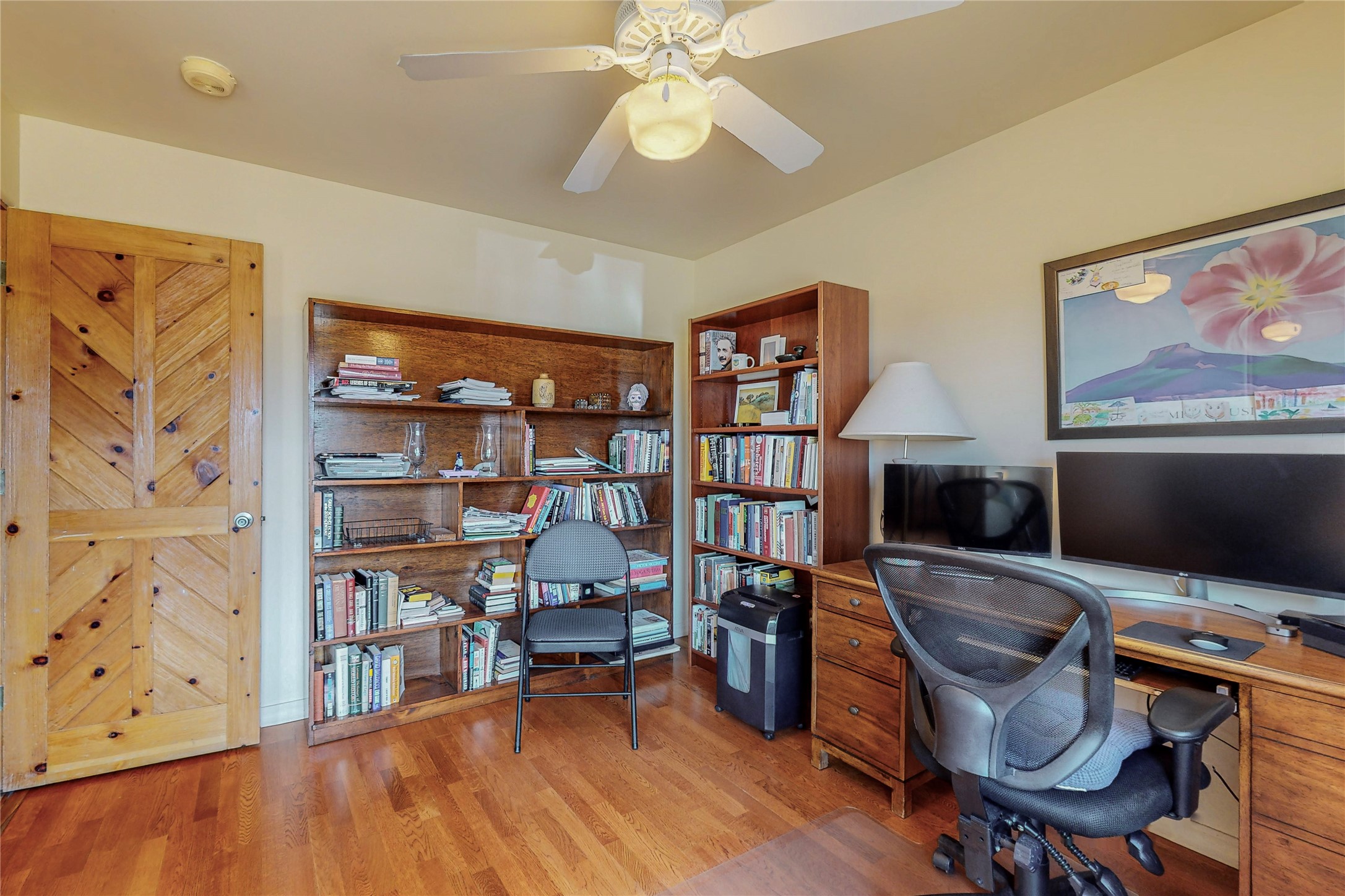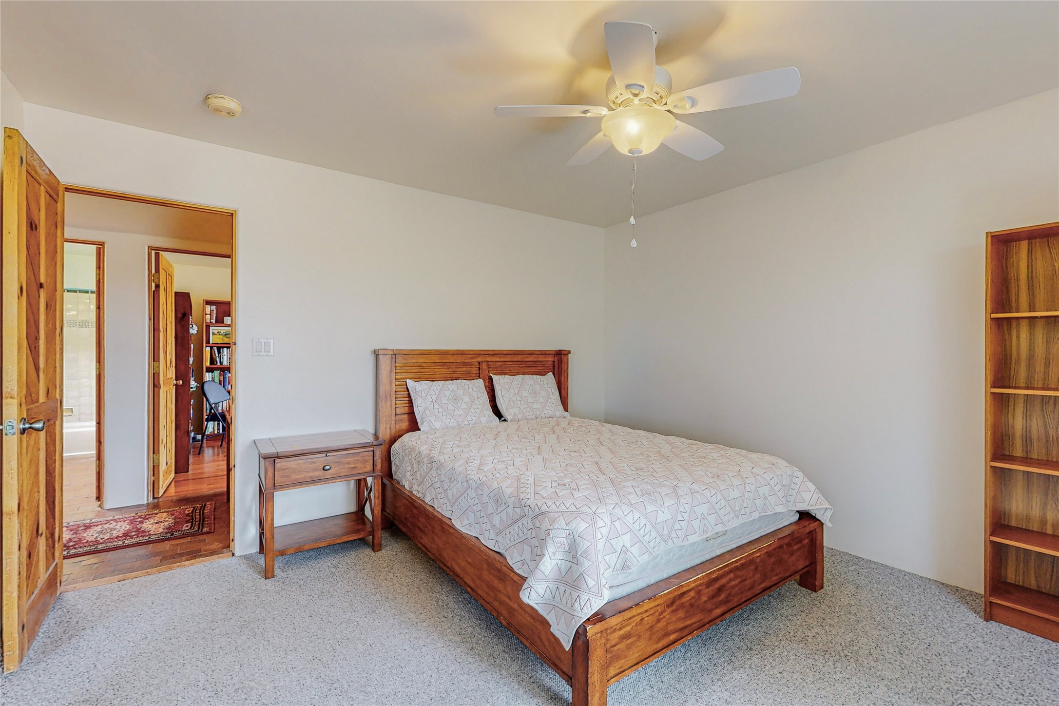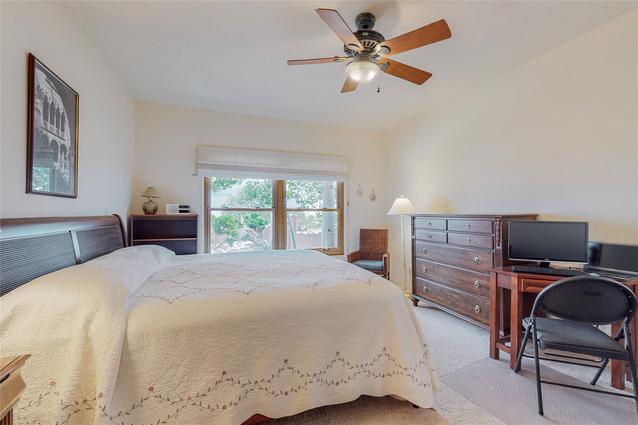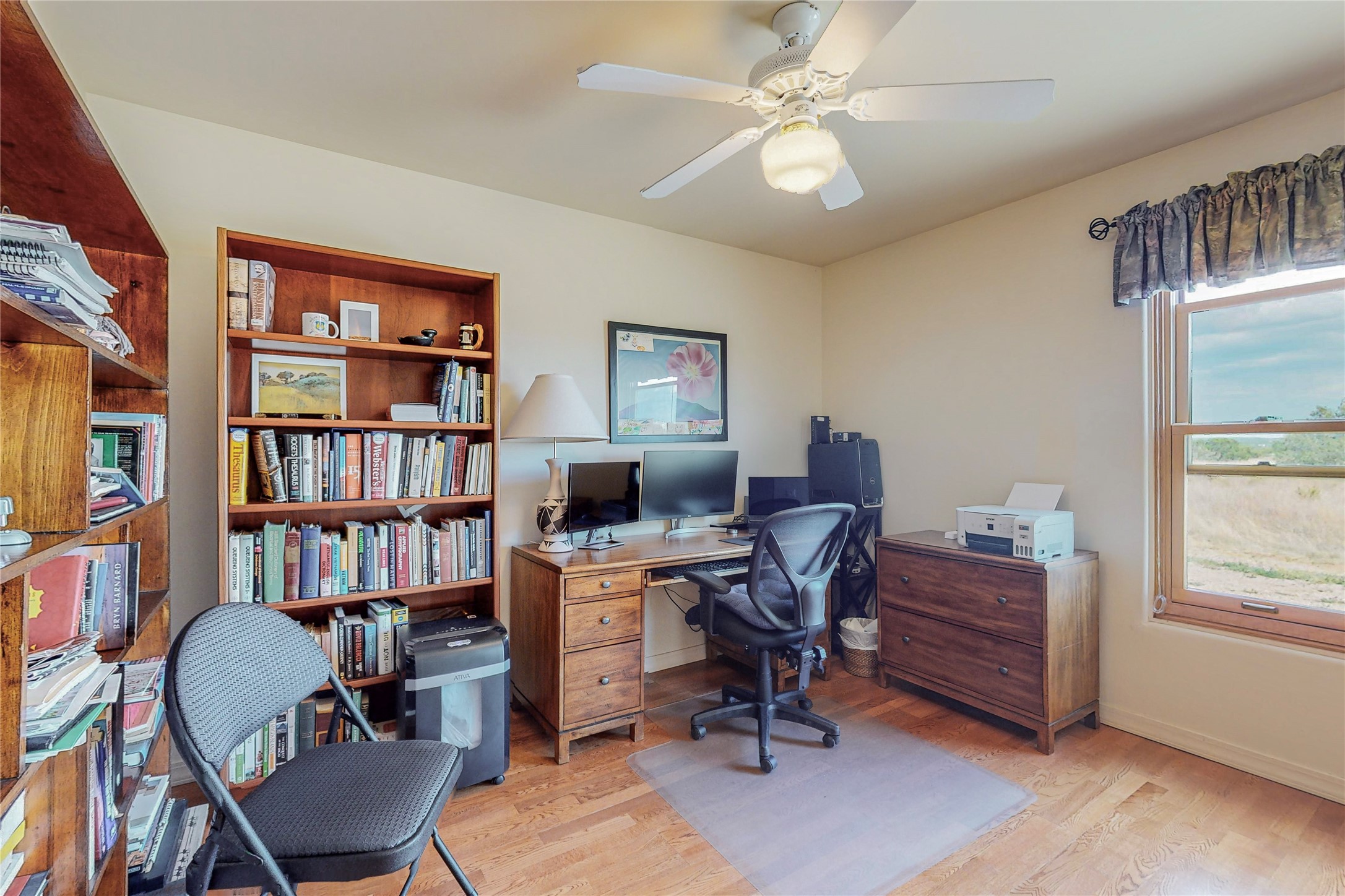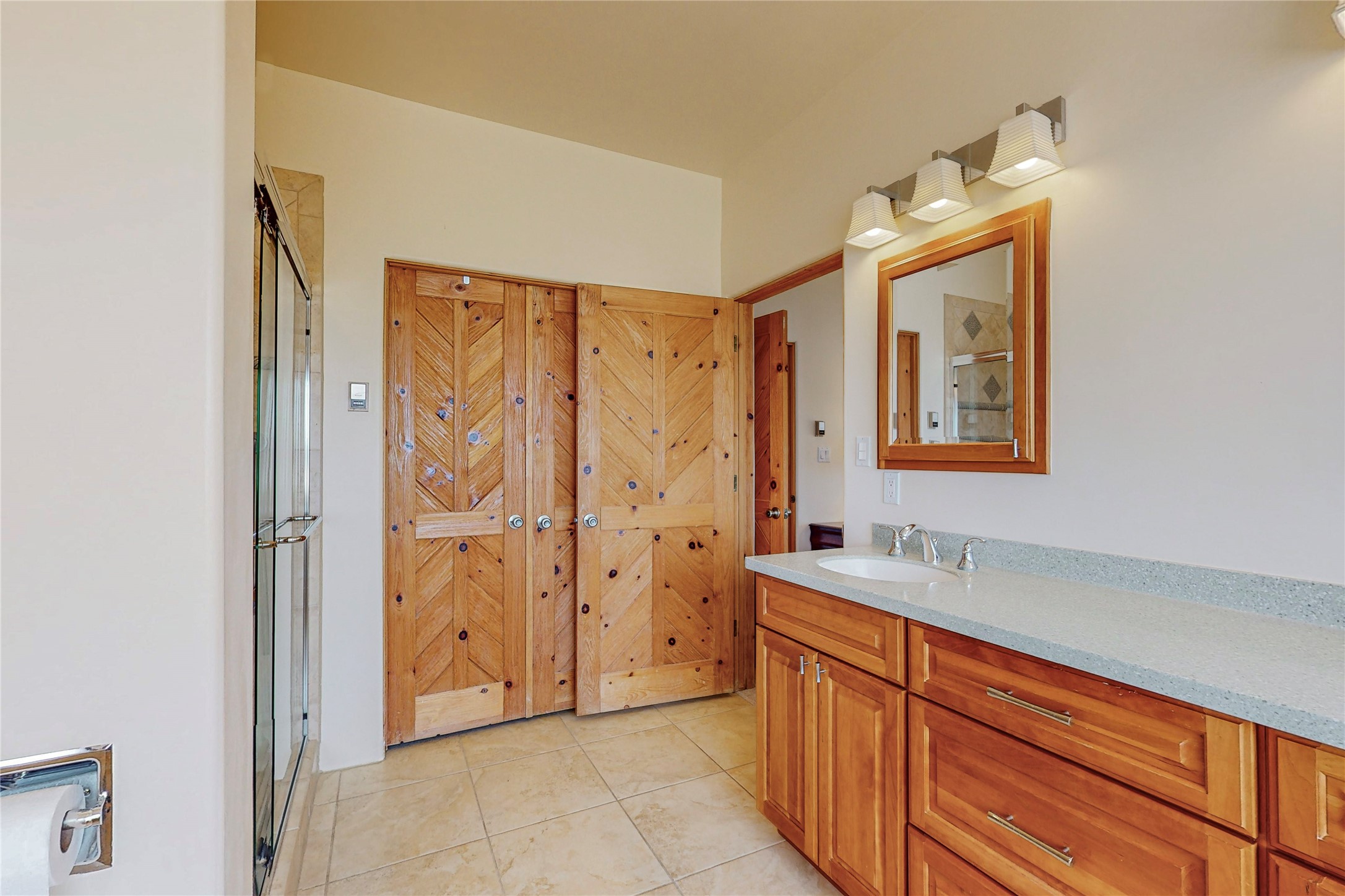 Outstanding mountain views from this lovely custom designed and built Eldorado home. Split 3 bedroom, 2 full bath open floorplan with high ceilings creating a welcoming light and spacious feel throughout. The living areas are graced with viga beam ceilings and dramatic kiva fireplace. An entertainers kitchen features an impressive Viking range and hood plus tons of cabinetry storage and is open to a large formal dining area. A poetic barrel ceiling gallery hallway connects the guest suite and office totally separate to the owners suite. There is a 6 zone, natural gas radiant heating system and a swamp cooler for the summer heat. Gracious walled gardens, portal and patios with expansive mountain views to the north, west and southwest sunsets to help you relax and enjoy country living. This carefully maintained home is close to local shopping, accesses the main roads into Santa Fe and also is close to all the trails, pool, parks and many recreational amenities Eldorado provides its members. Come be a part of our vibrant, active welcoming Eldorado community.