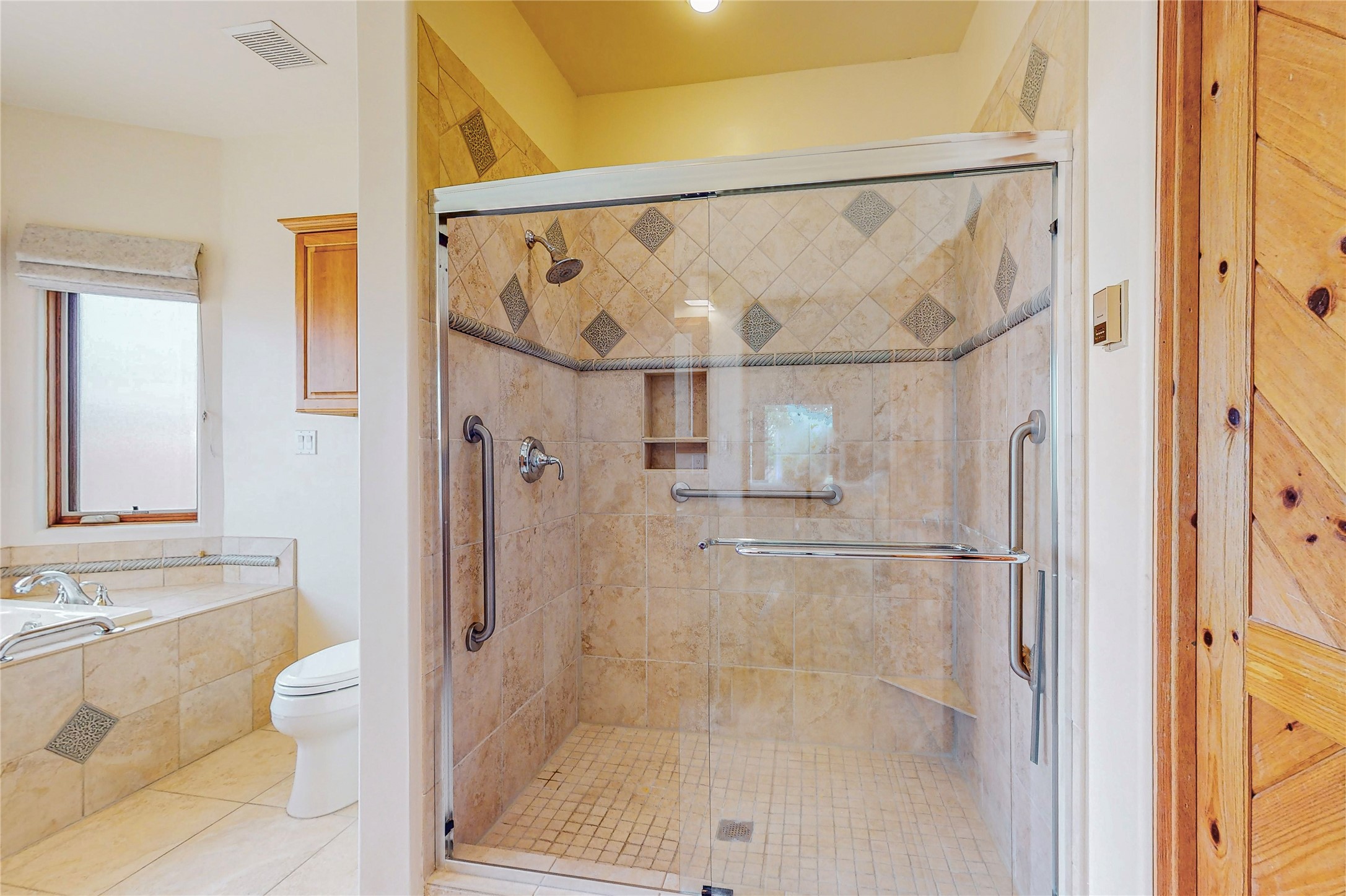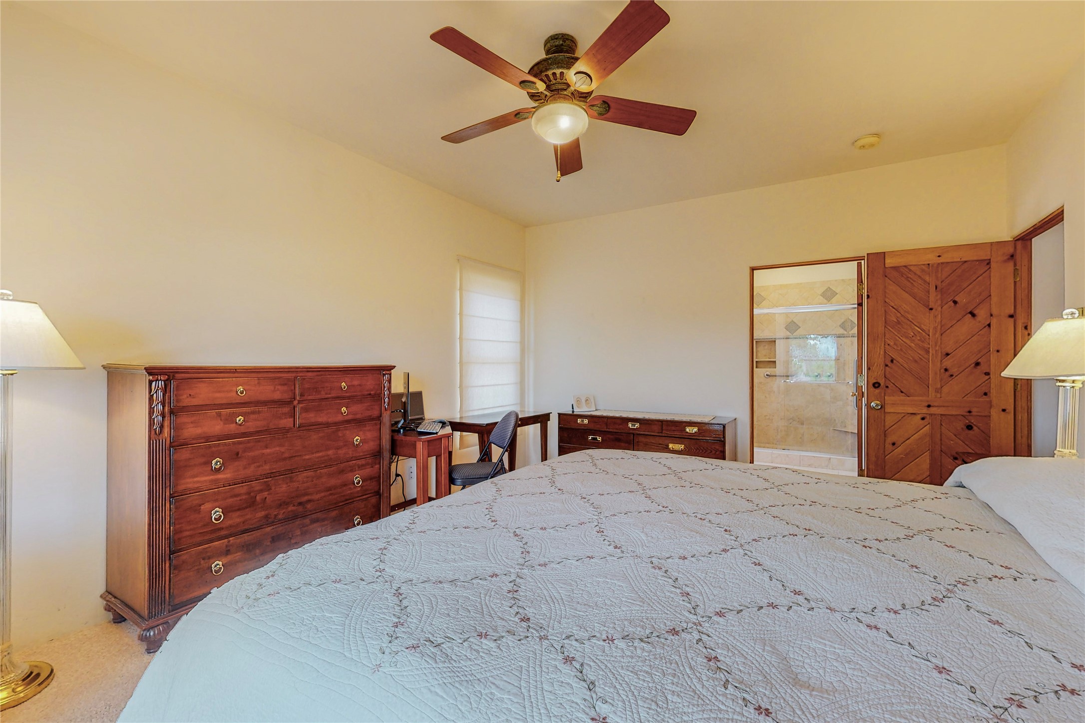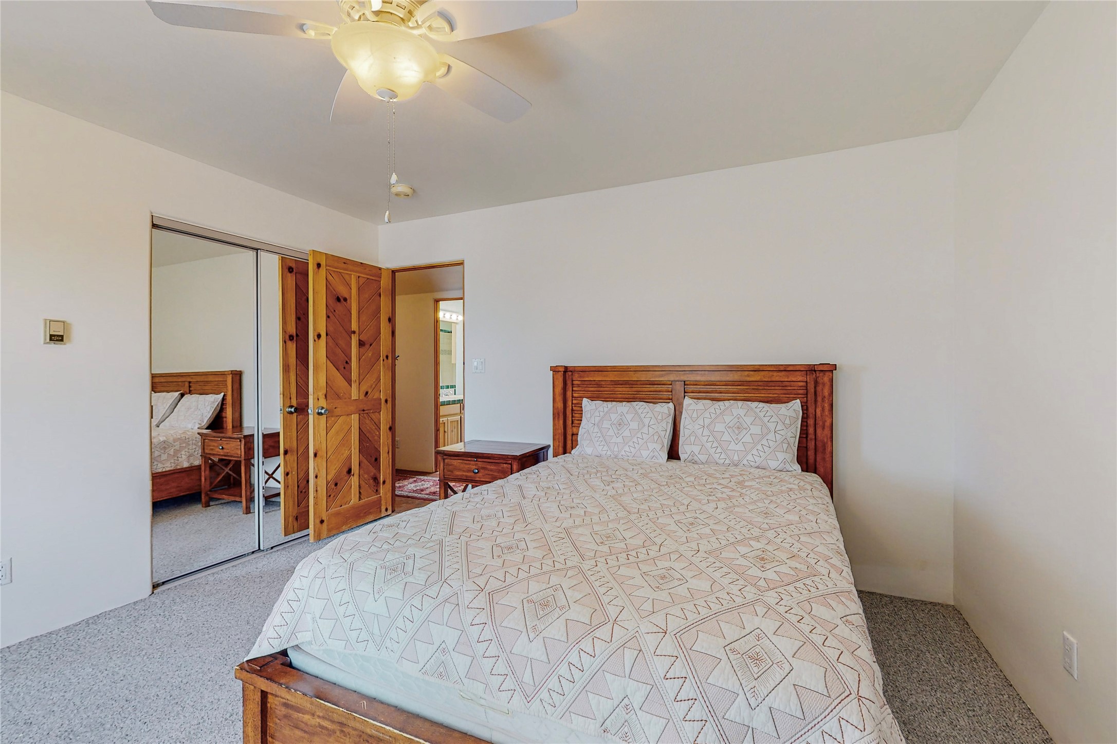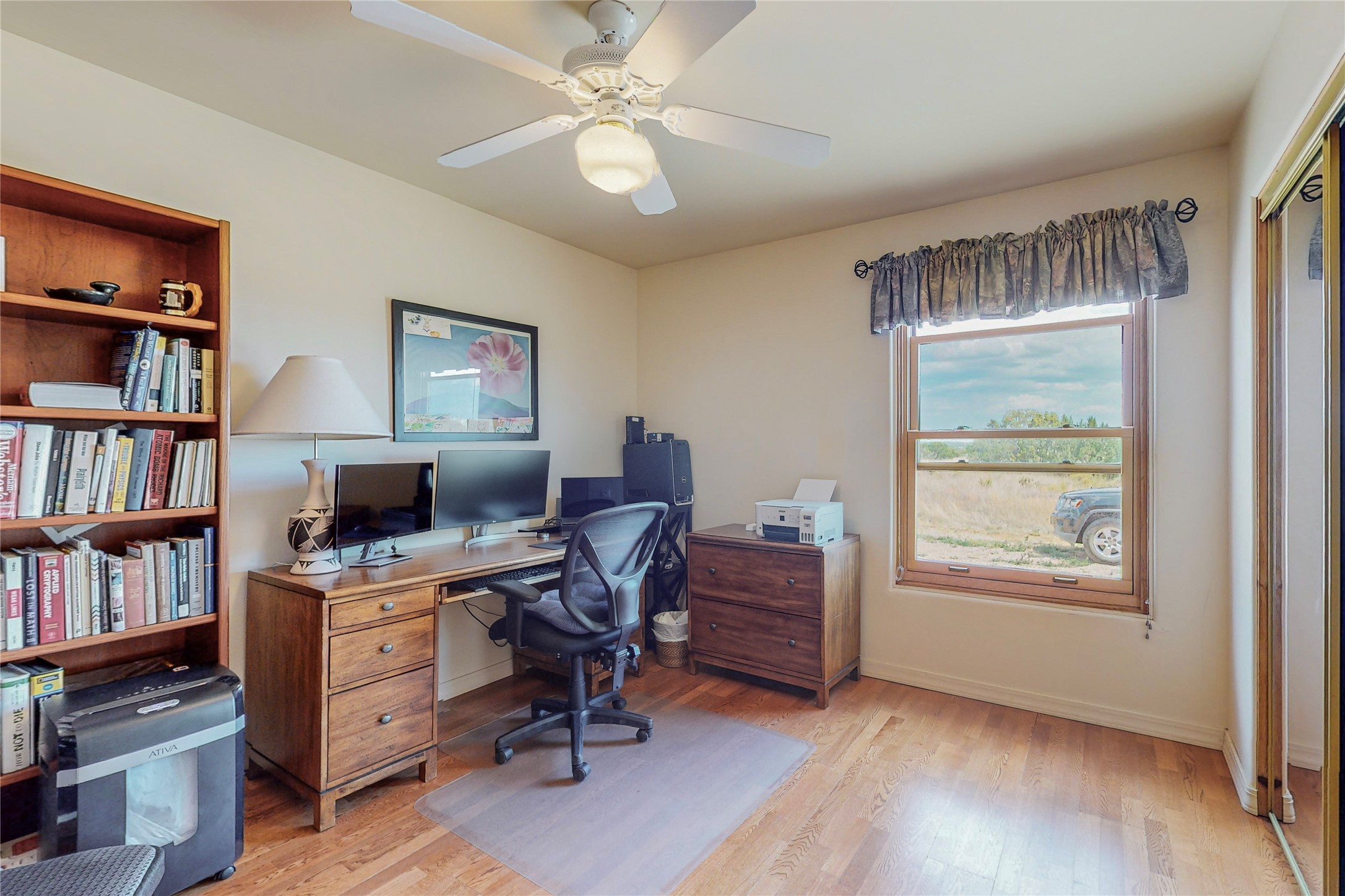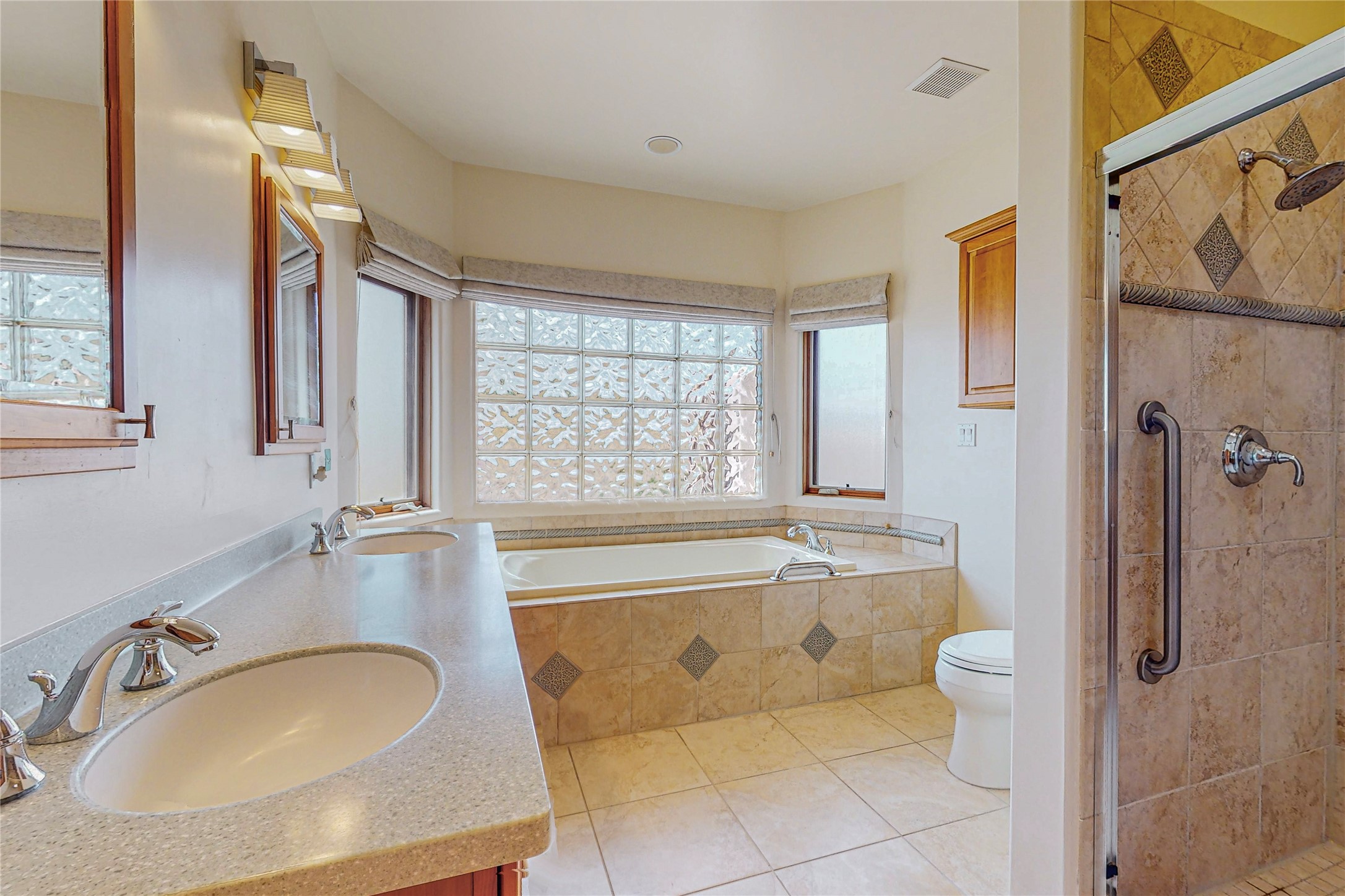 Outstanding mountain views from this lovely custom designed and built Eldorado home. Split 3 bedroom, 2 full bath open floorplan with high ceilings creating a welcoming light and spacious feel throughout. The living areas are graced with viga beam ceilings and dramatic kiva fireplace. An entertainers kitchen features an impressive Viking range and hood plus tons of cabinetry storage and is open to a large formal dining area. A poetic barrel ceiling gallery hallway connects the guest suite and office totally separate to the owners suite. There is a 6 zone, natural gas radiant heating system and a swamp cooler for the summer heat. Gracious walled gardens, portal and patios with expansive mountain views to the north, west and southwest sunsets to help you relax and enjoy country living. This carefully maintained home is close to local shopping, accesses the main roads into Santa Fe and also is close to all the trails, pool, parks and many recreational amenities Eldorado provides its members. Come be a part of our vibrant, active welcoming Eldorado community.