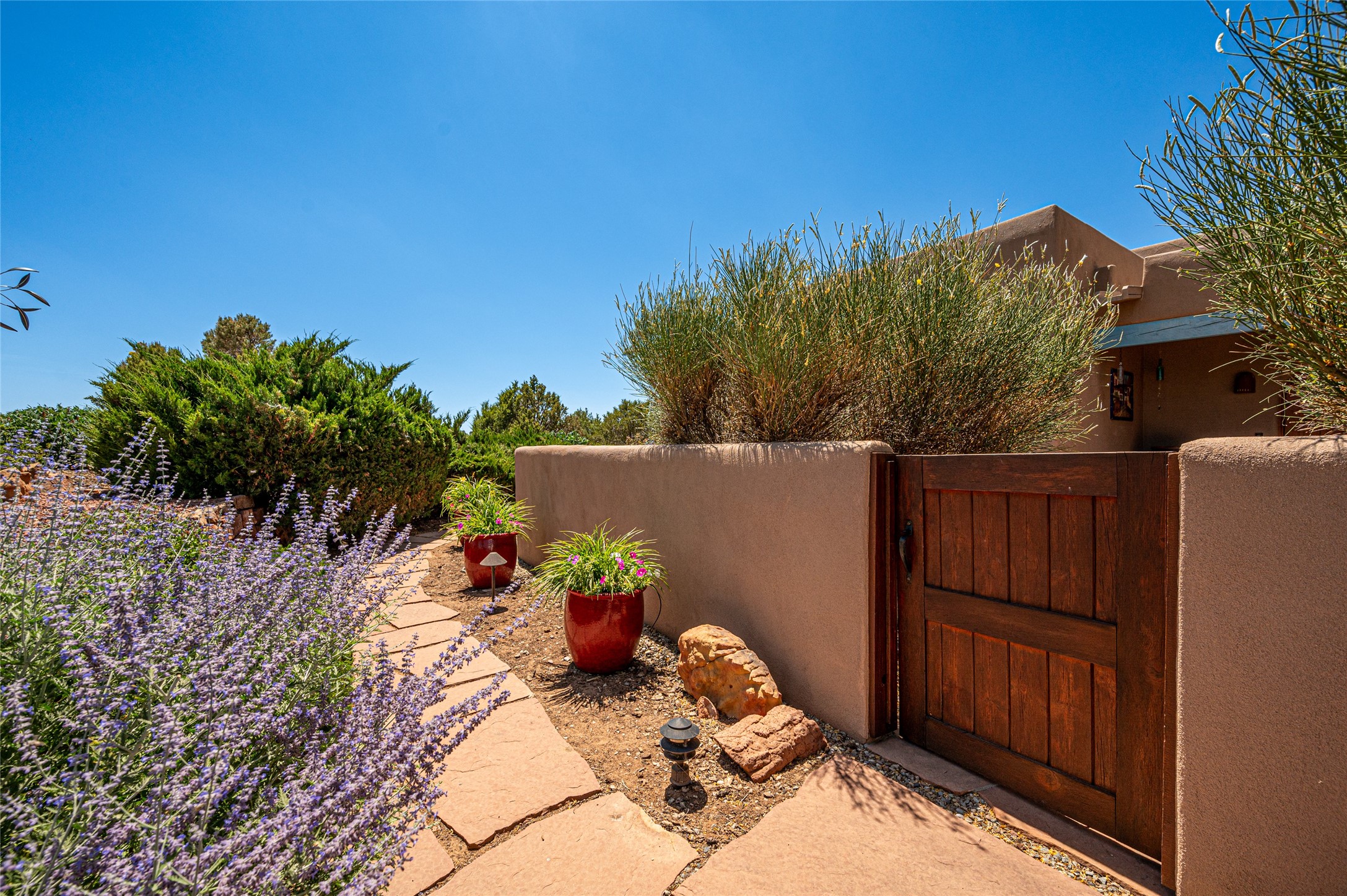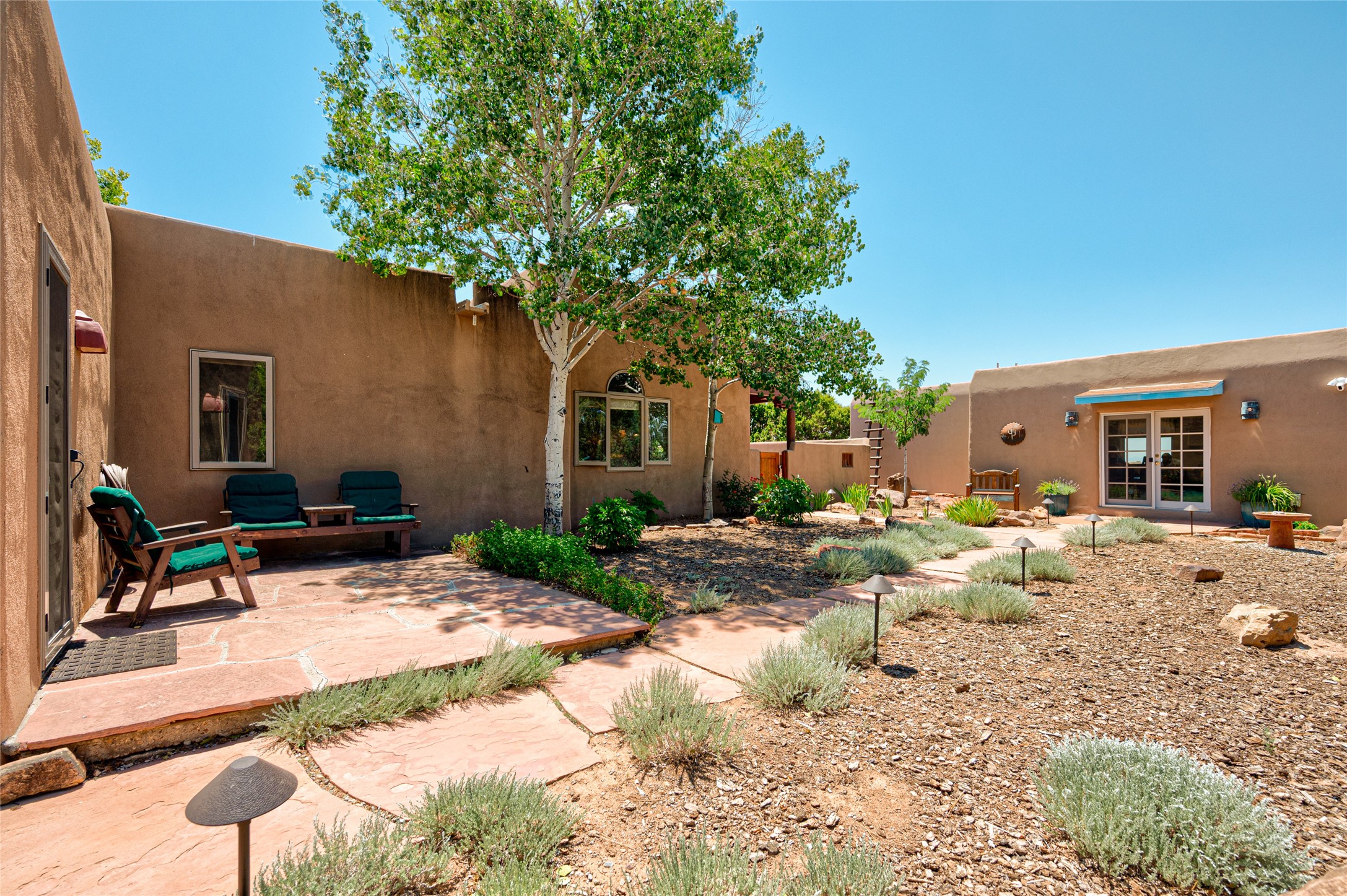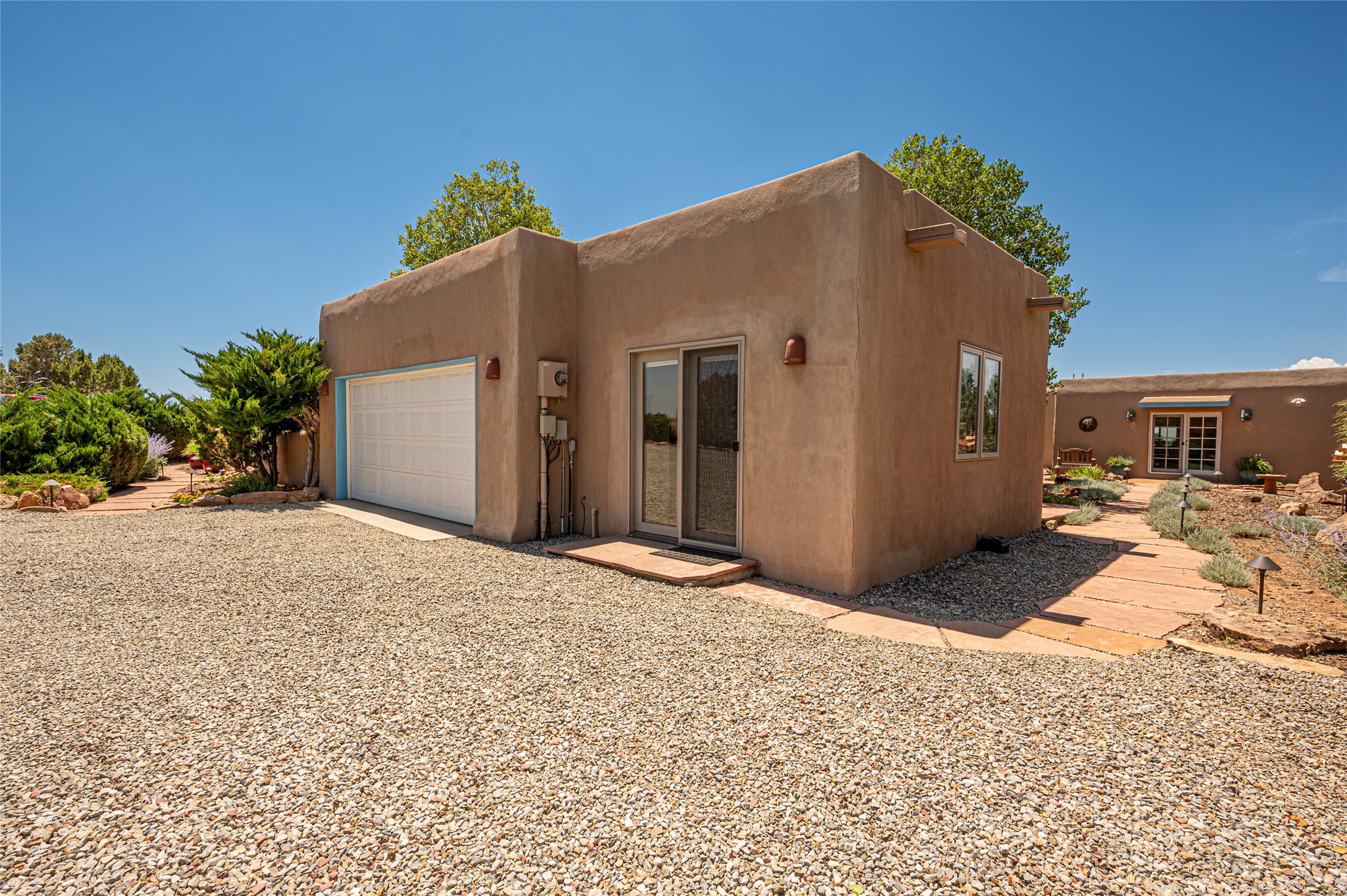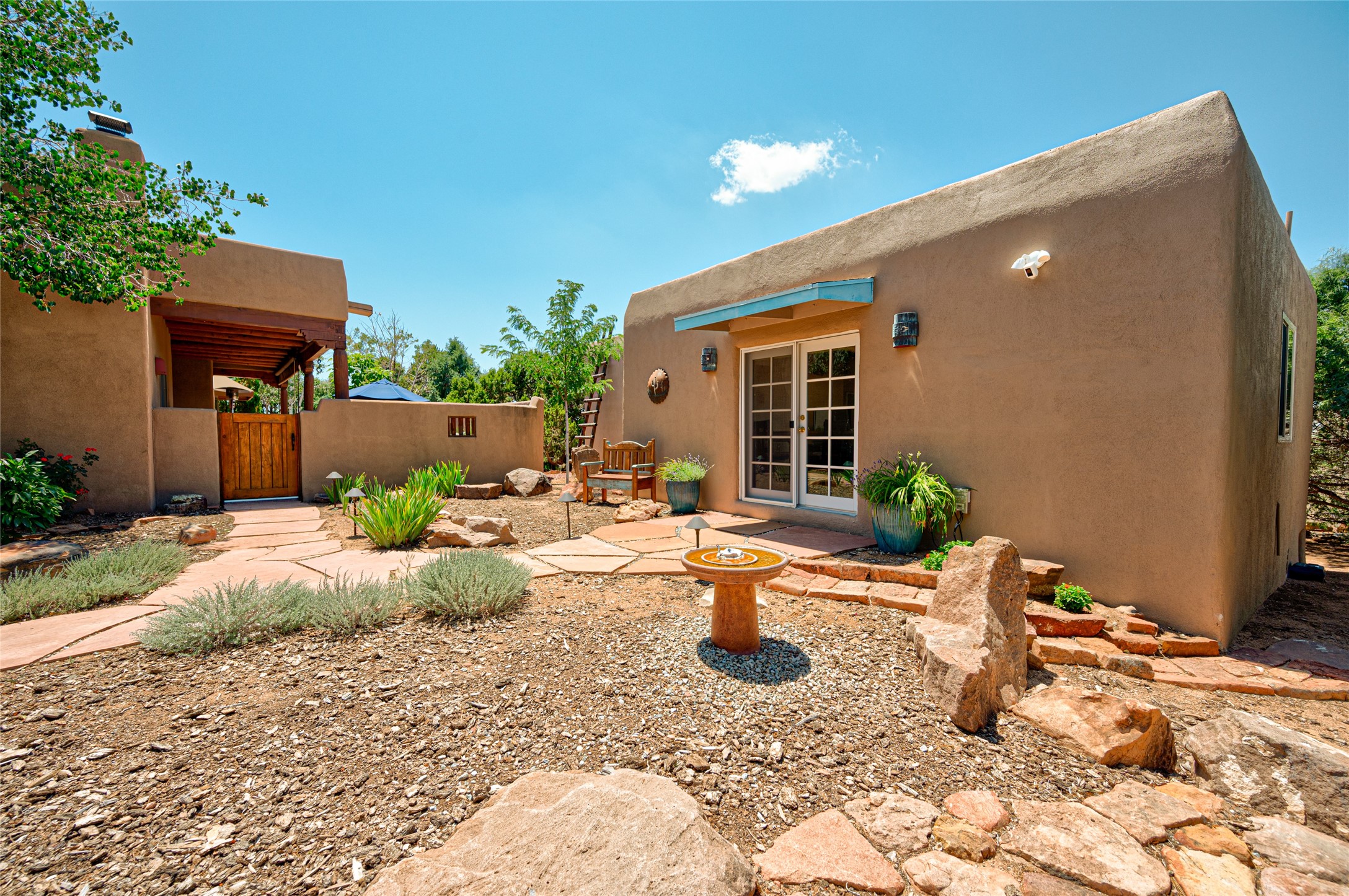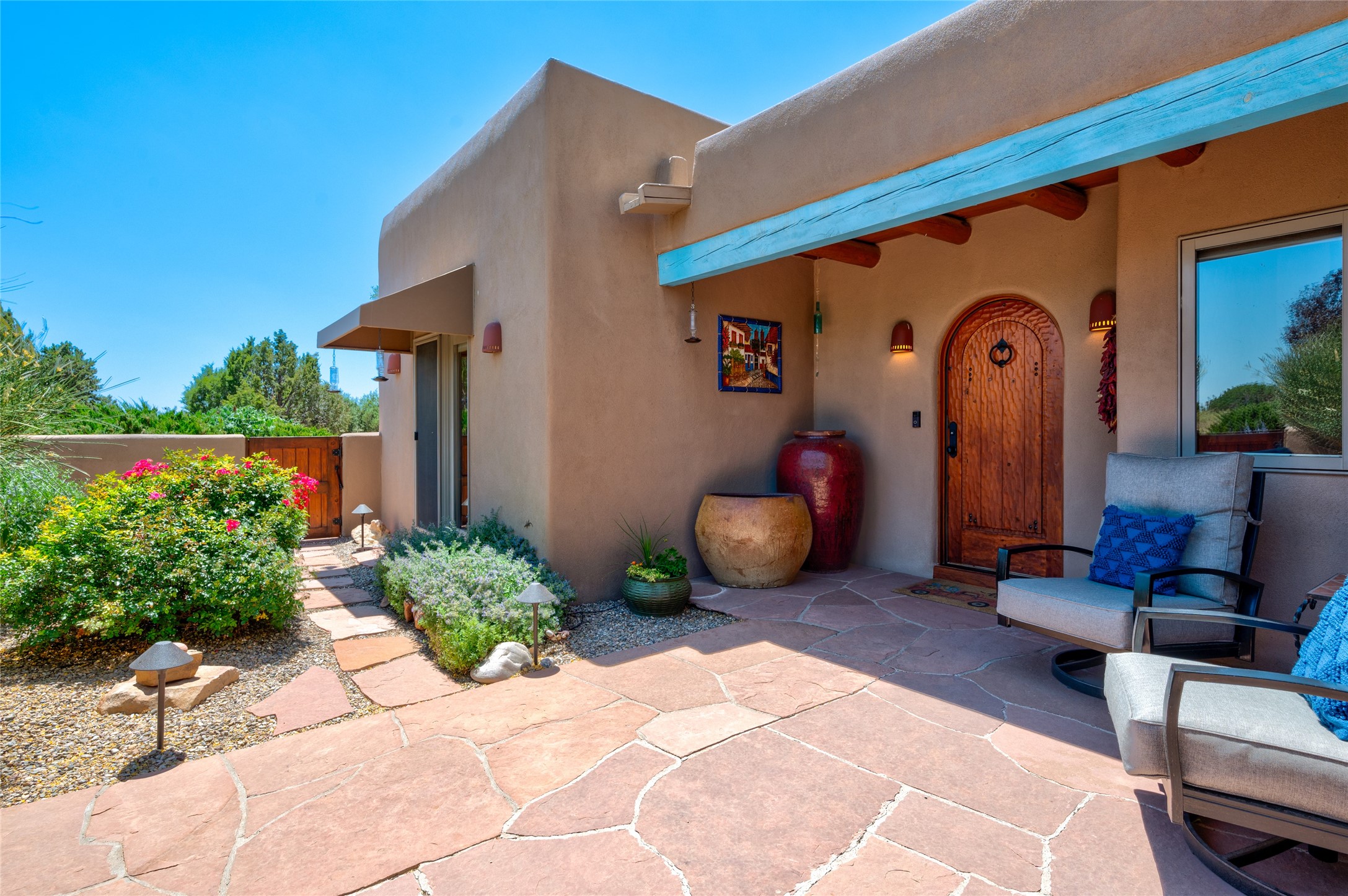 A quiet elegance and ambient symmetry flows throughout this exquisite Eldorado home. It is a shining example of pueblo contemporary design custom built by Adobeworks Inc. An open plan, split 3 bedroom plus lovely den/library with Rumford style central fireplace. Spacious living room with high viga ceilings, gleaming Saltillo floors and traditional kiva fireplace. Spacious kitchen with pantry and informal dining lead out onto a large shady portal. The main house includes over 2470 sq.ft plus a heated studio with half bath plus a 2 car finished garage. Beautifully maintained and surrounded by mature lovingly cared for walled gardens create private relaxing spaces. There is a walkway leading to a lovely remodeled and expanded 762 sq.ft casita which will delight your guests and family visitors. The home and casita share fabulous mountain views and yet delightfully private and peaceful. On one and half acres this home accesses all that Eldorado amenities offer plus local shopping, library, restaurants and open trails yet only minutes into Santa Fe. A must see!