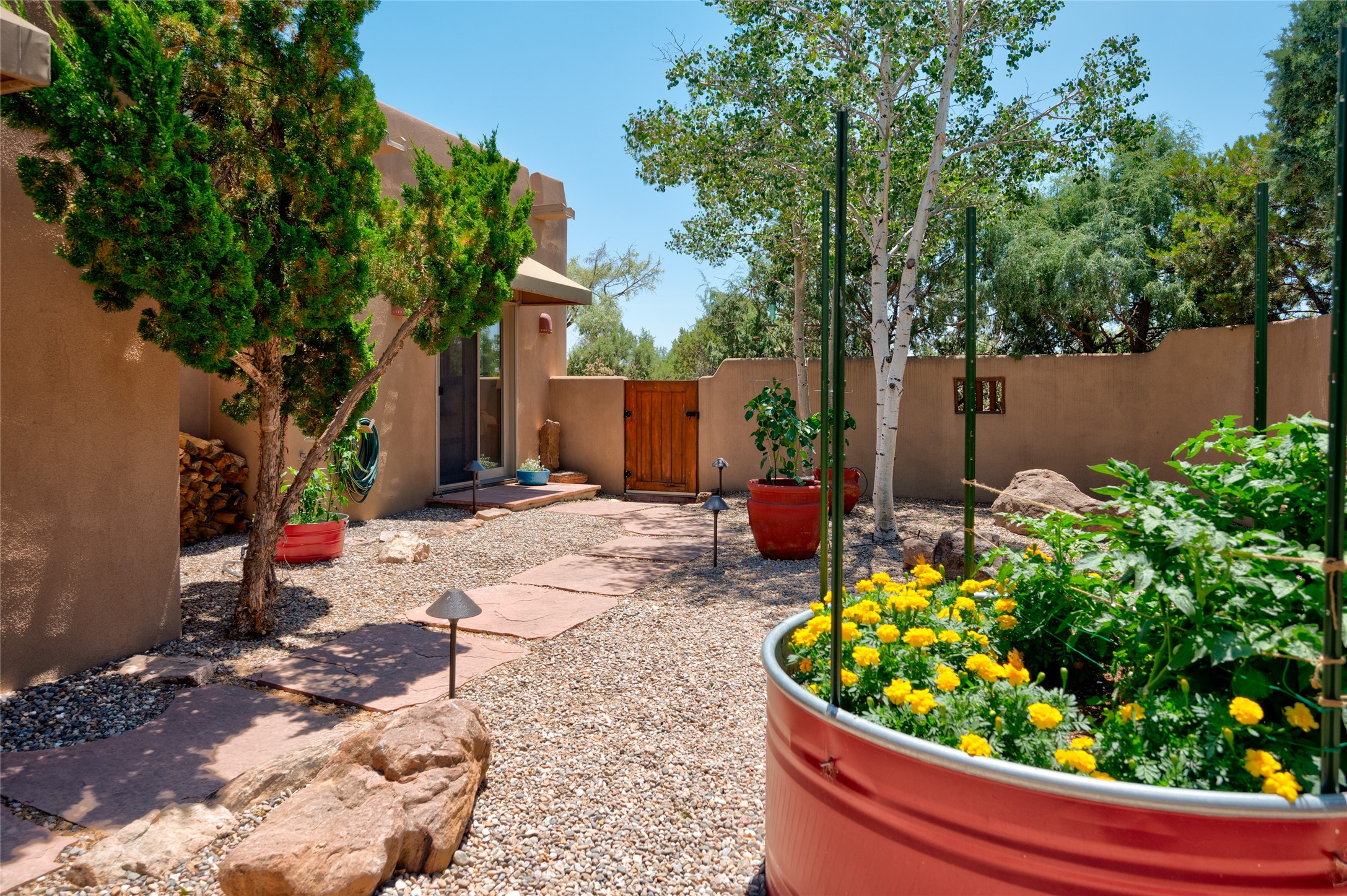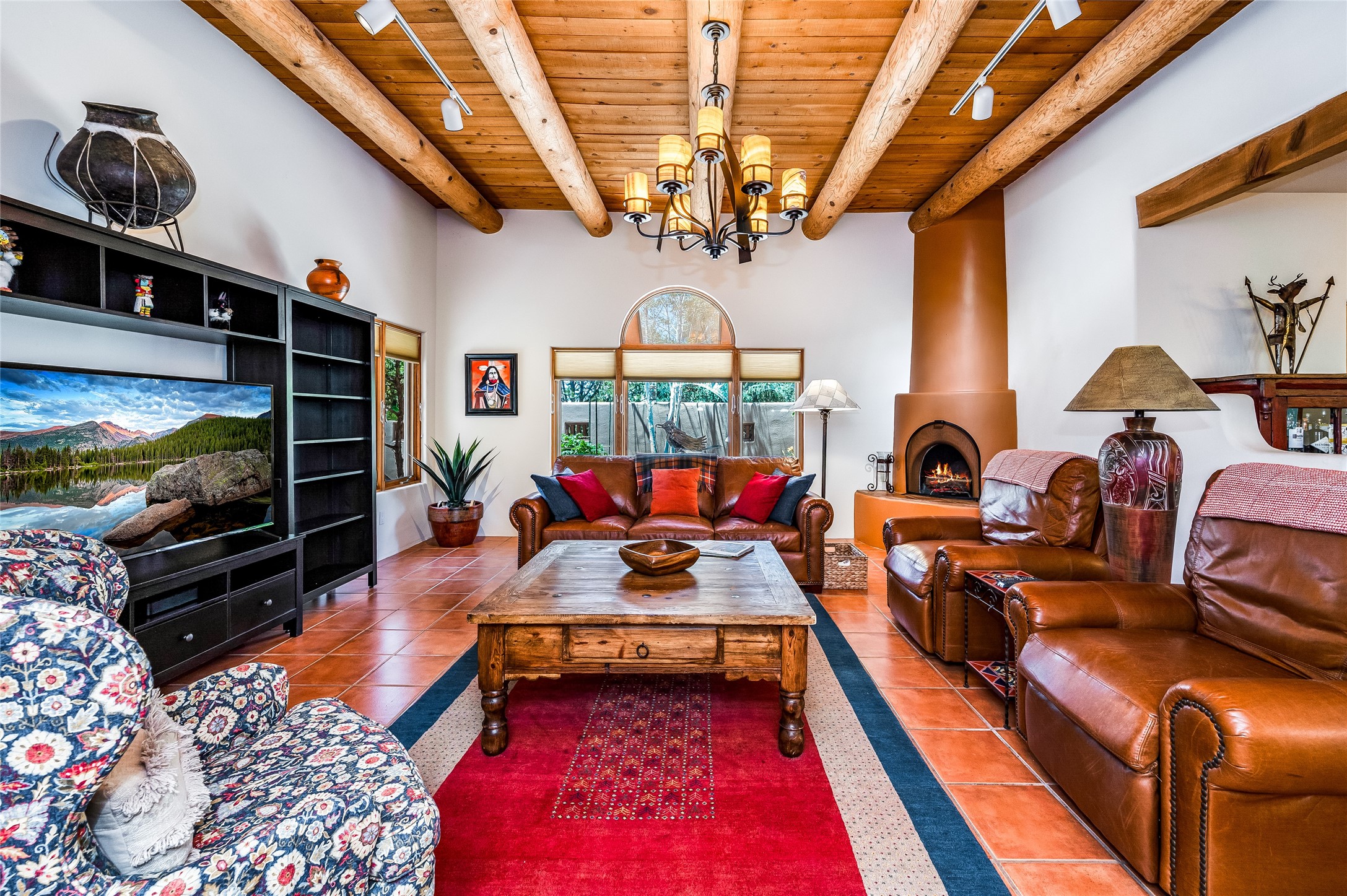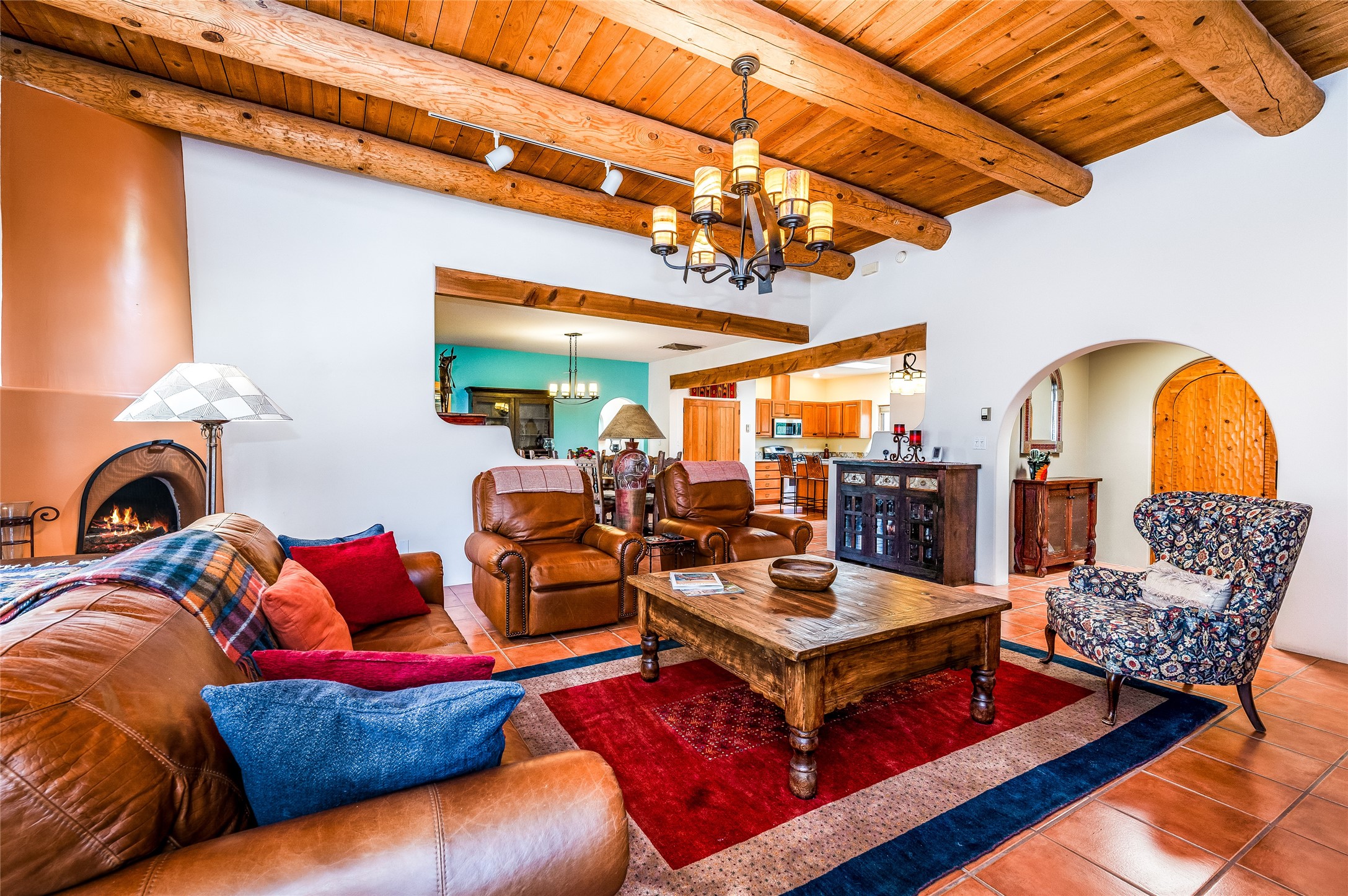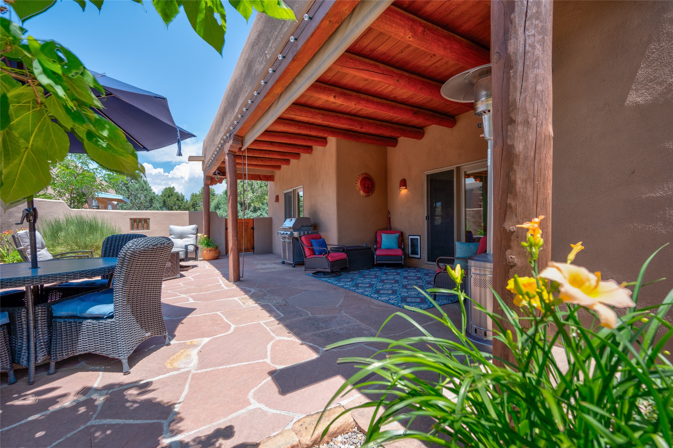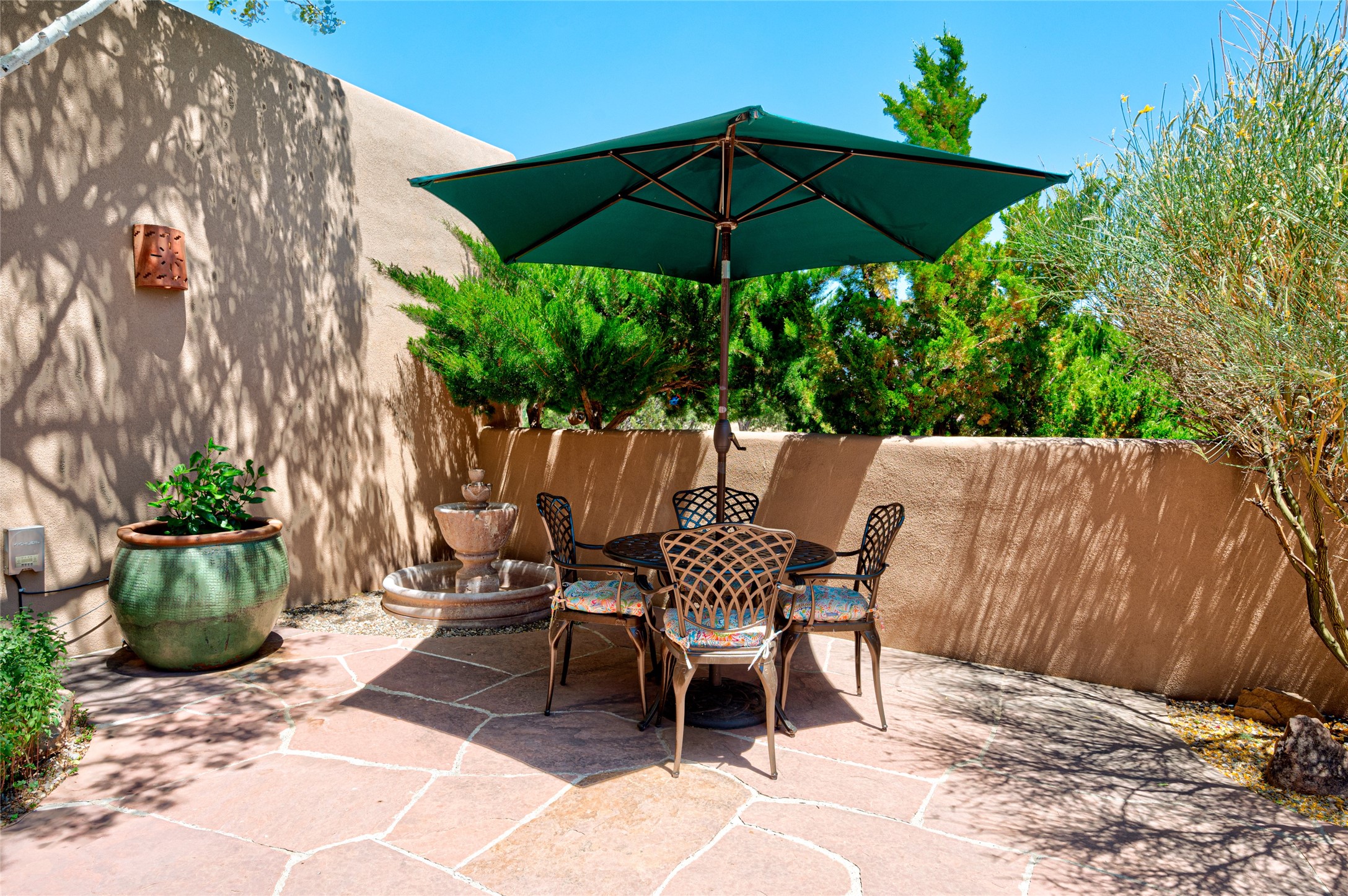 A quiet elegance and ambient symmetry flows throughout this exquisite Eldorado home. It is a shining example of pueblo contemporary design custom built by Adobeworks Inc. An open plan, split 3 bedroom plus lovely den/library with Rumford style central fireplace. Spacious living room with high viga ceilings, gleaming Saltillo floors and traditional kiva fireplace. Spacious kitchen with pantry and informal dining lead out onto a large shady portal. The main house includes over 2470 sq.ft plus a heated studio with half bath plus a 2 car finished garage. Beautifully maintained and surrounded by mature lovingly cared for walled gardens create private relaxing spaces. There is a walkway leading to a lovely remodeled and expanded 762 sq.ft casita which will delight your guests and family visitors. The home and casita share fabulous mountain views and yet delightfully private and peaceful. On one and half acres this home accesses all that Eldorado amenities offer plus local shopping, library, restaurants and open trails yet only minutes into Santa Fe. A must see!