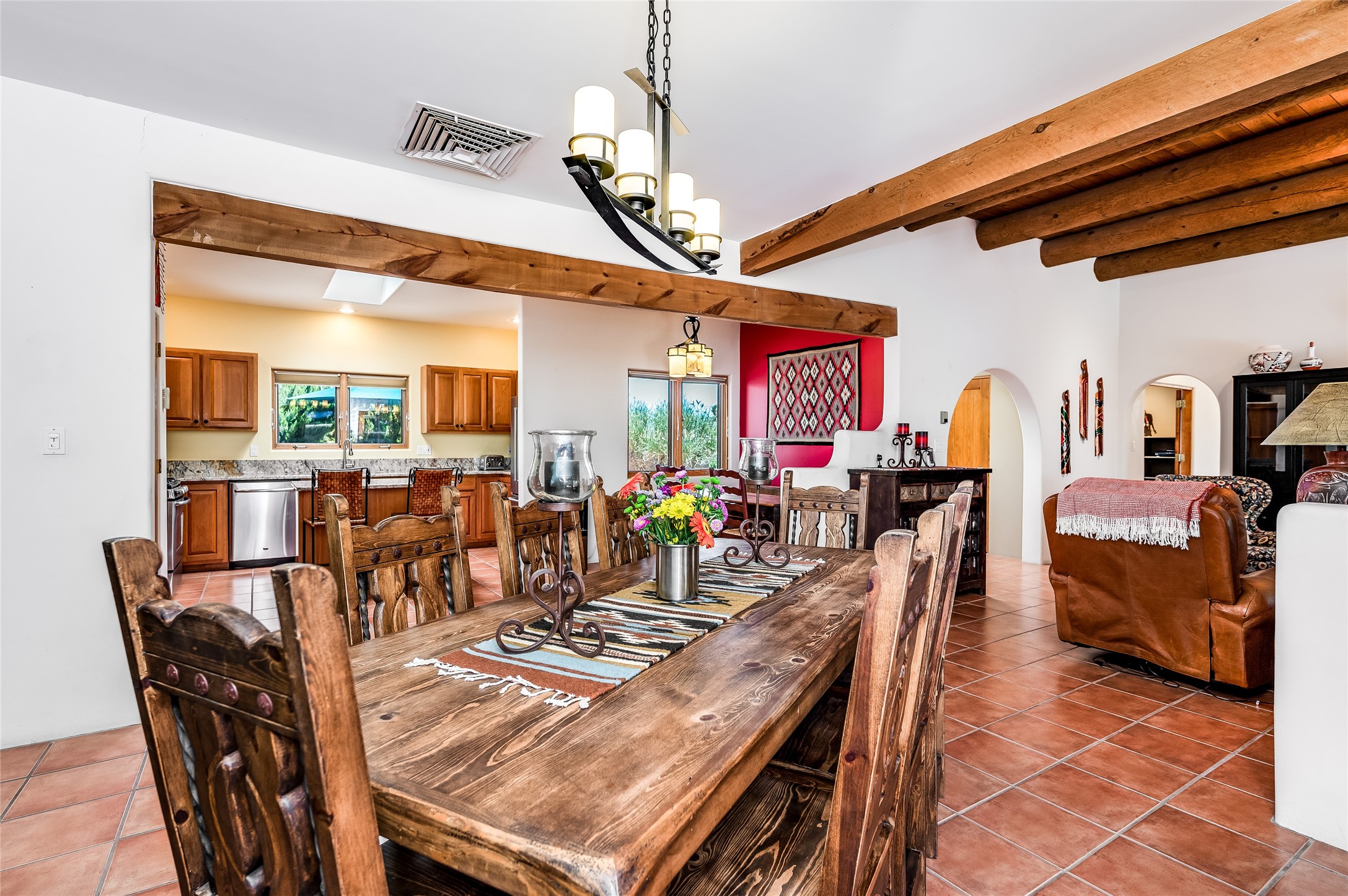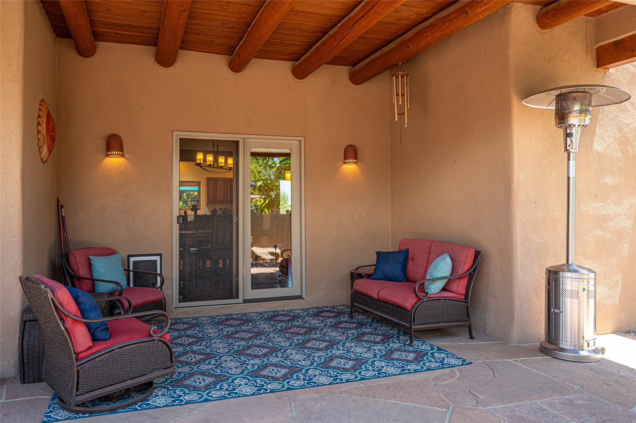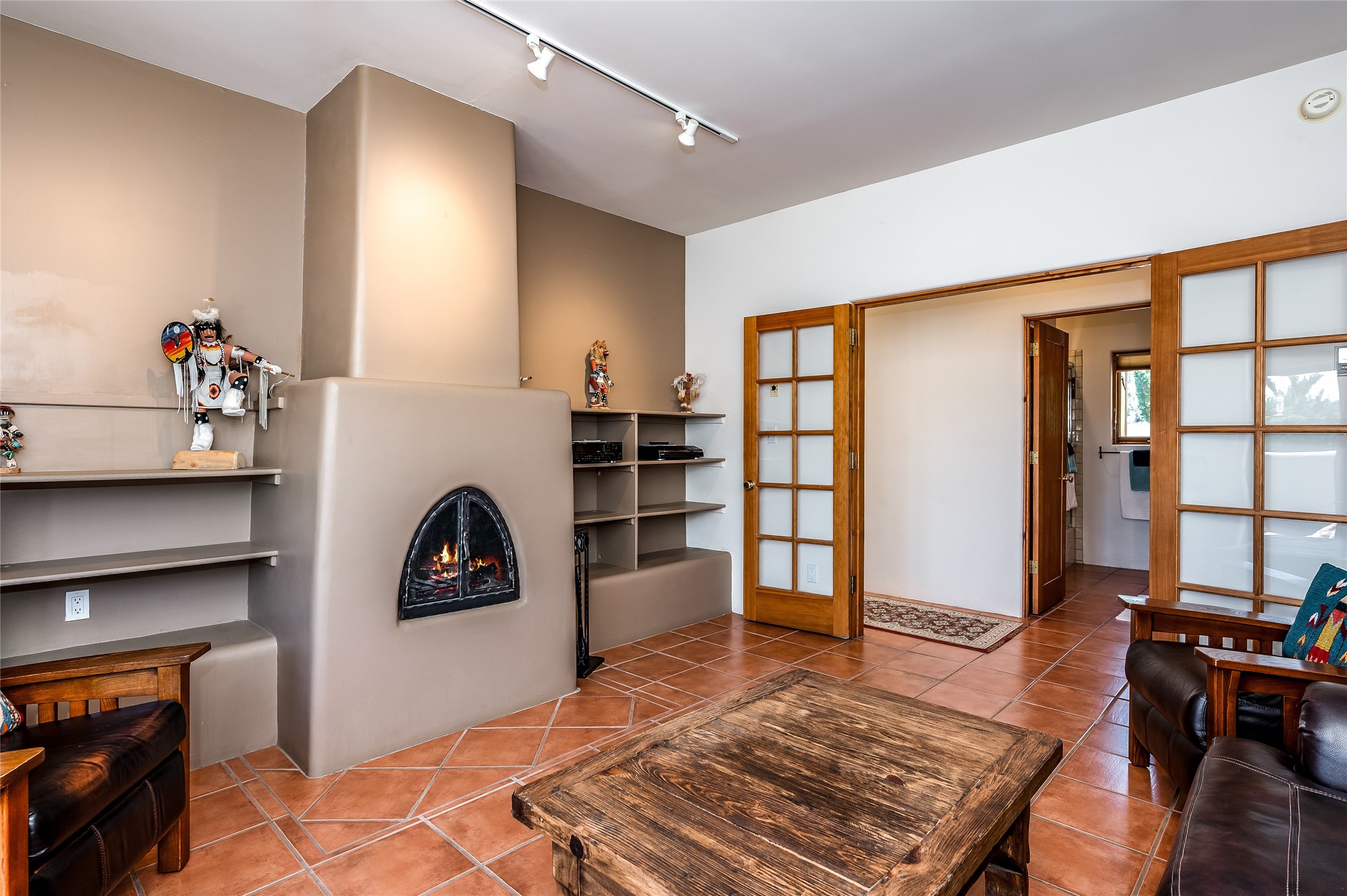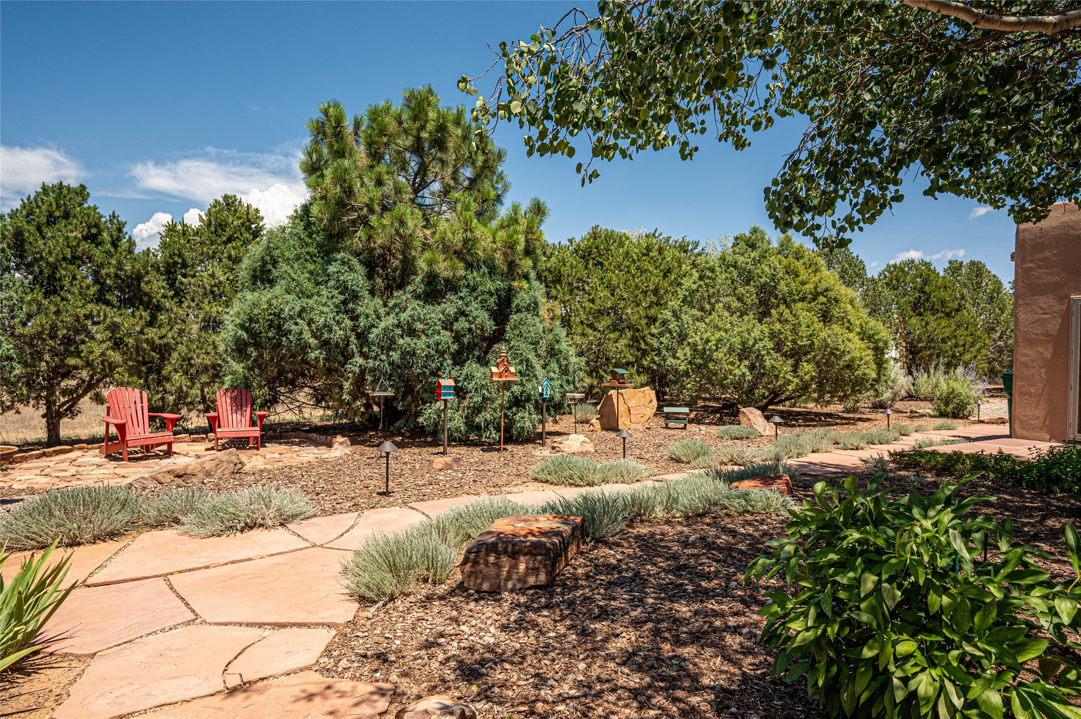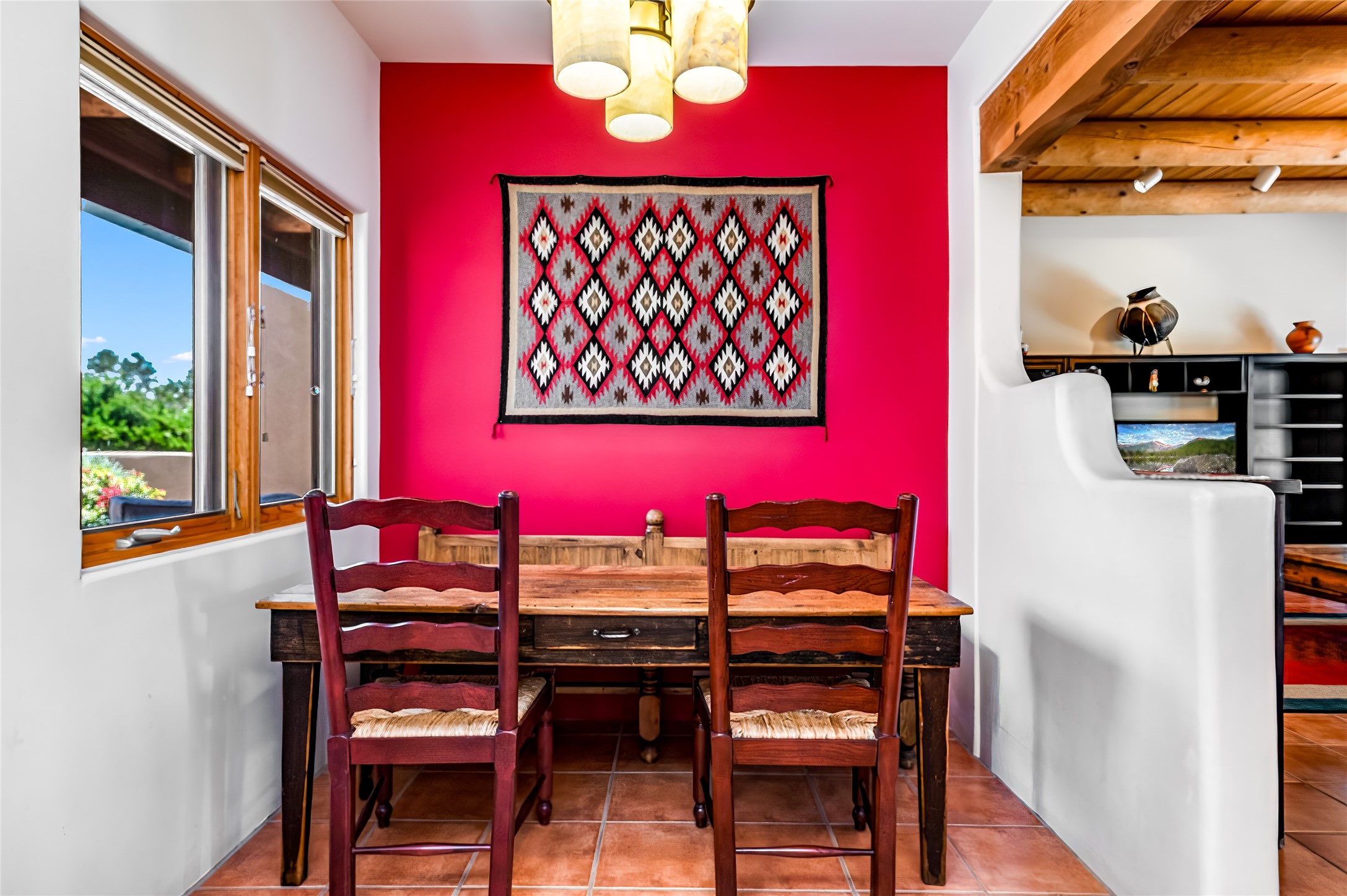 A quiet elegance and ambient symmetry flows throughout this exquisite Eldorado home. It is a shining example of pueblo contemporary design custom built by Adobeworks Inc. An open plan, split 3 bedroom plus lovely den/library with Rumford style central fireplace. Spacious living room with high viga ceilings, gleaming Saltillo floors and traditional kiva fireplace. Spacious kitchen with pantry and informal dining lead out onto a large shady portal. The main house includes over 2470 sq.ft plus a heated studio with half bath plus a 2 car finished garage. Beautifully maintained and surrounded by mature lovingly cared for walled gardens create private relaxing spaces. There is a walkway leading to a lovely remodeled and expanded 762 sq.ft casita which will delight your guests and family visitors. The home and casita share fabulous mountain views and yet delightfully private and peaceful. On one and half acres this home accesses all that Eldorado amenities offer plus local shopping, library, restaurants and open trails yet only minutes into Santa Fe. A must see!