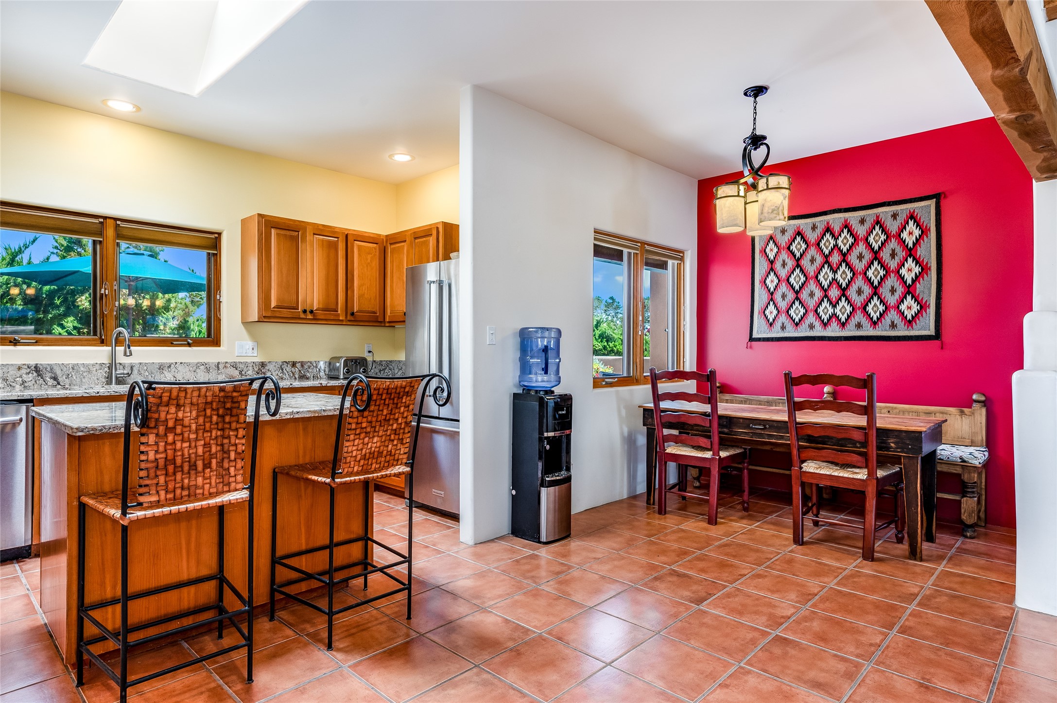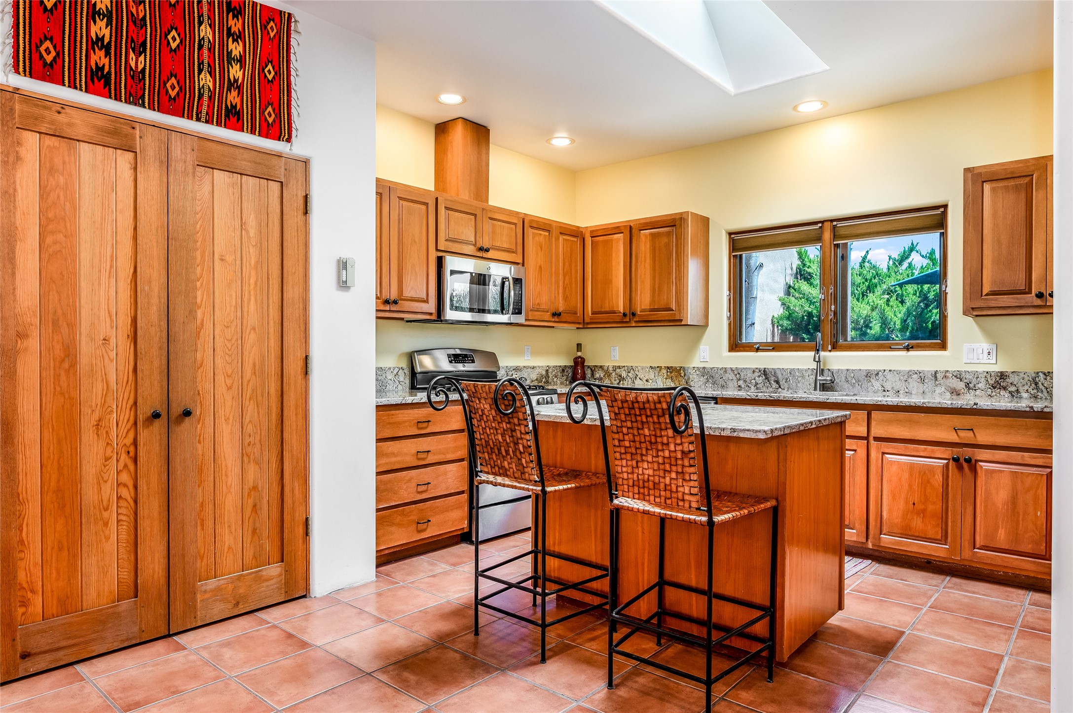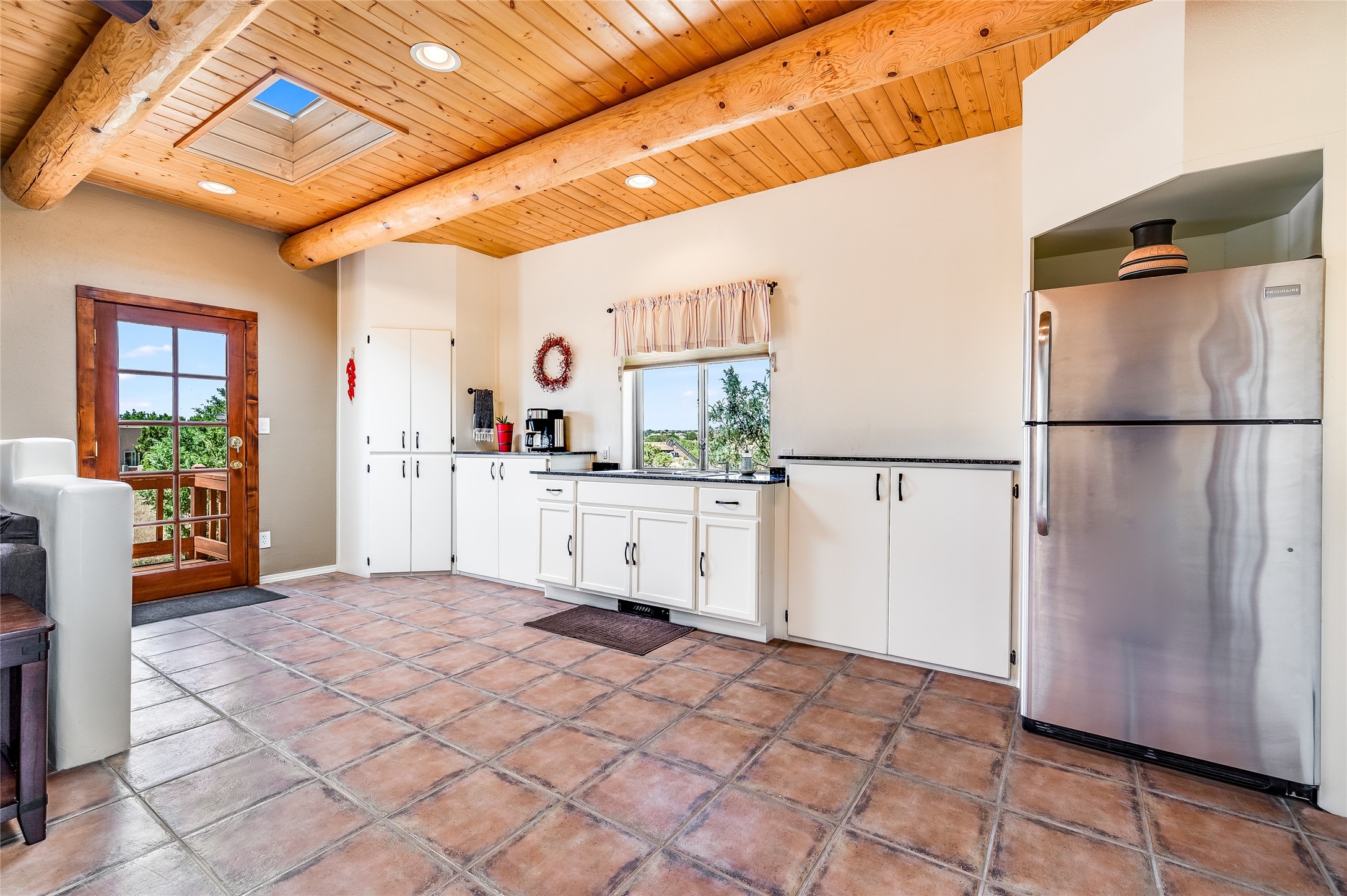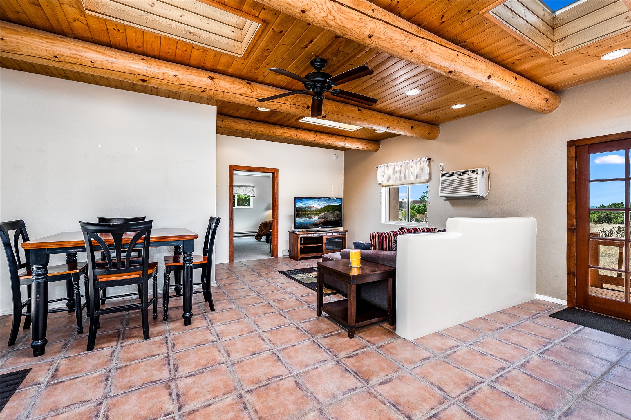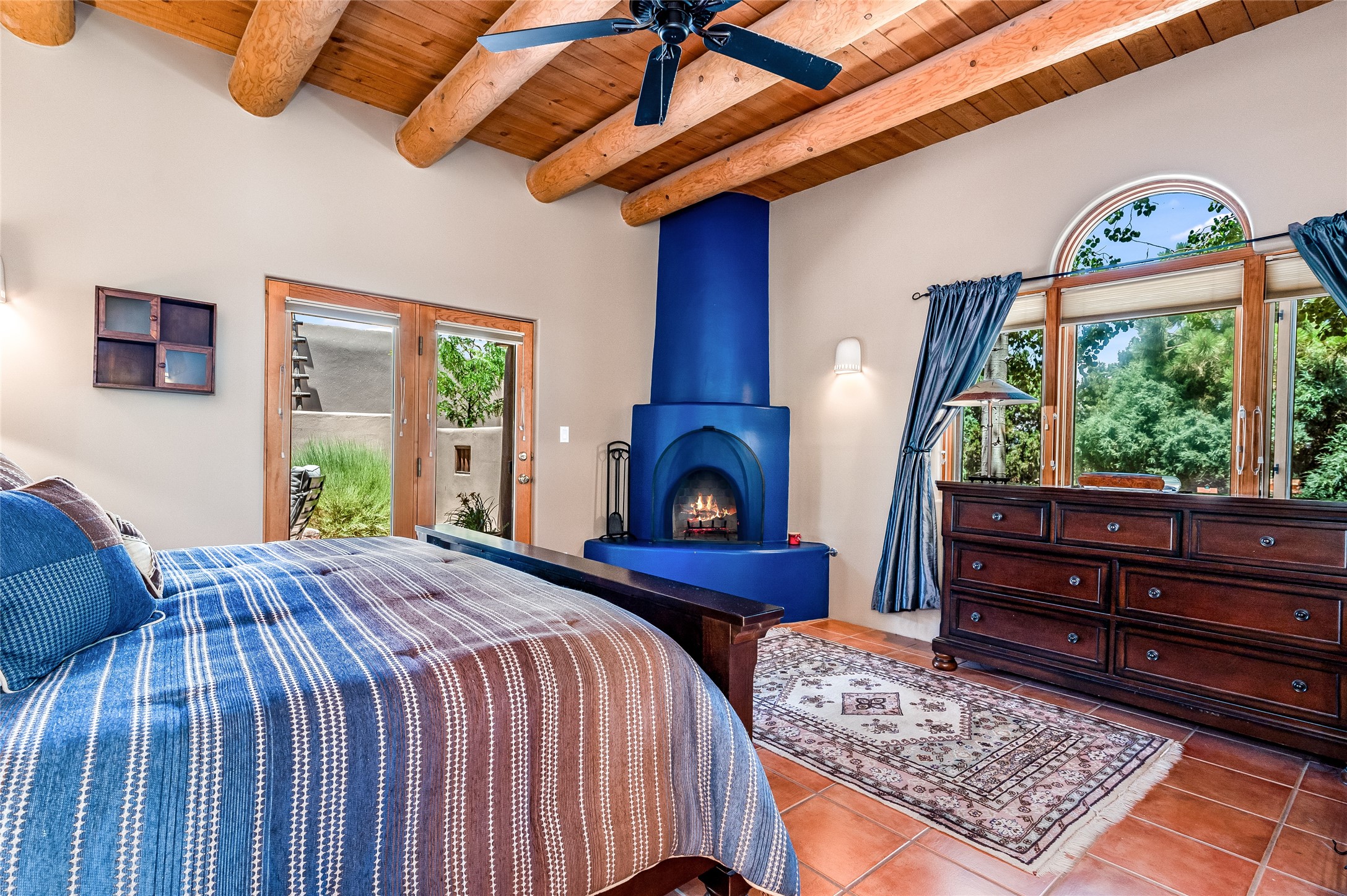 A quiet elegance and ambient symmetry flows throughout this exquisite Eldorado home. It is a shining example of pueblo contemporary design custom built by Adobeworks Inc. An open plan, split 3 bedroom plus lovely den/library with Rumford style central fireplace. Spacious living room with high viga ceilings, gleaming Saltillo floors and traditional kiva fireplace. Spacious kitchen with pantry and informal dining lead out onto a large shady portal. The main house includes over 2470 sq.ft plus a heated studio with half bath plus a 2 car finished garage. Beautifully maintained and surrounded by mature lovingly cared for walled gardens create private relaxing spaces. There is a walkway leading to a lovely remodeled and expanded 762 sq.ft casita which will delight your guests and family visitors. The home and casita share fabulous mountain views and yet delightfully private and peaceful. On one and half acres this home accesses all that Eldorado amenities offer plus local shopping, library, restaurants and open trails yet only minutes into Santa Fe. A must see!