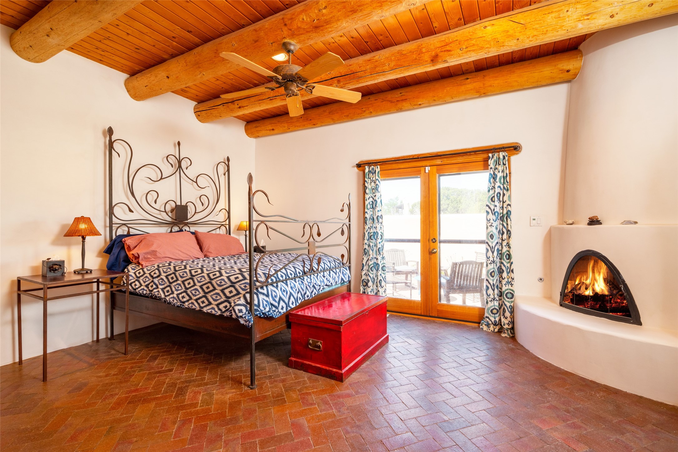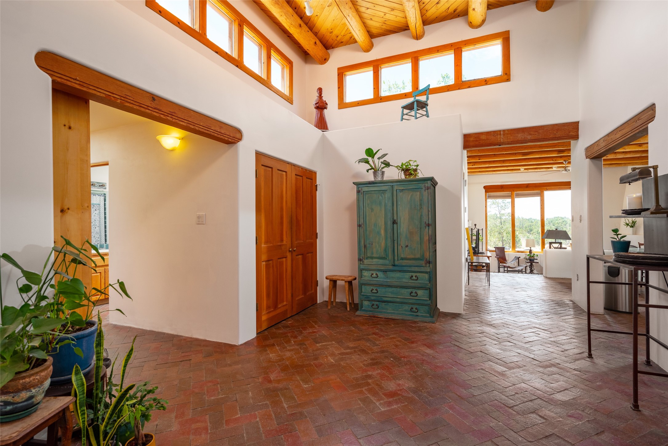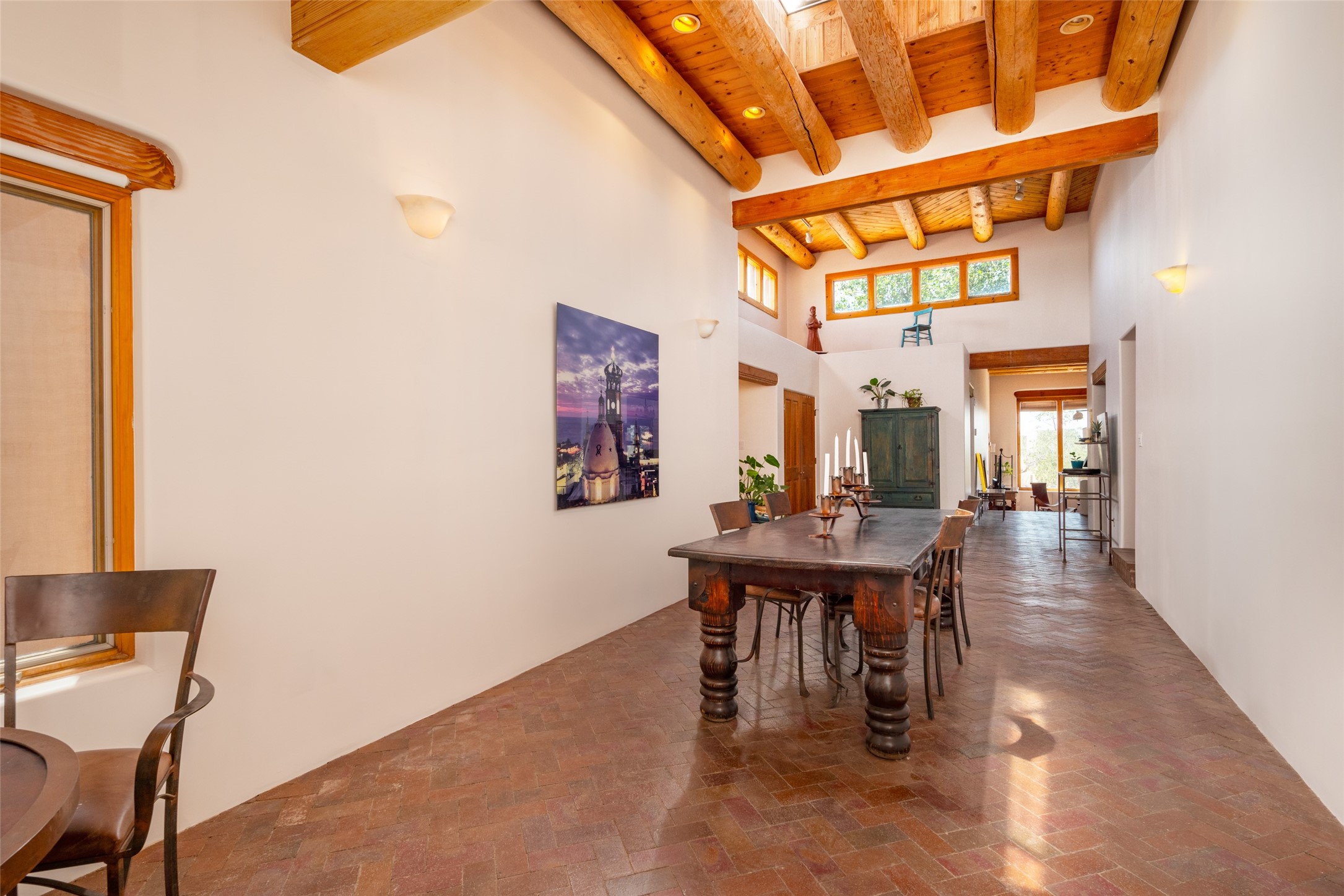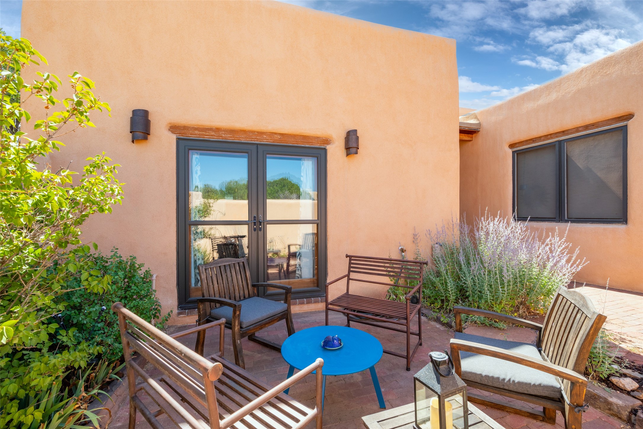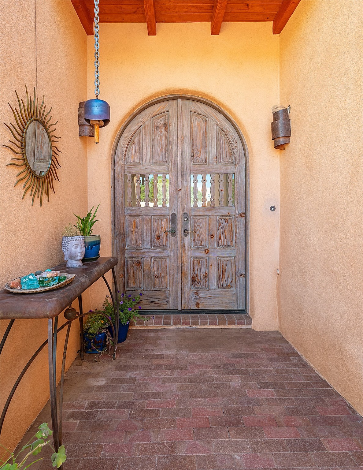 Enter the peaceful front courtyard, continue through the vintage Mexican carved doors into the dramatic entry with soaring ceilings This beautiful Eldorado home was built around 1991 . The previous owners added an addition to create a master bedroom with kiva fireplace. The home has brick floors throughout, large windows to take in the views and 2 additional courtyard spaces for outside enjoyment. The kitchen has been remodeled. There is great separation between the 4 bedrooms and 3 baths, with a choice of which bedroom you want to be the master, both lead to a courtyard. Don't miss this beautiful home.