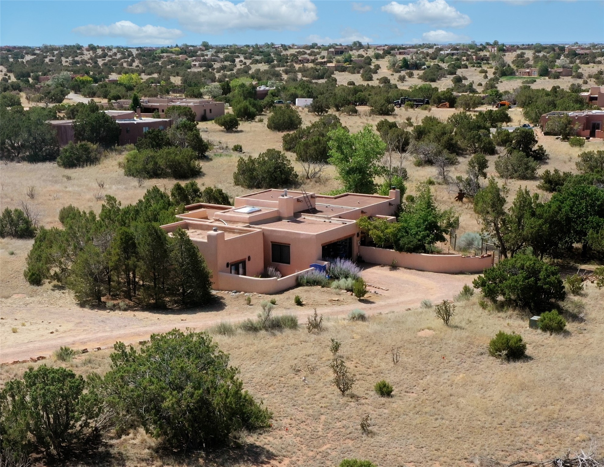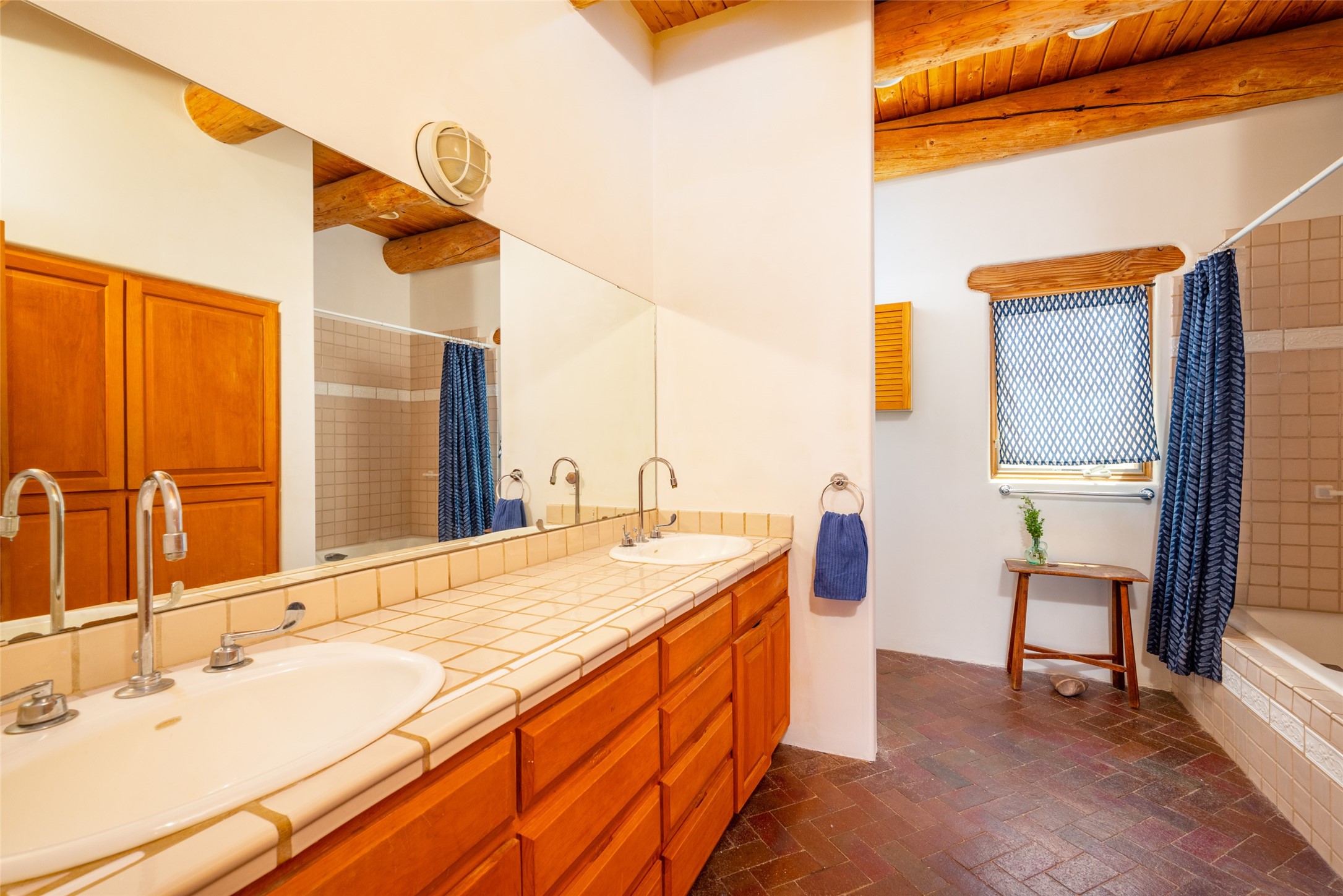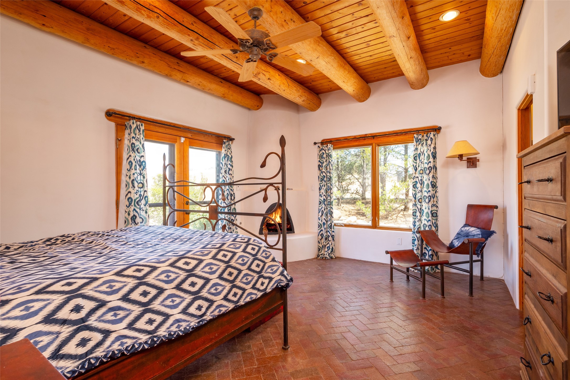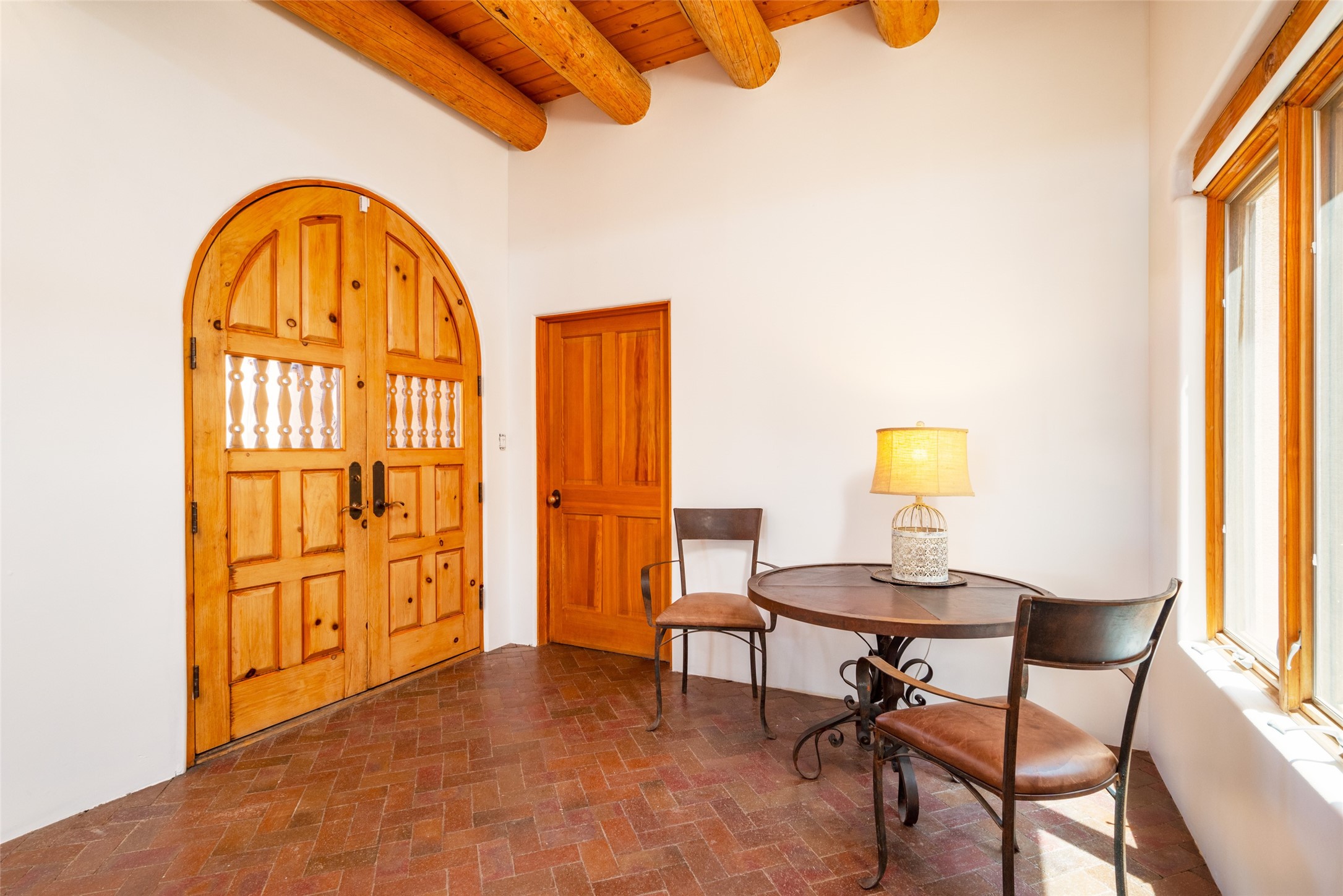Enter the peaceful front courtyard, continue through the vintage Mexican carved doors into the dramatic entry with soaring ceilings This beautiful Eldorado home was built around 1991 . The previous owners added an addition to create a master bedroom with kiva fireplace. The home has brick floors throughout, large windows to take in the views and 2 additional courtyard spaces for outside enjoyment. The kitchen has been remodeled. There is great separation between the 4 bedrooms and 3 baths, with a choice of which bedroom you want to be the master, both lead to a courtyard. Don't miss this beautiful home.
