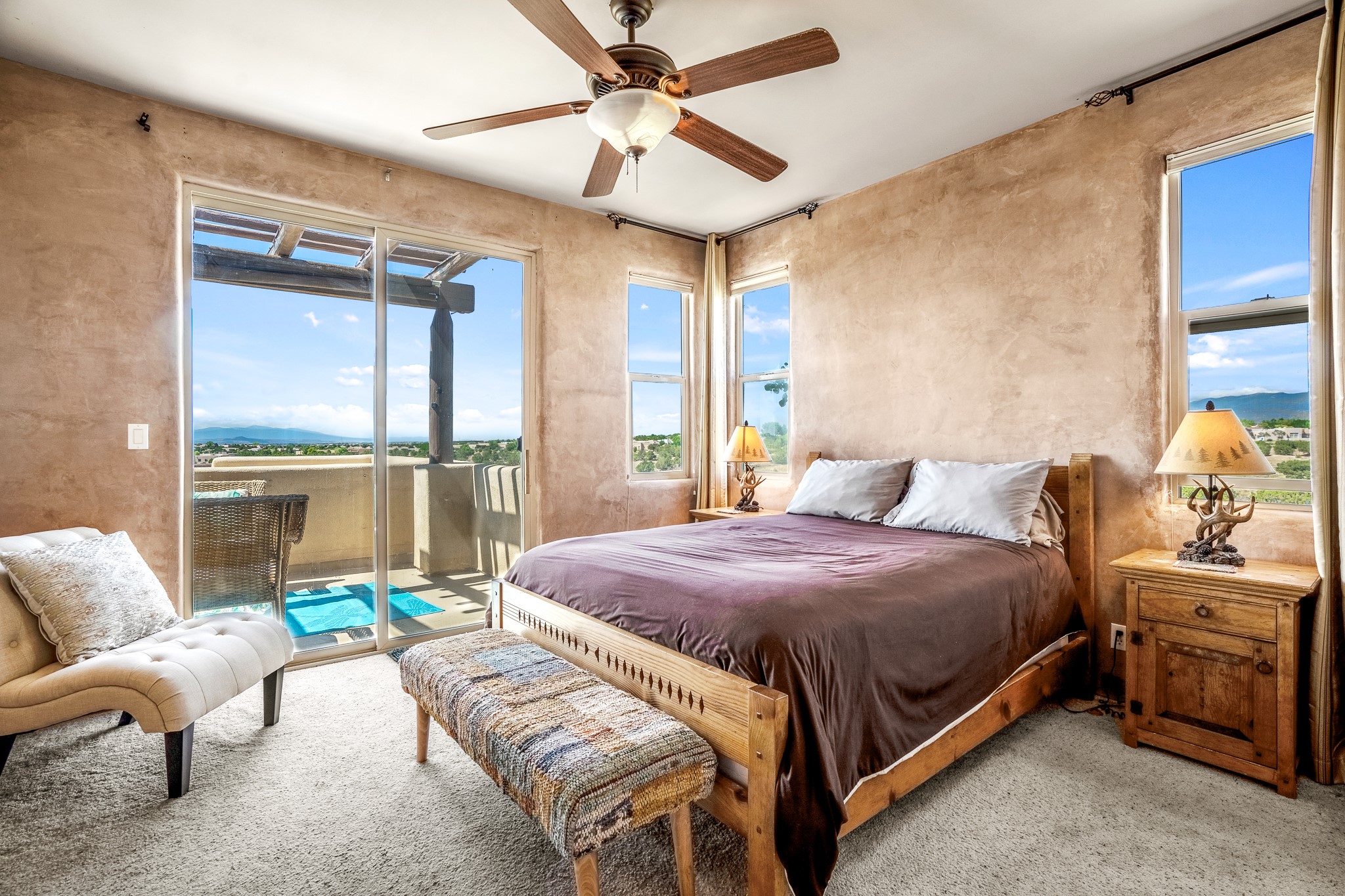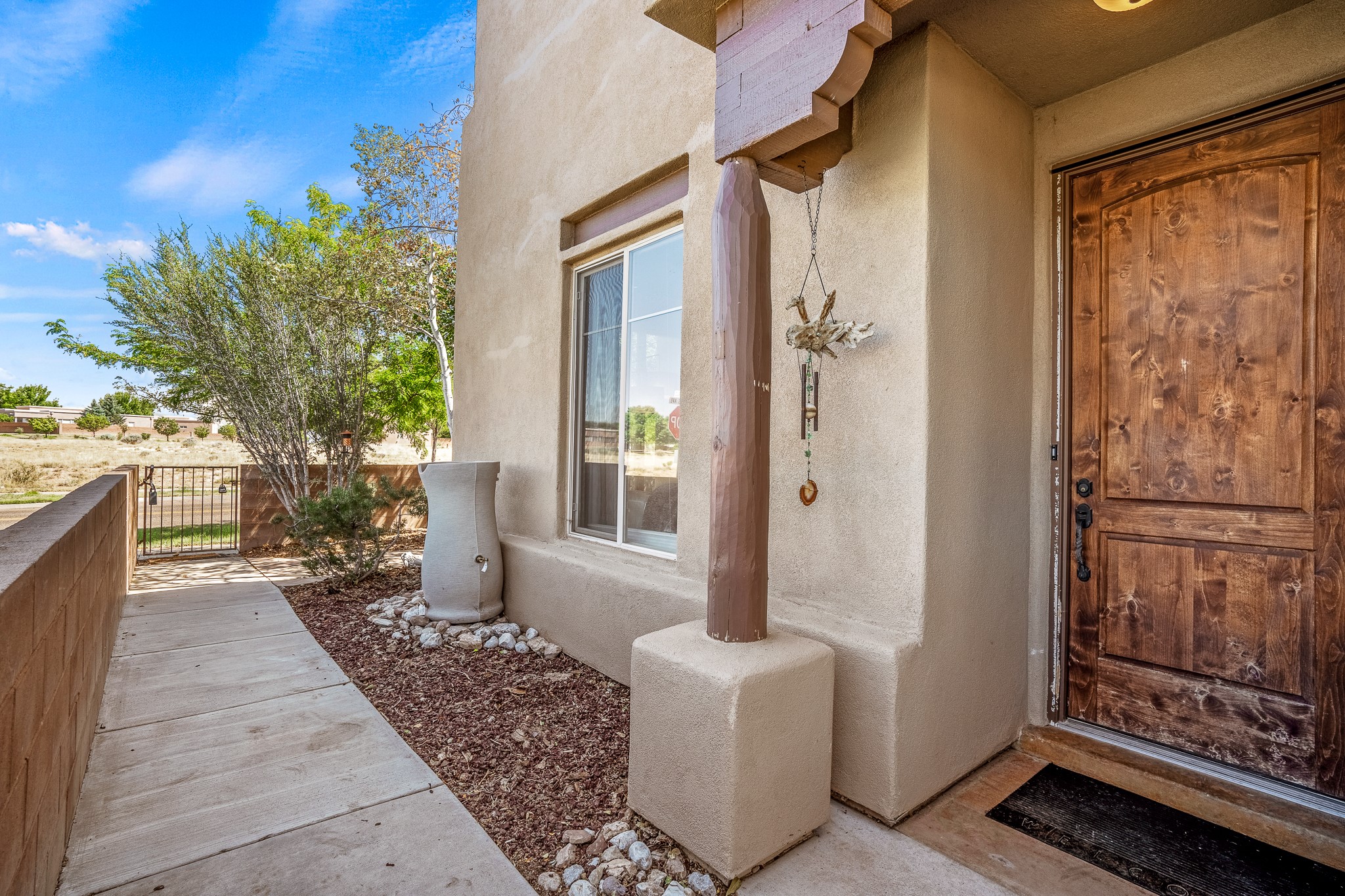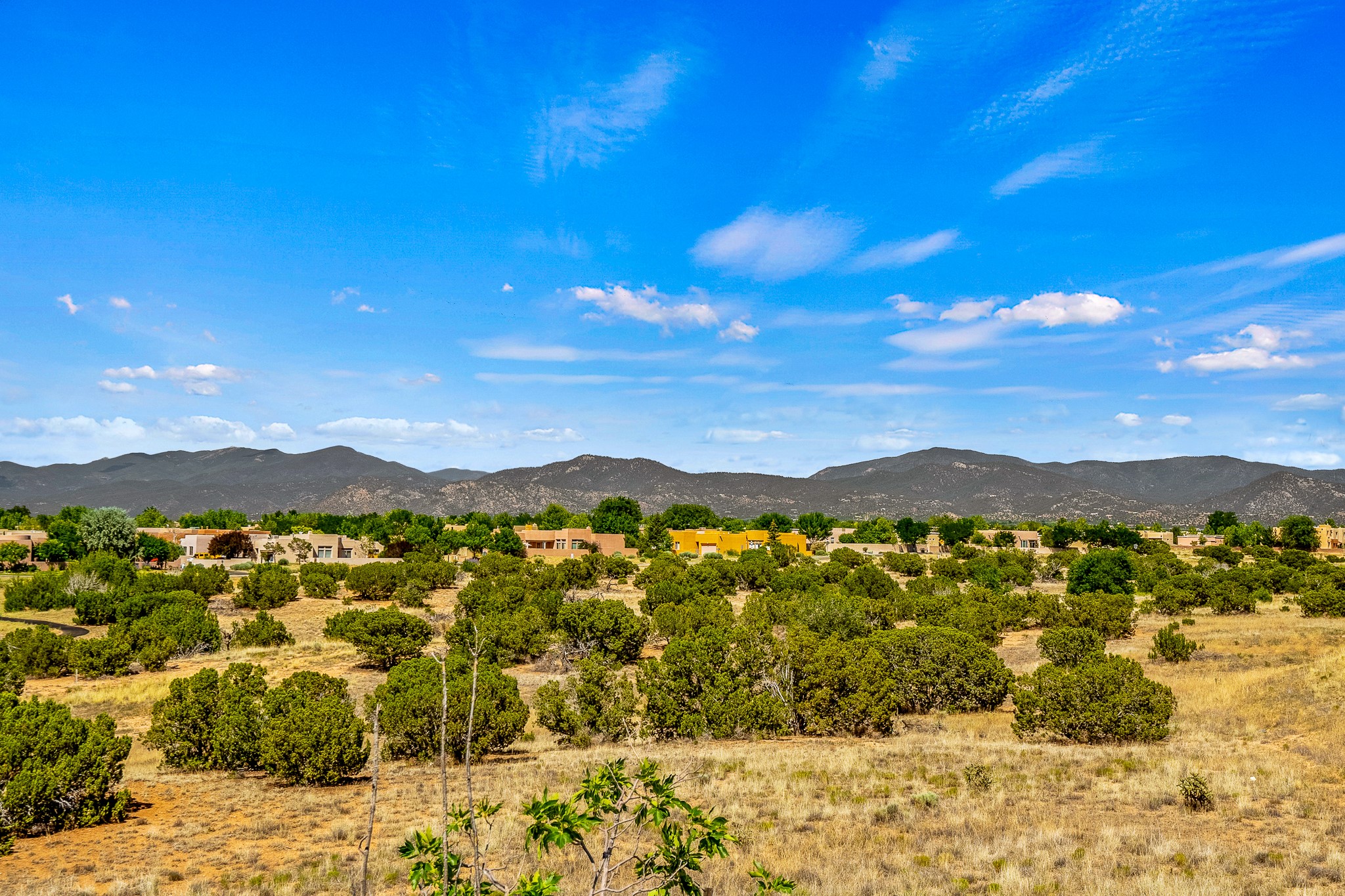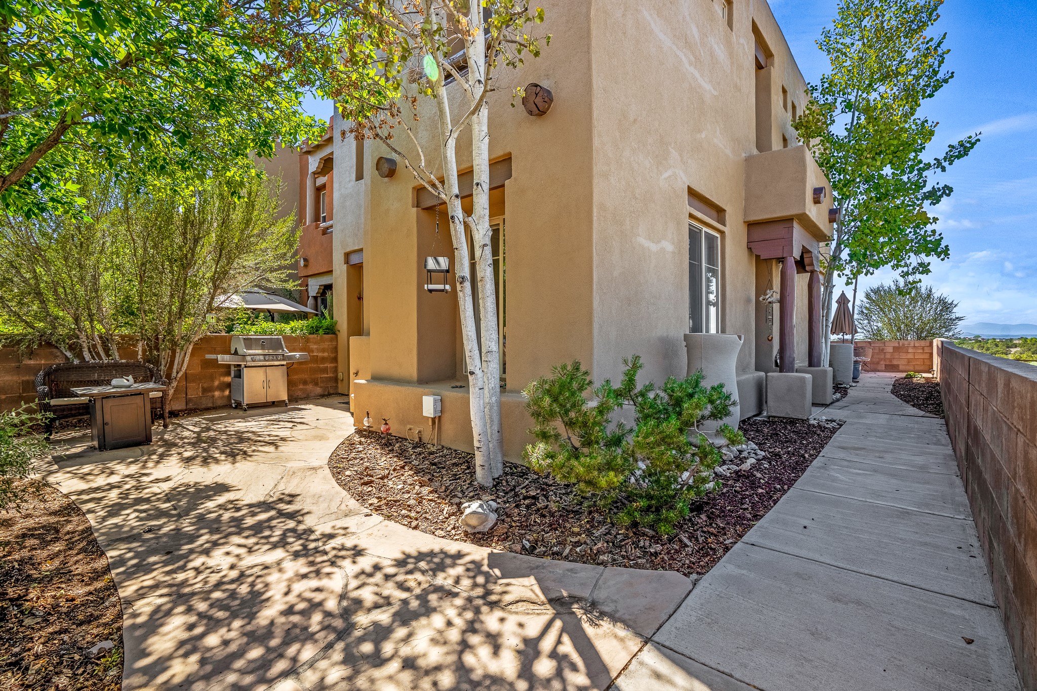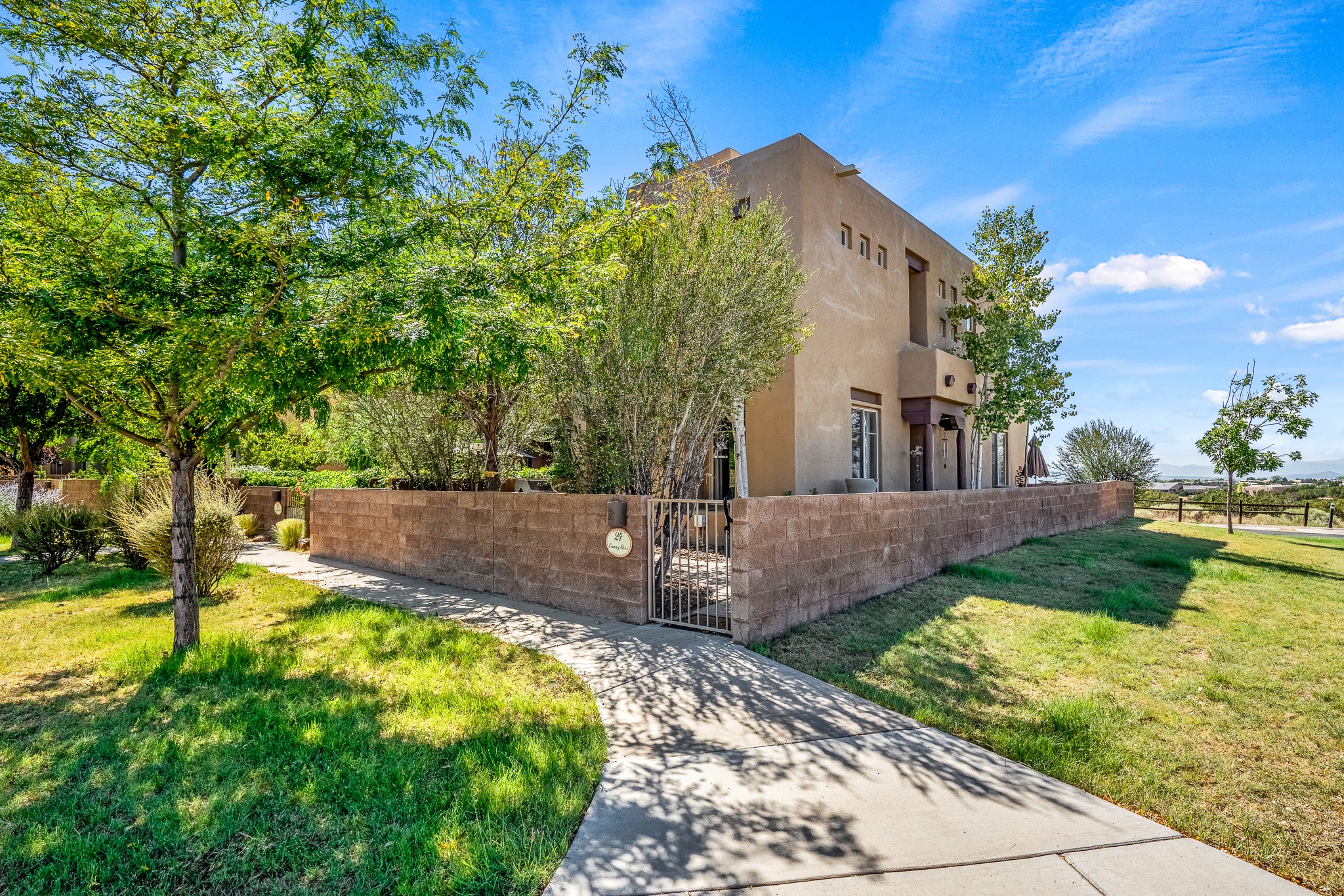 Enchanting townhome in Rancho Viejo with superior finishes and superb VIEWS. This end-unit beauty in move-in ready condition has all the southwestern charm you seek in a peaceful community minutes from downtown Santa Fe. High ceilings are accentuated by round vigas with tongue & groove planks in rich wood tones while gleaming plaster walls, a corner kiva fireplace and wrought iron staircase add to the grace and elegance of this showpiece. Large windows capture mountain views in every level and allow natural light to fill the interior spaces. The open concept living, dining and kitchen areas with an easy flow between the inside and outdoor courtyards. An office and powder room on the main level add convenience and functionality. Fabulous views can be enjoyed from every window, displaying multiple mountain ranges, and boasts gorgeous sunrises and sunsets. A large upstairs deck adjoining the owner's suite brings the outdoors right inside. A second bedroom and hallway bath is sure to make guests feel at home. Other features include an attached 2-car garage, multiple flagstone patios, and recent re-roof. A groomed trail system through miles of open space, is a cyclist/walker/runner's dream. HOA dues cover most of exterior maintenance and repairs. Come see for yourself!