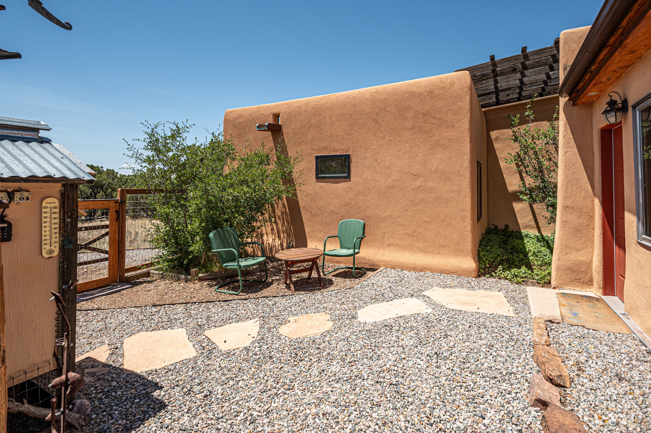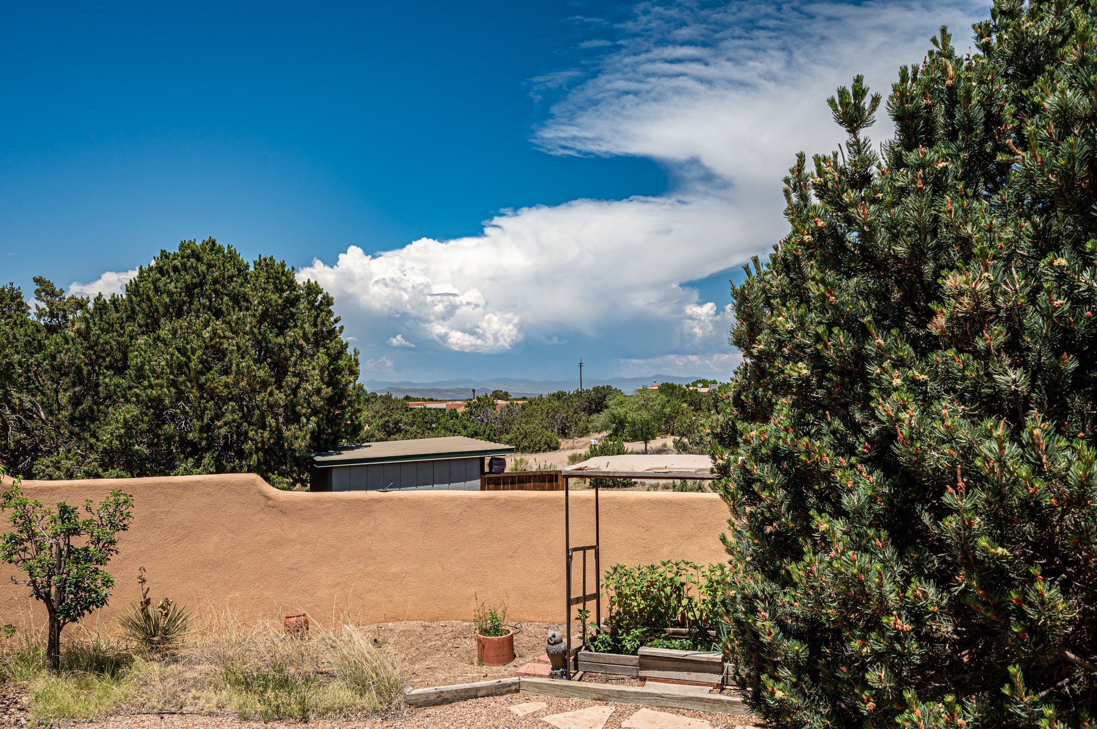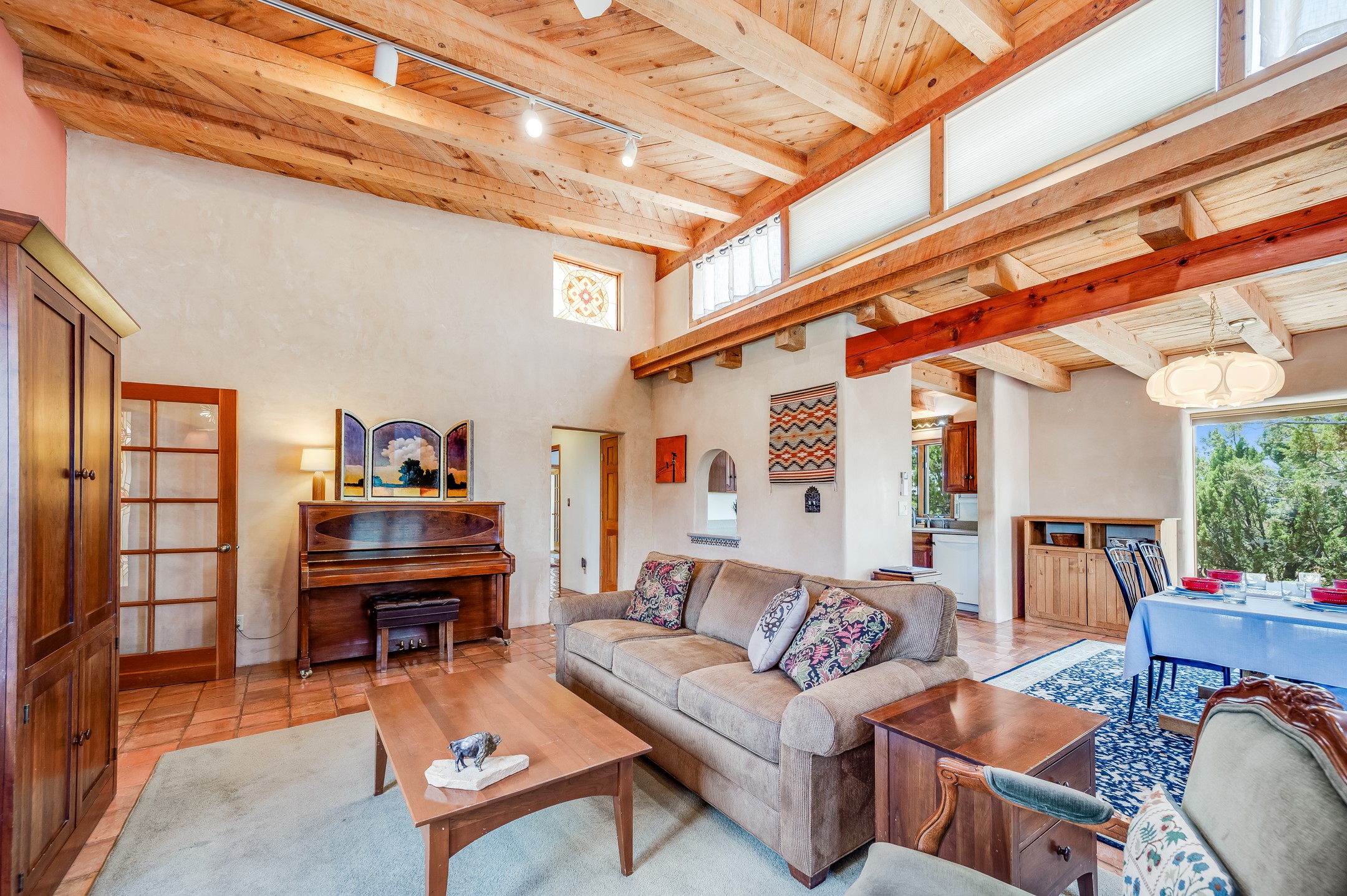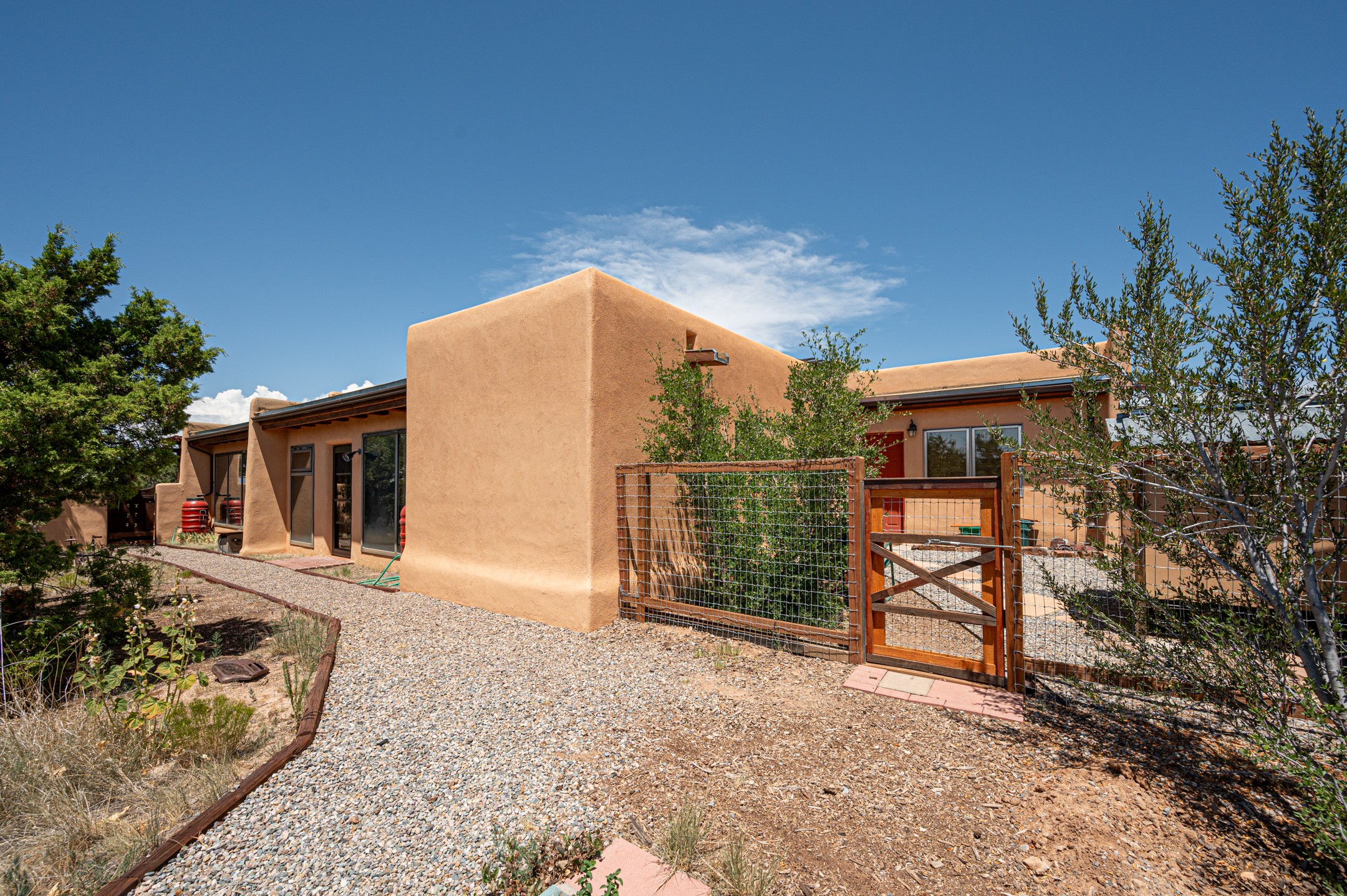 True pride of ownership is reflected in every inch of this wonderfully maintained Eldorado classic. This charming pueblo style home with clerestory windows and Trombe walls was built with passive solar gain in mind, and now with the addition of a solar panel system you can comfortably say goodbye to those pesky high electric bills and enjoy year-round comfort in this all-electric home with heat pumps for AC and heat. Upon entering this lovely home, you will instantly feel the timelessness of the traditional Santa Fe style including beautiful Saltillo tile floors, warm tinted plaster walls, kiva fireplace, and gorgeous wood ceilings and beams. This, along with the very flexible floorplan, allows you to create your perfect living spaces to suit your lifestyle. Currently this 4-bedroom 3 bath home is set up as a 3-bedroom with a media room and a generously sized office off the primary bedroom. Outside, you get glorious western sunsets and mountain views off your wood deck with a walled yard for your four-legged friends, and a delightful private area with the best chicken facilities in Eldorado. Also includes an attached oversized 2-car garage with shop area and lots of storage space. The Eldorado community offers miles of trails and paved bike paths, a public library, a fantastic community center with pool, tennis, pickleball, volleyball, disc golf, athletic fields, dog park and more. It also has The Agora Shopping center with grocery store, and so much more! Did I mention the community preserve and the starry night skies?