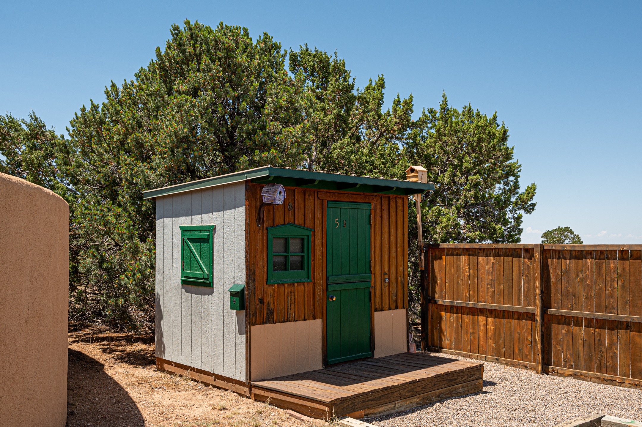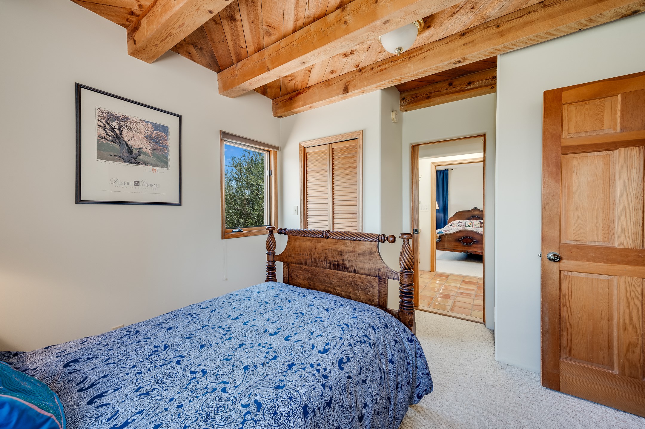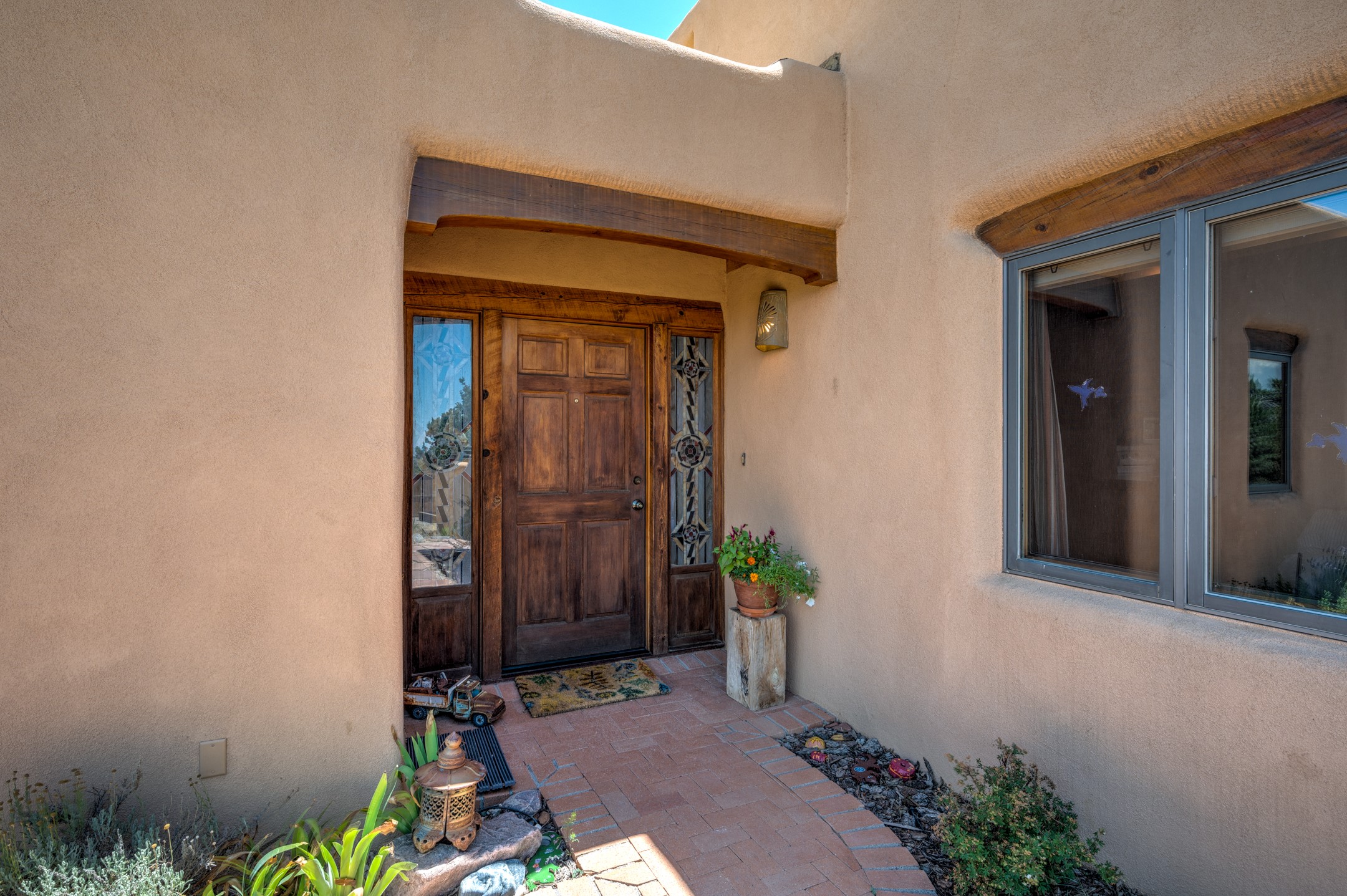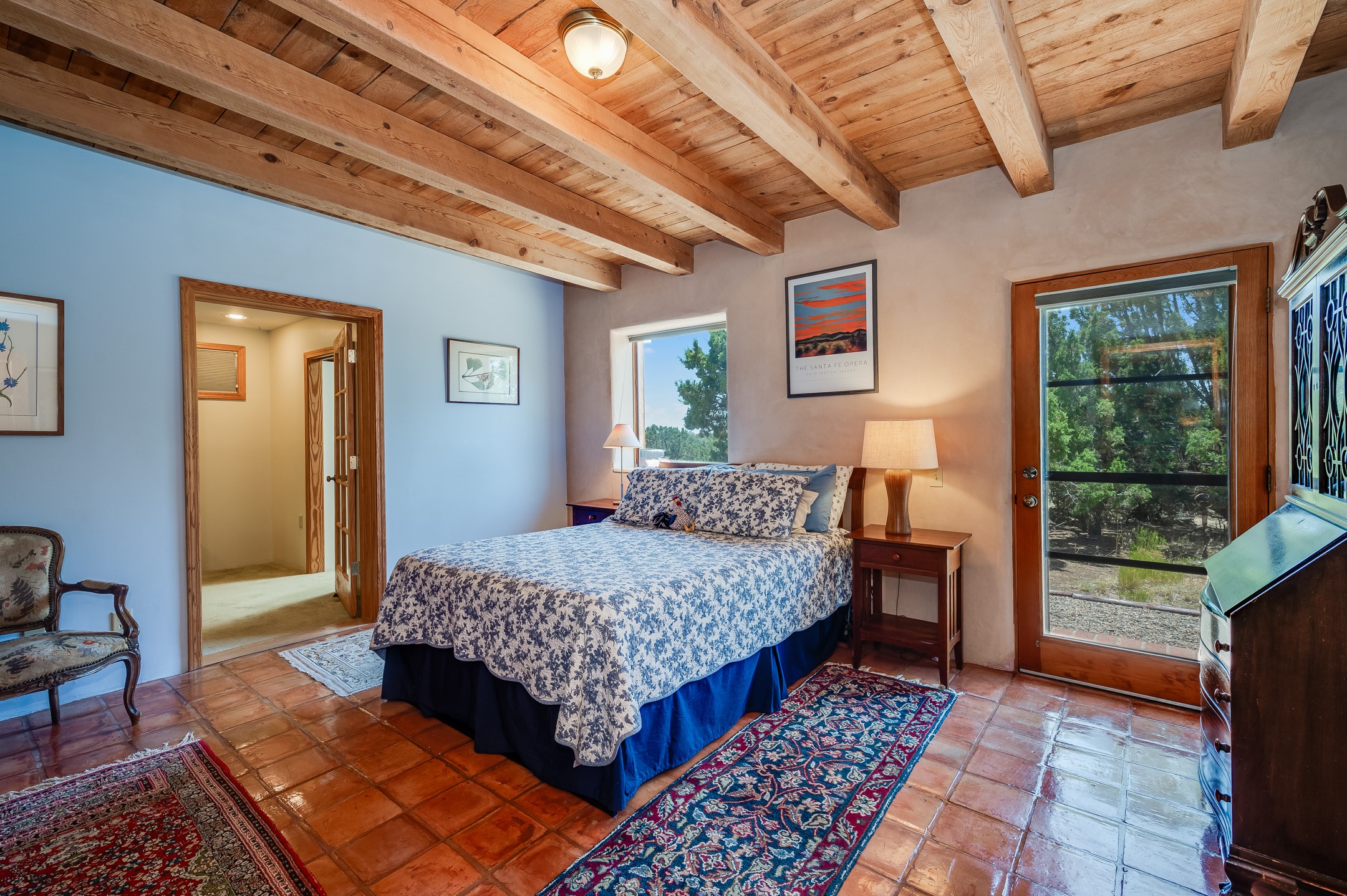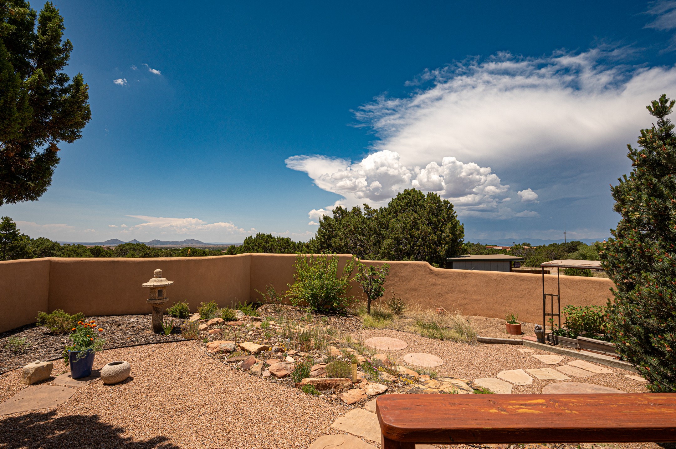 True pride of ownership is reflected in every inch of this wonderfully maintained Eldorado classic. This charming pueblo style home with clerestory windows and Trombe walls was built with passive solar gain in mind, and now with the addition of a solar panel system you can comfortably say goodbye to those pesky high electric bills and enjoy year-round comfort in this all-electric home with heat pumps for AC and heat. Upon entering this lovely home, you will instantly feel the timelessness of the traditional Santa Fe style including beautiful Saltillo tile floors, warm tinted plaster walls, kiva fireplace, and gorgeous wood ceilings and beams. This, along with the very flexible floorplan, allows you to create your perfect living spaces to suit your lifestyle. Currently this 4-bedroom 3 bath home is set up as a 3-bedroom with a media room and a generously sized office off the primary bedroom. Outside, you get glorious western sunsets and mountain views off your wood deck with a walled yard for your four-legged friends, and a delightful private area with the best chicken facilities in Eldorado. Also includes an attached oversized 2-car garage with shop area and lots of storage space. The Eldorado community offers miles of trails and paved bike paths, a public library, a fantastic community center with pool, tennis, pickleball, volleyball, disc golf, athletic fields, dog park and more. It also has The Agora Shopping center with grocery store, and so much more! Did I mention the community preserve and the starry night skies?