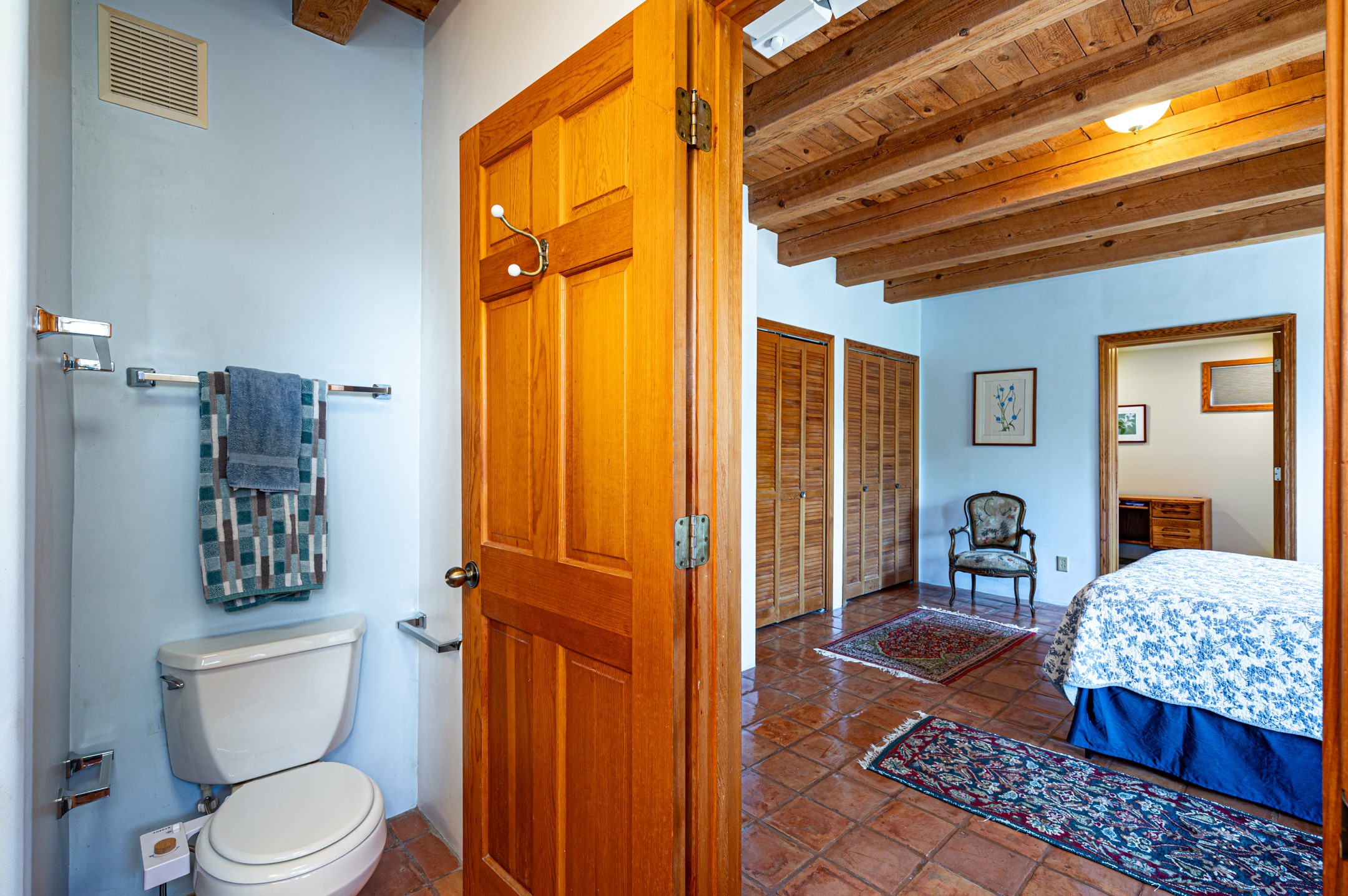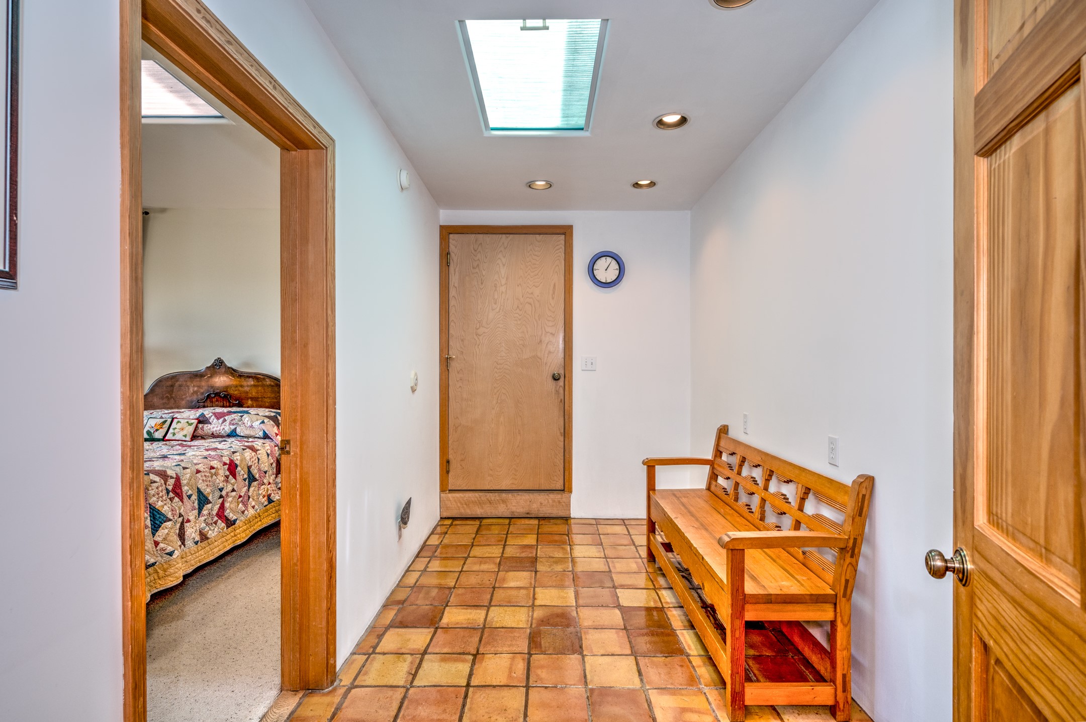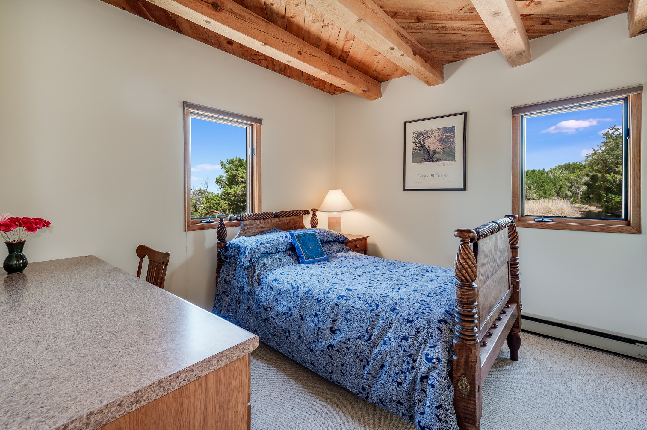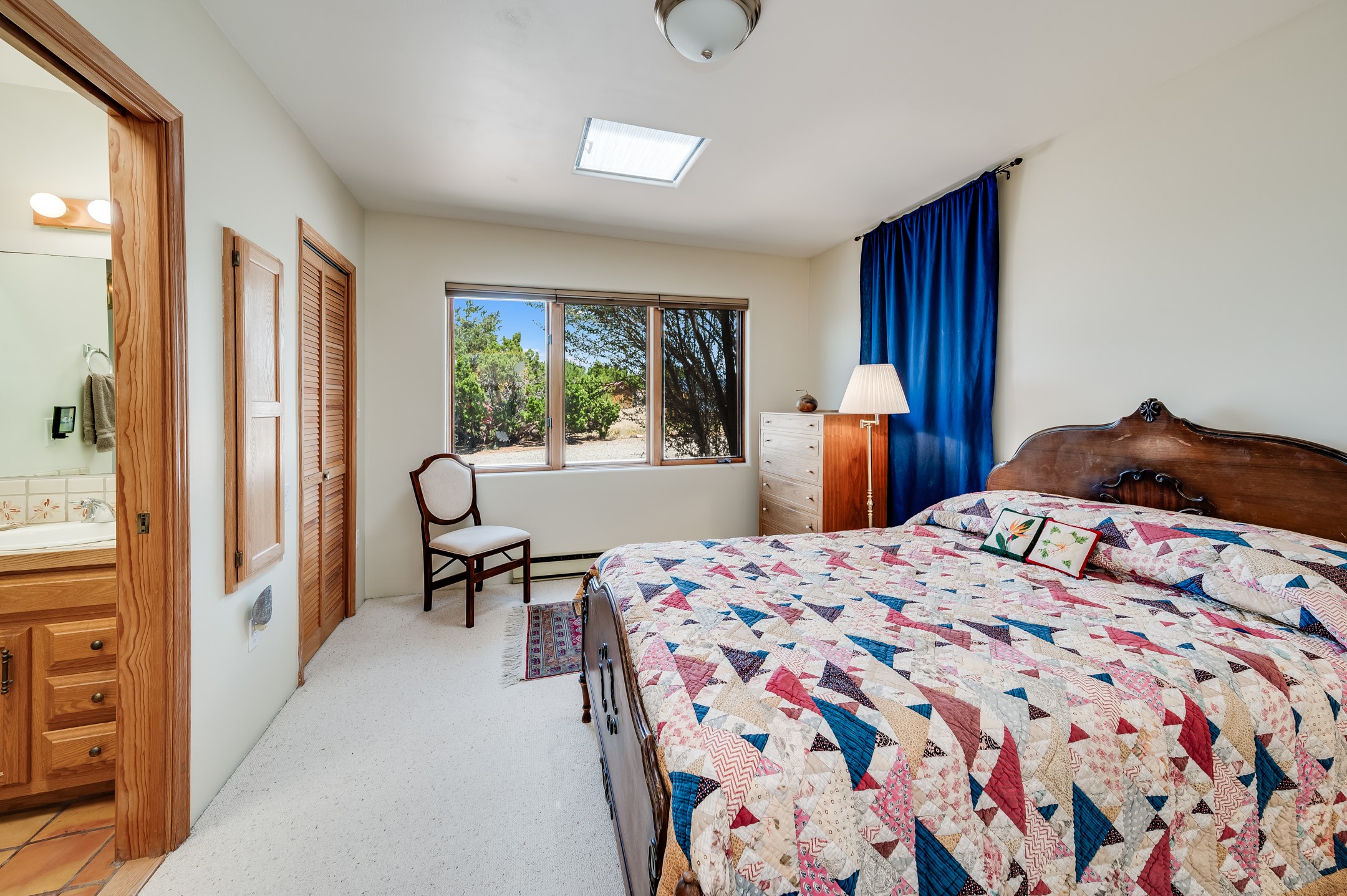 True pride of ownership is reflected in every inch of this wonderfully maintained Eldorado classic. This charming pueblo style home with clerestory windows and Trombe walls was built with passive solar gain in mind, and now with the addition of a solar panel system you can comfortably say goodbye to those pesky high electric bills and enjoy year-round comfort in this all-electric home with heat pumps for AC and heat. Upon entering this lovely home, you will instantly feel the timelessness of the traditional Santa Fe style including beautiful Saltillo tile floors, warm tinted plaster walls, kiva fireplace, and gorgeous wood ceilings and beams. This, along with the very flexible floorplan, allows you to create your perfect living spaces to suit your lifestyle. Currently this 4-bedroom 3 bath home is set up as a 3-bedroom with a media room and a generously sized office off the primary bedroom. Outside, you get glorious western sunsets and mountain views off your wood deck with a walled yard for your four-legged friends, and a delightful private area with the best chicken facilities in Eldorado. Also includes an attached oversized 2-car garage with shop area and lots of storage space. The Eldorado community offers miles of trails and paved bike paths, a public library, a fantastic community center with pool, tennis, pickleball, volleyball, disc golf, athletic fields, dog park and more. It also has The Agora Shopping center with grocery store, and so much more! Did I mention the community preserve and the starry night skies?
