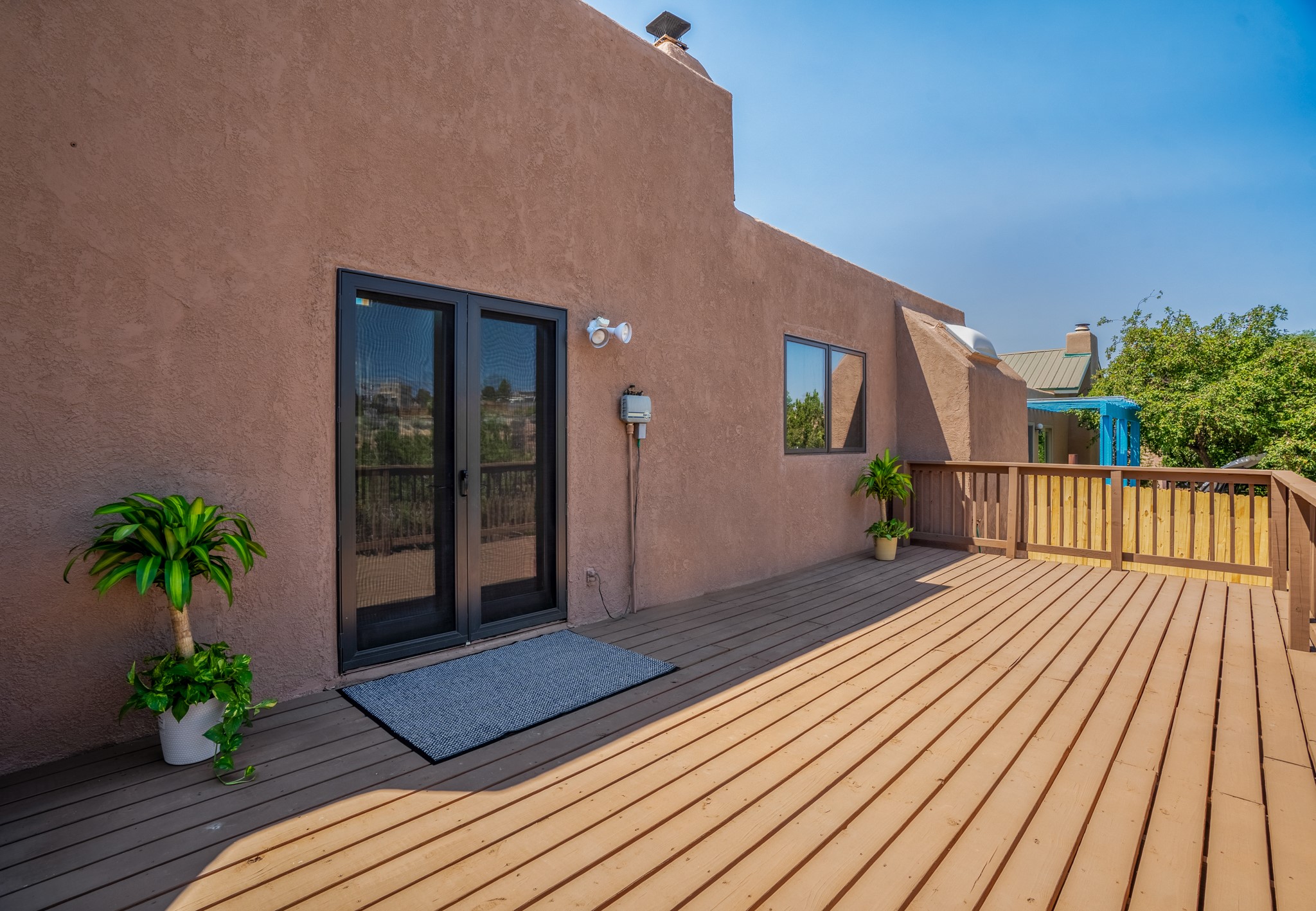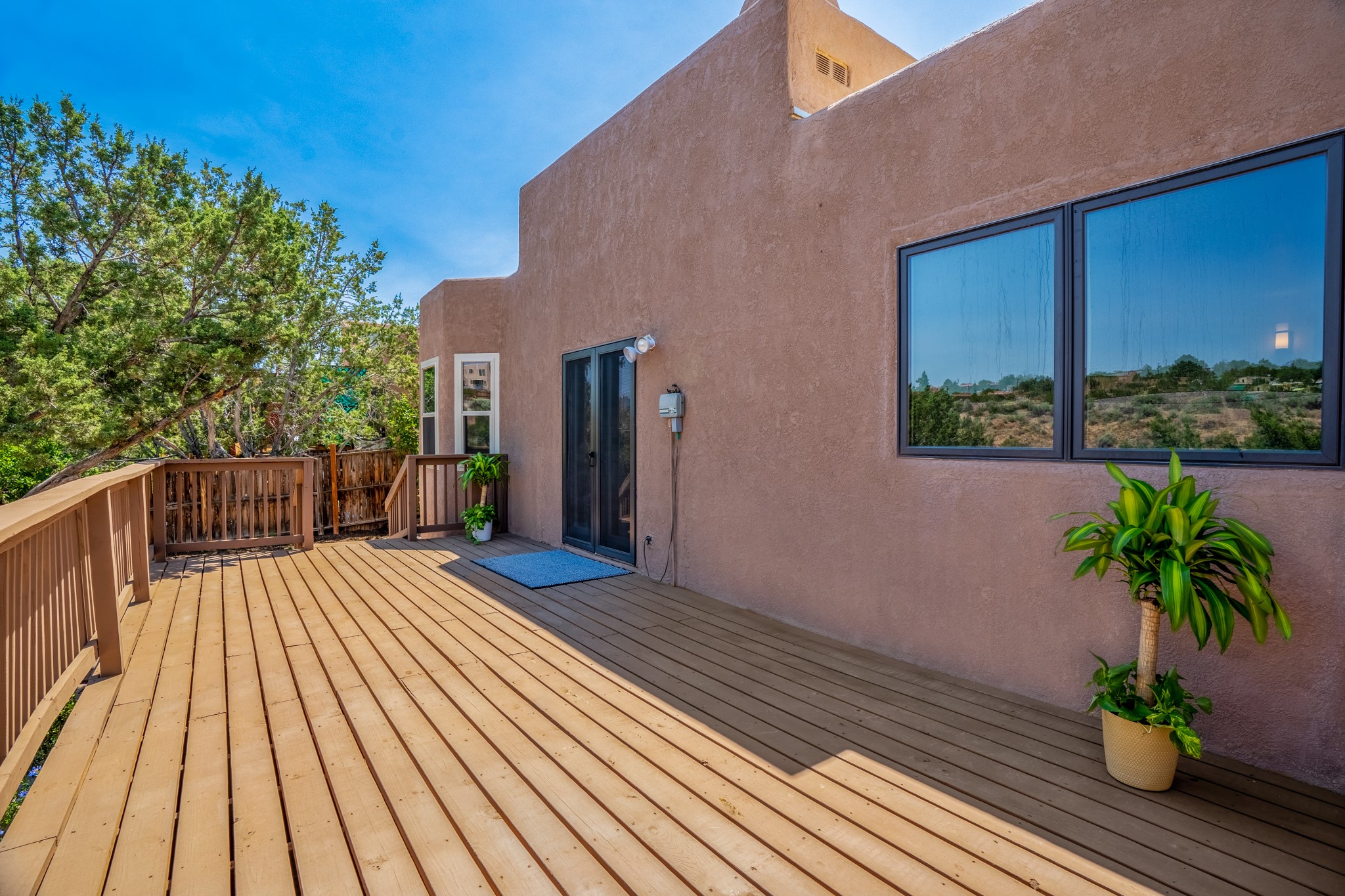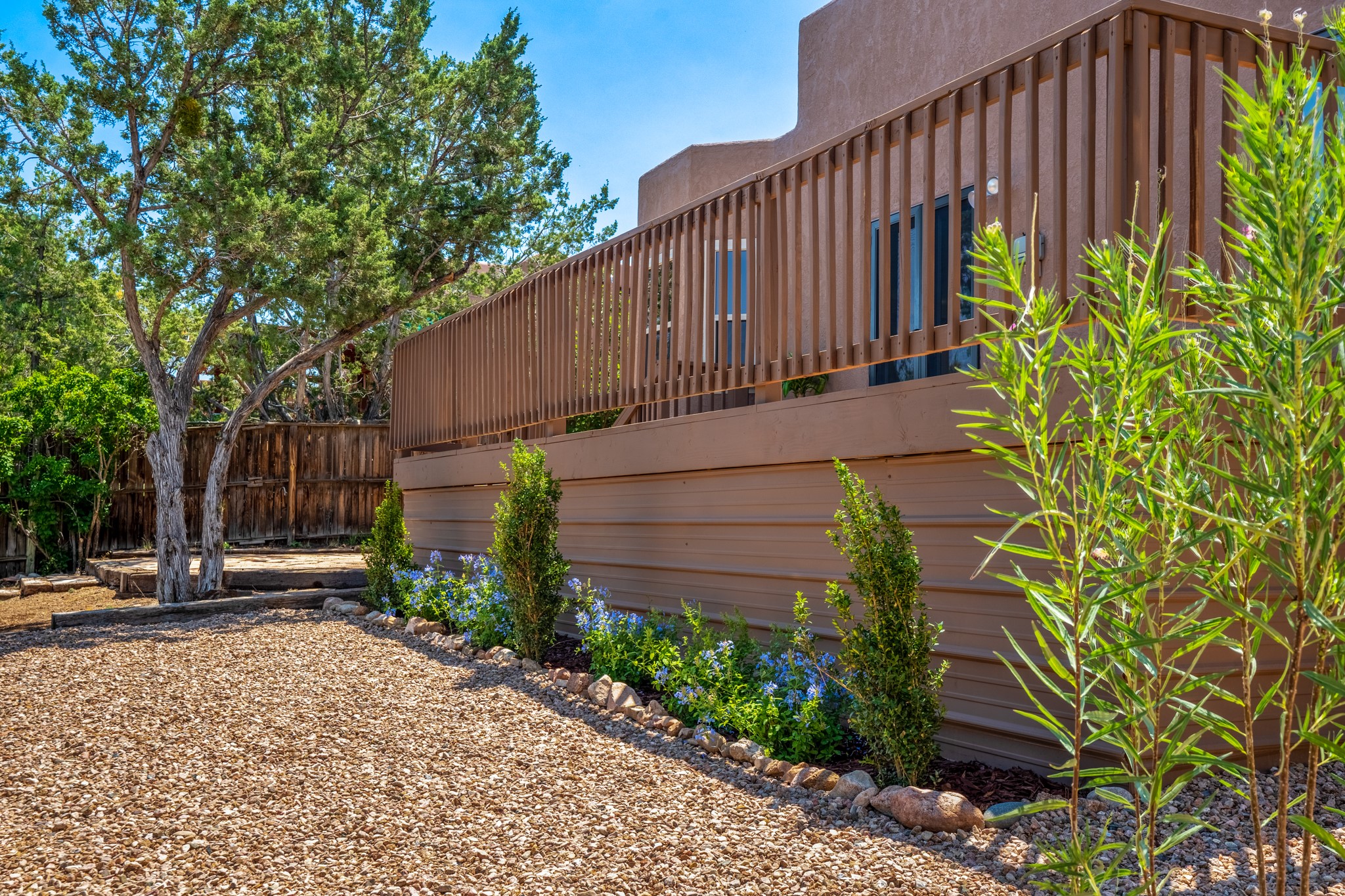 Stylish home located in Candelero Subdivision beautifully updated. Views, Granite Countertops, Saltillo Floors, Formal Dining area, Custom Beams, Kiva Fireplace. All New/Upgraded AC, Garage Door-Keypad & Motor, 12X30 Deck, SS Gas Range, Microwave, Interior/ Exterior Lighting & Fixtures, Paint, 2 Skylights & 11 Windows. HVAC 2021, TPO Roof & Water Heater 2022. Primary suite offers dual sinks, abundant natural lighting, & a generous walk-in closet w/builtins.New landscaping & drip system, a expansive, exceptional private outdoor space for relaxation, recreation, entertaining, ample storage, No HOA, & a 2 car garage finished. Unbeatable location to Rail Runner Station, Historic Plaza, Parks/Trails, Hiking-Biking, Restaurants, Shopping,Hospitals, Schools, I-25, Airport & Albuquerque.