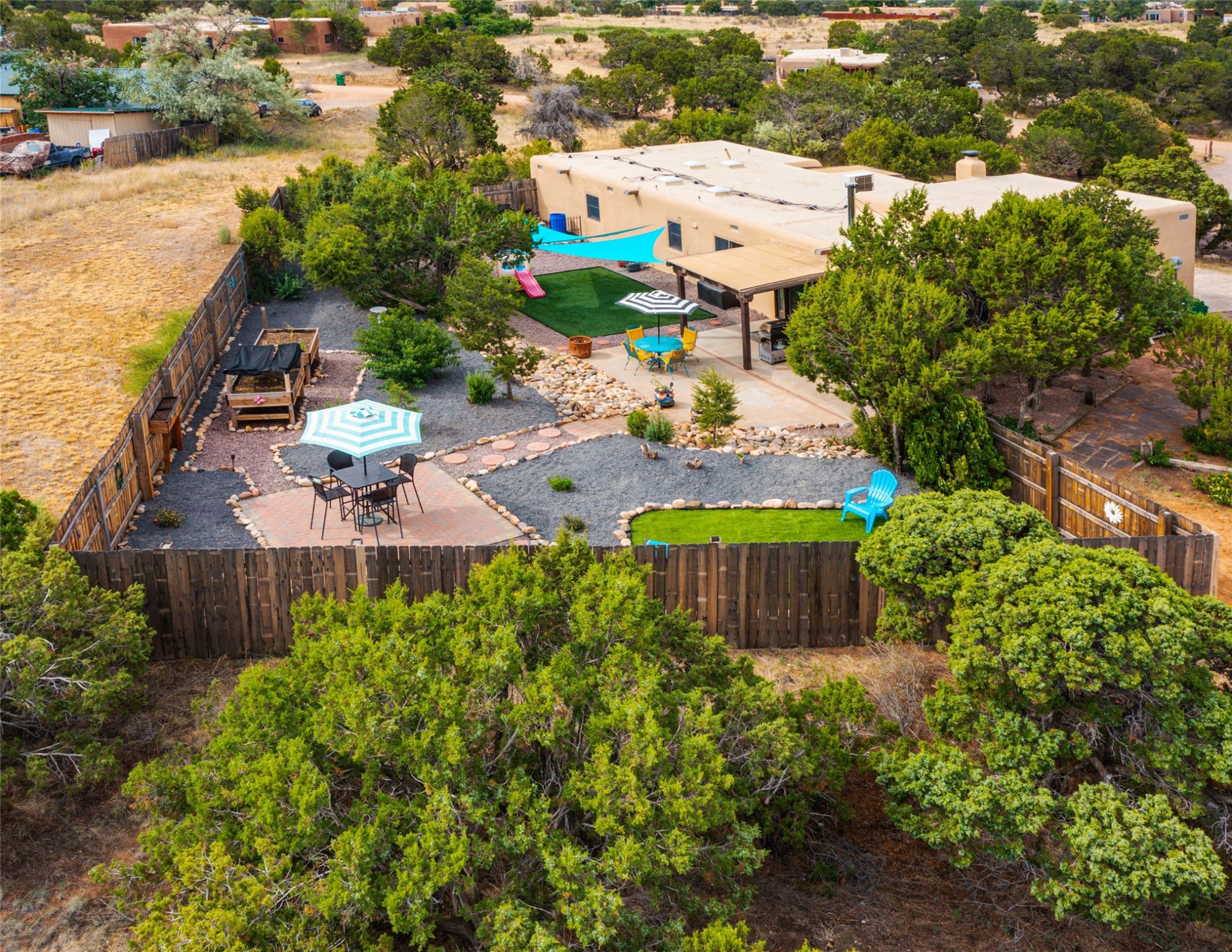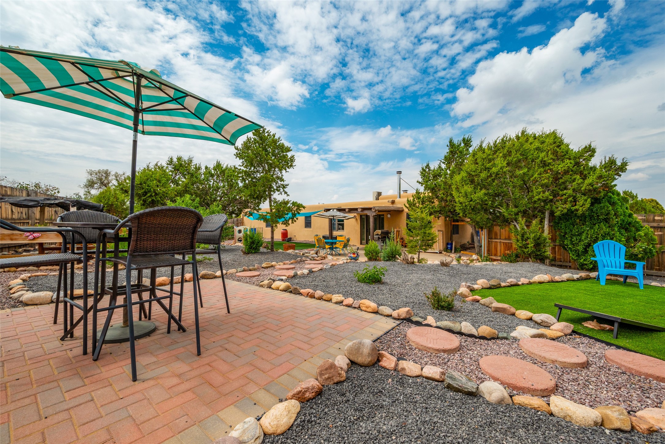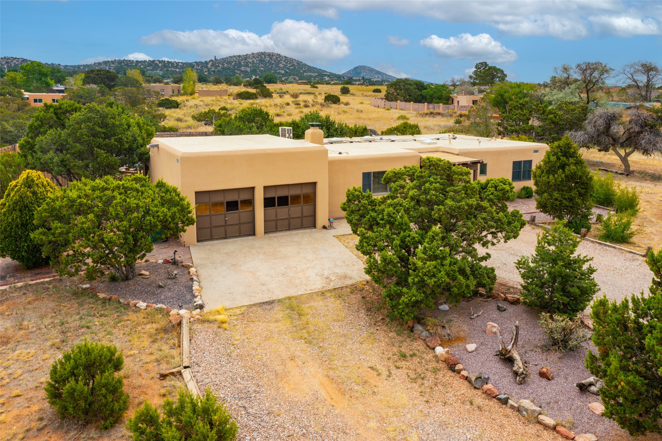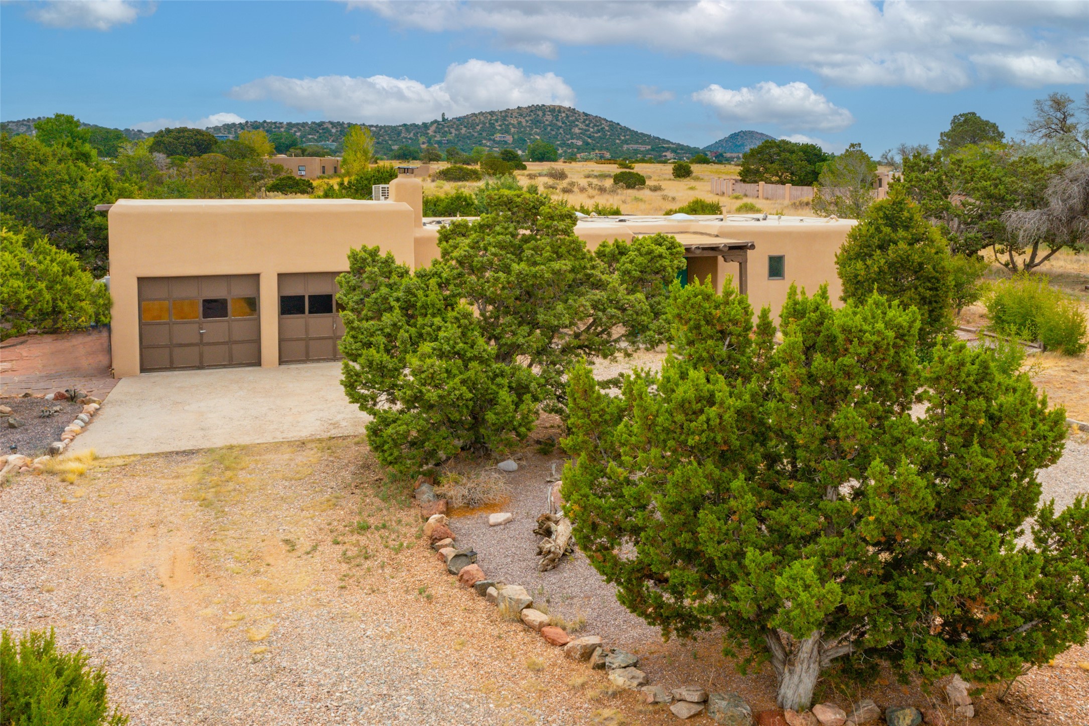 Great opportunity to own a 3-bedroom + Den/office, 2-bath, 2-car garage home on a 1-acre private treed lot in Eldorado on a quiet road. Recently remodeled with luxury vinyl flooring in living areas, new bathrooms, new wood stove, new kitchen appliances, newly installed fans, and freshly painted. Relax in the beautifully landscaped fenced-in backyard observe the sunset over the Jemez mountain range and then gaze up to the dazzling star-filled night sky. Situated in the best location near the first entrance with a quick commute to town, walking distance to Eldorado Community School, community center, pool, tennis courts, playground, and dog park. These features along with 5-mini-split cooling/heating units make this a turnkey home, ready to move into.