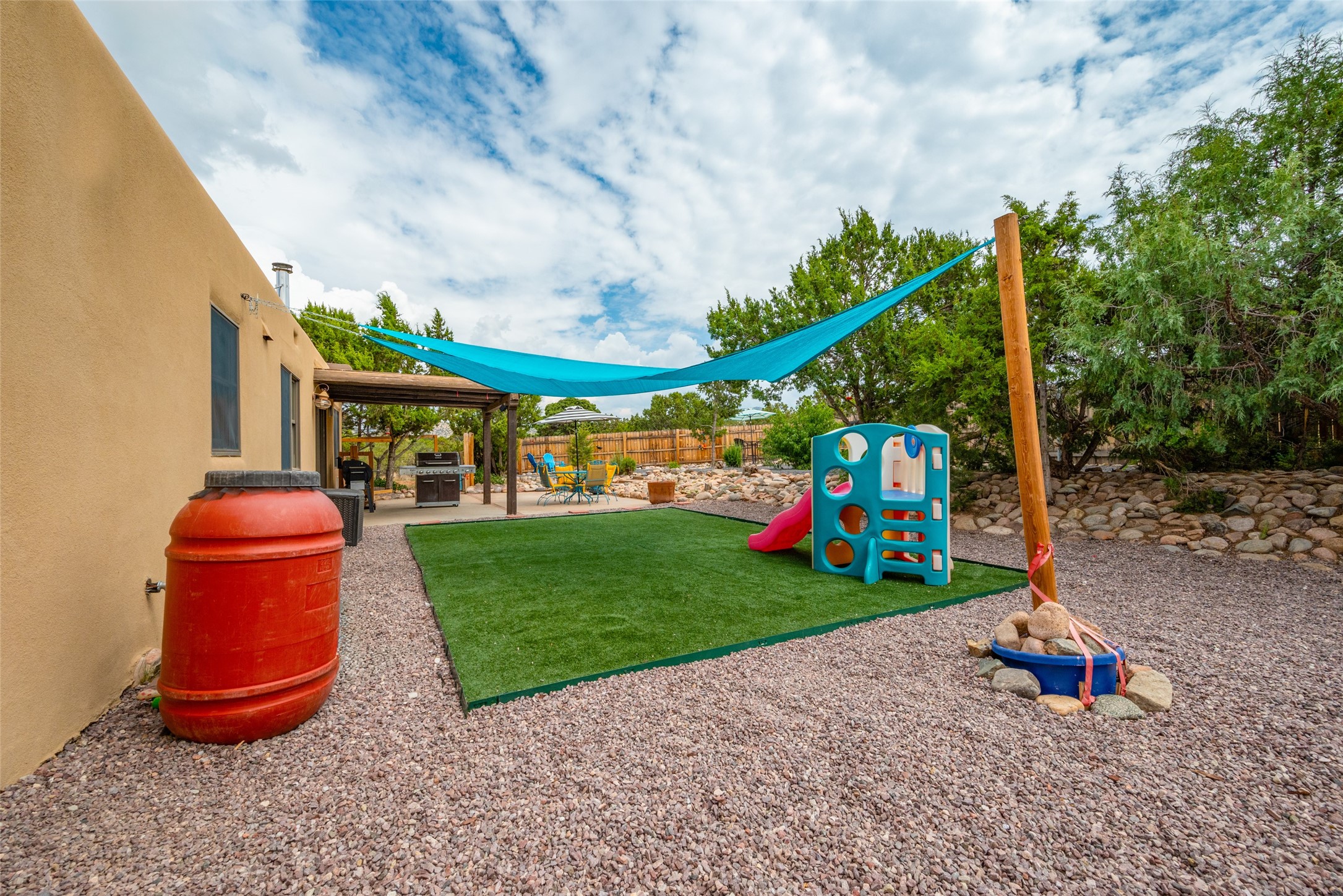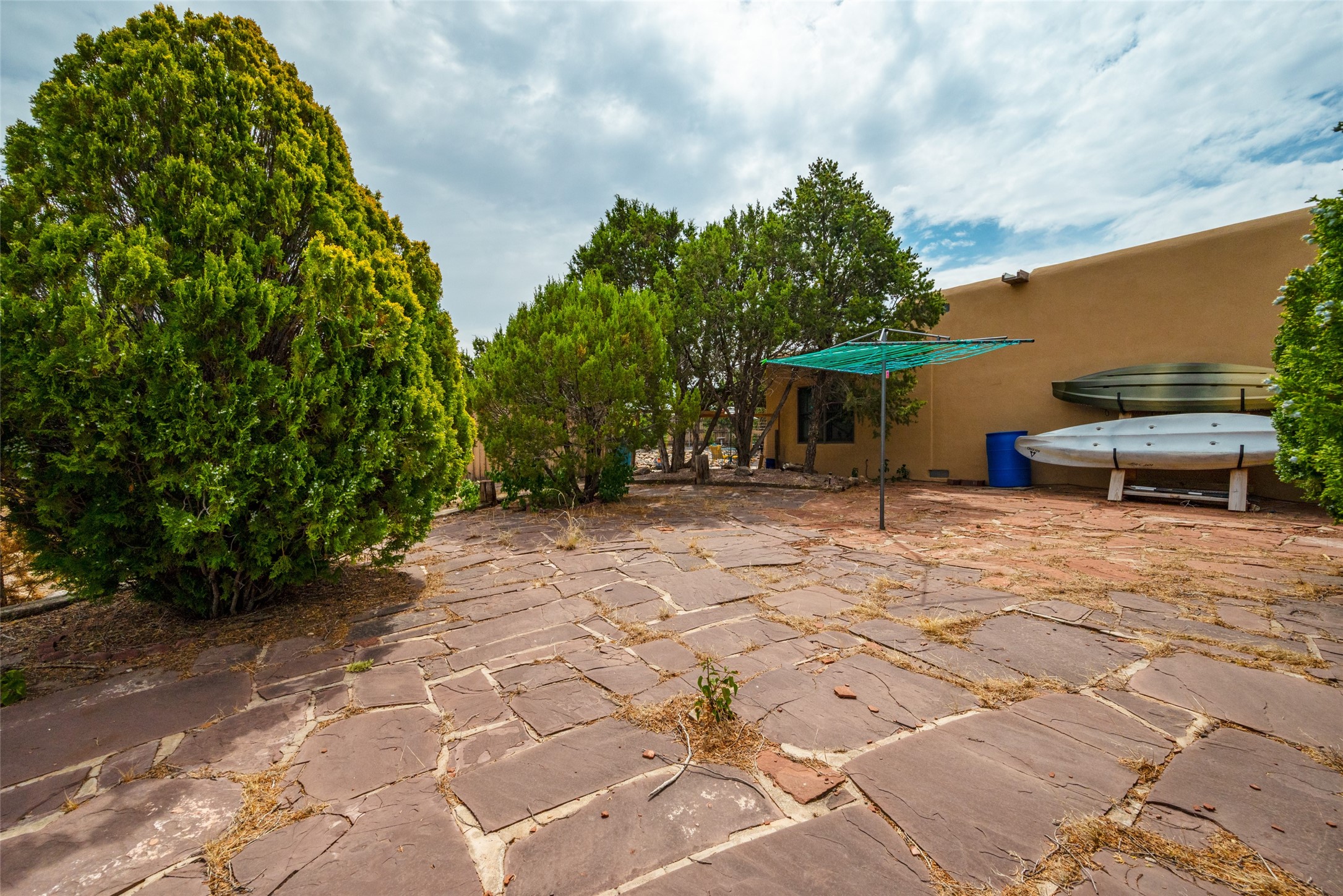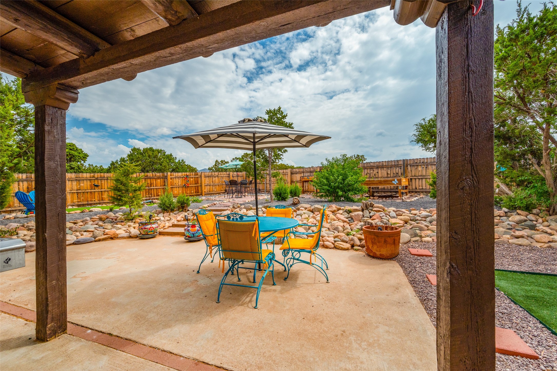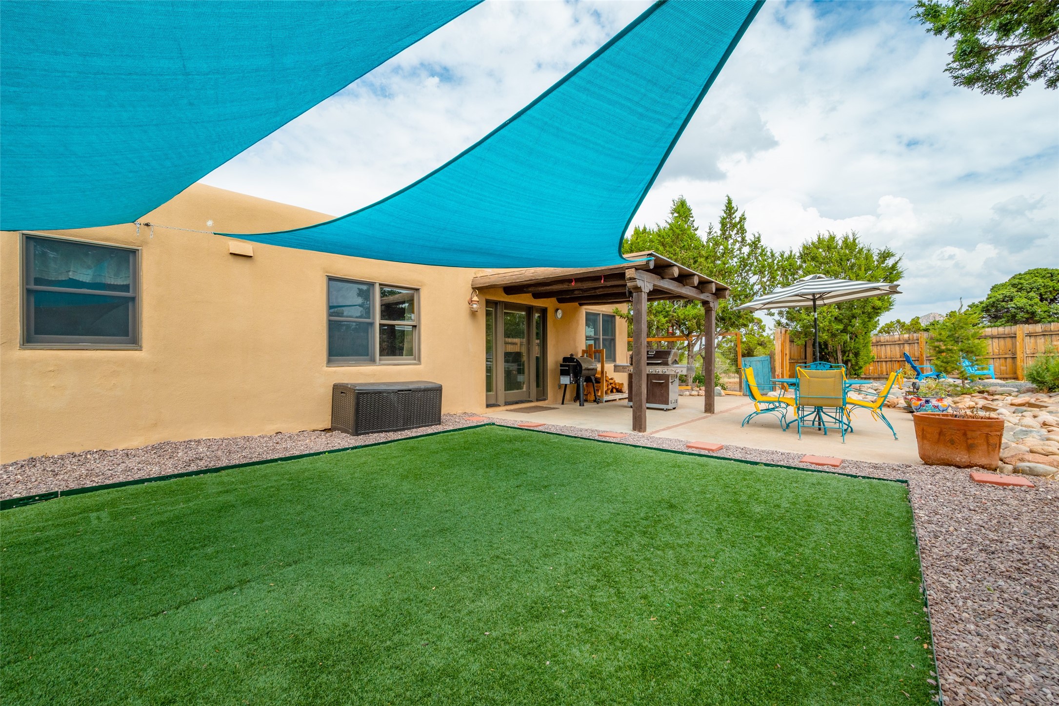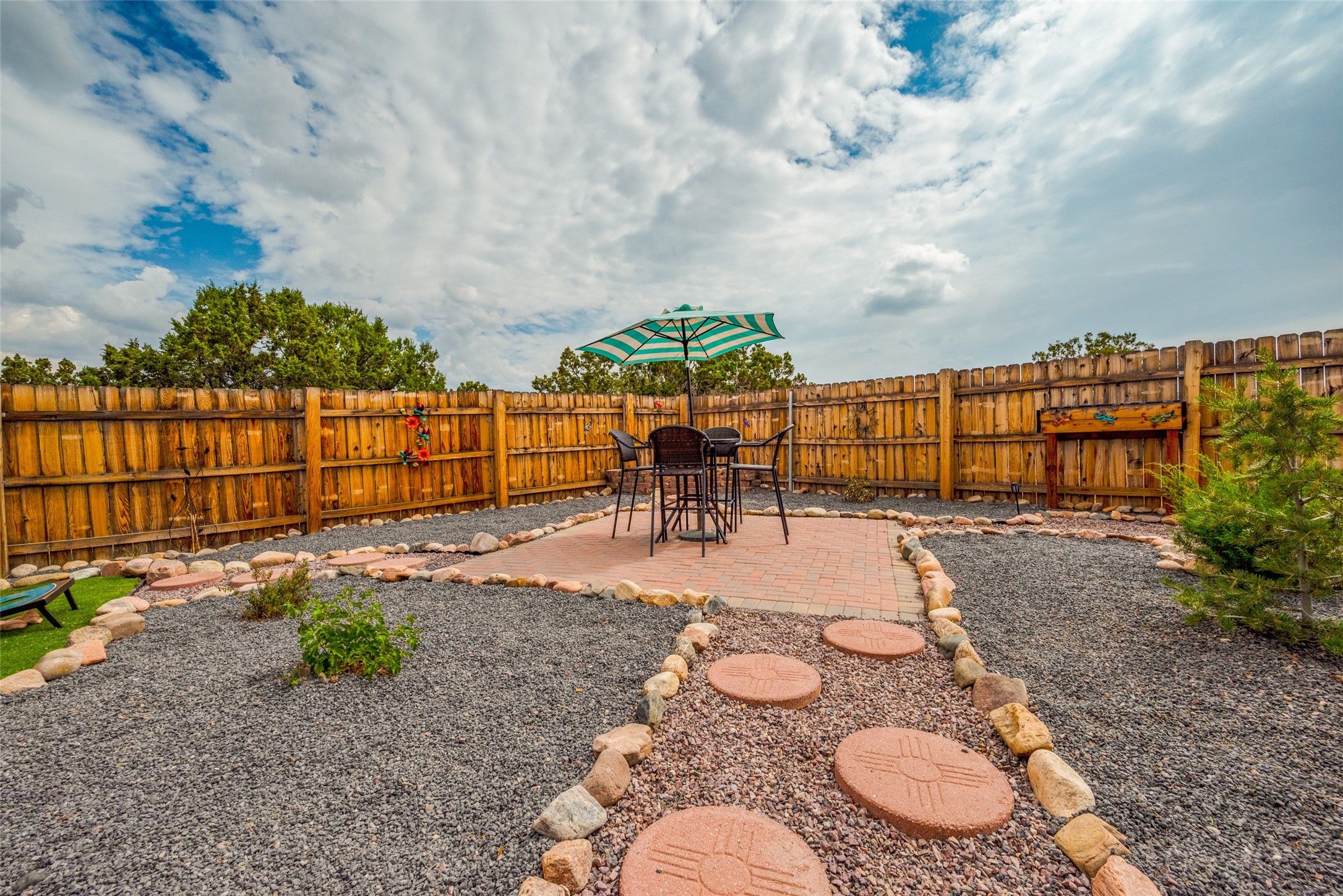 Great opportunity to own a 3-bedroom + Den/office, 2-bath, 2-car garage home on a 1-acre private treed lot in Eldorado on a quiet road. Recently remodeled with luxury vinyl flooring in living areas, new bathrooms, new wood stove, new kitchen appliances, newly installed fans, and freshly painted. Relax in the beautifully landscaped fenced-in backyard observe the sunset over the Jemez mountain range and then gaze up to the dazzling star-filled night sky. Situated in the best location near the first entrance with a quick commute to town, walking distance to Eldorado Community School, community center, pool, tennis courts, playground, and dog park. These features along with 5-mini-split cooling/heating units make this a turnkey home, ready to move into.