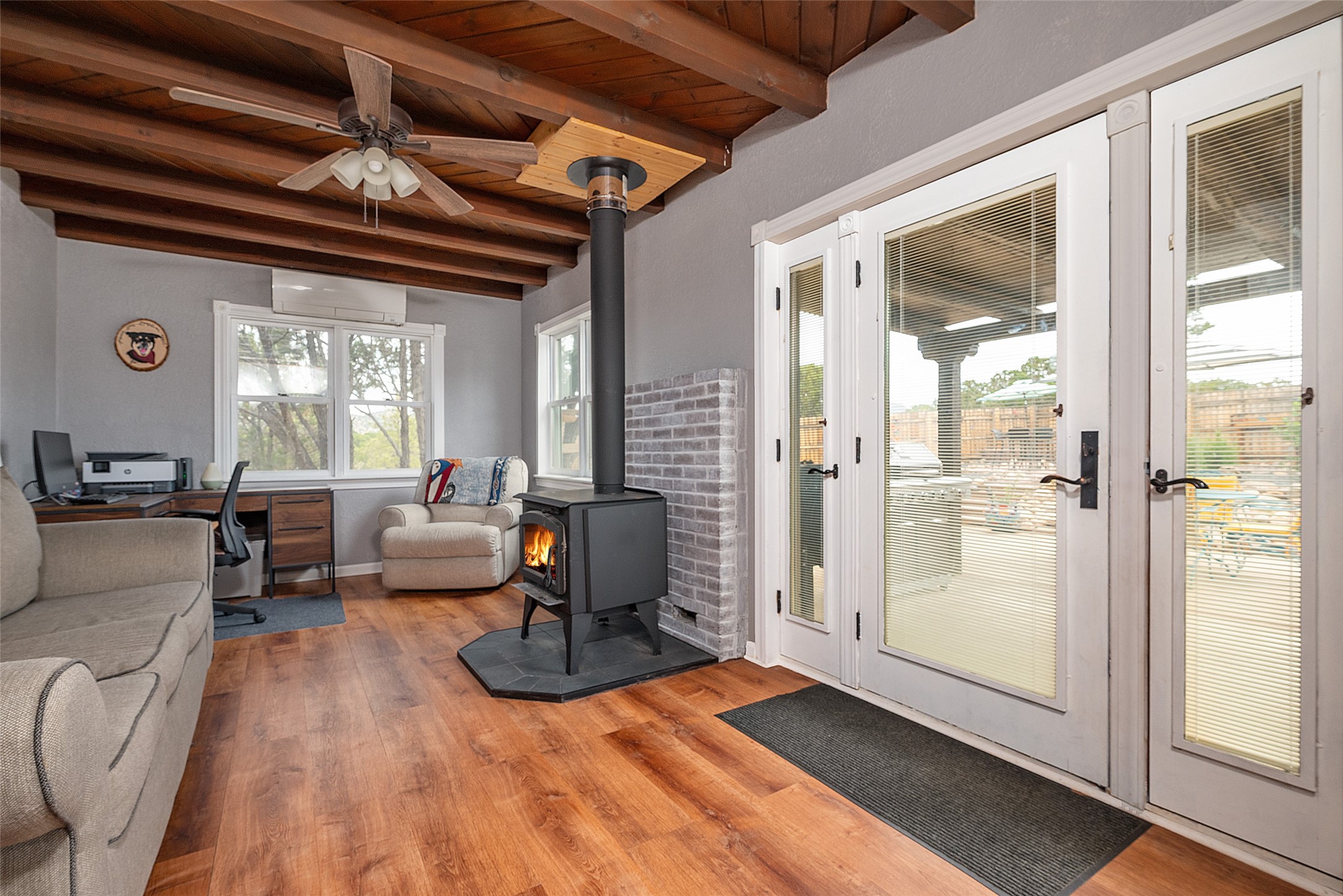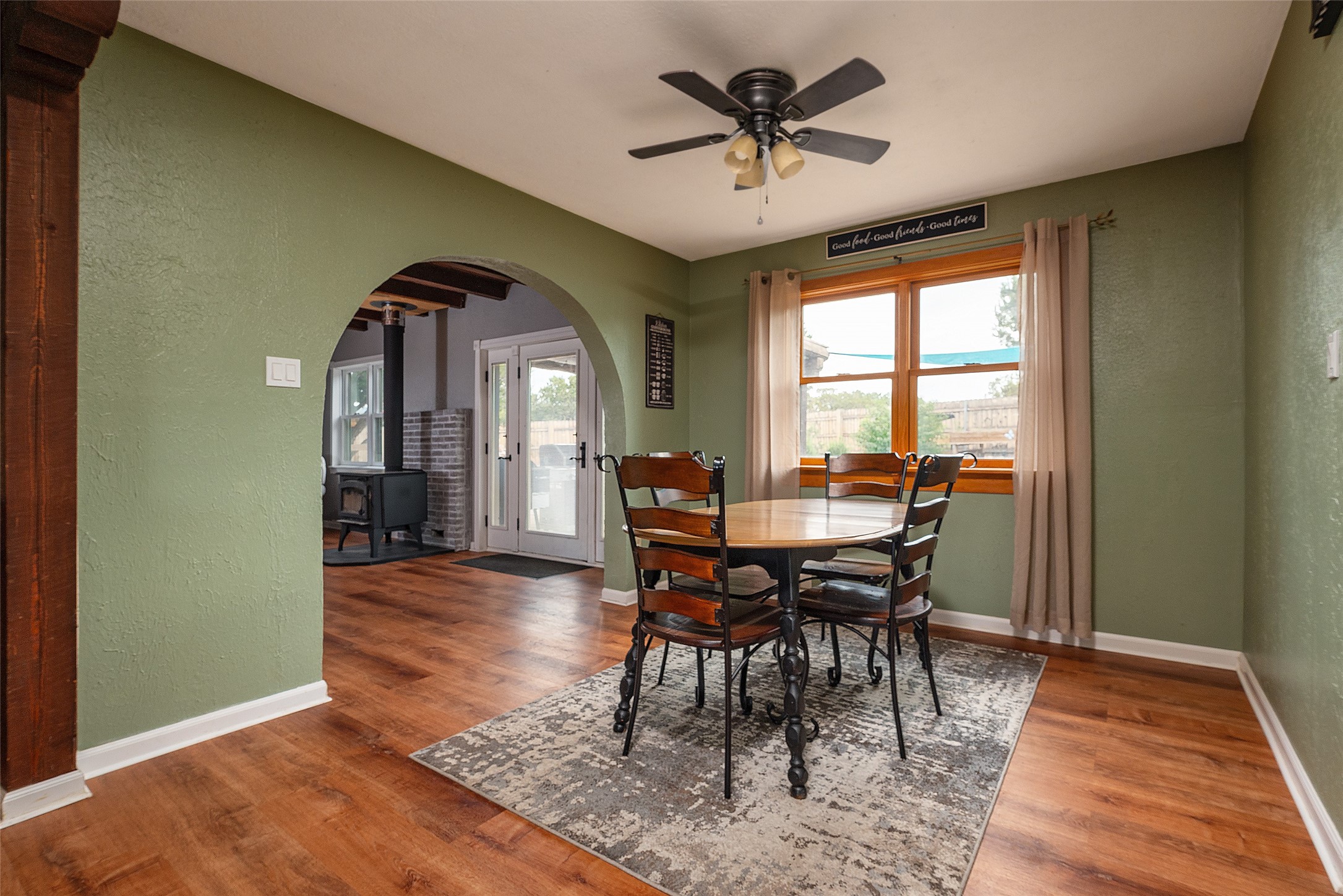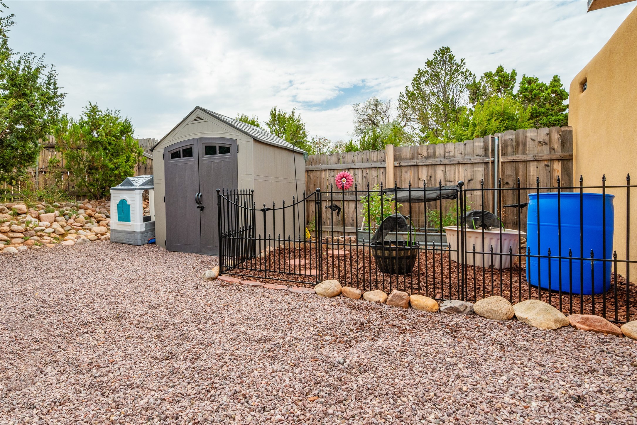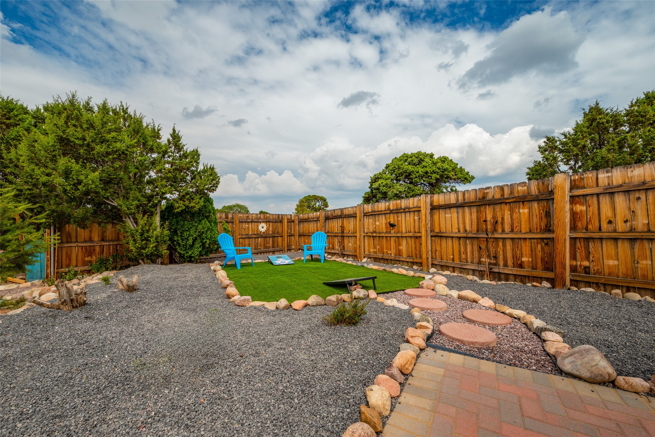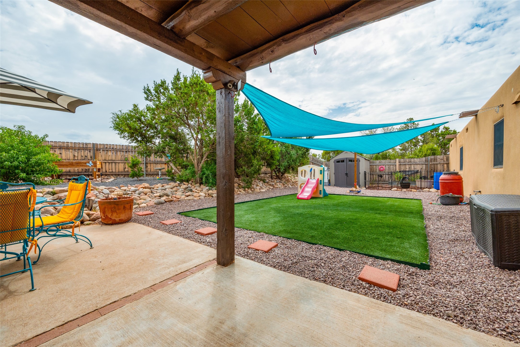 Great opportunity to own a 3-bedroom + Den/office, 2-bath, 2-car garage home on a 1-acre private treed lot in Eldorado on a quiet road. Recently remodeled with luxury vinyl flooring in living areas, new bathrooms, new wood stove, new kitchen appliances, newly installed fans, and freshly painted. Relax in the beautifully landscaped fenced-in backyard observe the sunset over the Jemez mountain range and then gaze up to the dazzling star-filled night sky. Situated in the best location near the first entrance with a quick commute to town, walking distance to Eldorado Community School, community center, pool, tennis courts, playground, and dog park. These features along with 5-mini-split cooling/heating units make this a turnkey home, ready to move into.