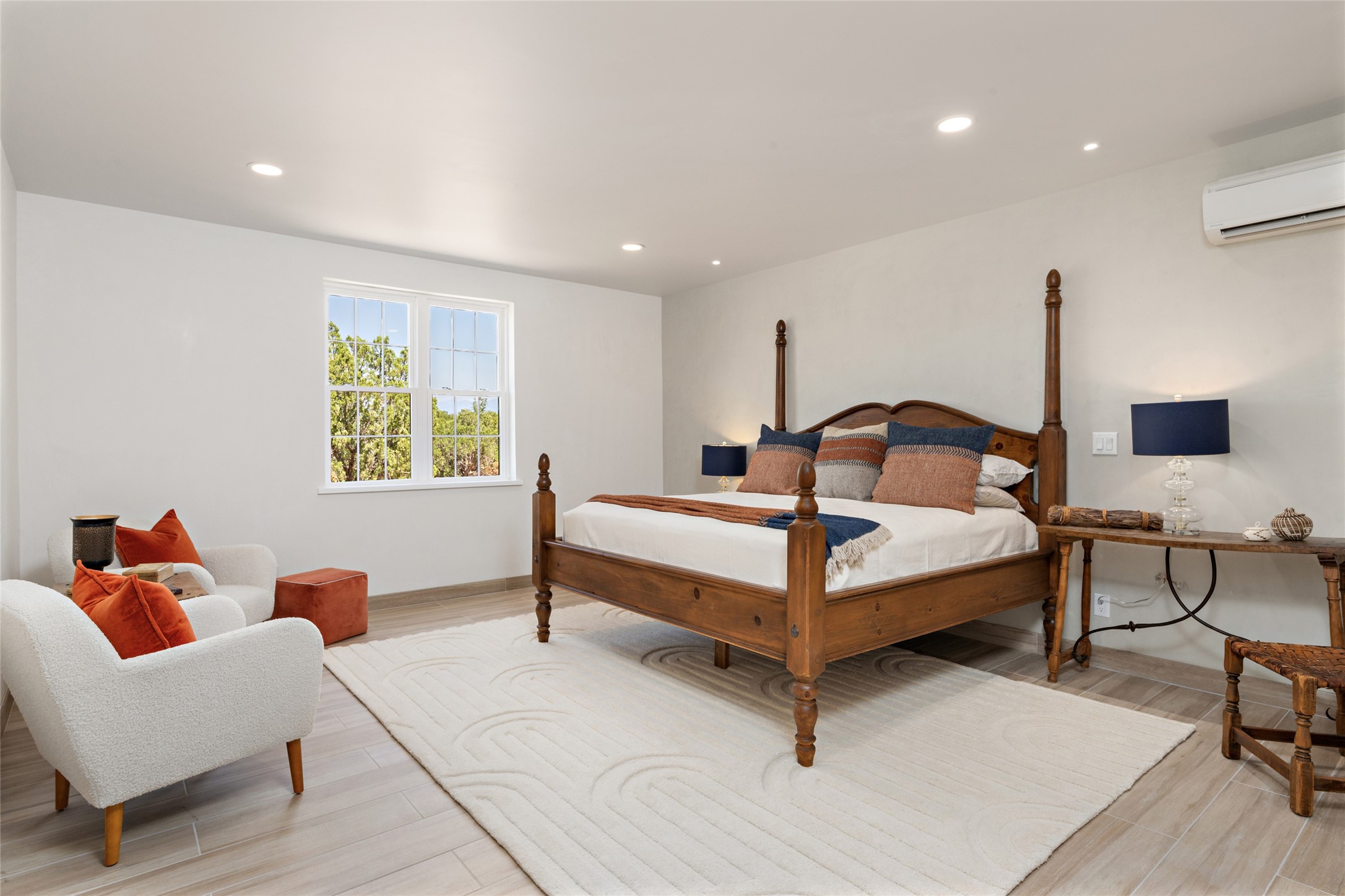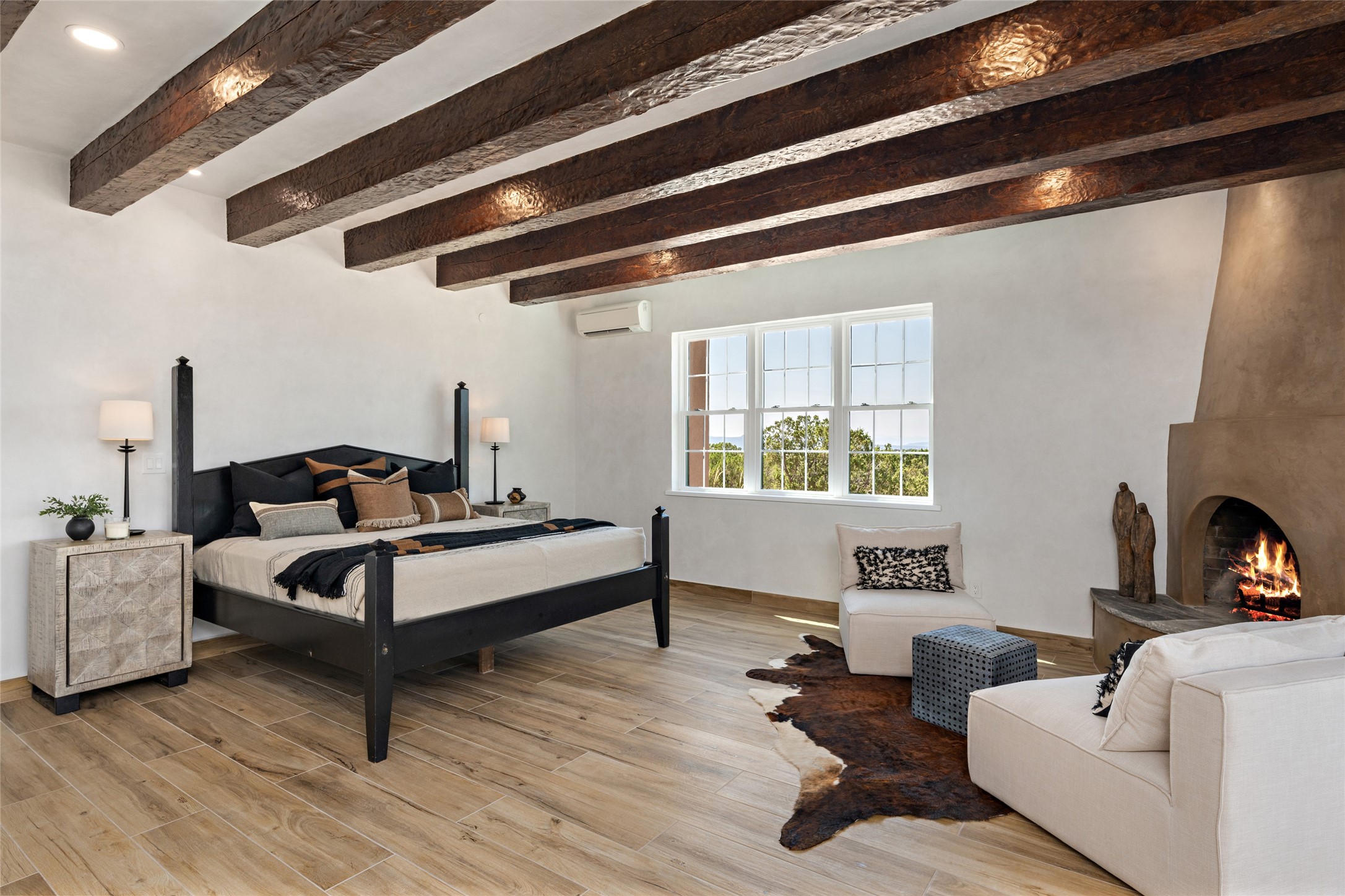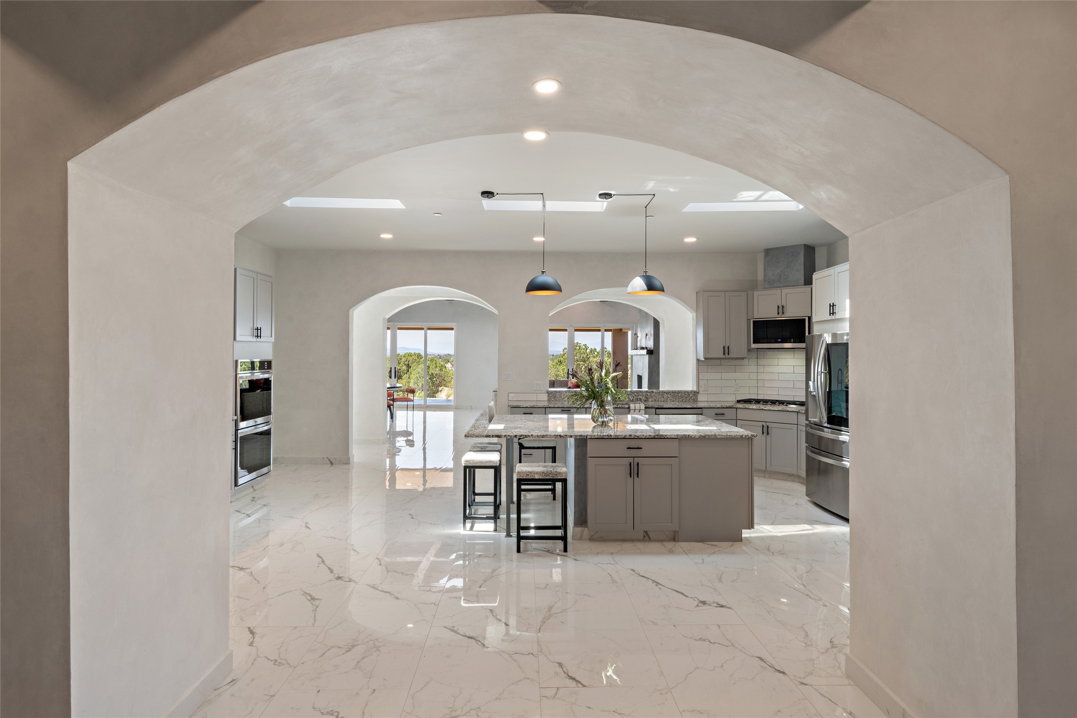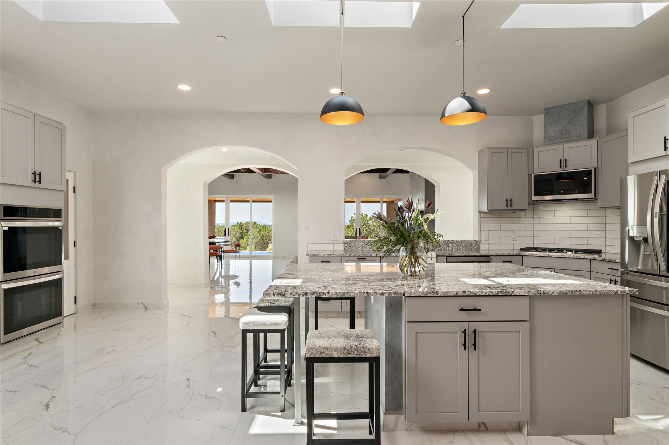 This newly constructed home on two rolling acres offers inspiring Jemez and Sangre de Cristo Mountains views, contemporary conveniences and beautiful finishes throughout. The smart, single-level floor plan was designed to satisfy the needs of various lifestyles with seamless transitions between the open interior and exterior living areas, three private bedroom suites, plus a dedicated office. Multiple chefs can enjoy cooking together in the showcase kitchen which includes a center island with seating and storage, three built-in buffets, a large butler's pantry, and a wine storage pantry. Meanwhile friends and family can relax in the adjacent living-dining room or family room each with its own view portal and fireplace. In the gracious primary bedroom suite, relax in front of the kiva fireplace or on the view portal, or luxuriate in the incredible spa bathroom with a steam shower, soaking tub and dual walk-in closets. Design elements include arched doorways, hand-troweled diamond plaster walls, lighted nichos, built-in shelving, and hand-carved beams. An oversized 2-car garage, new mechanical systems and a 6,000 gallon water harvesting cistern serving two irrigation zones complete the low-maintenance, quality-of-life package.