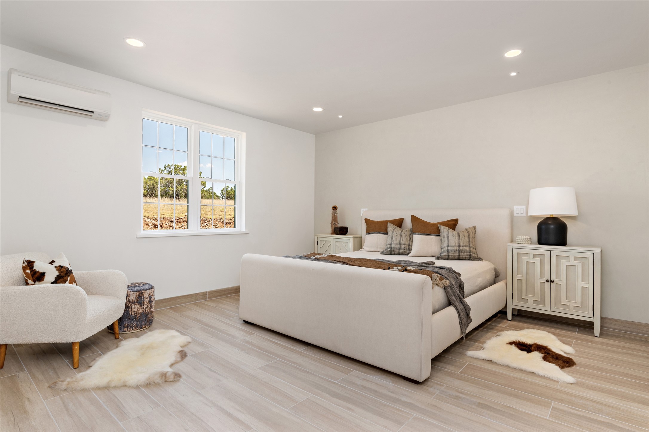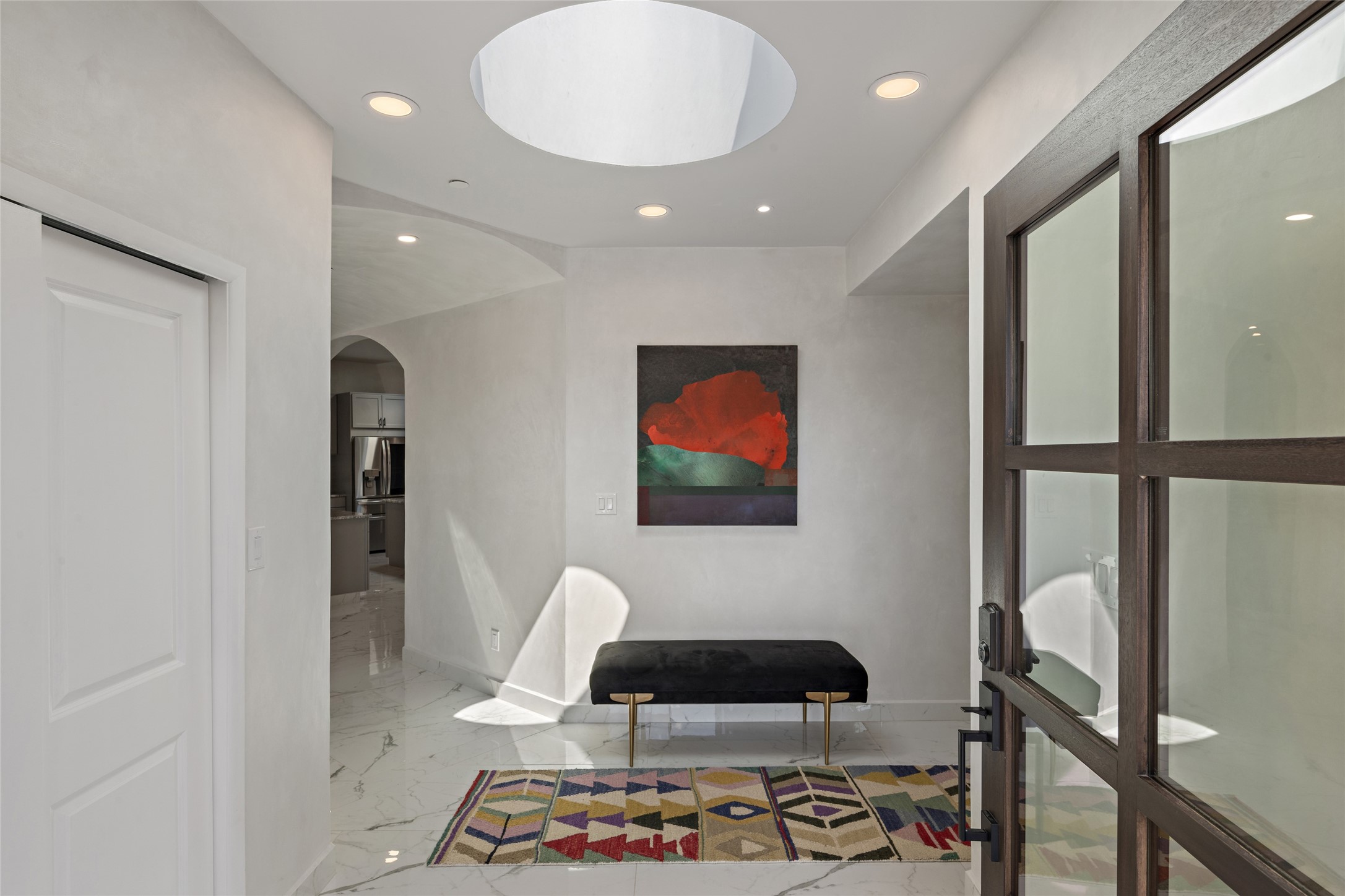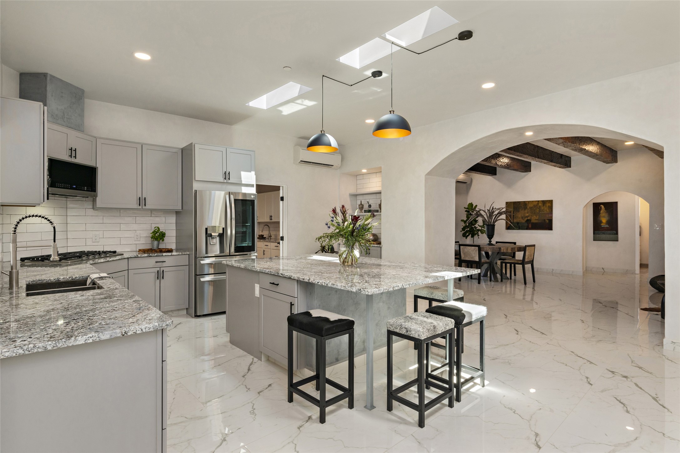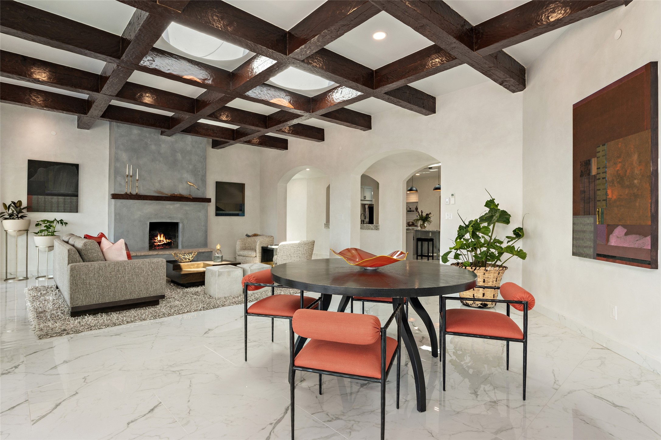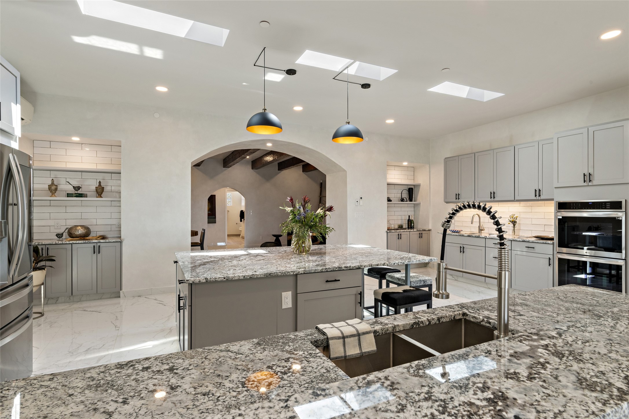 This newly constructed home on two rolling acres offers inspiring Jemez and Sangre de Cristo Mountains views, contemporary conveniences and beautiful finishes throughout. The smart, single-level floor plan was designed to satisfy the needs of various lifestyles with seamless transitions between the open interior and exterior living areas, three private bedroom suites, plus a dedicated office. Multiple chefs can enjoy cooking together in the showcase kitchen which includes a center island with seating and storage, three built-in buffets, a large butler's pantry, and a wine storage pantry. Meanwhile friends and family can relax in the adjacent living-dining room or family room each with its own view portal and fireplace. In the gracious primary bedroom suite, relax in front of the kiva fireplace or on the view portal, or luxuriate in the incredible spa bathroom with a steam shower, soaking tub and dual walk-in closets. Design elements include arched doorways, hand-troweled diamond plaster walls, lighted nichos, built-in shelving, and hand-carved beams. An oversized 2-car garage, new mechanical systems and a 6,000 gallon water harvesting cistern serving two irrigation zones complete the low-maintenance, quality-of-life package.