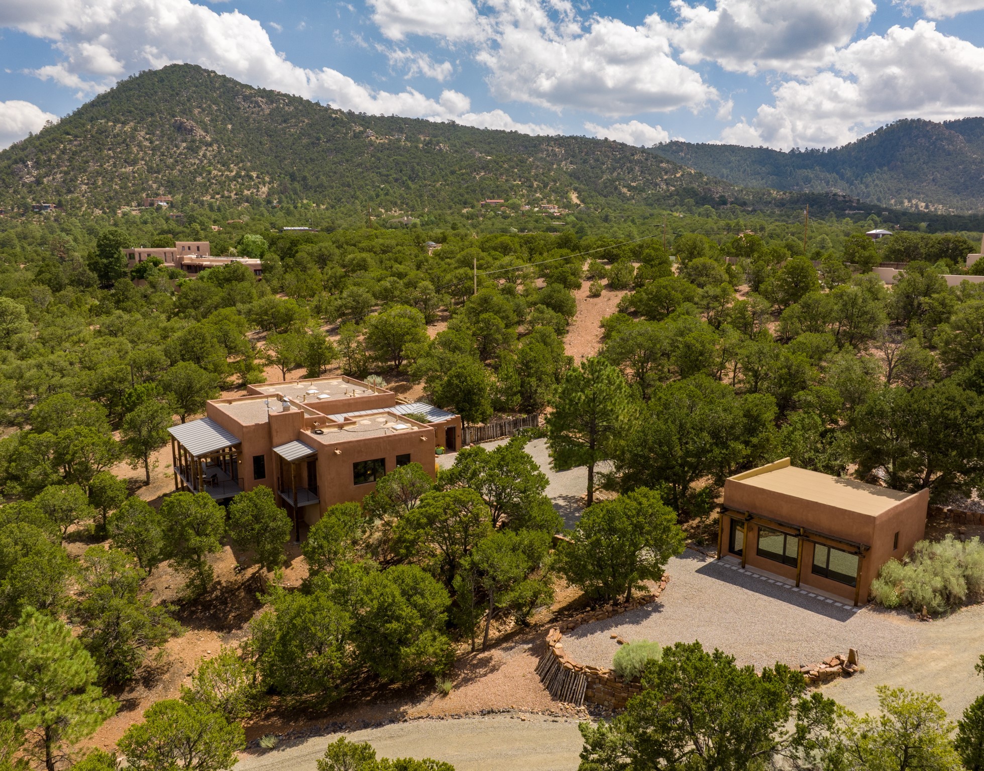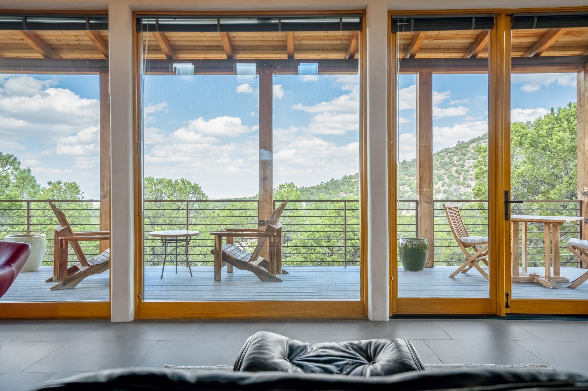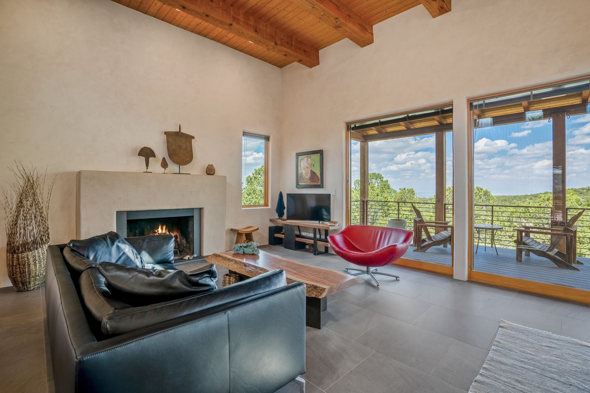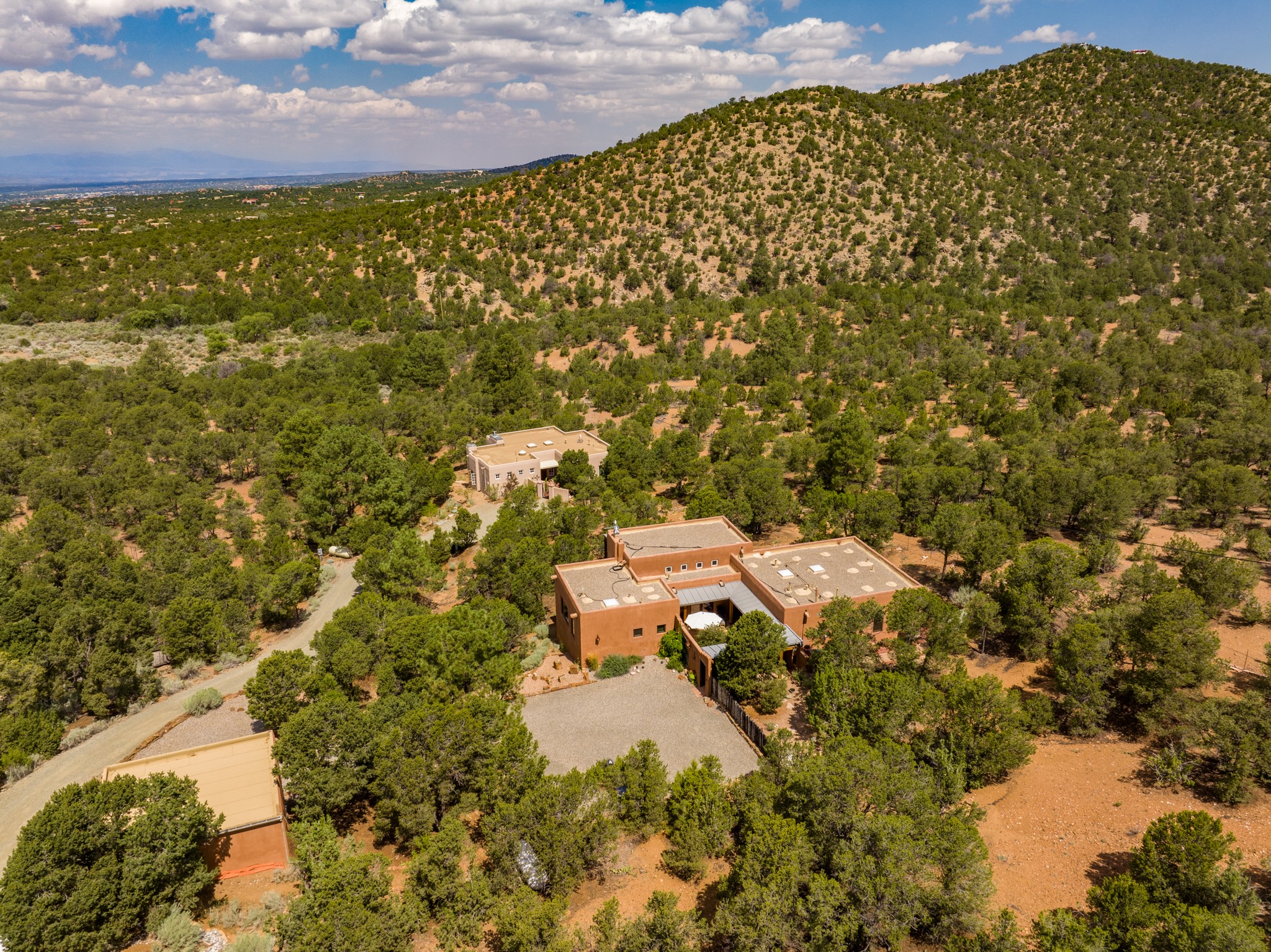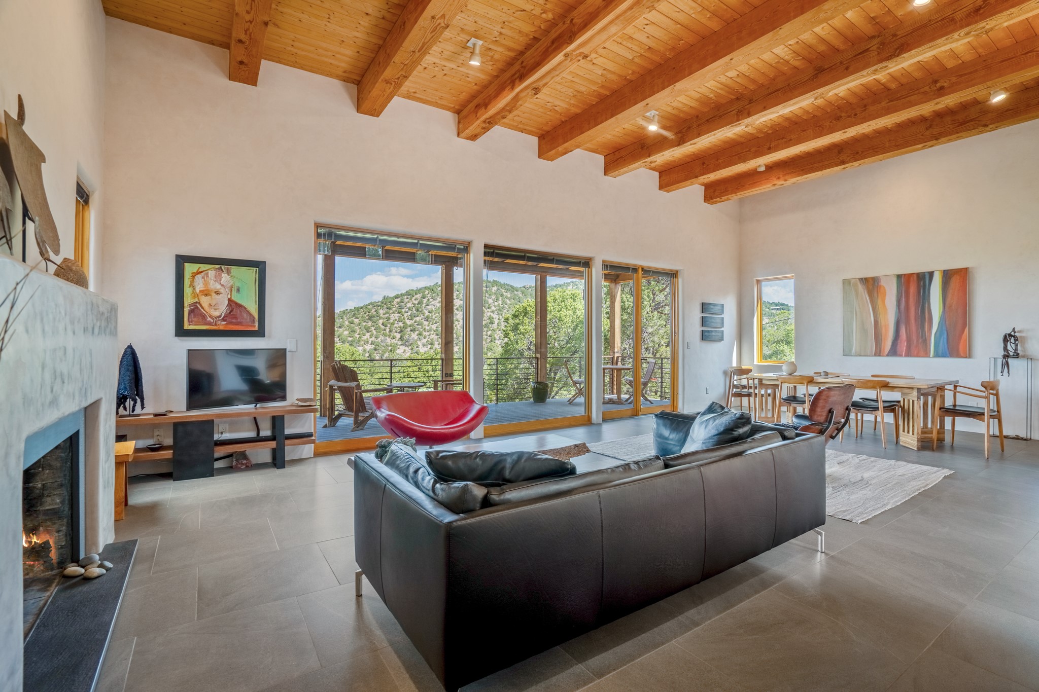 Rare, contemporary discovery with convenient access from Old Santa Fe Trail. Enjoy breathtaking, sweeping views of the Jemez Mountains, city lights, and surrounding mountains, all while nestled in the foothills. Enter a beautifully secluded courtyard enclosed by a 9-foot wall, featuring landscaped hills, a built-in rock bench, and a lovely stone fountain. The generously open floor plan spans a single level without any steps. Floor-to-ceiling windows grace nearly every room. An expansive viewing deck enhances outdoor entertaining. The completely remodeled interior showcases distinctive features like large beams, tongue and groove details, high ceilings, Italian porcelain tile floors, radiant in-floor heating and a separation of space between the primary suite and guest bedrooms. A fabulous cook's designed kitchen completes this spectacular beauty. Adding a bit more to these ingredients is a detached 546 square foot studio with expansive views.