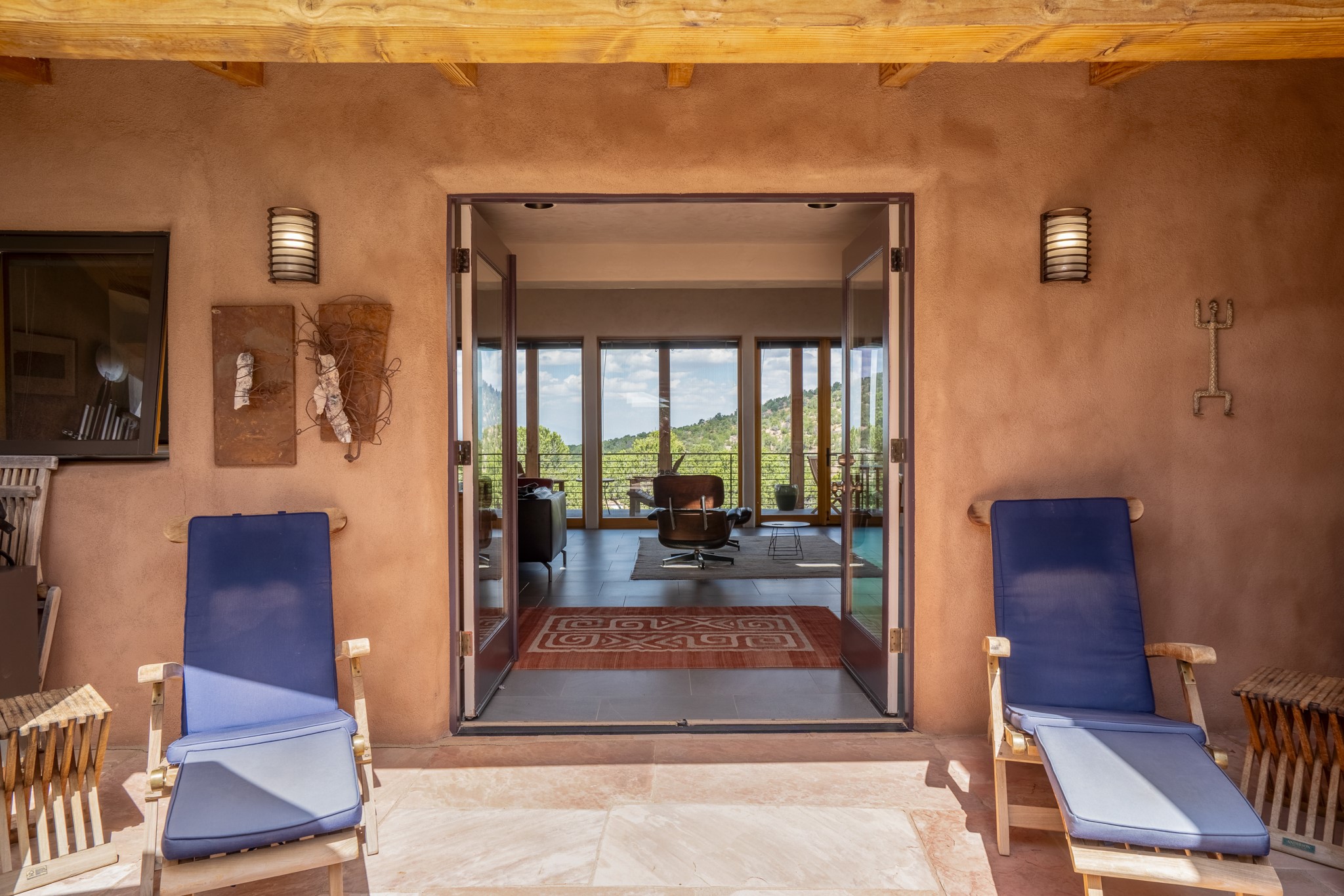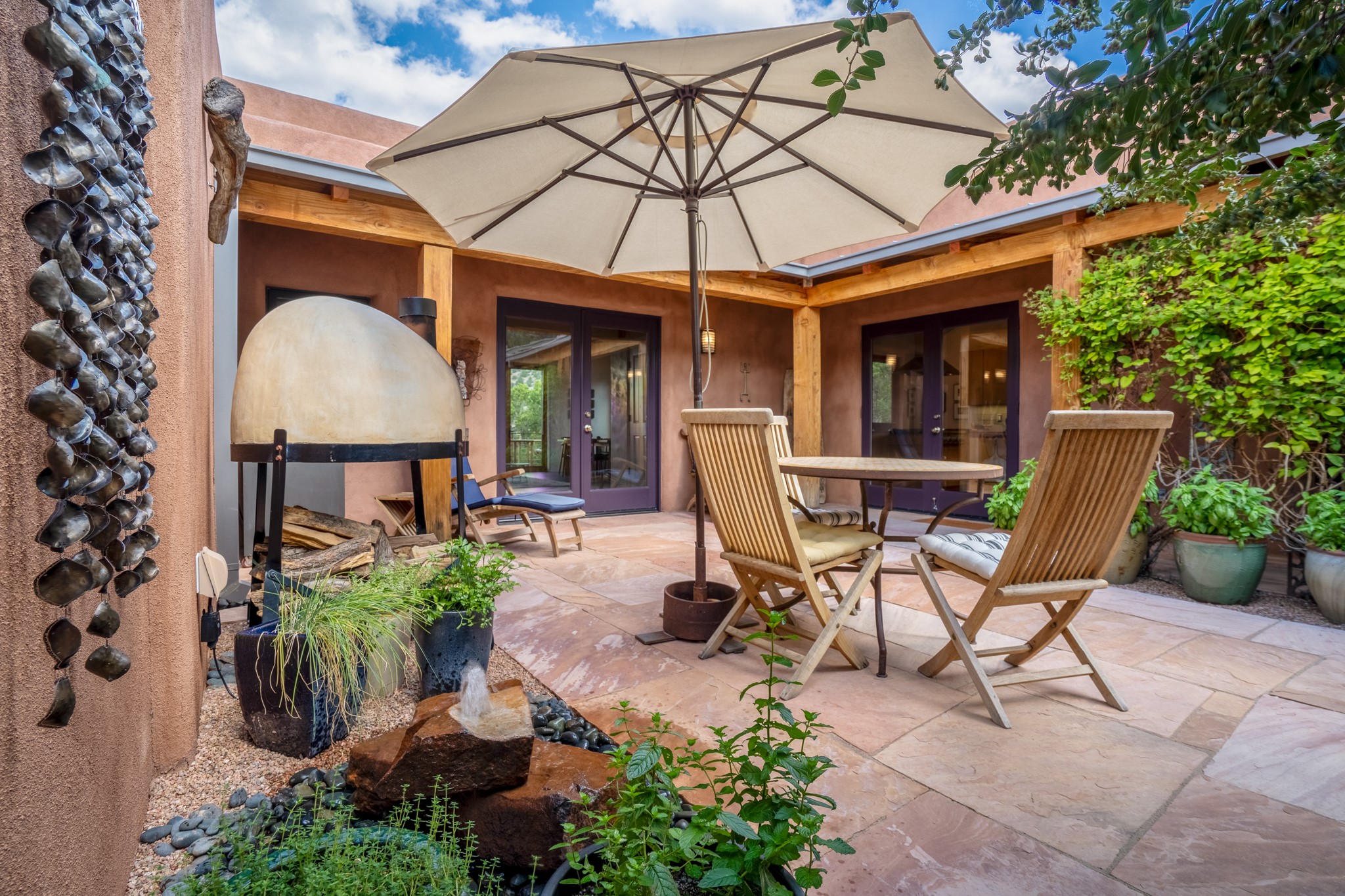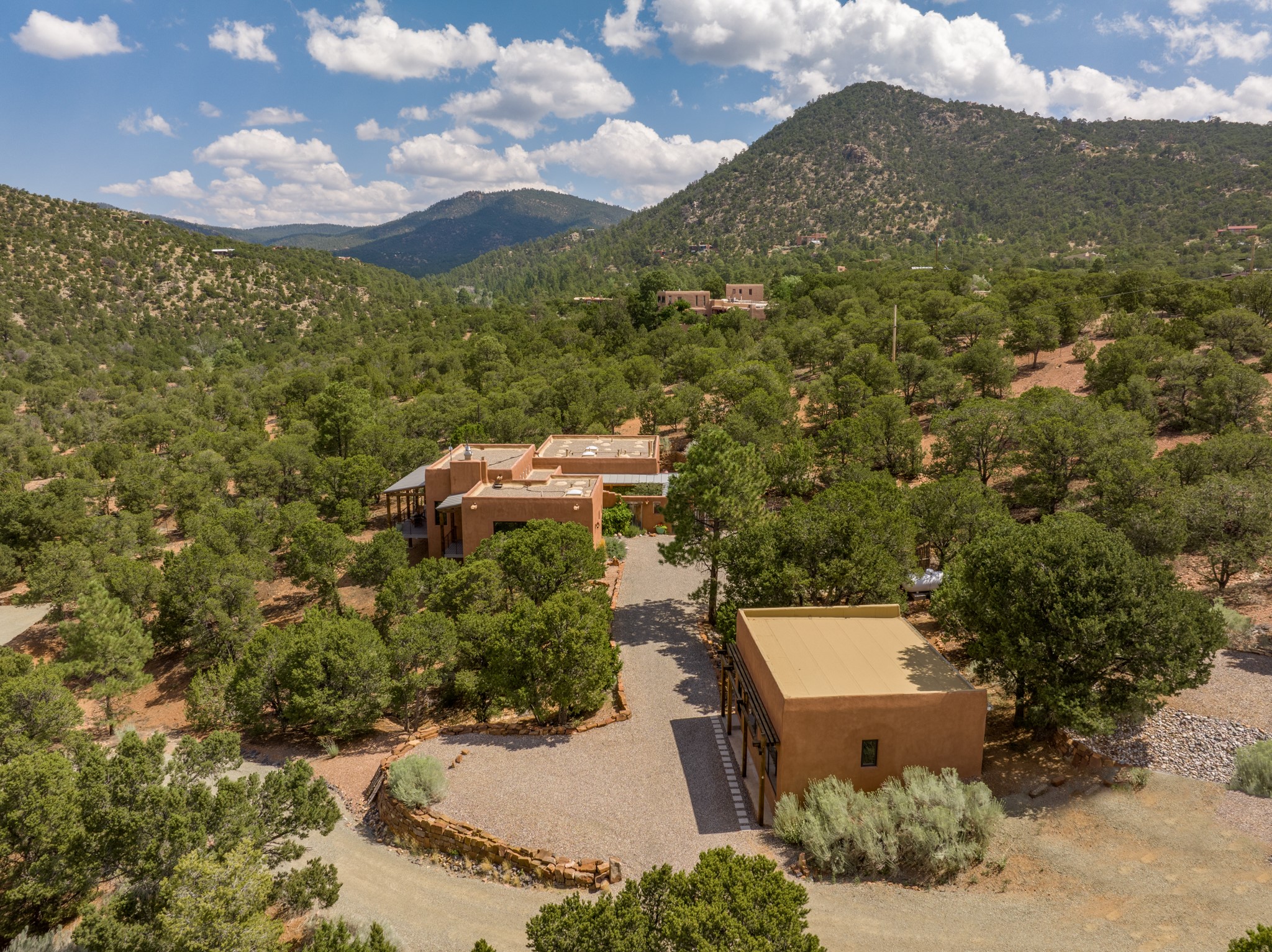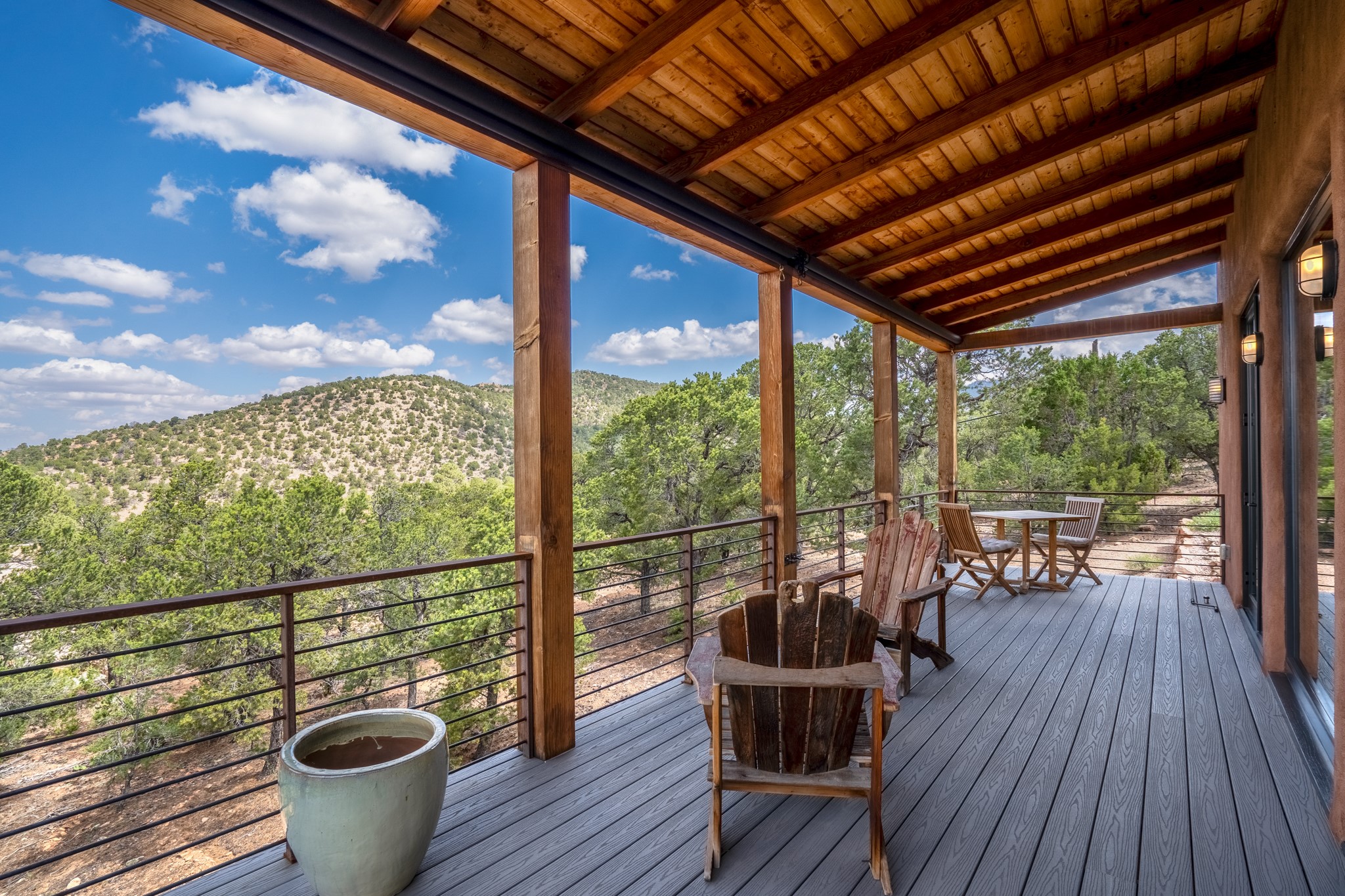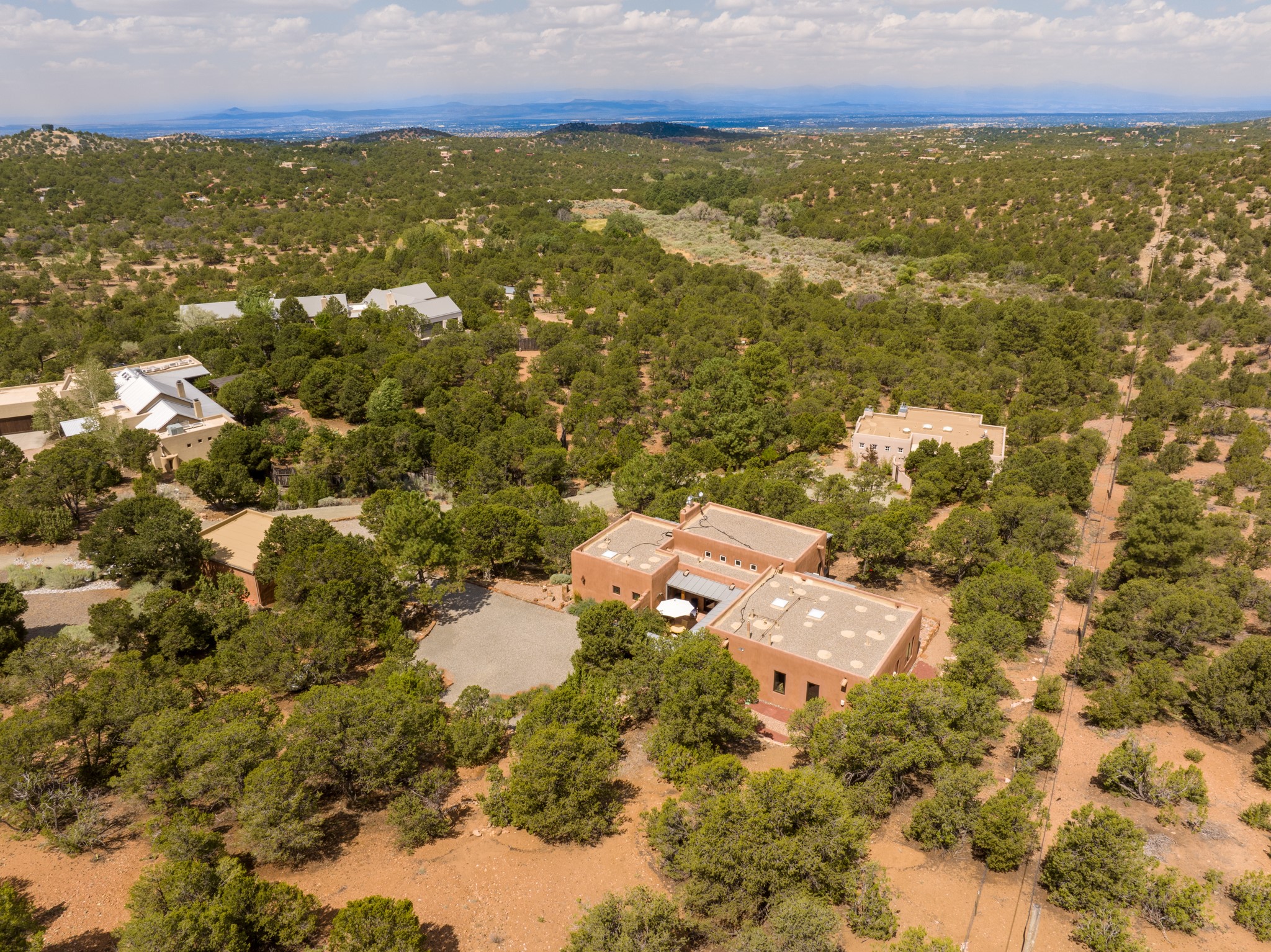 Rare, contemporary discovery with convenient access from Old Santa Fe Trail. Enjoy breathtaking, sweeping views of the Jemez Mountains, city lights, and surrounding mountains, all while nestled in the foothills. Enter a beautifully secluded courtyard enclosed by a 9-foot wall, featuring landscaped hills, a built-in rock bench, and a lovely stone fountain. The generously open floor plan spans a single level without any steps. Floor-to-ceiling windows grace nearly every room. An expansive viewing deck enhances outdoor entertaining. The completely remodeled interior showcases distinctive features like large beams, tongue and groove details, high ceilings, Italian porcelain tile floors, radiant in-floor heating and a separation of space between the primary suite and guest bedrooms. A fabulous cook's designed kitchen completes this spectacular beauty. Adding a bit more to these ingredients is a detached 546 square foot studio with expansive views.
