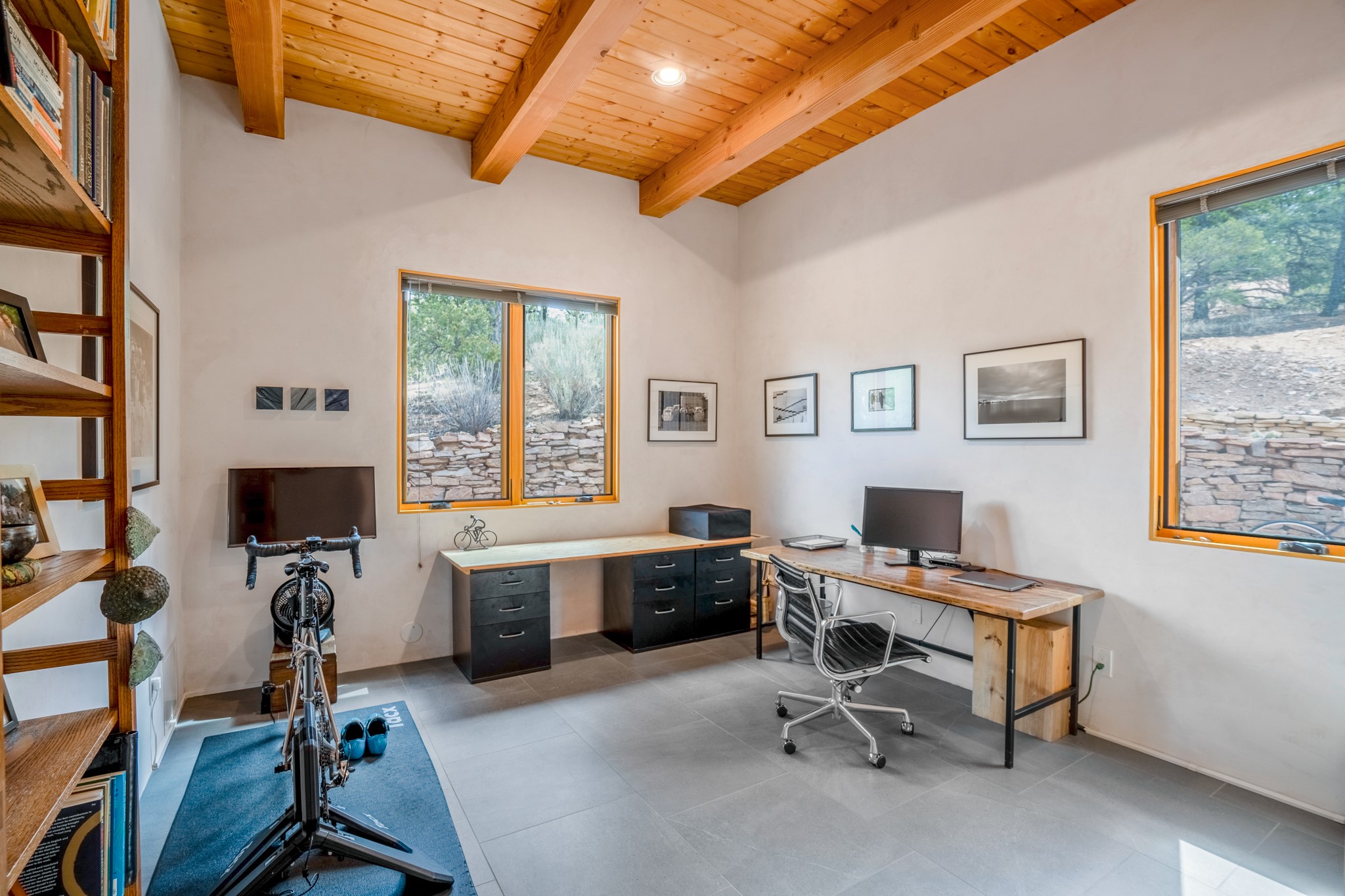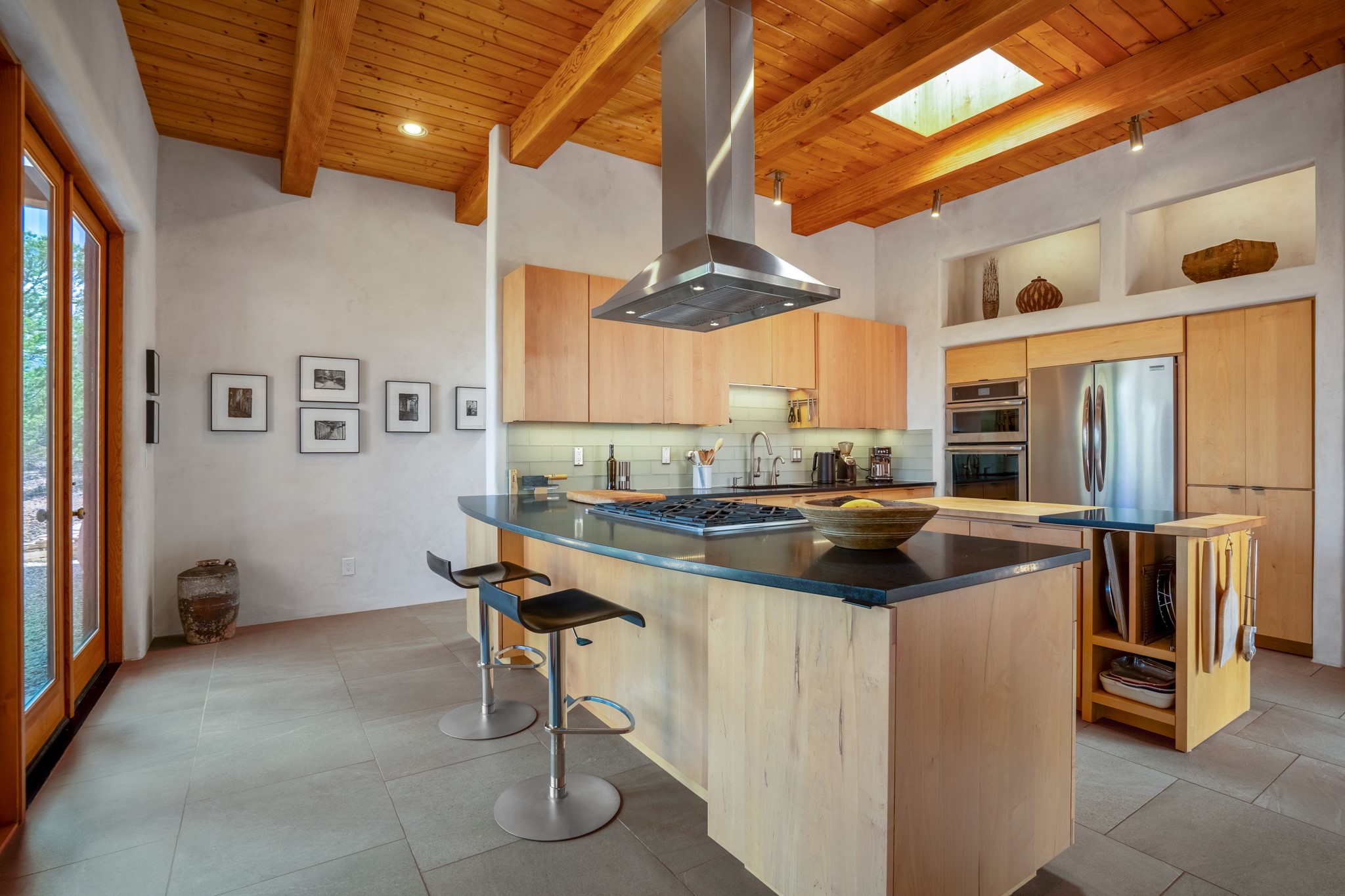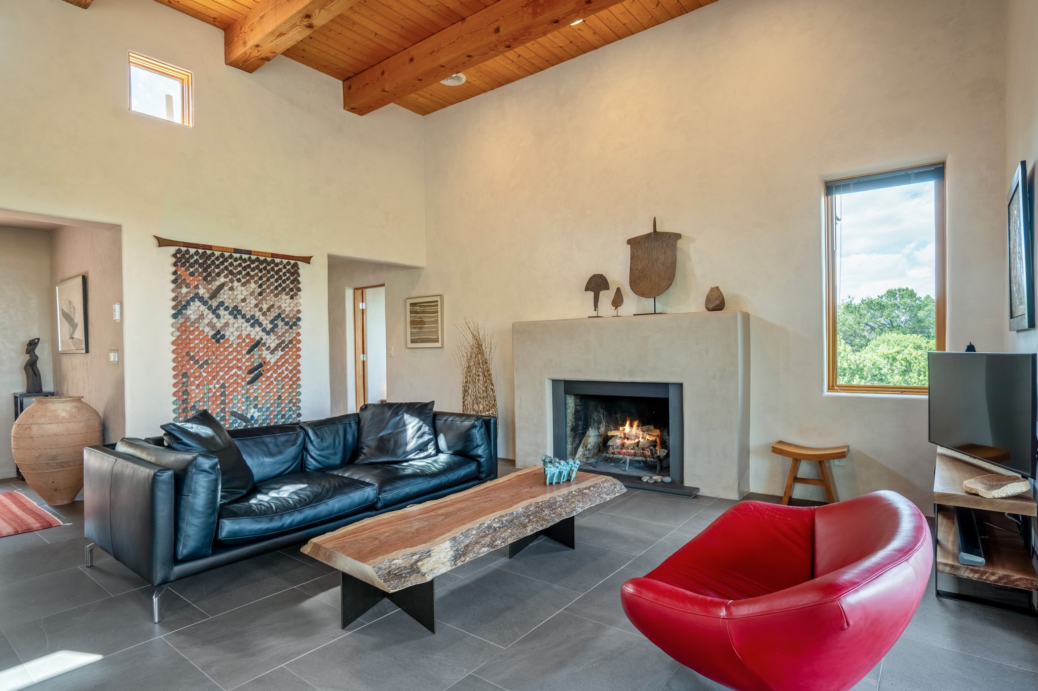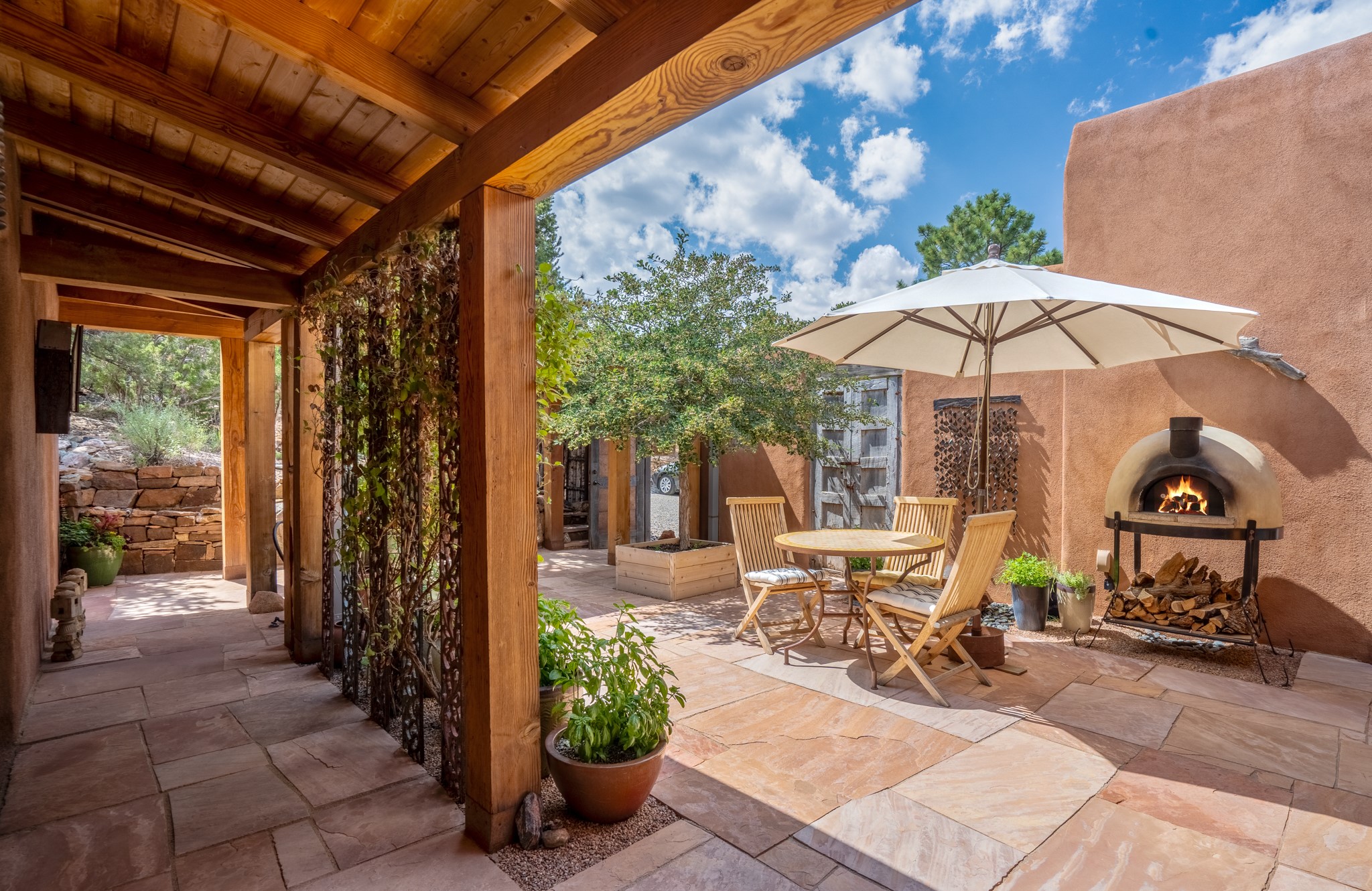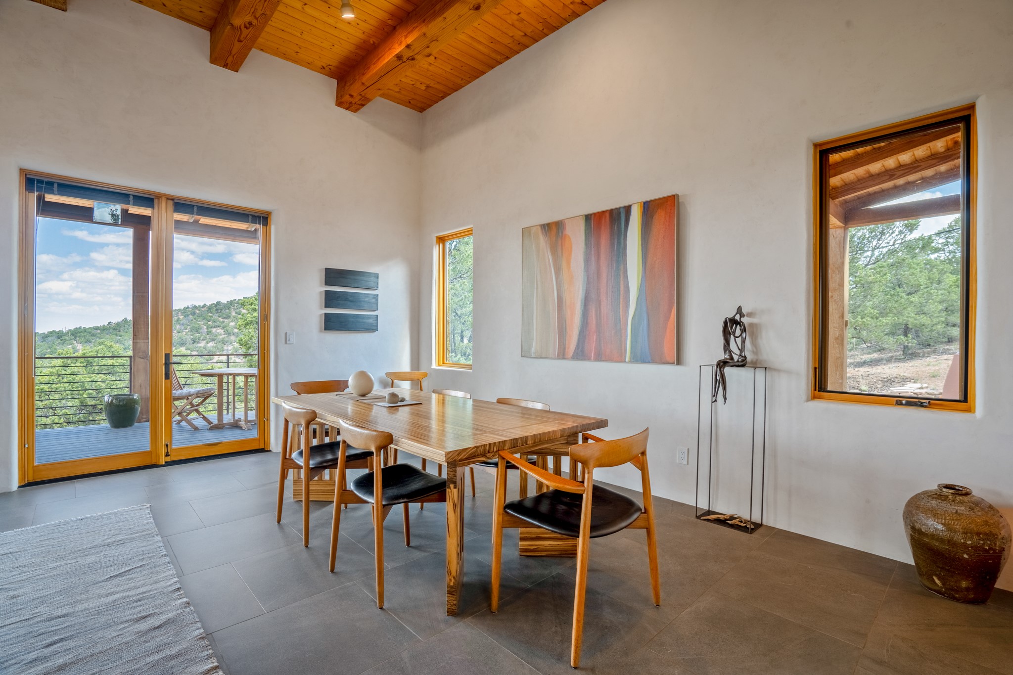 Rare, contemporary discovery with convenient access from Old Santa Fe Trail. Enjoy breathtaking, sweeping views of the Jemez Mountains, city lights, and surrounding mountains, all while nestled in the foothills. Enter a beautifully secluded courtyard enclosed by a 9-foot wall, featuring landscaped hills, a built-in rock bench, and a lovely stone fountain. The generously open floor plan spans a single level without any steps. Floor-to-ceiling windows grace nearly every room. An expansive viewing deck enhances outdoor entertaining. The completely remodeled interior showcases distinctive features like large beams, tongue and groove details, high ceilings, Italian porcelain tile floors, radiant in-floor heating and a separation of space between the primary suite and guest bedrooms. A fabulous cook's designed kitchen completes this spectacular beauty. Adding a bit more to these ingredients is a detached 546 square foot studio with expansive views.