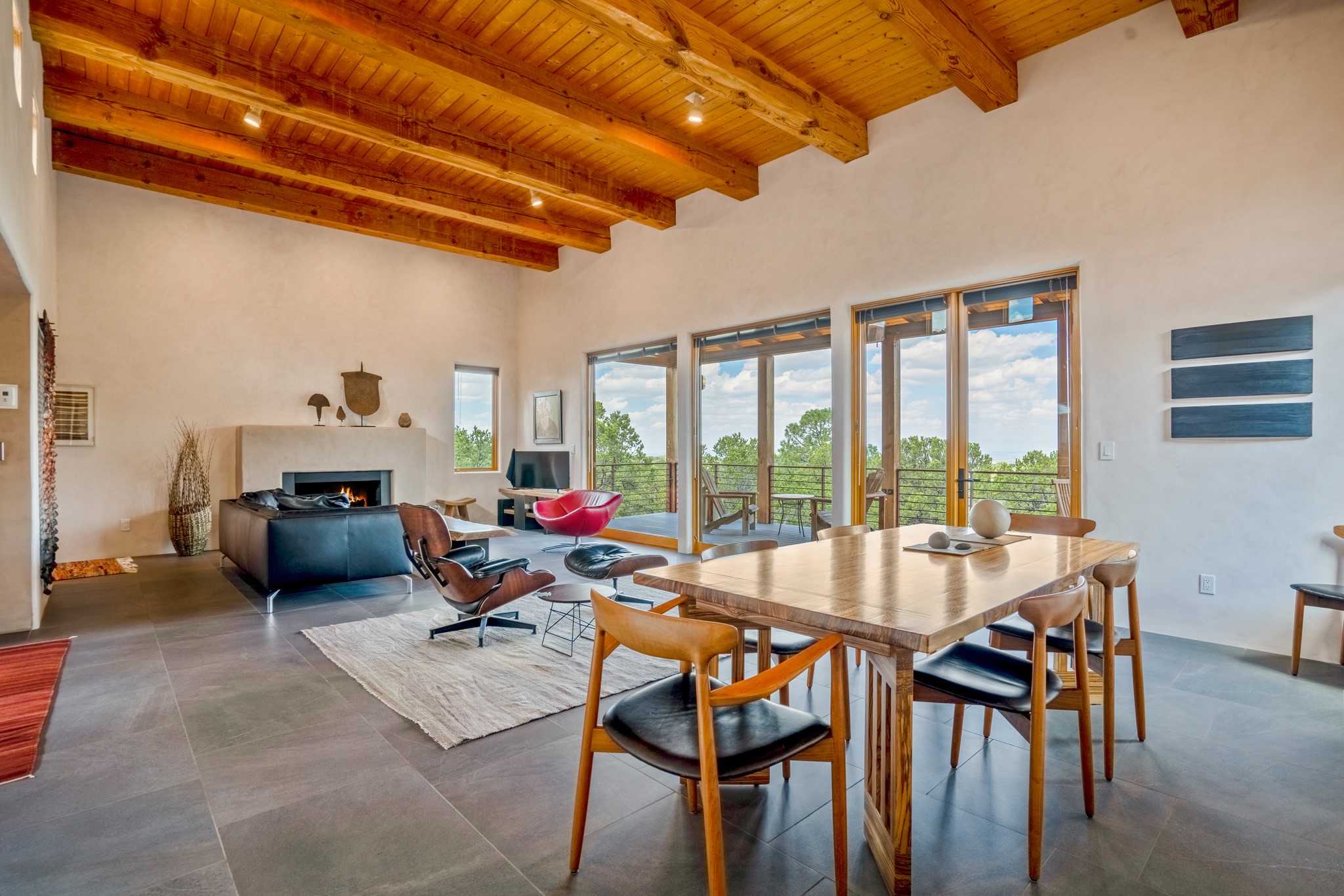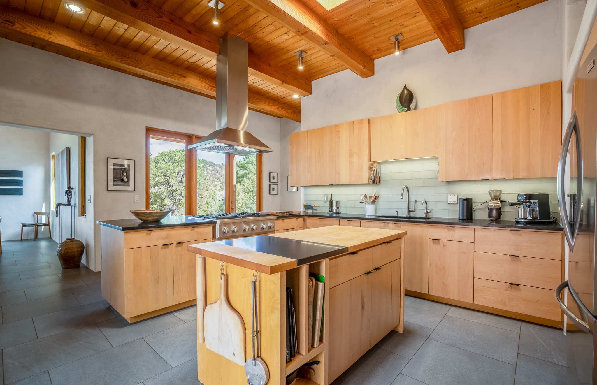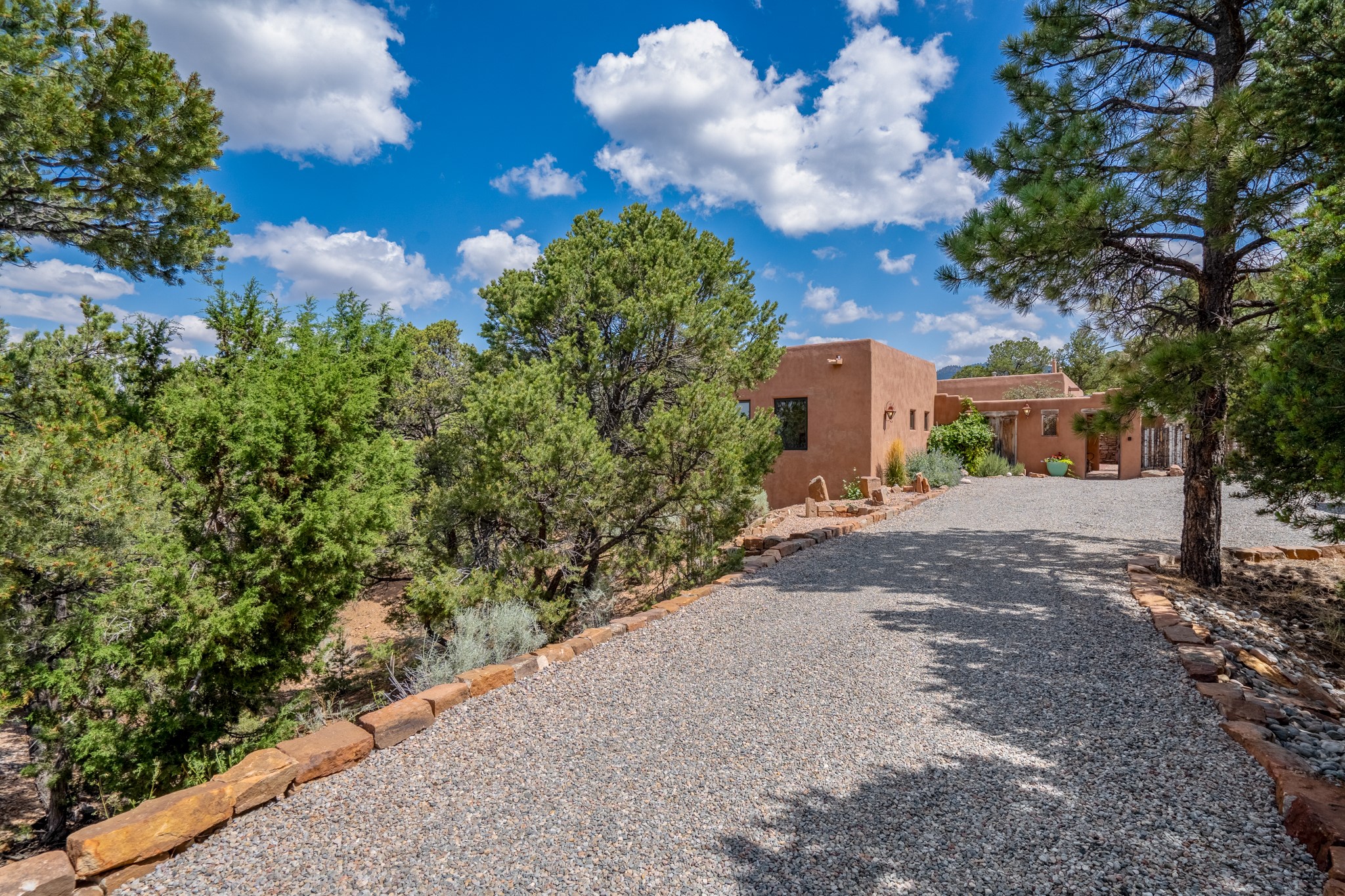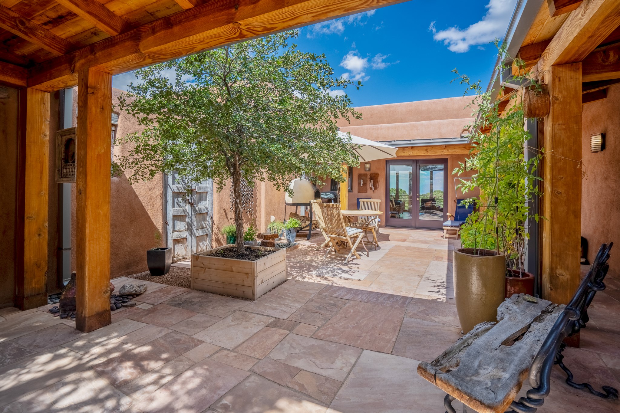 Rare, contemporary discovery with convenient access from Old Santa Fe Trail. Enjoy breathtaking, sweeping views of the Jemez Mountains, city lights, and surrounding mountains, all while nestled in the foothills. Enter a beautifully secluded courtyard enclosed by a 9-foot wall, featuring landscaped hills, a built-in rock bench, and a lovely stone fountain. The generously open floor plan spans a single level without any steps. Floor-to-ceiling windows grace nearly every room. An expansive viewing deck enhances outdoor entertaining. The completely remodeled interior showcases distinctive features like large beams, tongue and groove details, high ceilings, Italian porcelain tile floors, radiant in-floor heating and a separation of space between the primary suite and guest bedrooms. A fabulous cook's designed kitchen completes this spectacular beauty. Adding a bit more to these ingredients is a detached 546 square foot studio with expansive views.