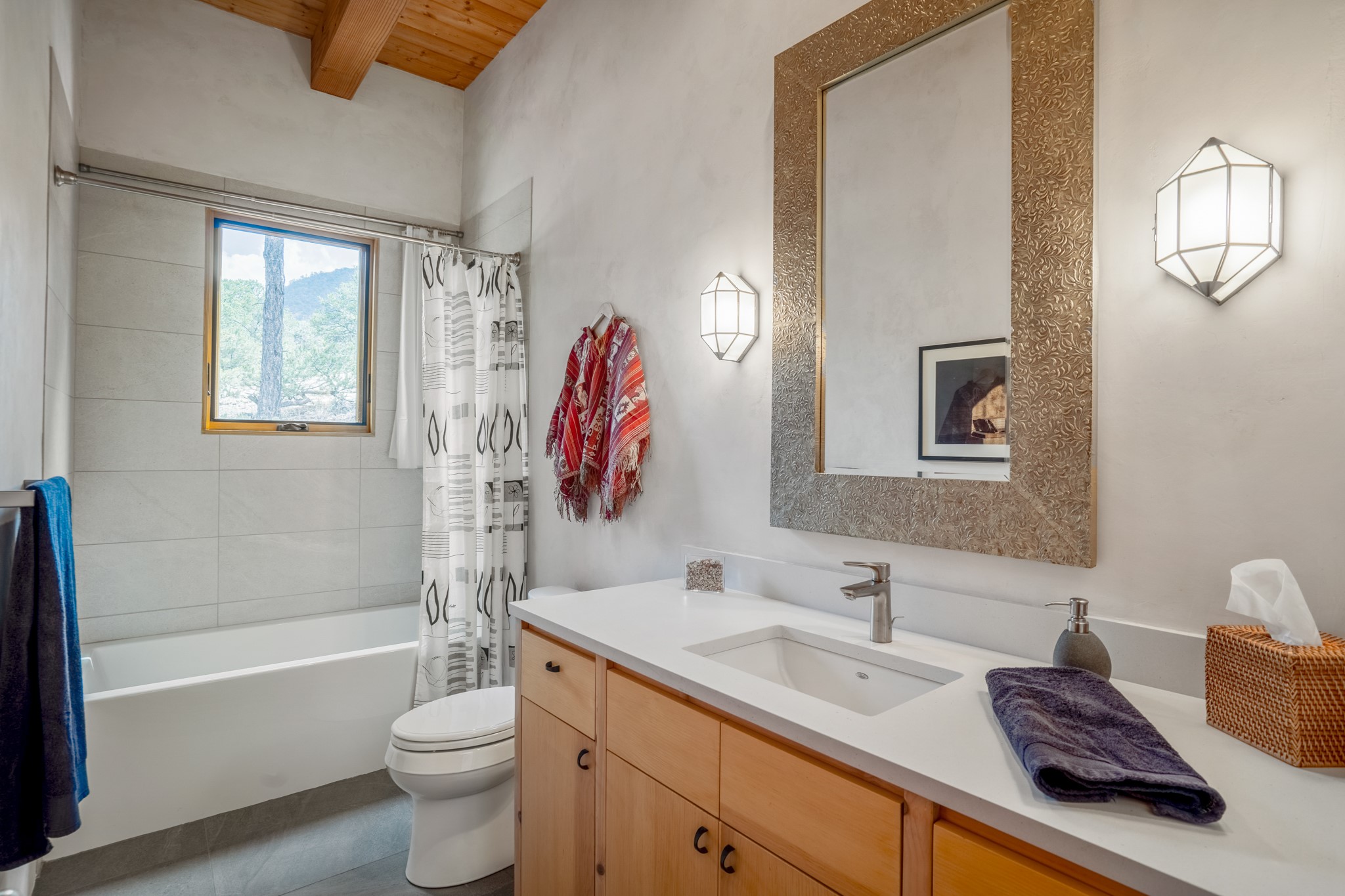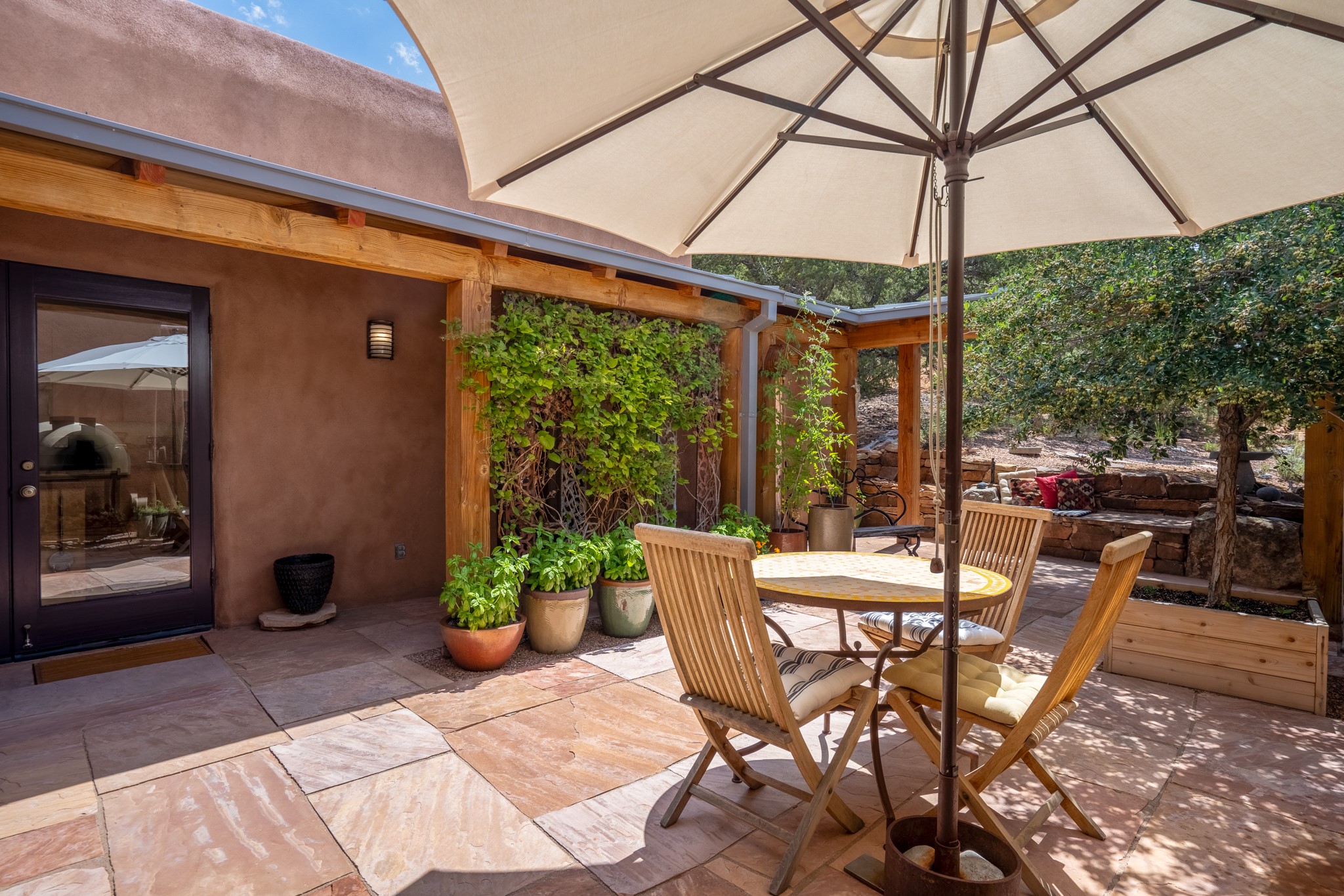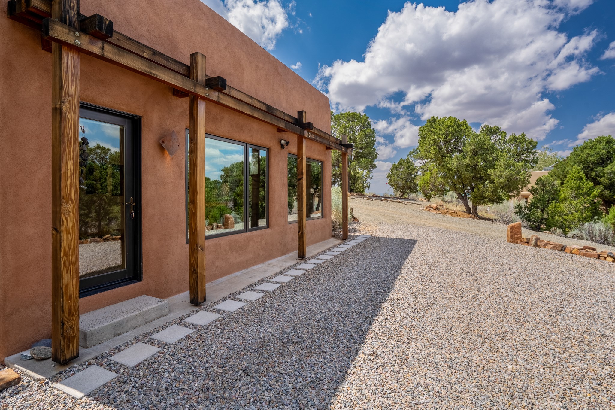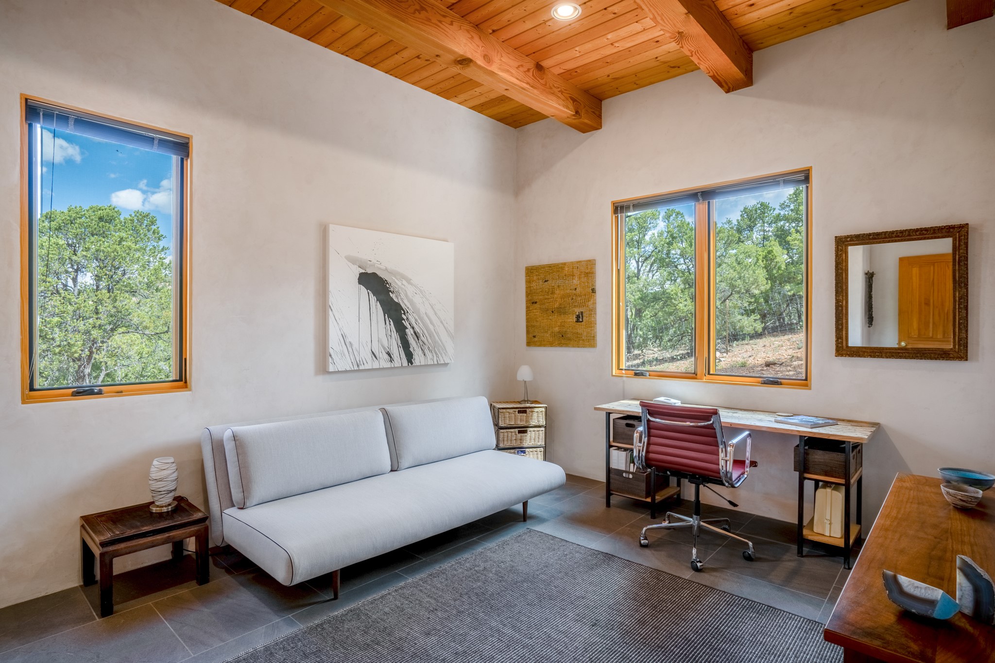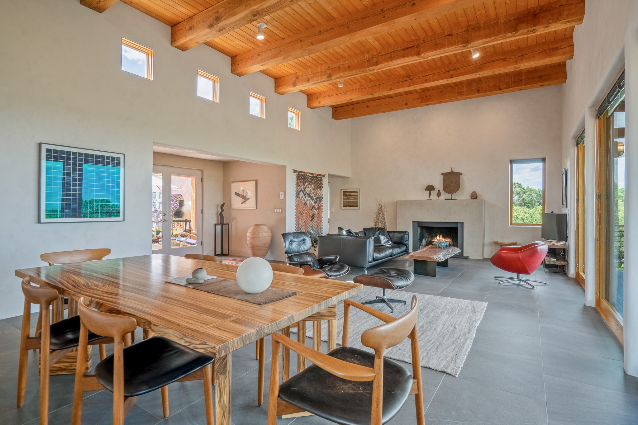 Rare, contemporary discovery with convenient access from Old Santa Fe Trail. Enjoy breathtaking, sweeping views of the Jemez Mountains, city lights, and surrounding mountains, all while nestled in the foothills. Enter a beautifully secluded courtyard enclosed by a 9-foot wall, featuring landscaped hills, a built-in rock bench, and a lovely stone fountain. The generously open floor plan spans a single level without any steps. Floor-to-ceiling windows grace nearly every room. An expansive viewing deck enhances outdoor entertaining. The completely remodeled interior showcases distinctive features like large beams, tongue and groove details, high ceilings, Italian porcelain tile floors, radiant in-floor heating and a separation of space between the primary suite and guest bedrooms. A fabulous cook's designed kitchen completes this spectacular beauty. Adding a bit more to these ingredients is a detached 546 square foot studio with expansive views.
