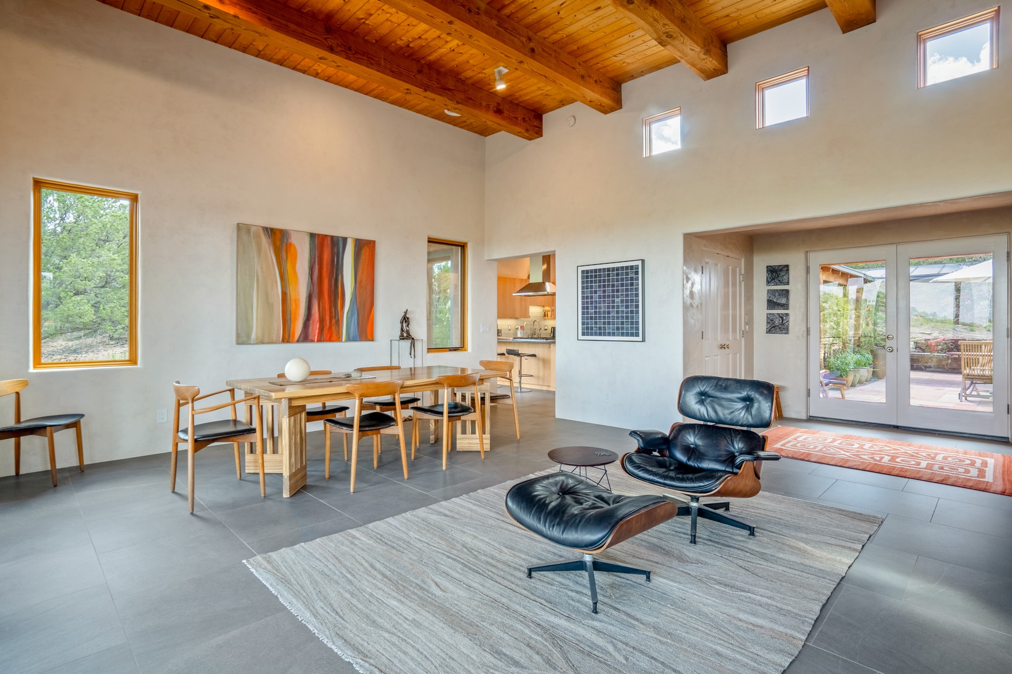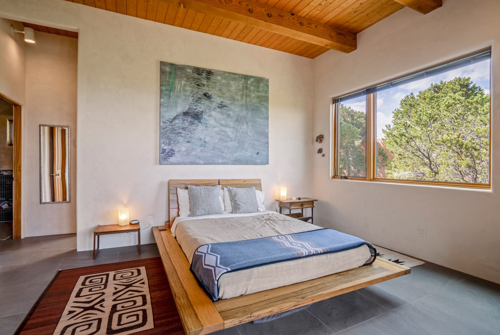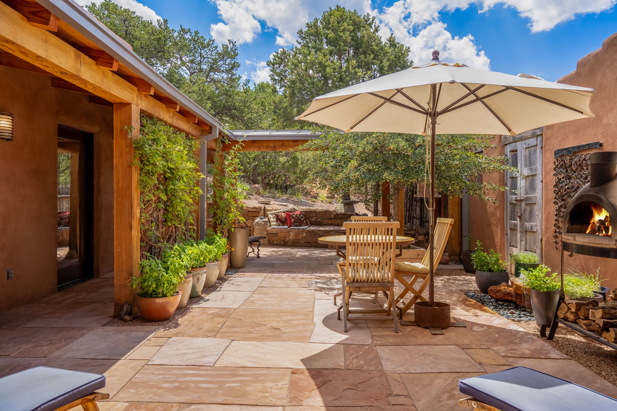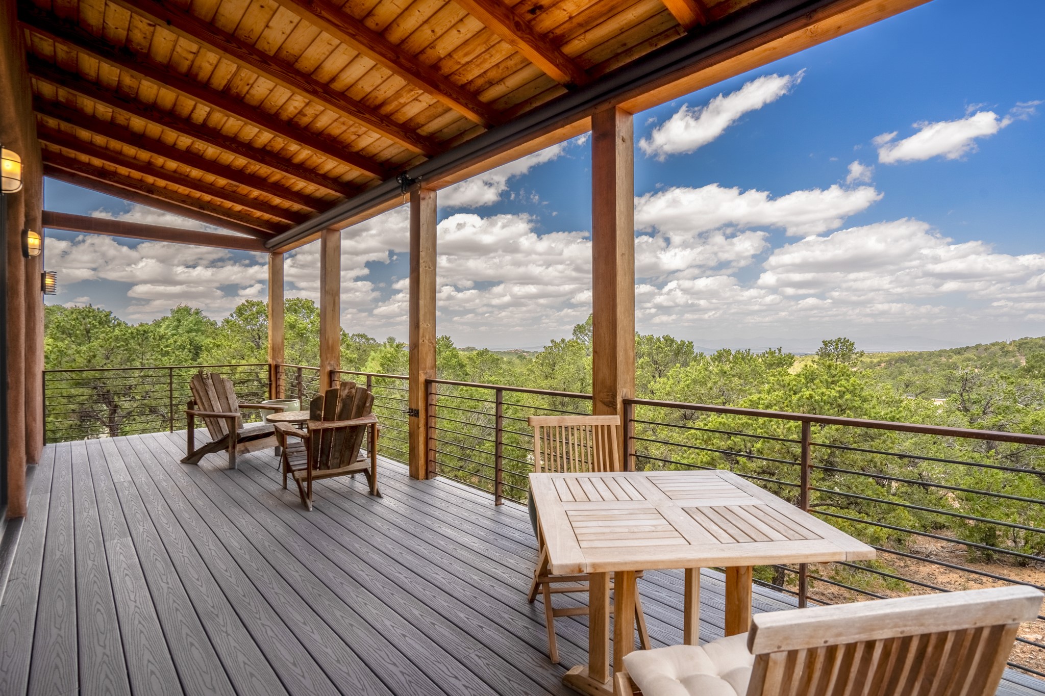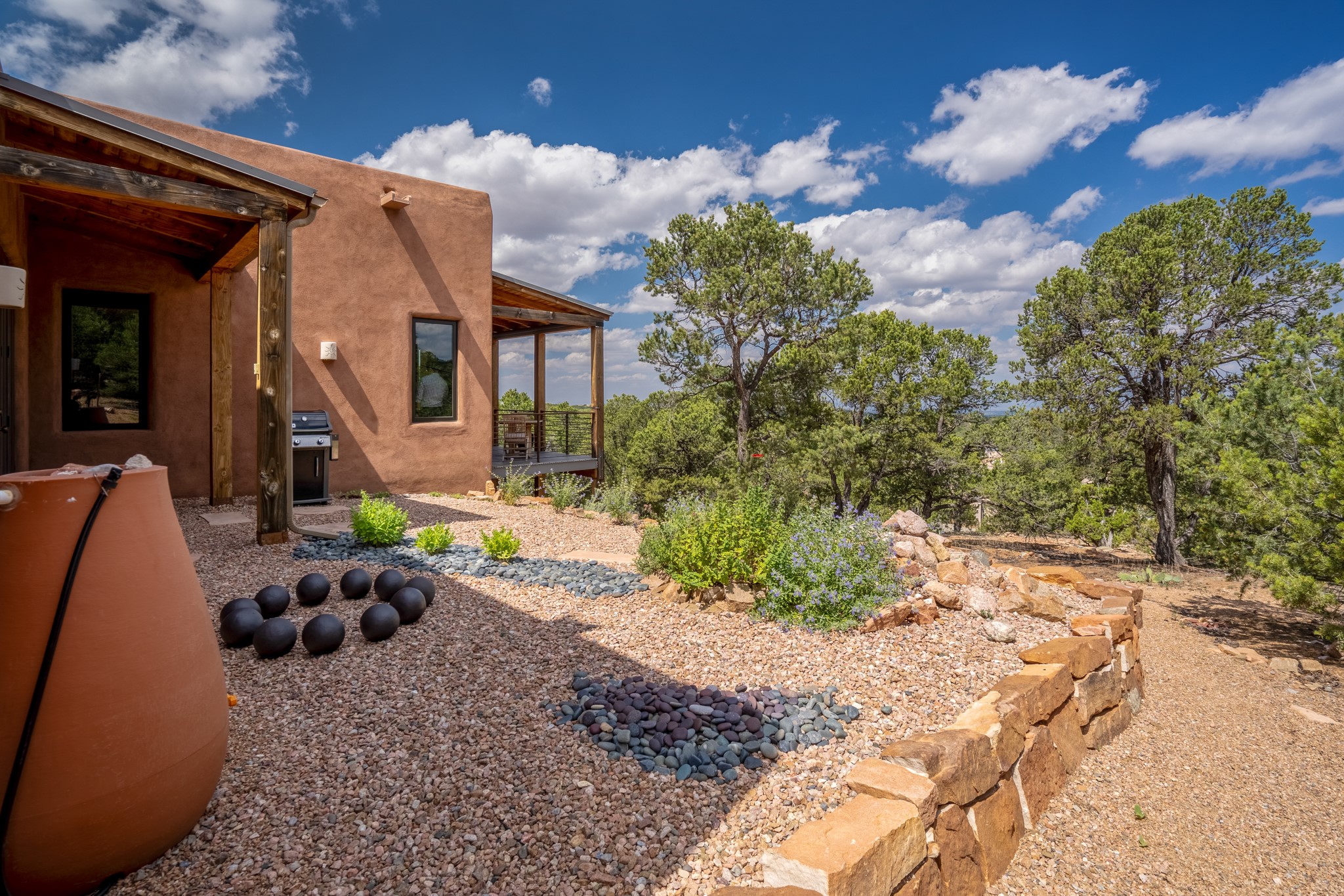 Rare, contemporary discovery with convenient access from Old Santa Fe Trail. Enjoy breathtaking, sweeping views of the Jemez Mountains, city lights, and surrounding mountains, all while nestled in the foothills. Enter a beautifully secluded courtyard enclosed by a 9-foot wall, featuring landscaped hills, a built-in rock bench, and a lovely stone fountain. The generously open floor plan spans a single level without any steps. Floor-to-ceiling windows grace nearly every room. An expansive viewing deck enhances outdoor entertaining. The completely remodeled interior showcases distinctive features like large beams, tongue and groove details, high ceilings, Italian porcelain tile floors, radiant in-floor heating and a separation of space between the primary suite and guest bedrooms. A fabulous cook's designed kitchen completes this spectacular beauty. Adding a bit more to these ingredients is a detached 546 square foot studio with expansive views.