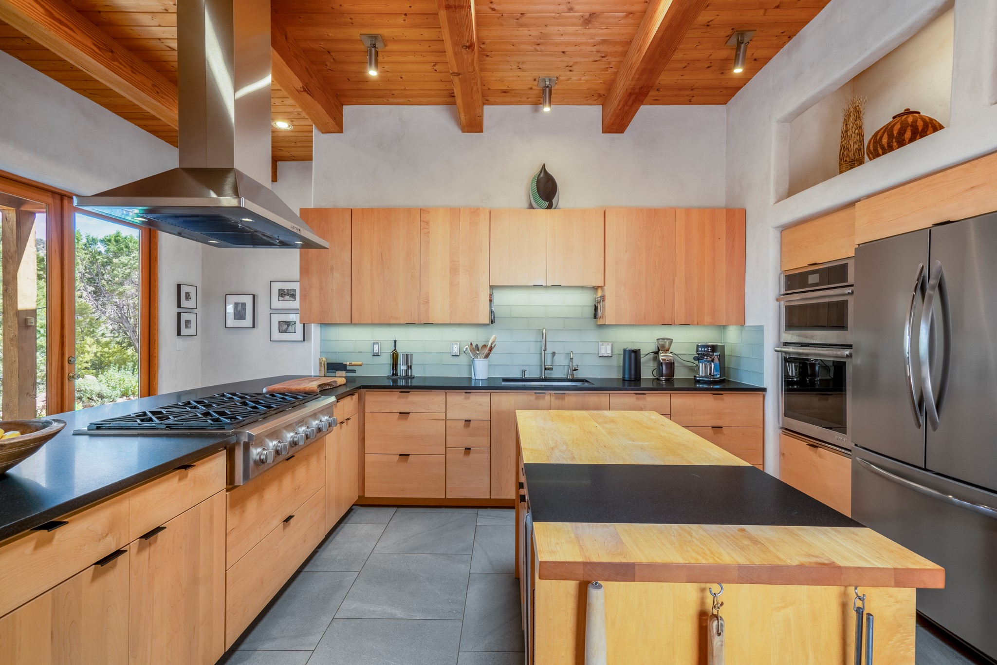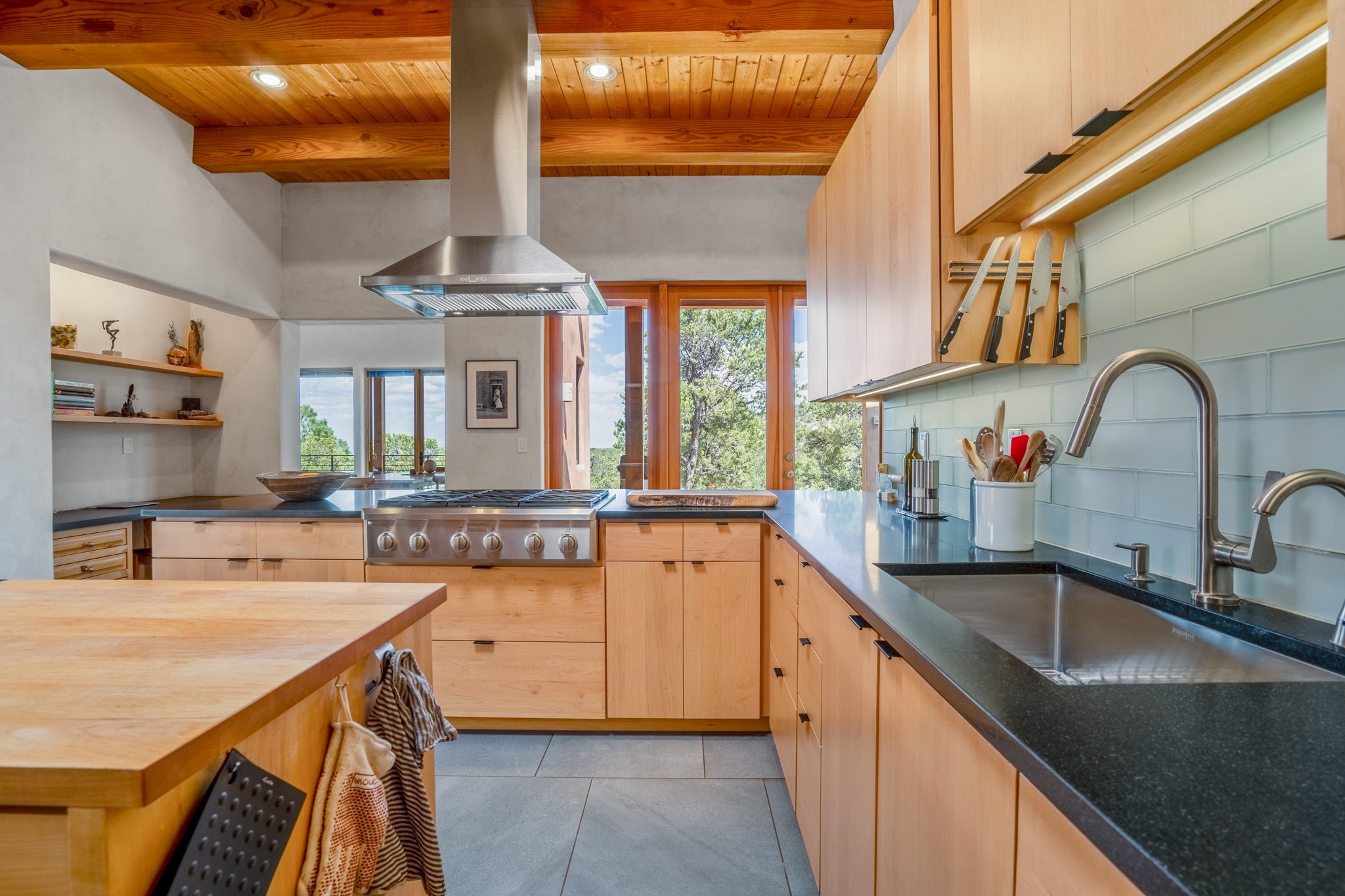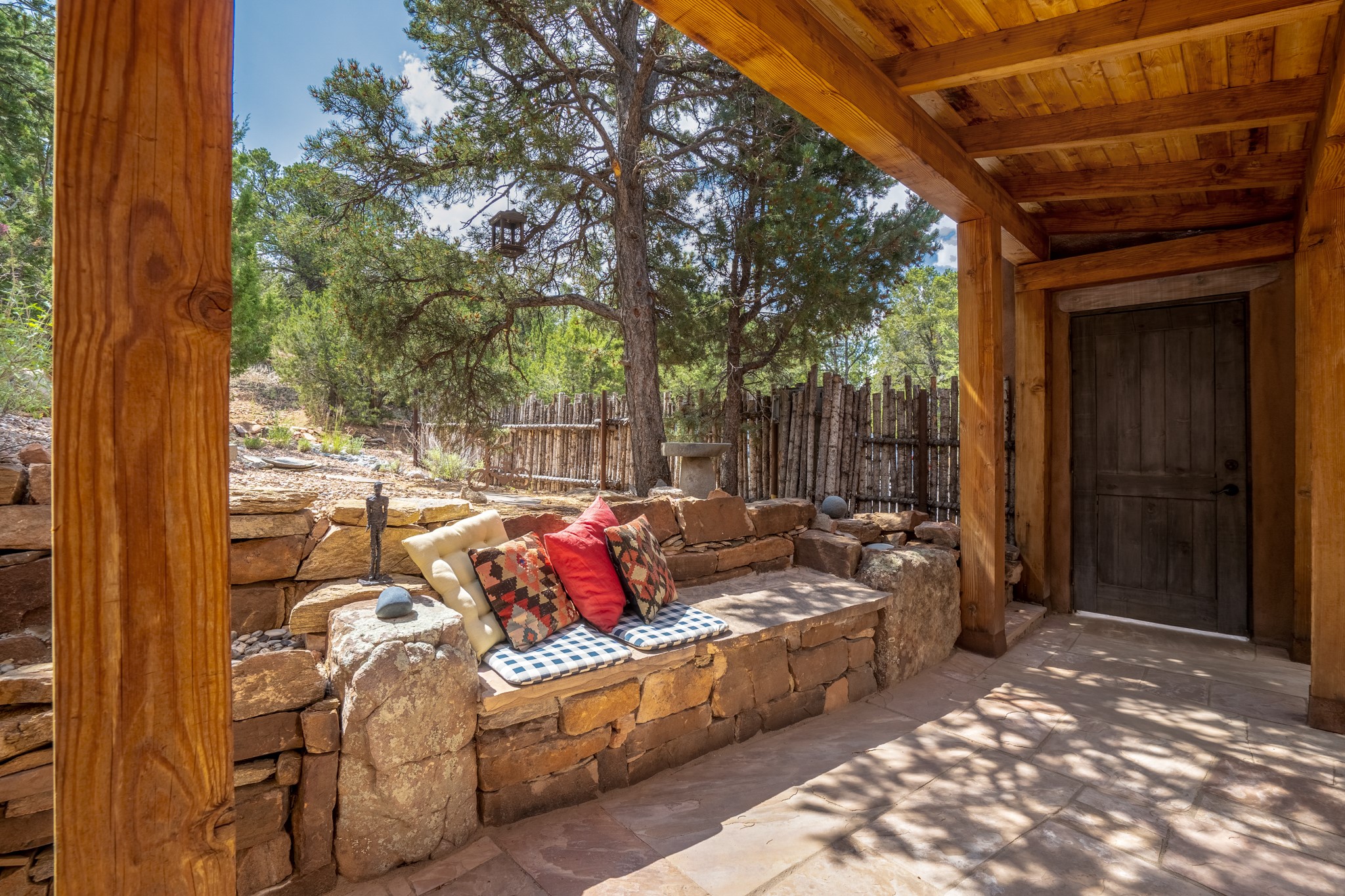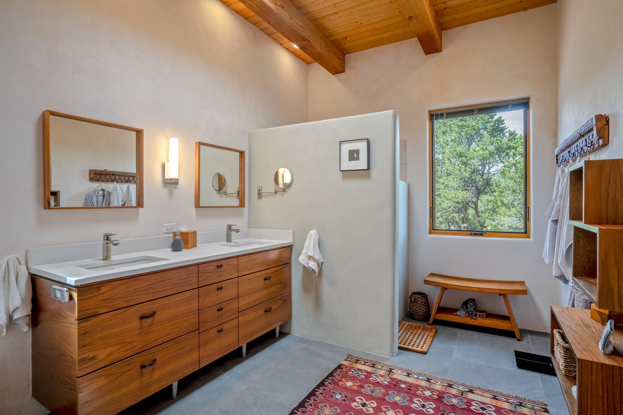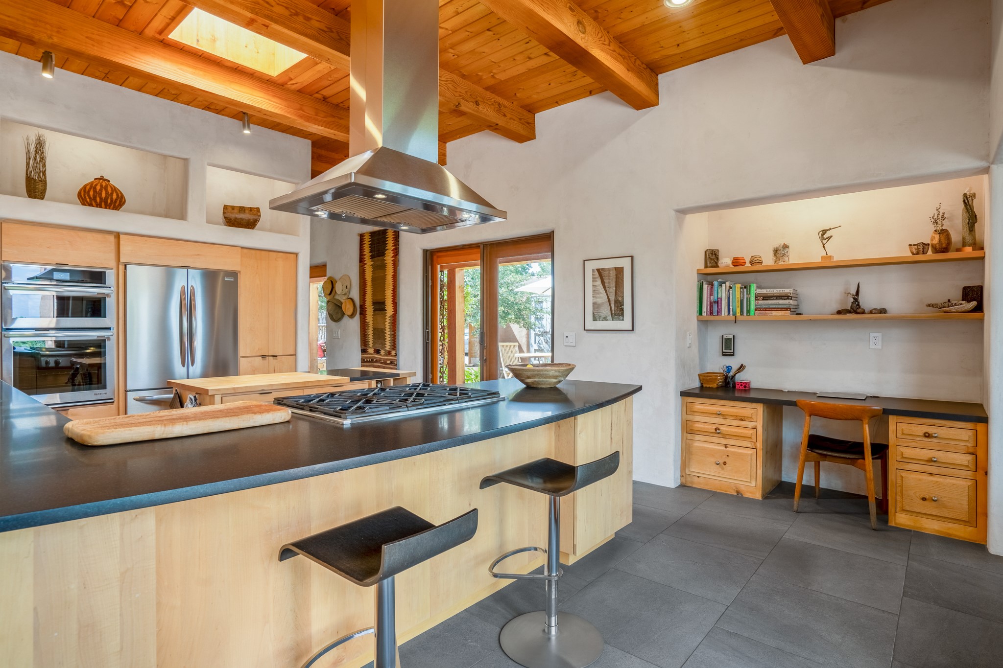 Rare, contemporary discovery with convenient access from Old Santa Fe Trail. Enjoy breathtaking, sweeping views of the Jemez Mountains, city lights, and surrounding mountains, all while nestled in the foothills. Enter a beautifully secluded courtyard enclosed by a 9-foot wall, featuring landscaped hills, a built-in rock bench, and a lovely stone fountain. The generously open floor plan spans a single level without any steps. Floor-to-ceiling windows grace nearly every room. An expansive viewing deck enhances outdoor entertaining. The completely remodeled interior showcases distinctive features like large beams, tongue and groove details, high ceilings, Italian porcelain tile floors, radiant in-floor heating and a separation of space between the primary suite and guest bedrooms. A fabulous cook's designed kitchen completes this spectacular beauty. Adding a bit more to these ingredients is a detached 546 square foot studio with expansive views.