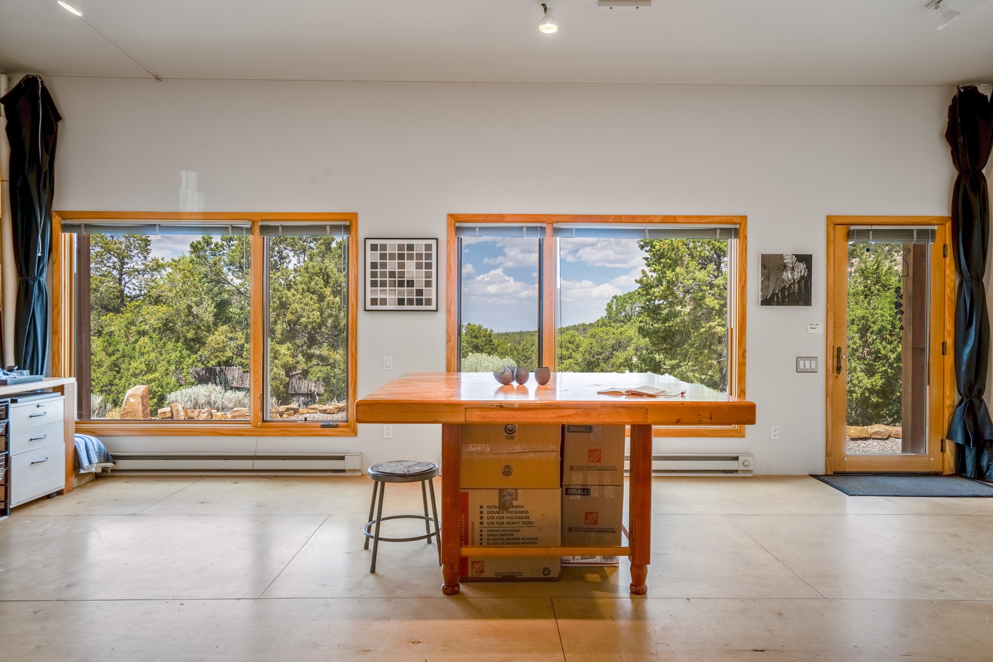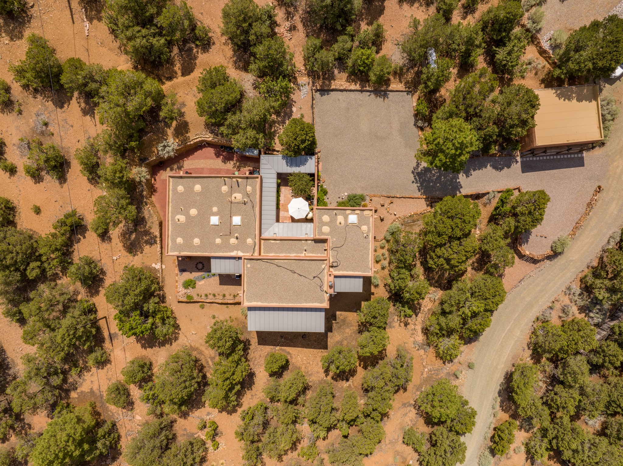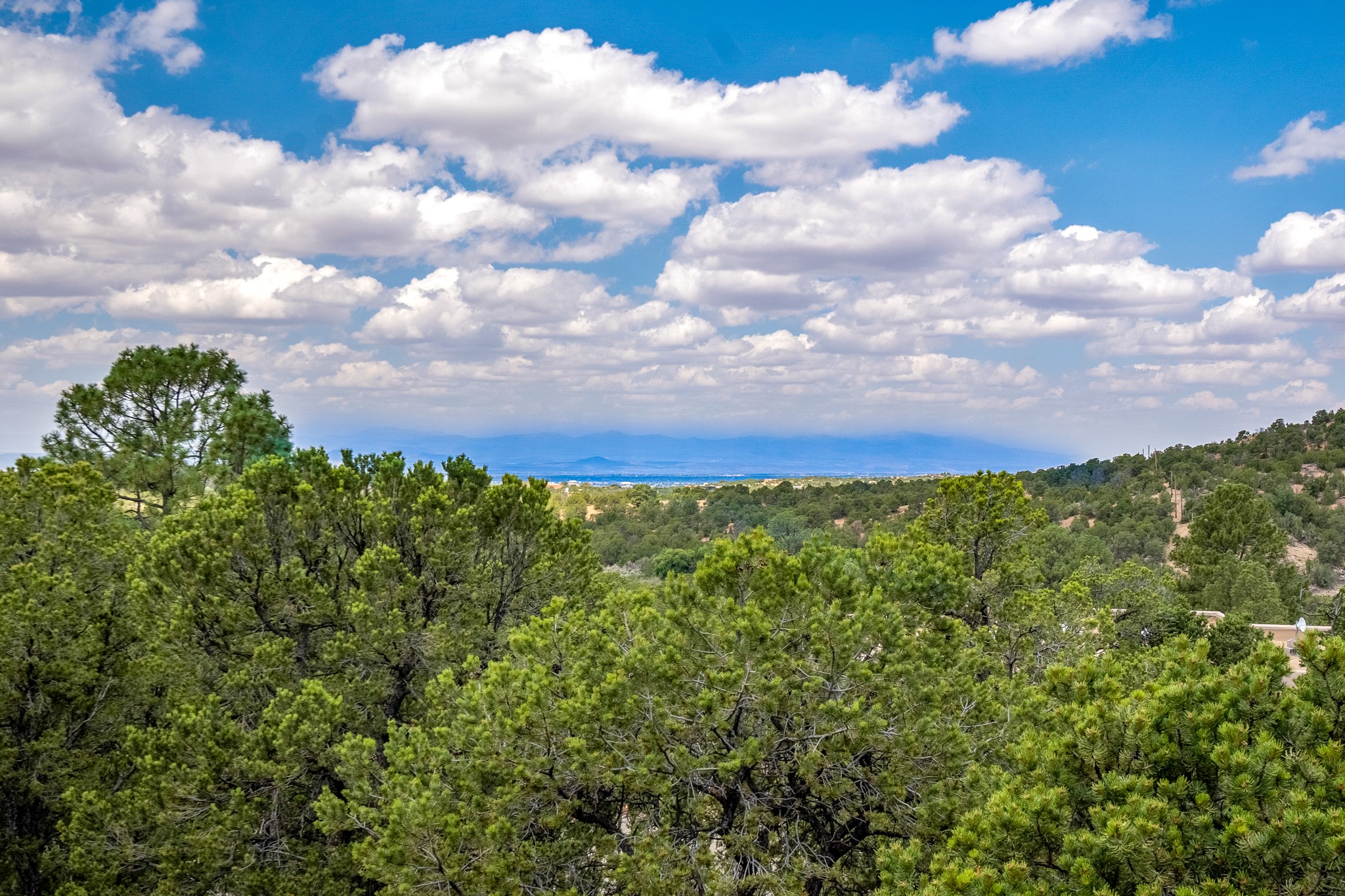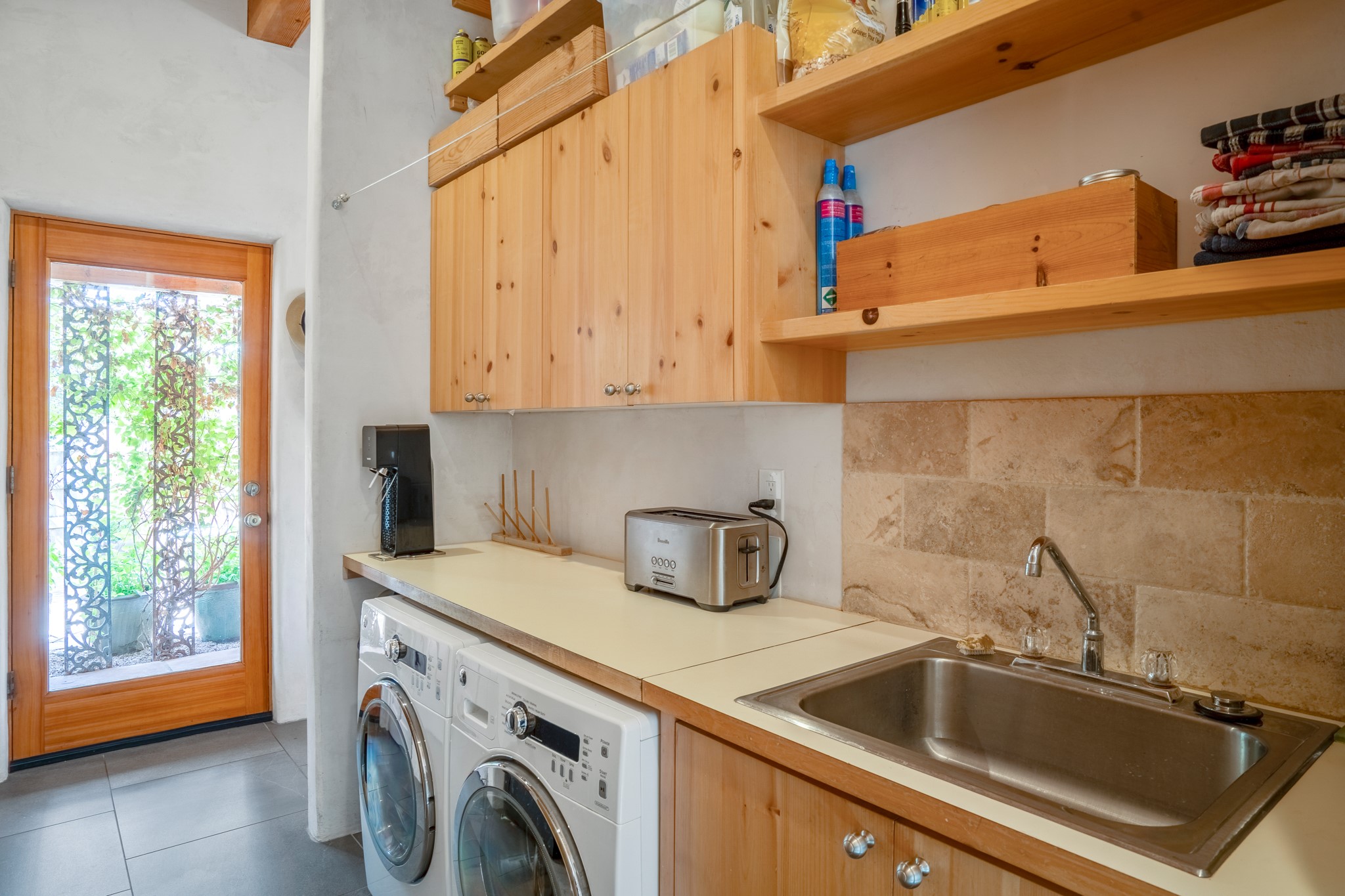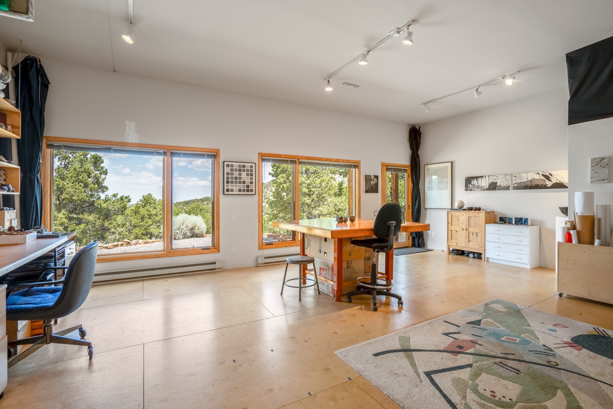 Rare, contemporary discovery with convenient access from Old Santa Fe Trail. Enjoy breathtaking, sweeping views of the Jemez Mountains, city lights, and surrounding mountains, all while nestled in the foothills. Enter a beautifully secluded courtyard enclosed by a 9-foot wall, featuring landscaped hills, a built-in rock bench, and a lovely stone fountain. The generously open floor plan spans a single level without any steps. Floor-to-ceiling windows grace nearly every room. An expansive viewing deck enhances outdoor entertaining. The completely remodeled interior showcases distinctive features like large beams, tongue and groove details, high ceilings, Italian porcelain tile floors, radiant in-floor heating and a separation of space between the primary suite and guest bedrooms. A fabulous cook's designed kitchen completes this spectacular beauty. Adding a bit more to these ingredients is a detached 546 square foot studio with expansive views.