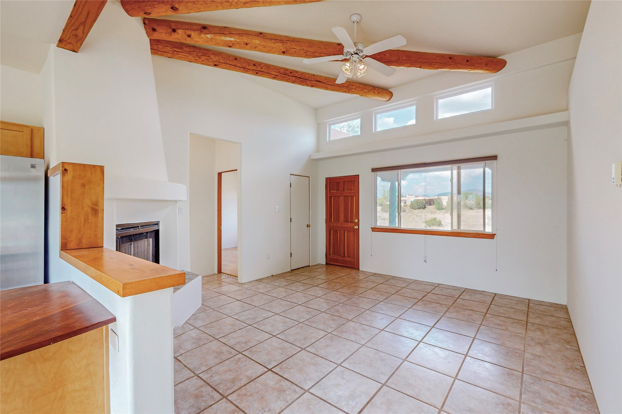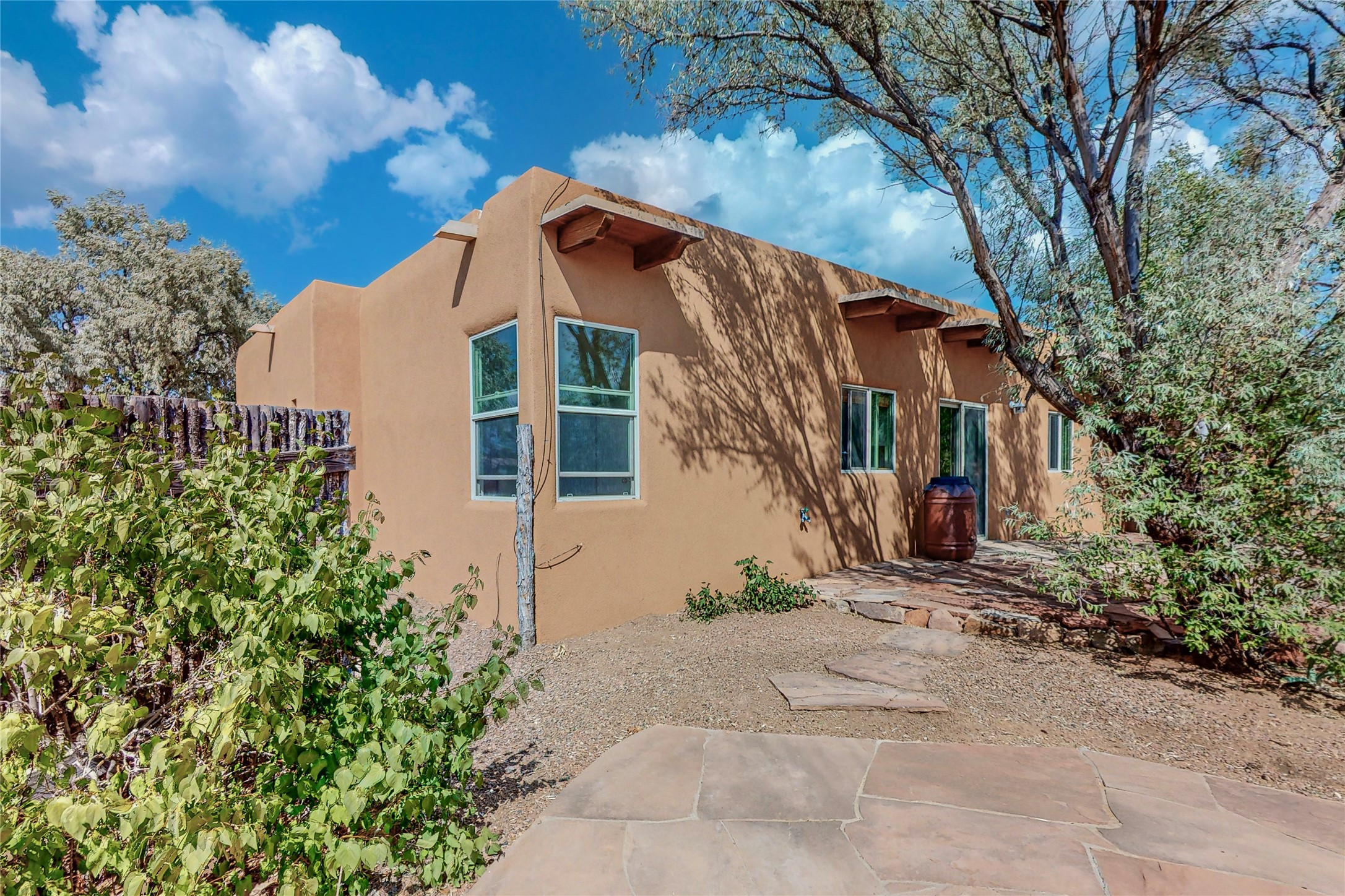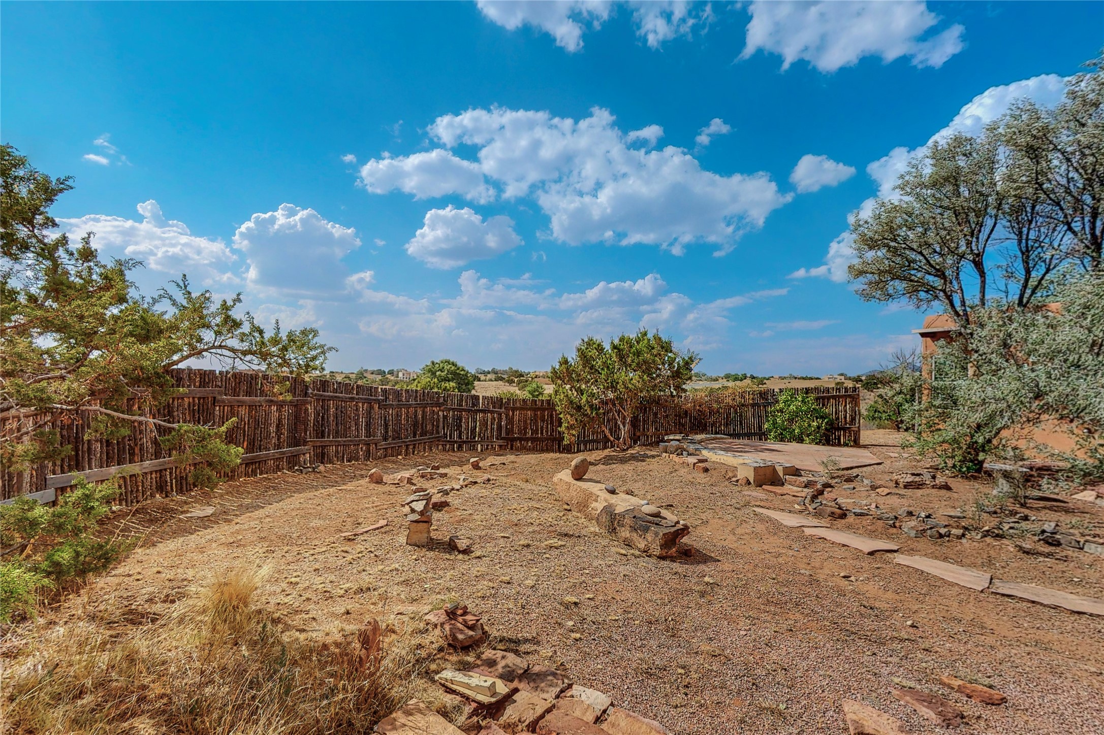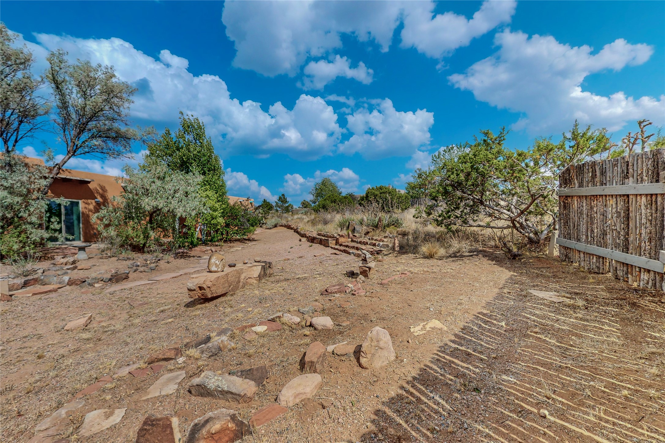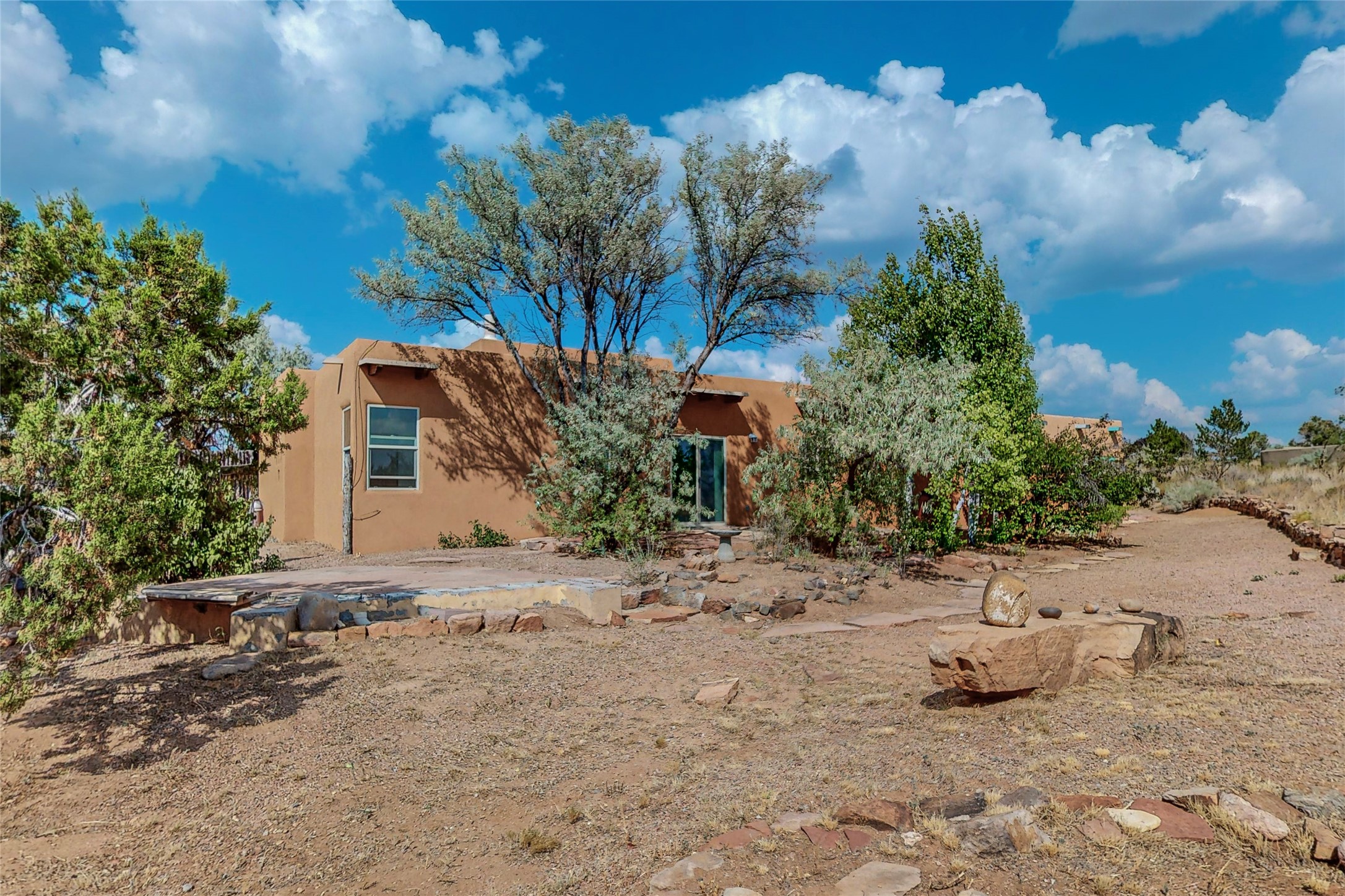 Open plan, split 3 bedroom, 2 bath home attached 800 sqft. 2 heated studios with huge high ceilings. Although small the high ceilings create a spacious feel. A sunburst design viga ceiling and corner living room fireplace opens to the kitchen and dining areas. The surrounding landscape is ready and invites your personal touches, and has sweeping mountain and sunset views. A large 2-car garage and plenty of guest parking adds convenience. Privately located on a cul de sac bordering a large greenbelt yet close to paved access roads leading to local shopping, restaurants, schools, senior center, and library. This home accesses all of Eldorado community activities and trails plus only minutes into Santa Fe.
