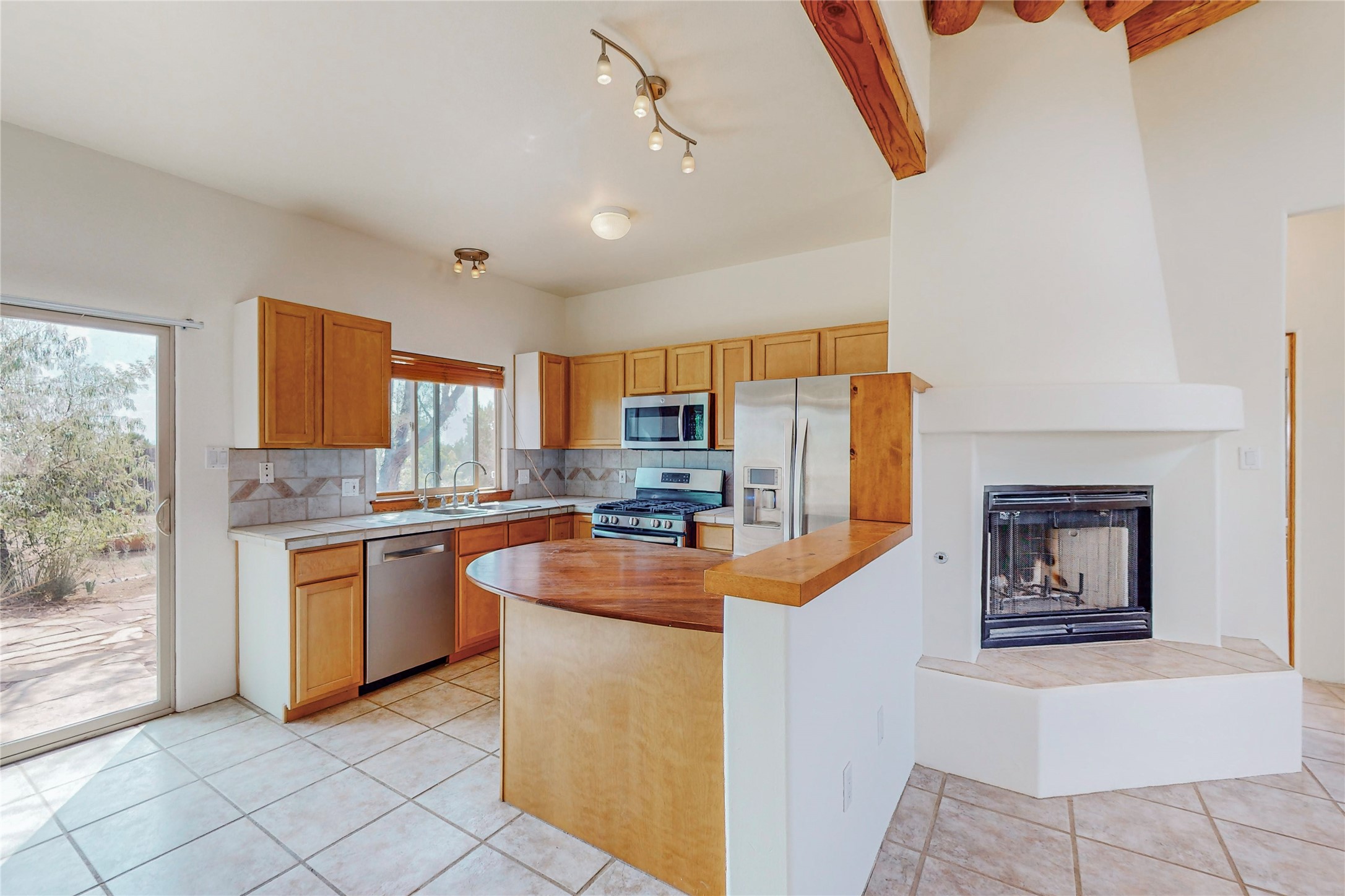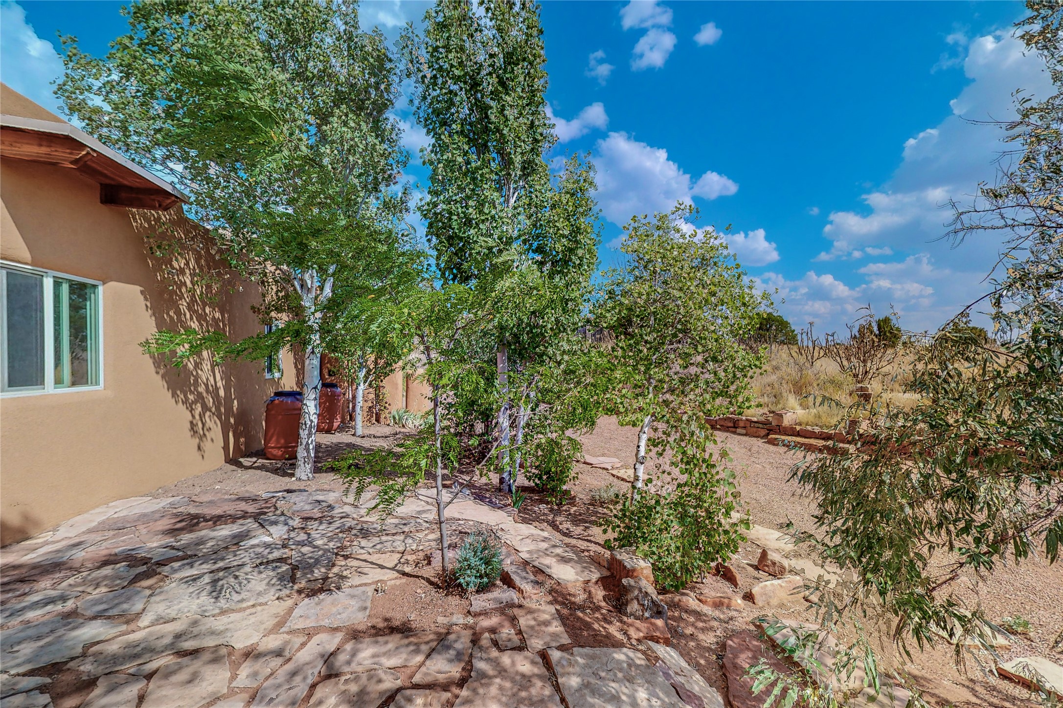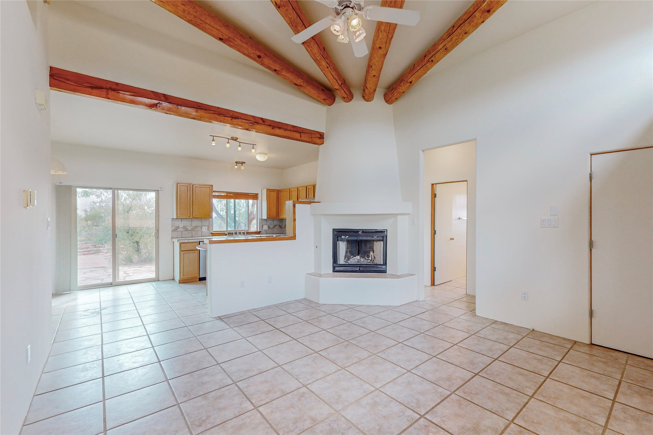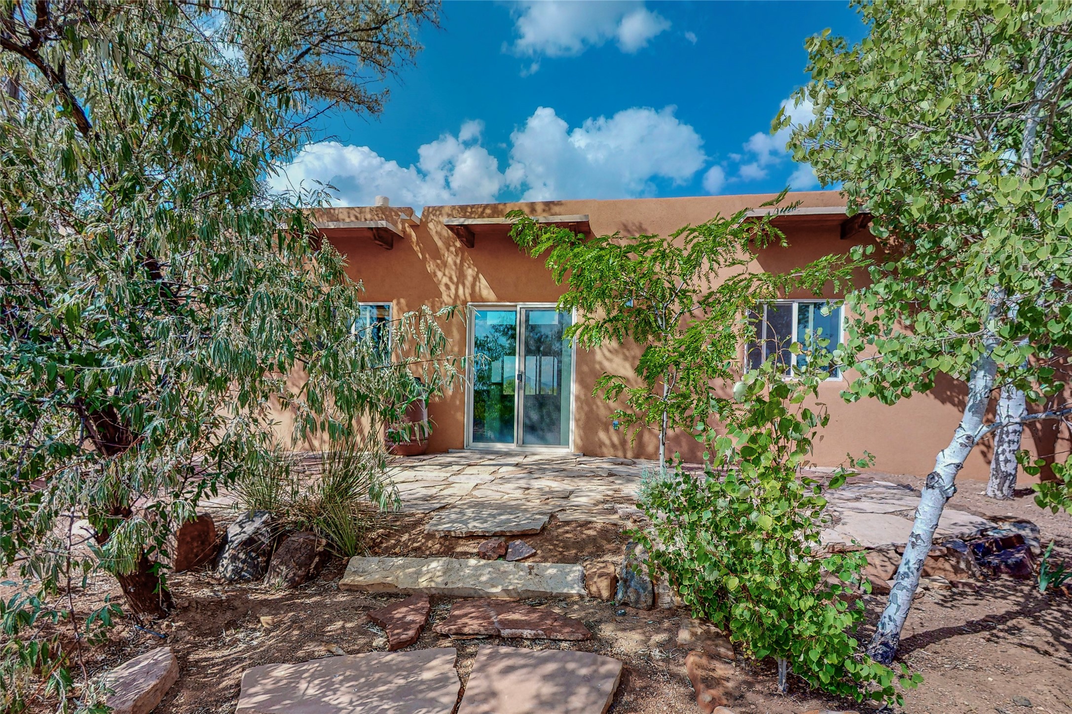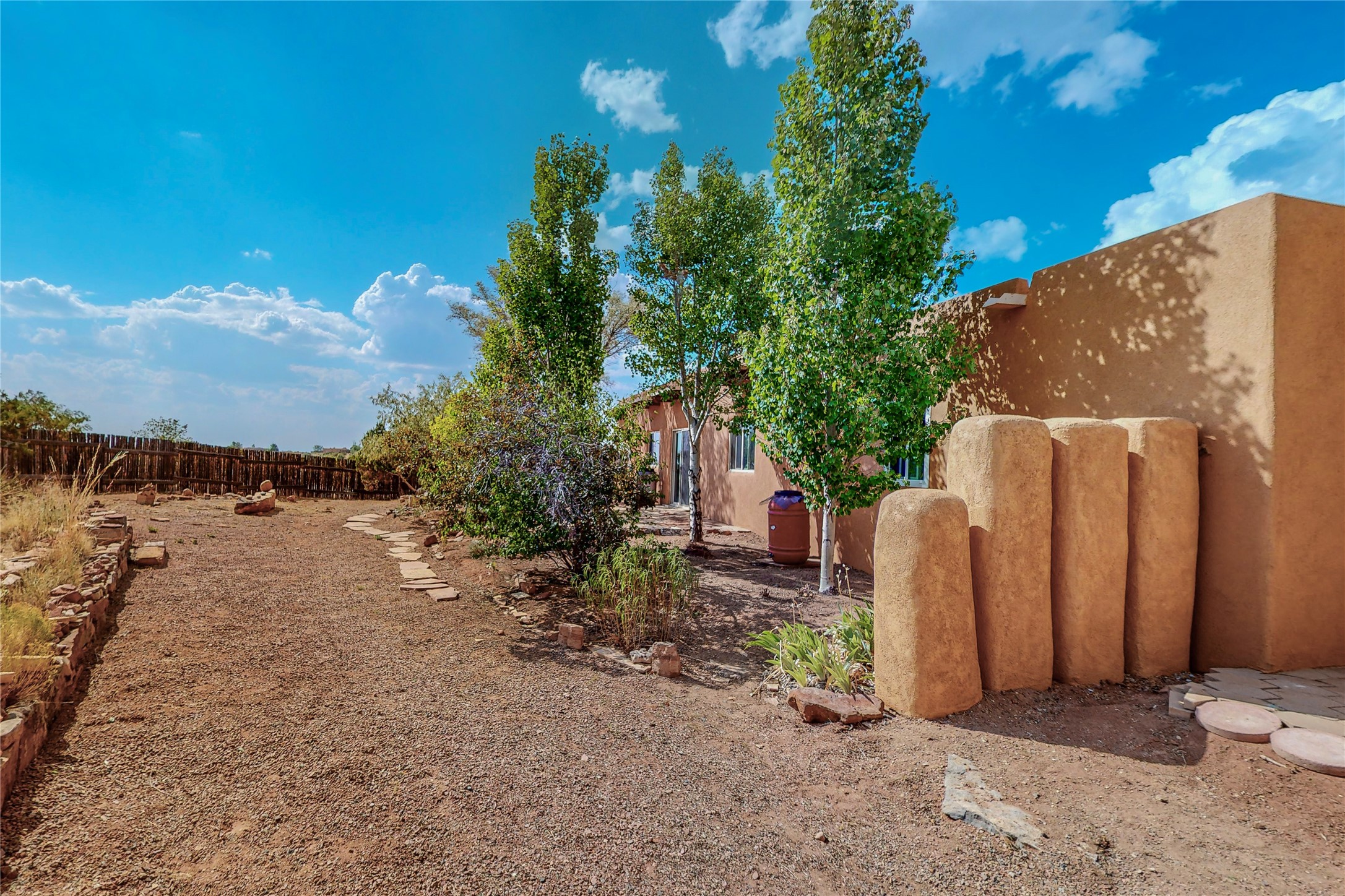 Open plan, split 3 bedroom, 2 bath home attached 800 sqft. 2 heated studios with huge high ceilings. Although small the high ceilings create a spacious feel. A sunburst design viga ceiling and corner living room fireplace opens to the kitchen and dining areas. The surrounding landscape is ready and invites your personal touches, and has sweeping mountain and sunset views. A large 2-car garage and plenty of guest parking adds convenience. Privately located on a cul de sac bordering a large greenbelt yet close to paved access roads leading to local shopping, restaurants, schools, senior center, and library. This home accesses all of Eldorado community activities and trails plus only minutes into Santa Fe.