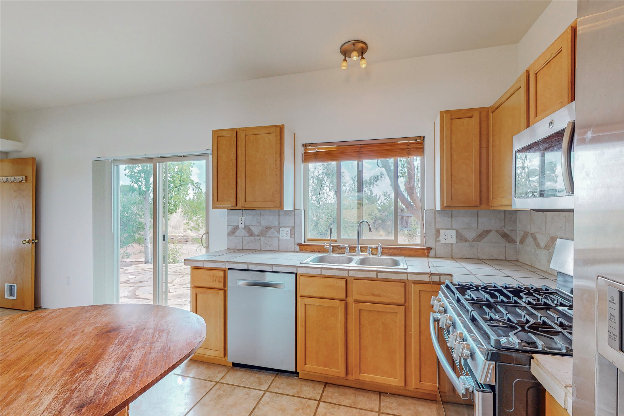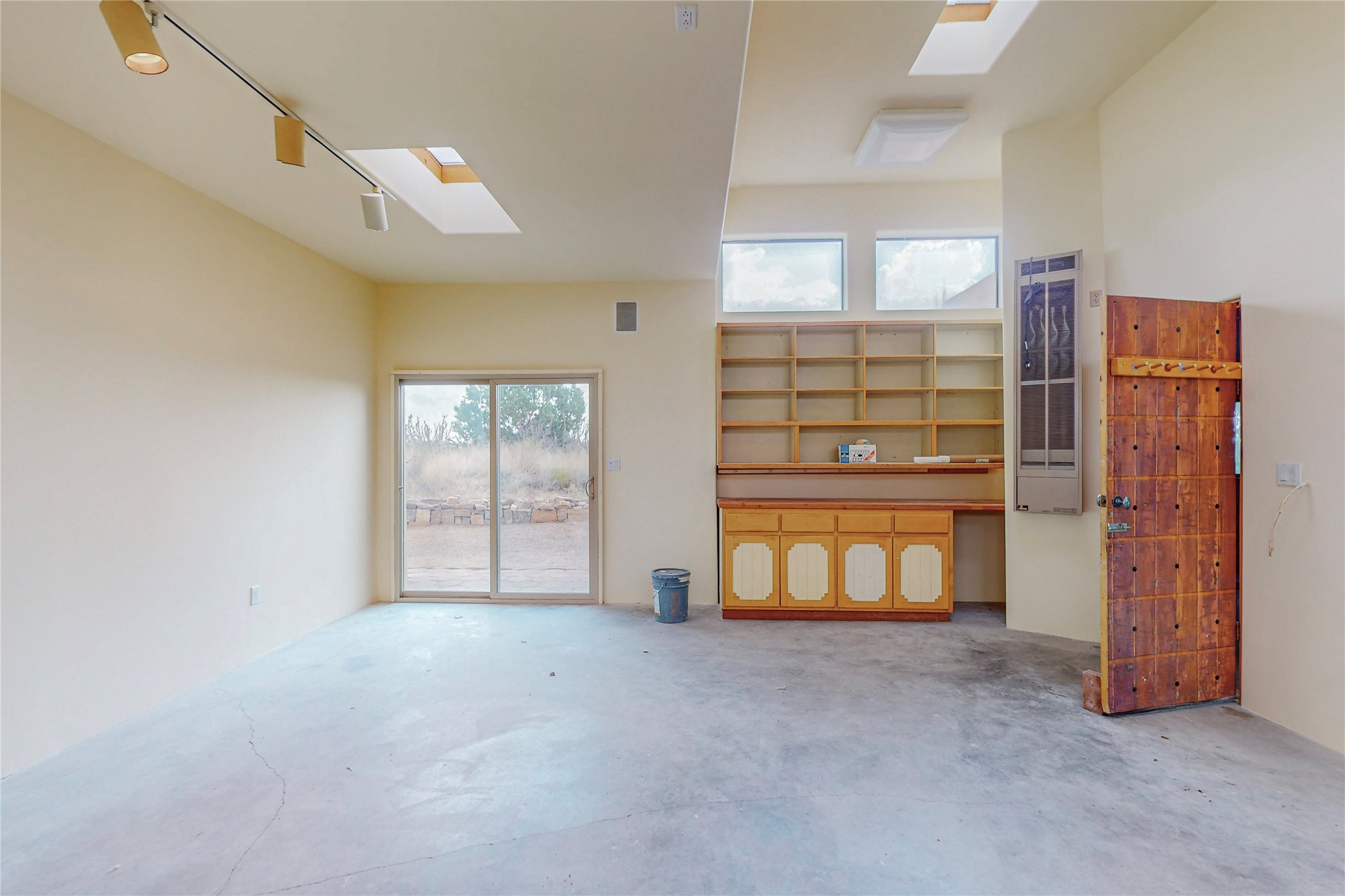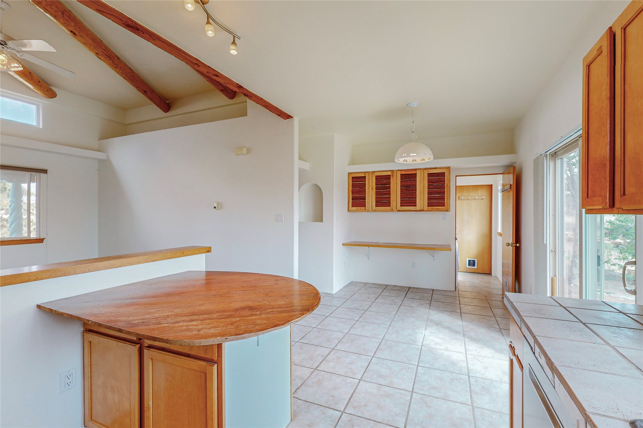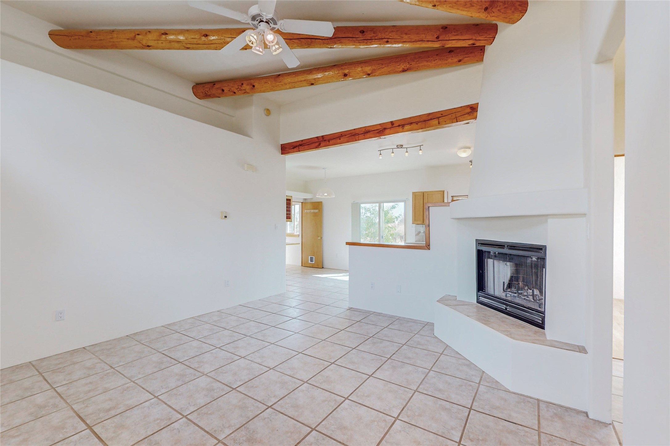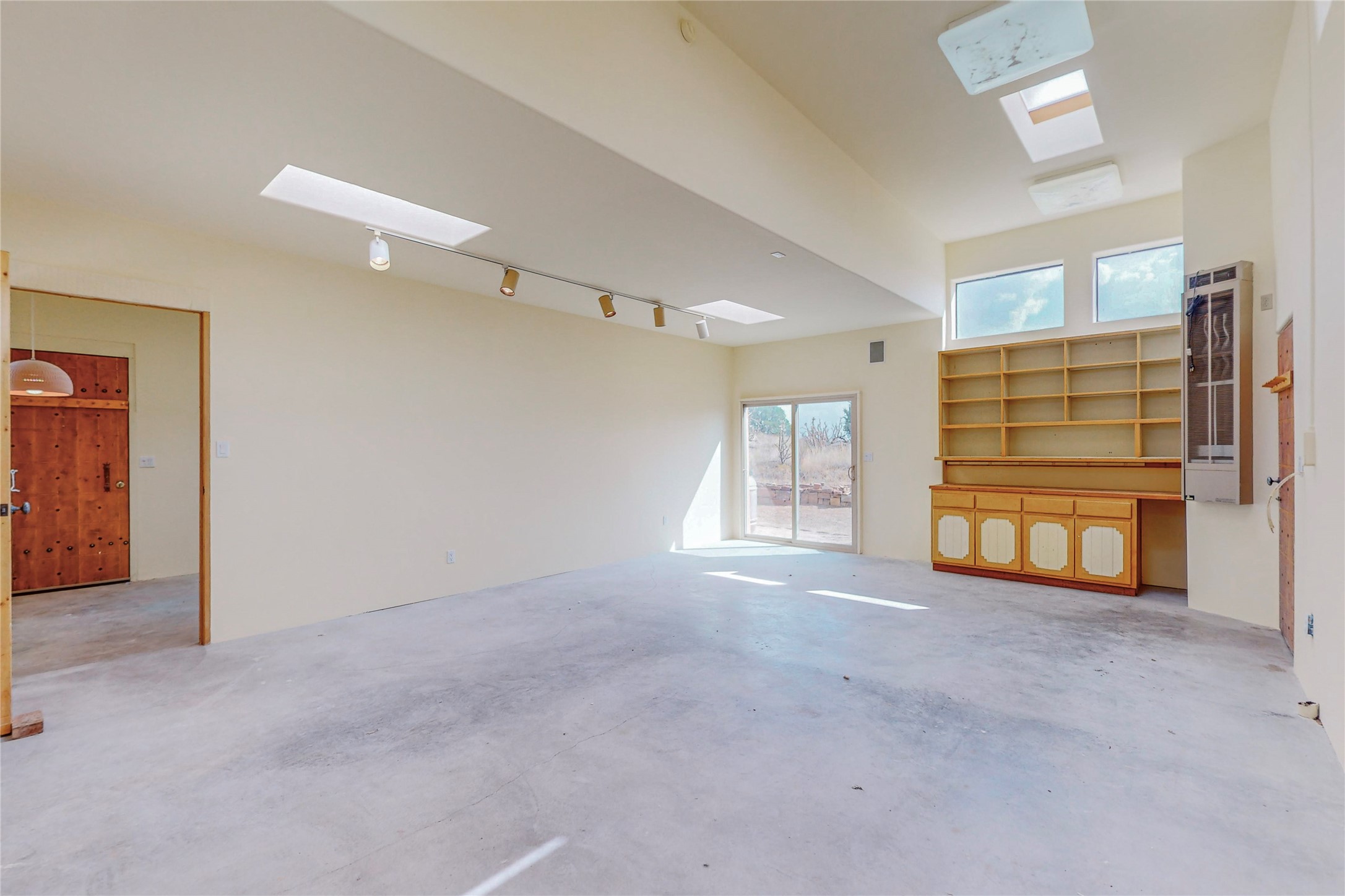 Open plan, split 3 bedroom, 2 bath home attached 800 sqft. 2 heated studios with huge high ceilings. Although small the high ceilings create a spacious feel. A sunburst design viga ceiling and corner living room fireplace opens to the kitchen and dining areas. The surrounding landscape is ready and invites your personal touches, and has sweeping mountain and sunset views. A large 2-car garage and plenty of guest parking adds convenience. Privately located on a cul de sac bordering a large greenbelt yet close to paved access roads leading to local shopping, restaurants, schools, senior center, and library. This home accesses all of Eldorado community activities and trails plus only minutes into Santa Fe.