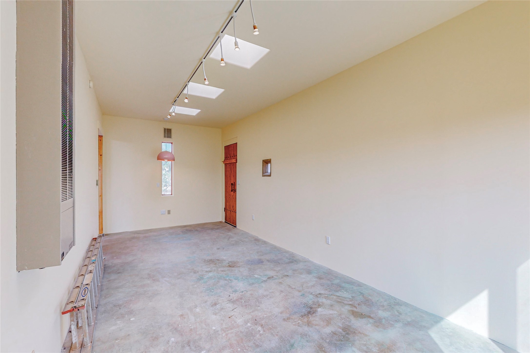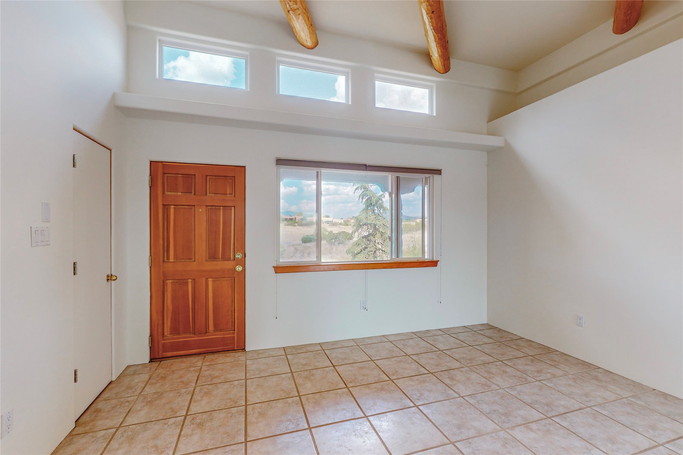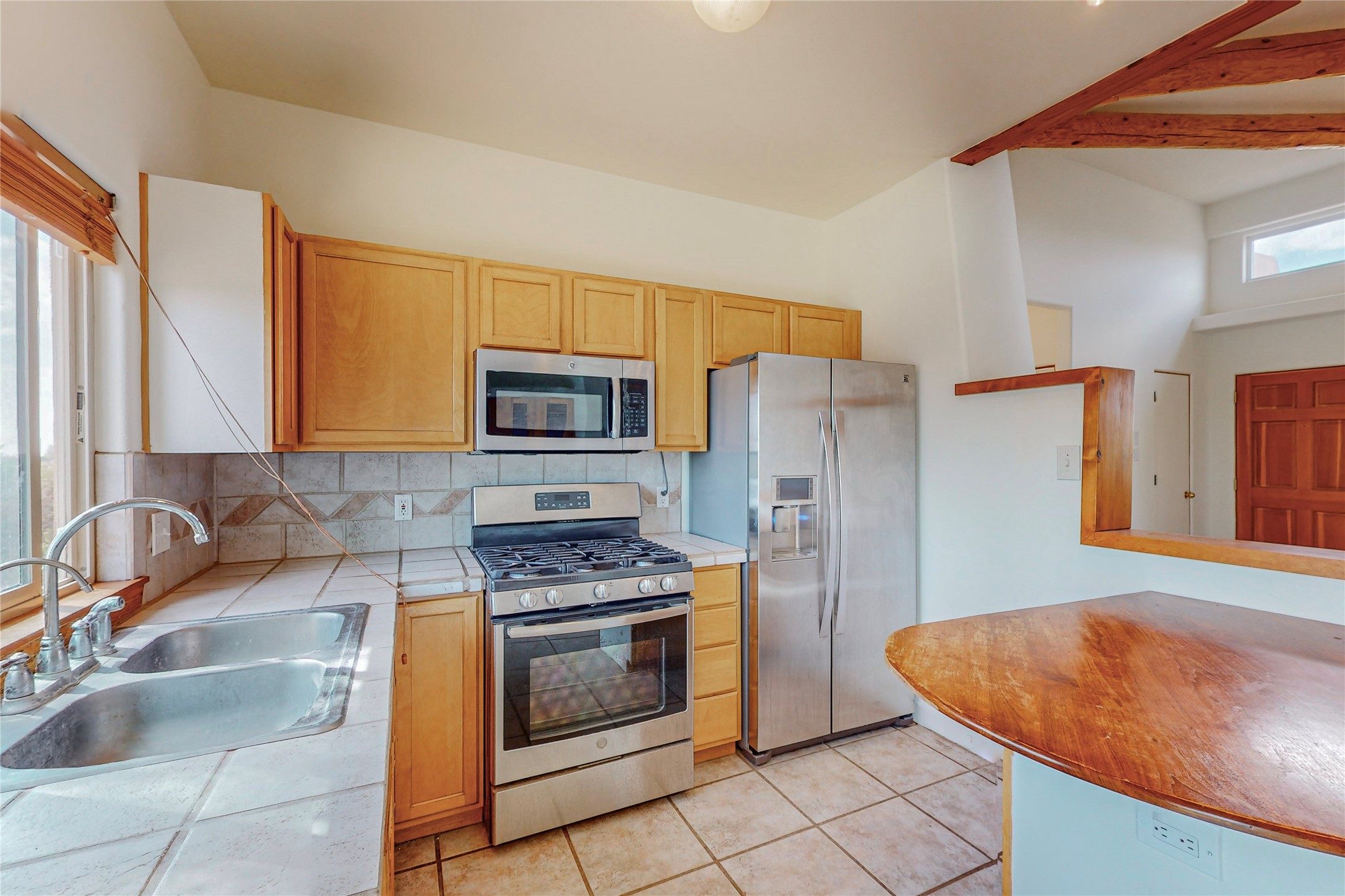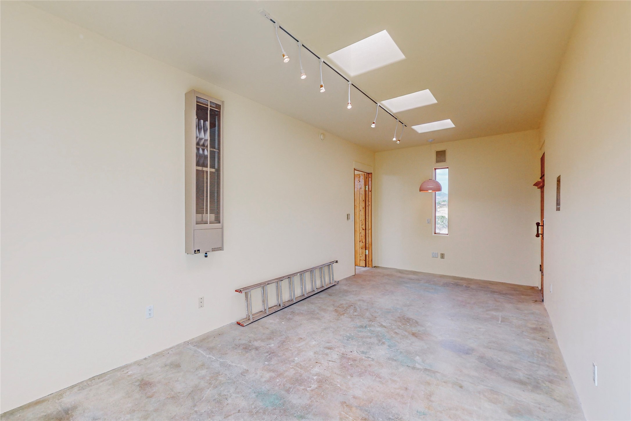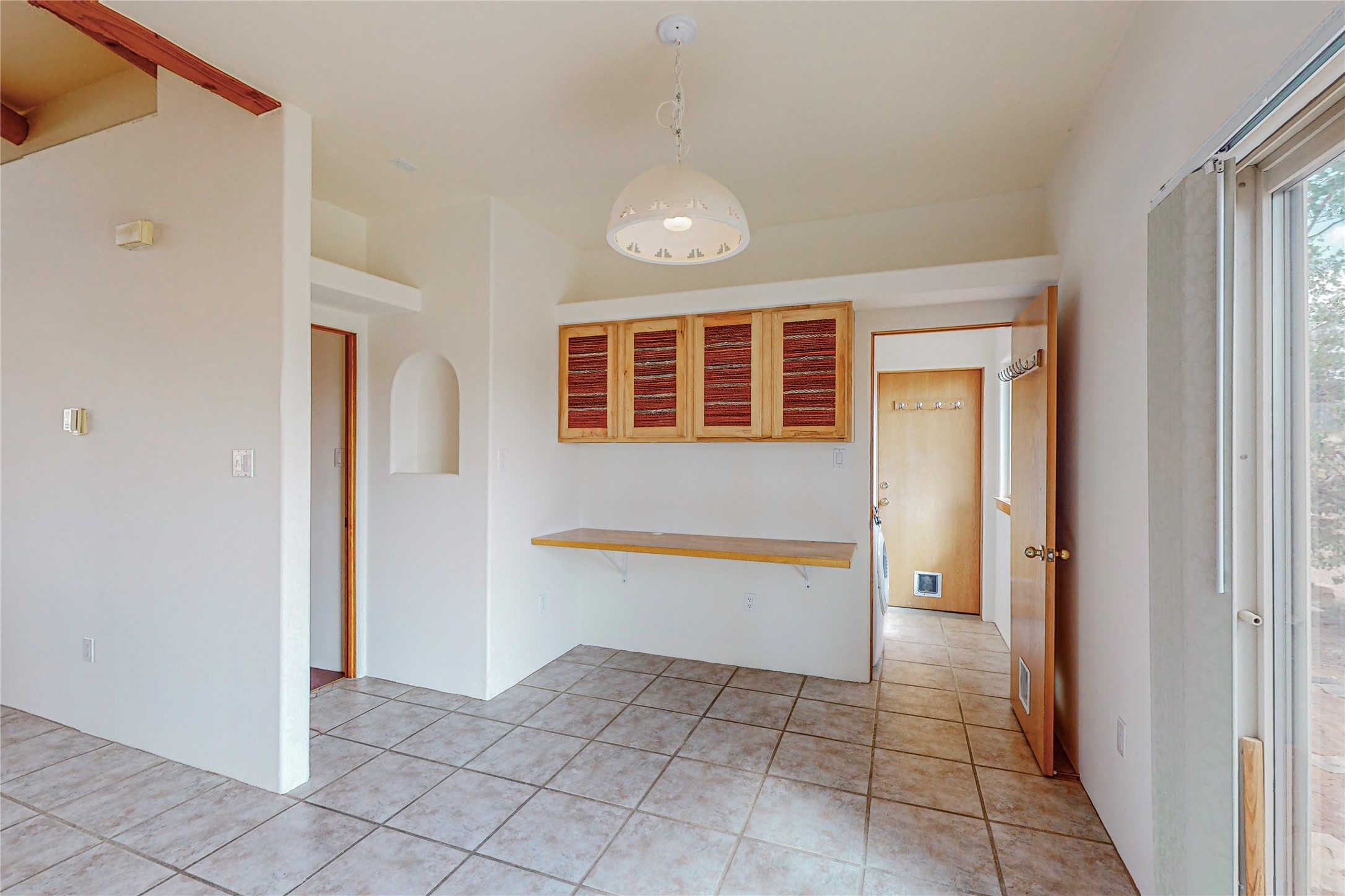 Open plan, split 3 bedroom, 2 bath home attached 800 sqft. 2 heated studios with huge high ceilings. Although small the high ceilings create a spacious feel. A sunburst design viga ceiling and corner living room fireplace opens to the kitchen and dining areas. The surrounding landscape is ready and invites your personal touches, and has sweeping mountain and sunset views. A large 2-car garage and plenty of guest parking adds convenience. Privately located on a cul de sac bordering a large greenbelt yet close to paved access roads leading to local shopping, restaurants, schools, senior center, and library. This home accesses all of Eldorado community activities and trails plus only minutes into Santa Fe.