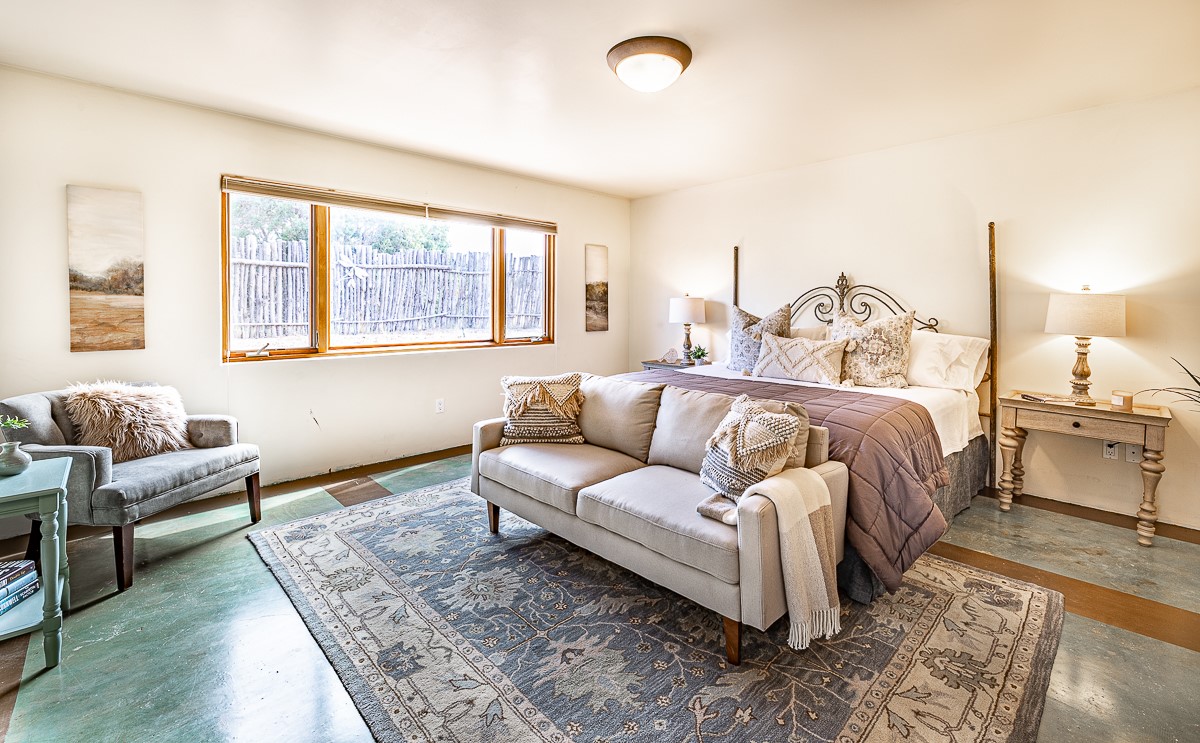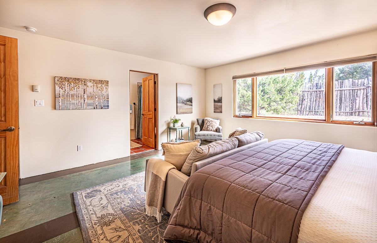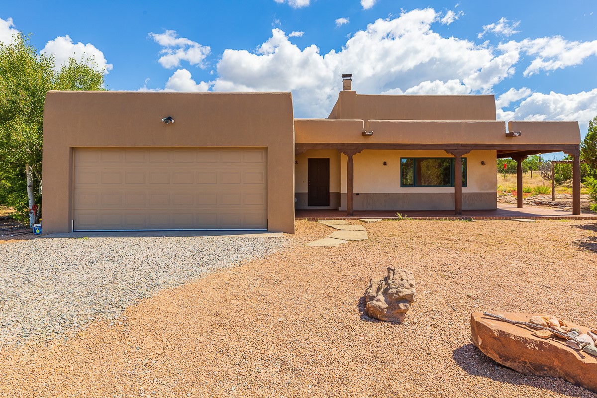 Motivated seller! This light filled home in Eldorado has high ceilings and features vigas, a kiva fireplace, saltillo tile floors, and tile bathroom counters and tub surrounds. There is comfortable outdoor living with two portals off the living room/entry and the dining room. Enjoy the outdoor space under a gazebo or in a hot tub to look at the stars. The house is situated to get plenty of warmth from the sun in the winter and little direct sun in the summer. There is lots to see in this well designed home.