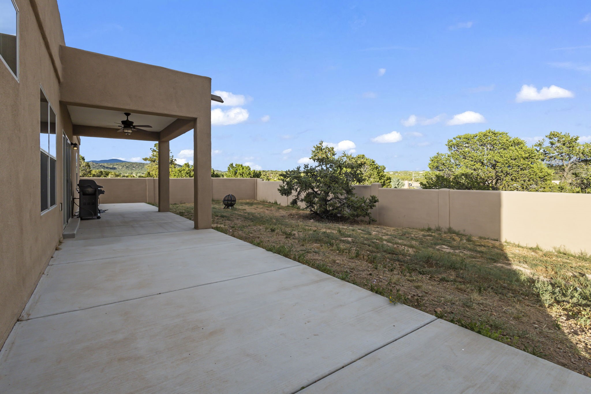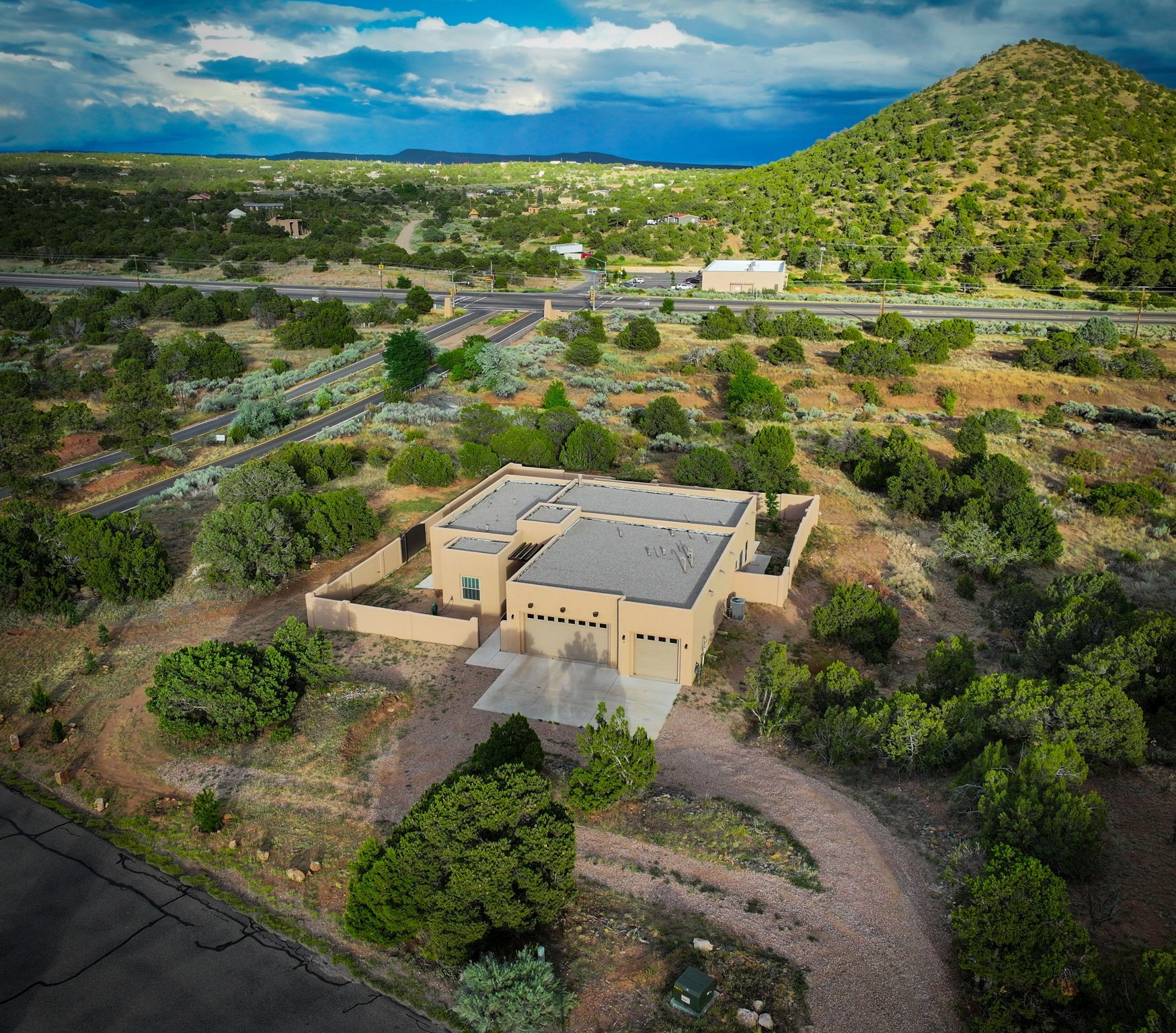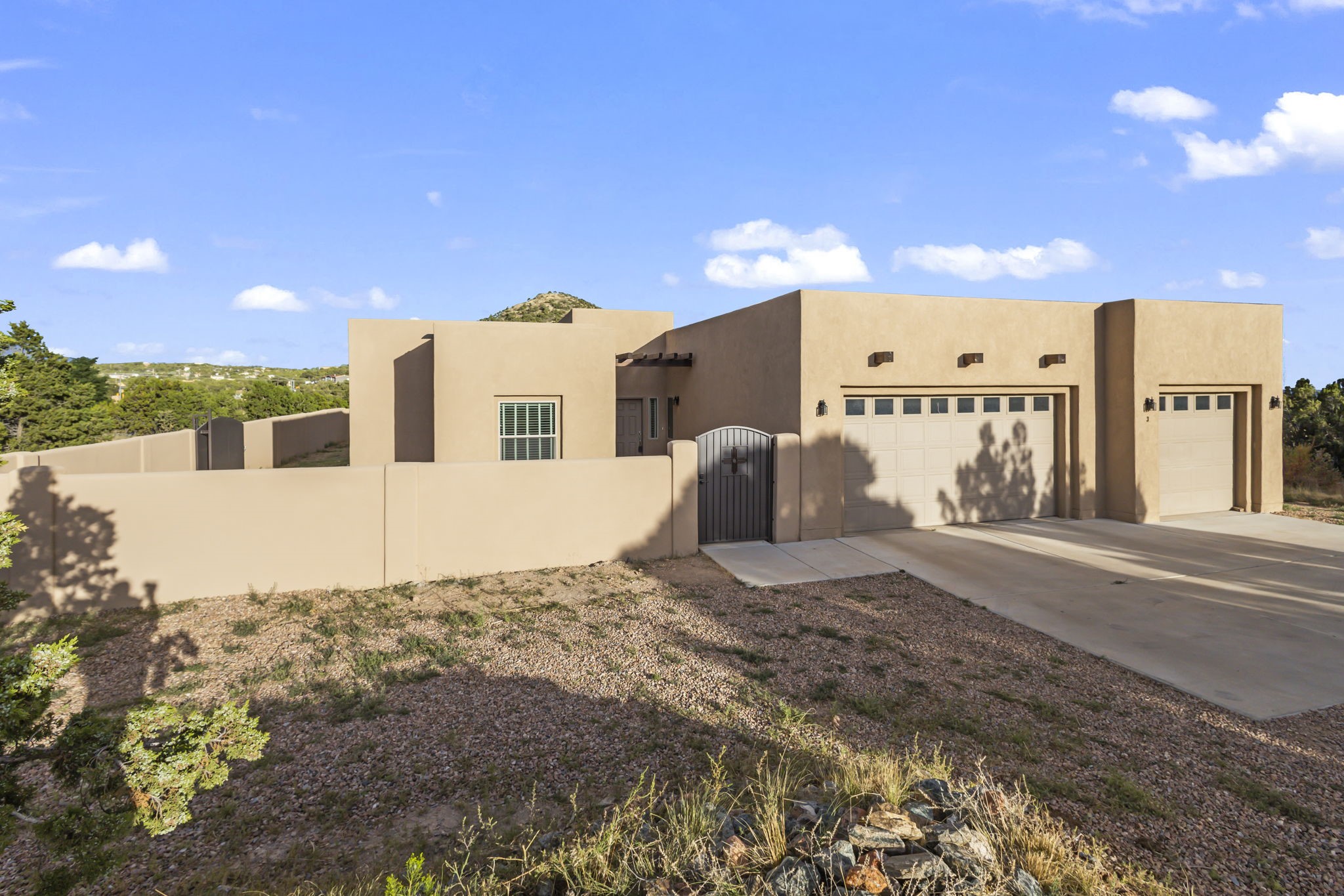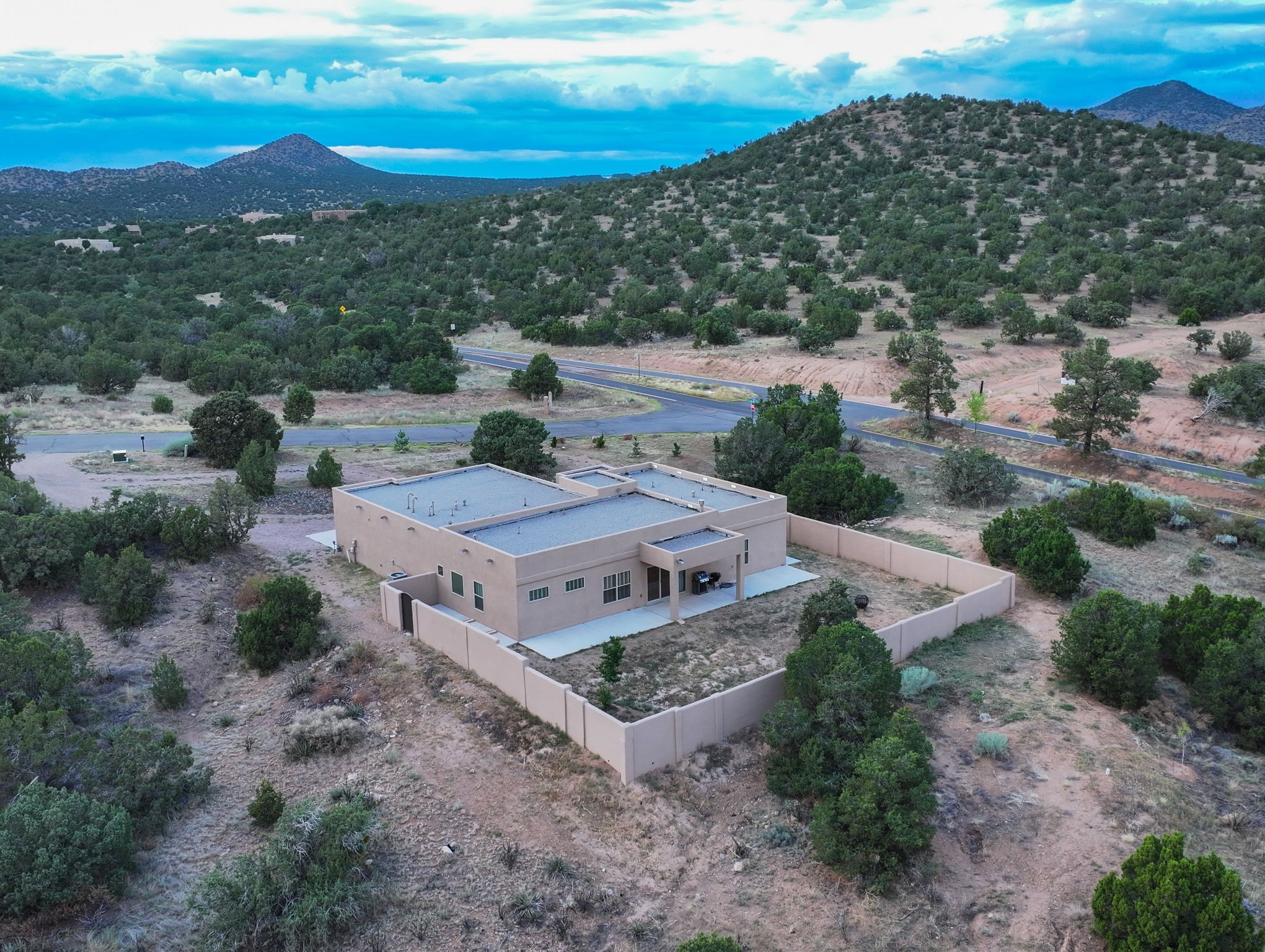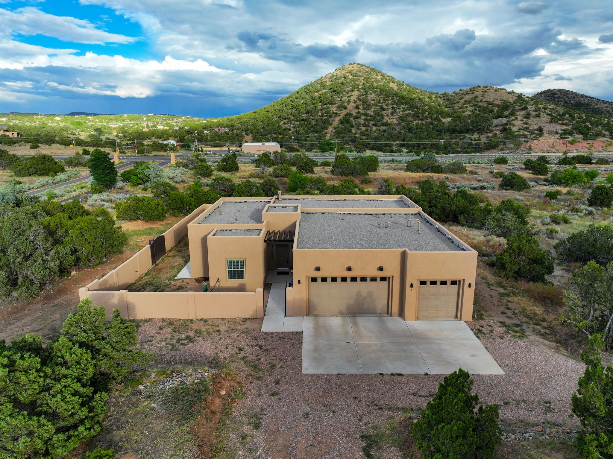 Built in 2019, this custom home near Eldorado of Santa Fe awaits! This bright and spacious home is situated on a 2.79 acre lot and conveniently located near I-25 and Hwy 285 in the beautiful Dos Griegos neighborhood. Features include 4 bedrooms, 3 full bathrooms, a home office/den, open concept living area, gas fireplace in the gathering room, and a chef's kitchen with large walk-in pantry, quartz countertops and stainless steel appliances. The primary bedroom is privately located and offers an ensuite bath with soaking tub, separate shower and a generous walk-in closet. Ample storage spaces throughout the home include a finished and extended 3 car garage. Bonus features: High-speed internet connection, central refrigerated air-conditioning, whole house water softener and reverse osmosis system at kitchen. Outdoors, the private courtyard with custom entry gates awaits your unique vision to create your own outdoor living spaces. Just a short 15 minute drive to Santa Fe. Come and take in the beautiful views that surround this home and make it yours! NMREL Owner/Broker.