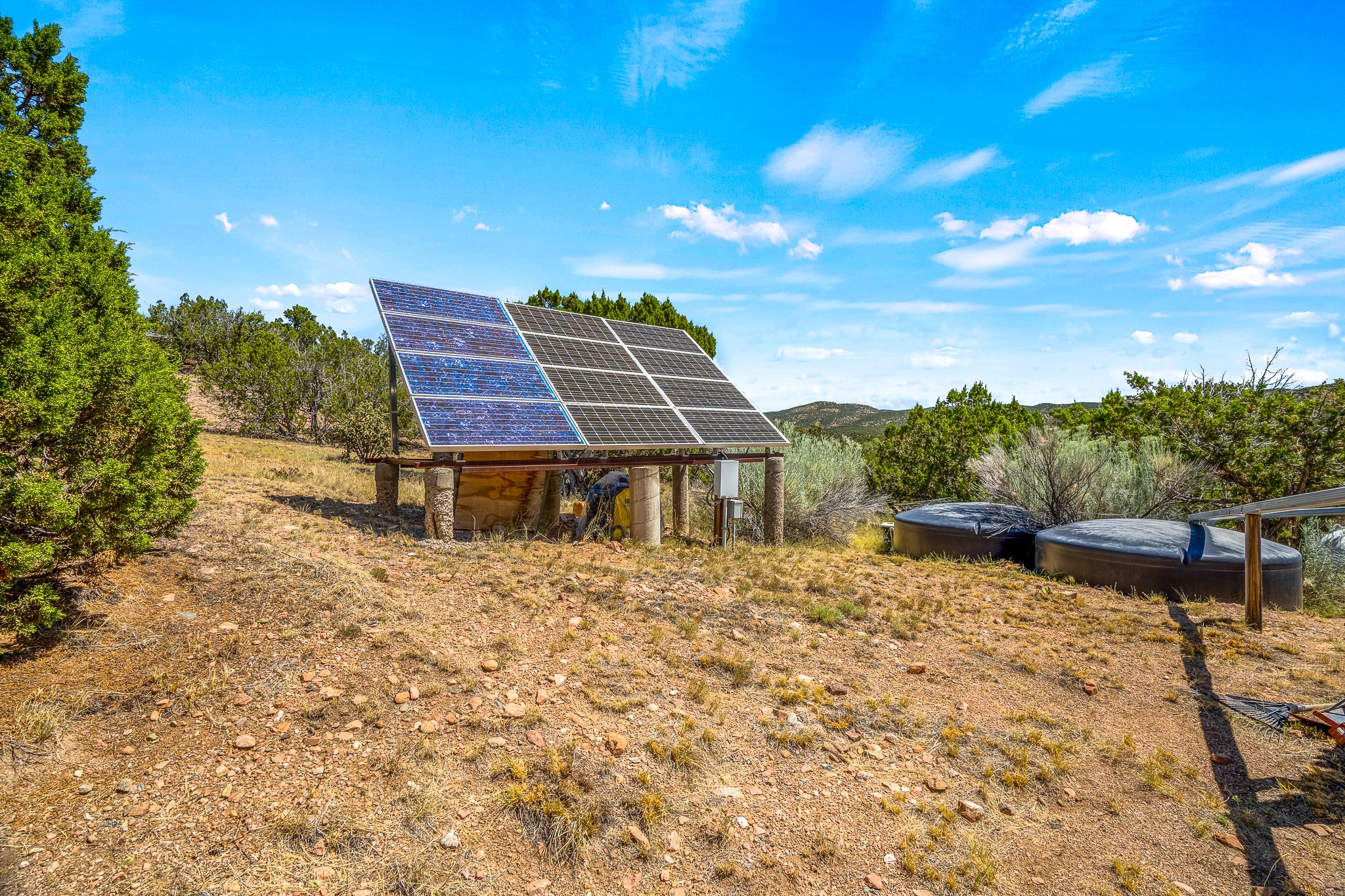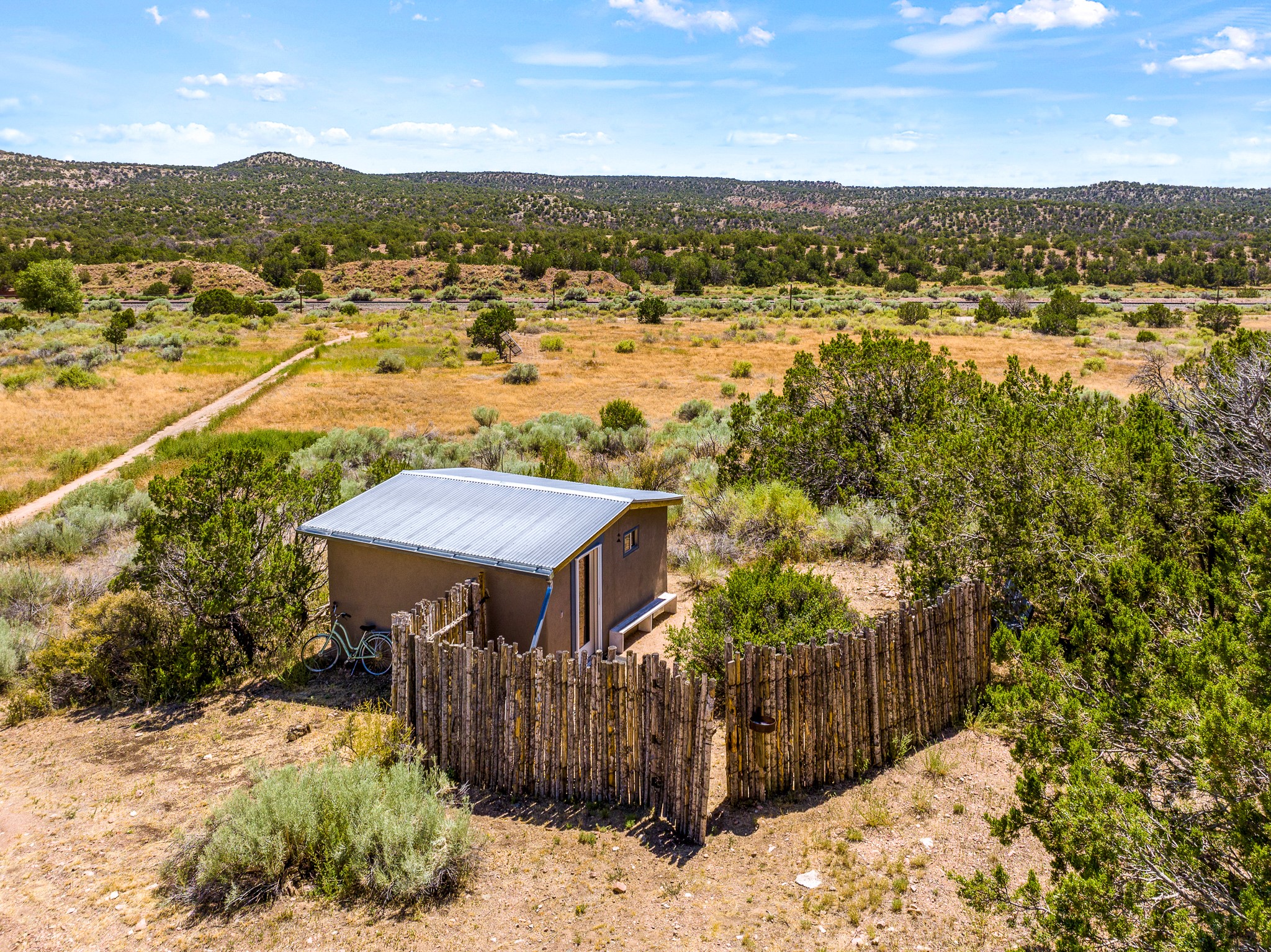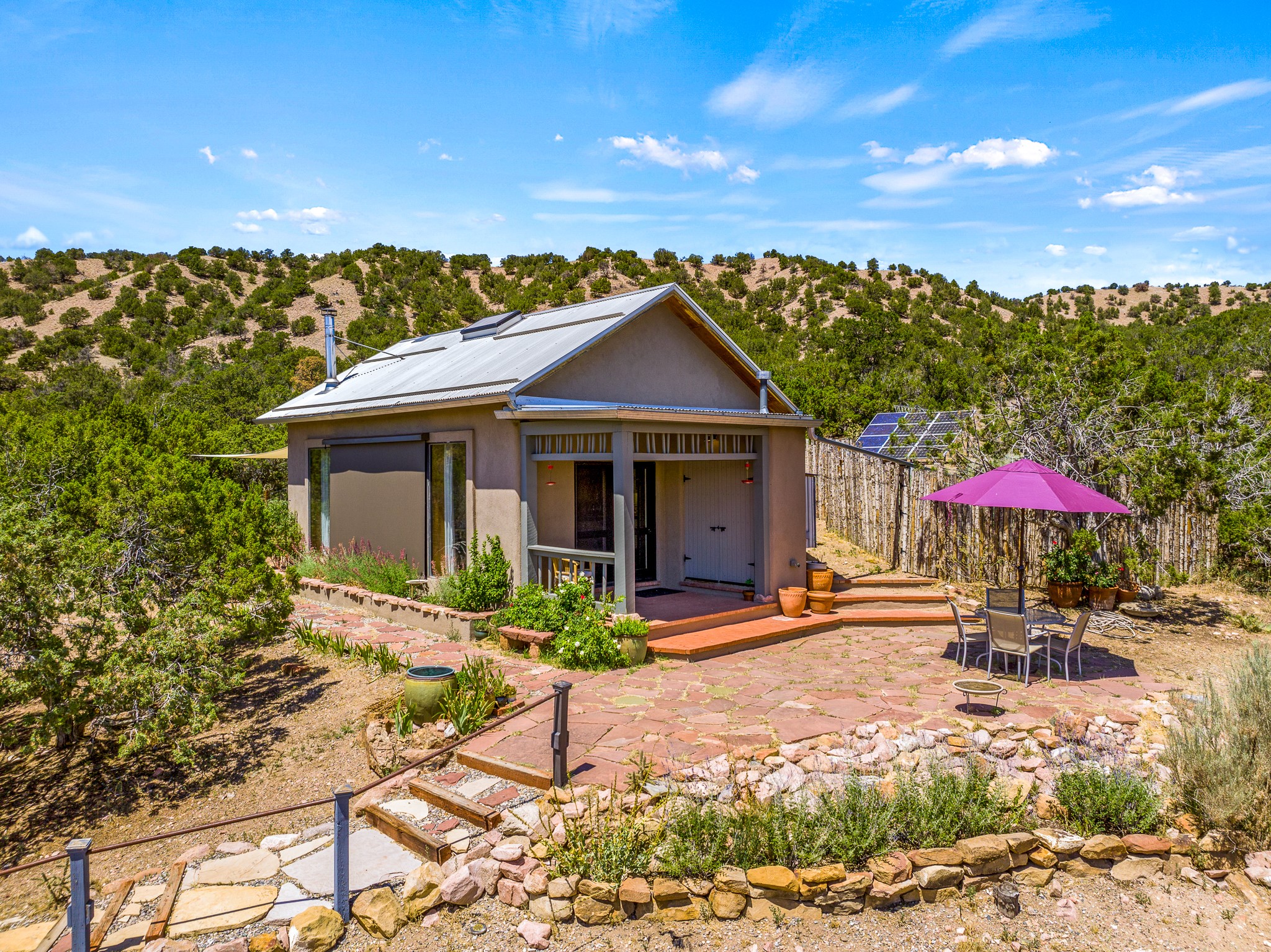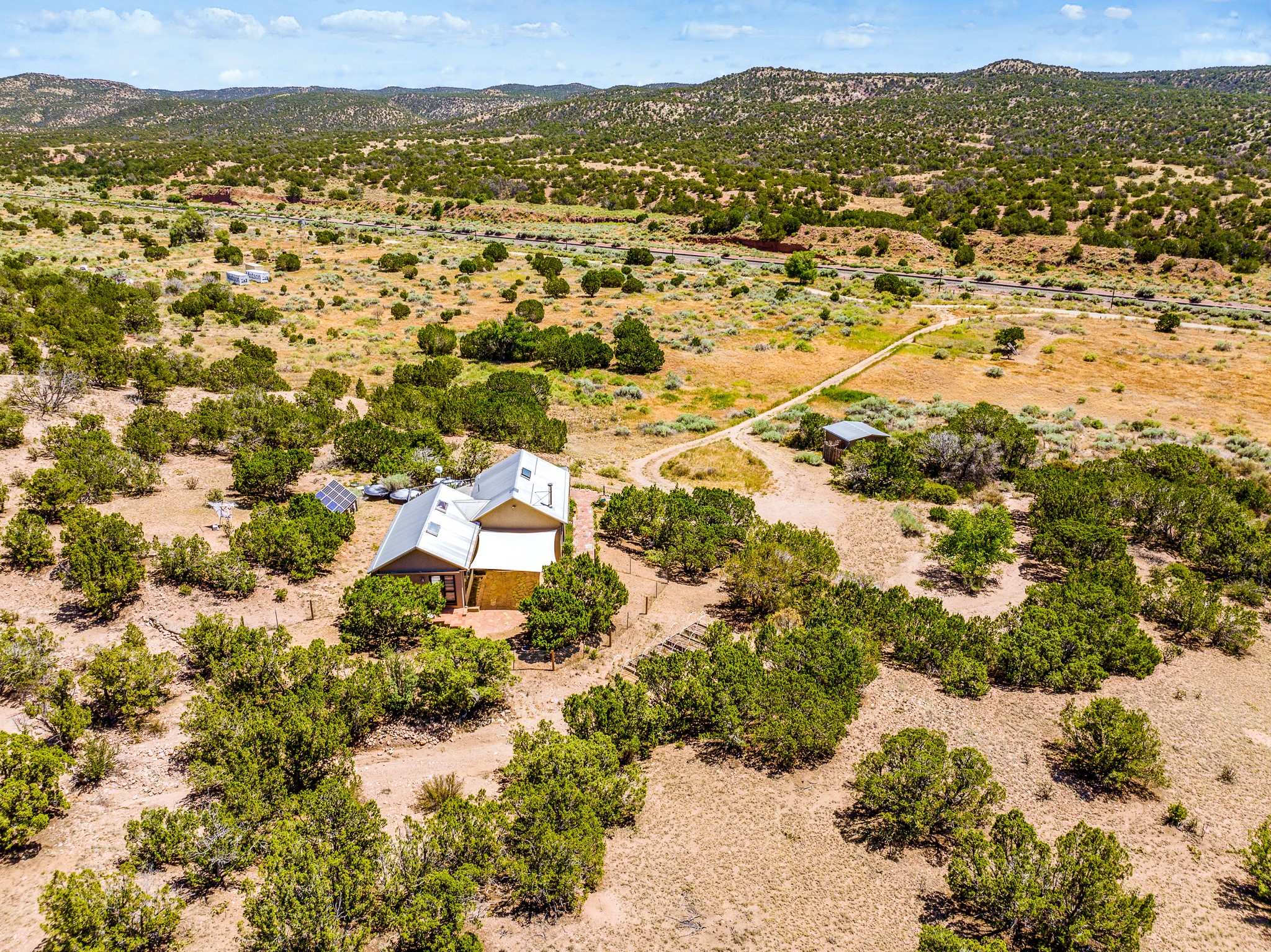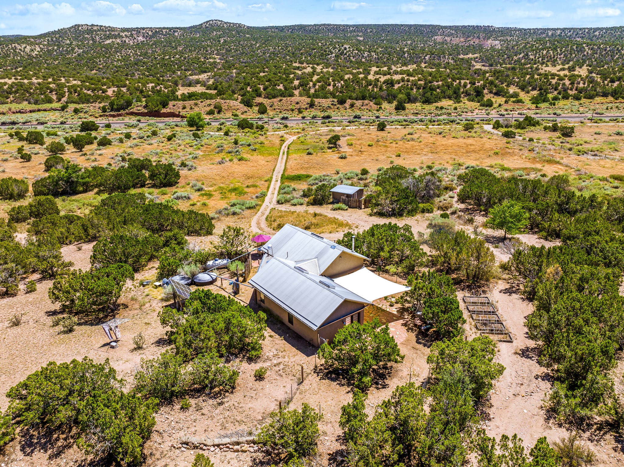 Gracious off-grid living in Lamy only 1 mile East of the Legal Tender and the heart of the Lamy village. This elegant 2bed/1 bath home with a separate studio is beautifully sited on 5 acres with broad views down Lamy's valley. Built in 2004by Karen Terry, a highly respected eco-friendly builder, this property is completely self-sufficient: a shared well (thewell is on the property of the owners of 73 Los Hornos), solar-powered with a 2+ year old battery bank, E-creteconstruction, 3 hand-poured trombe walls for warmth in the winter, 3 cisterns for water catchment, and a Morso wood stove in the beautiful main living area. The main house has an open concept living/dining/kitchen with high ceilings andskylights in every room. Brick flooring throughout the house. Established native pollinator plant beds. There are 3wonderful outdoor areas and 5 raised vegetable garden beds. The art studio is separate and has also been used as a guest casita/office. This special property is 25 minutes to Santa Fe's Plaza and yet another world and time period away.