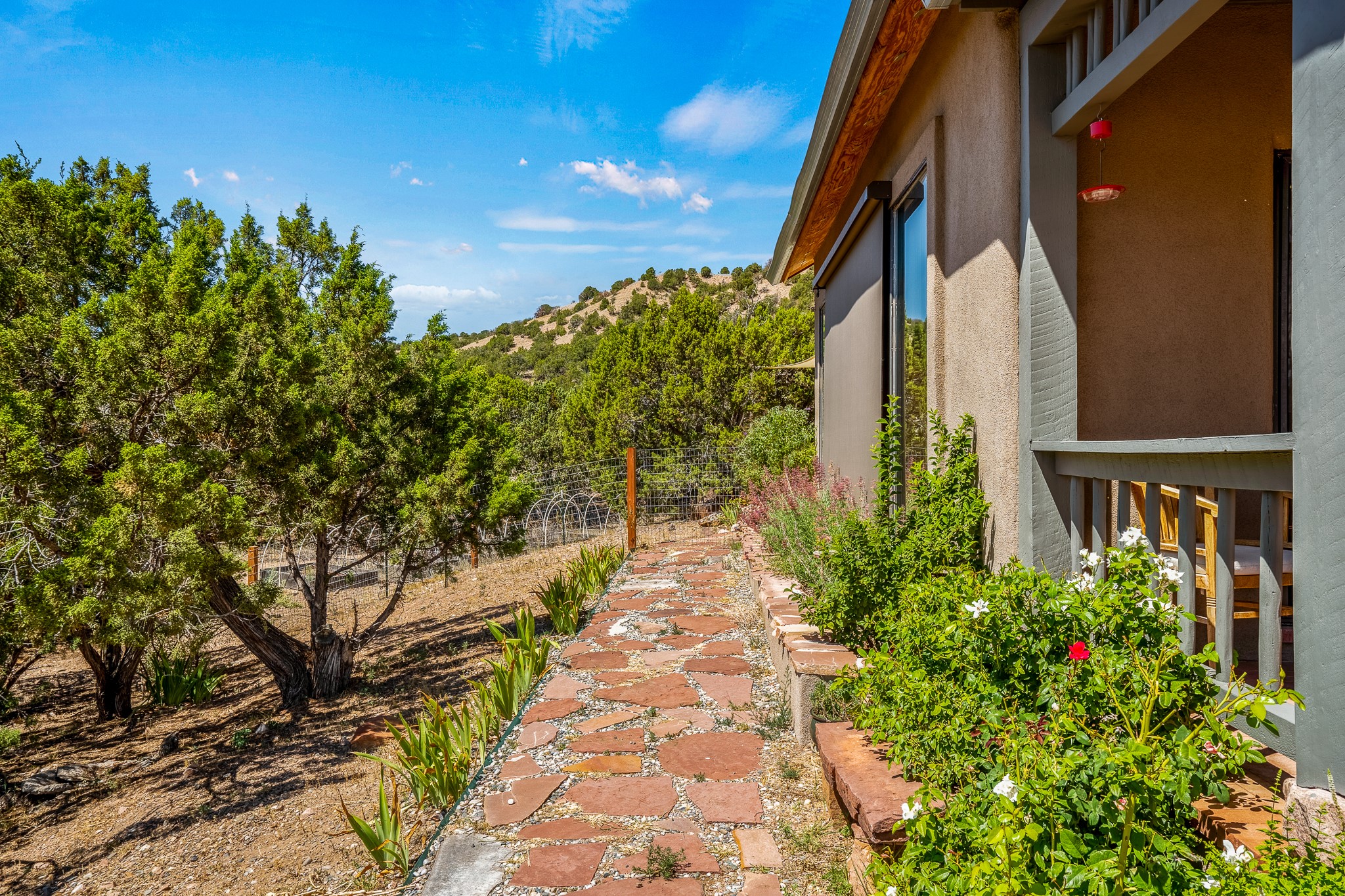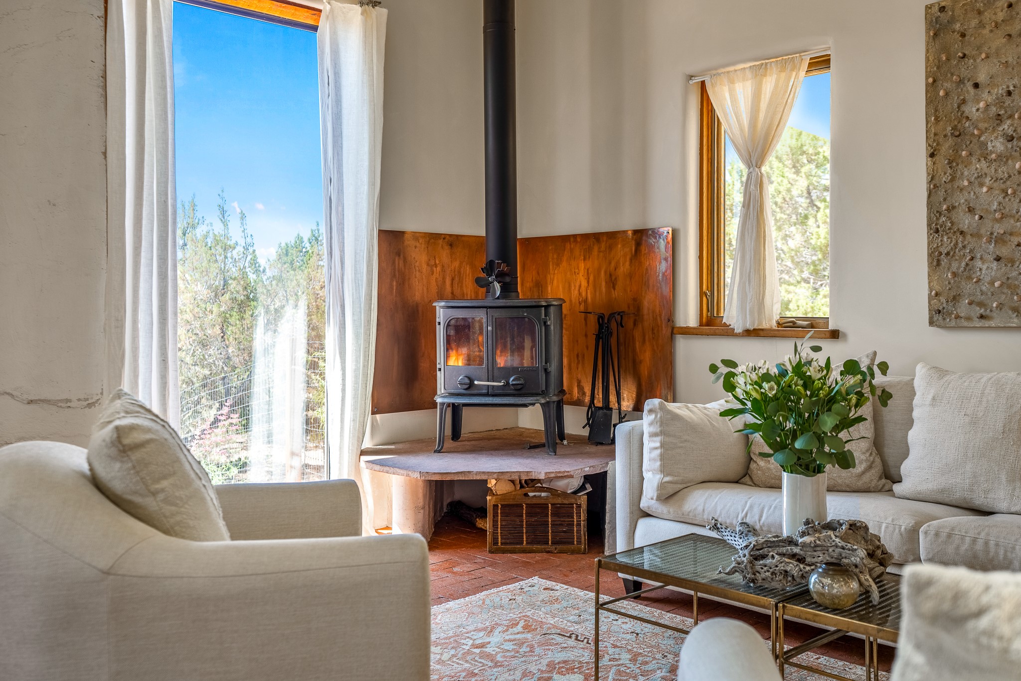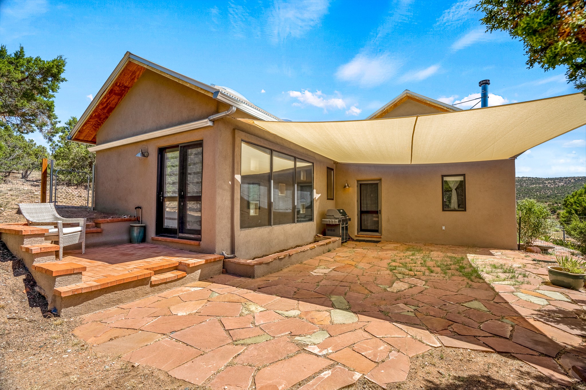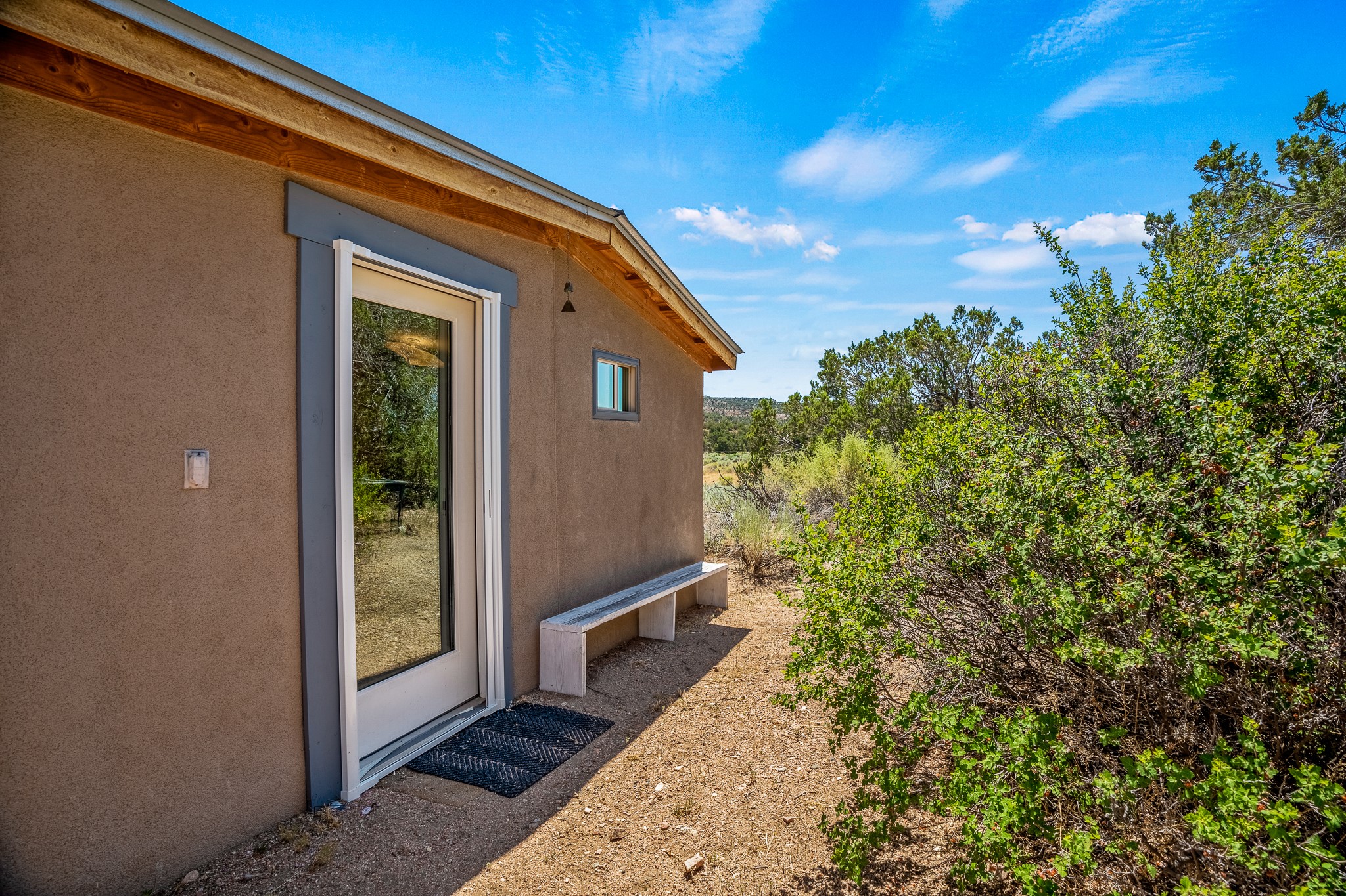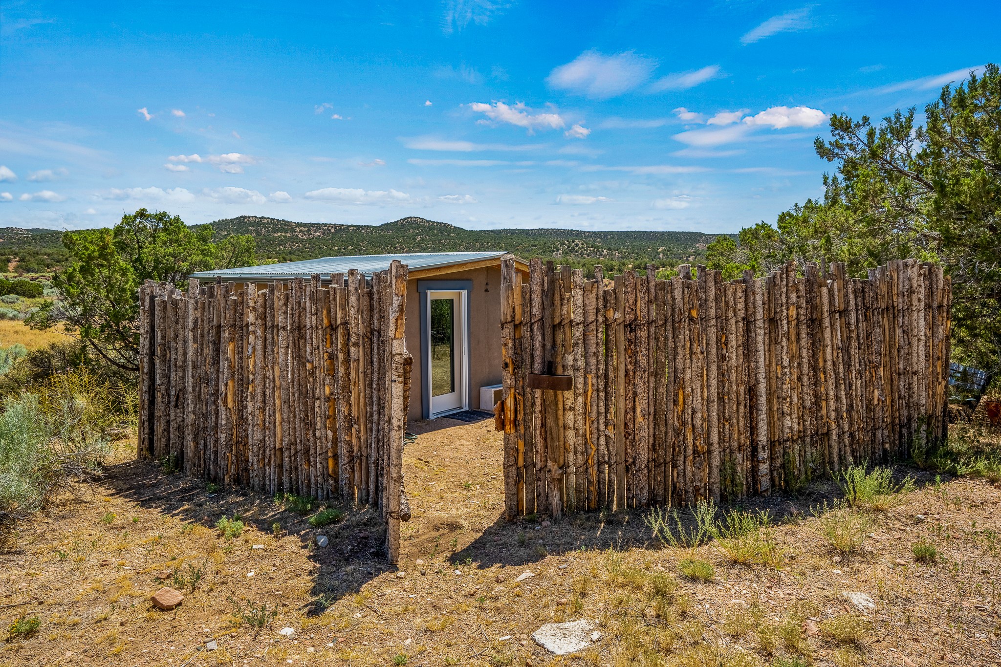 Gracious off-grid living in Lamy only 1 mile East of the Legal Tender and the heart of the Lamy village. This elegant 2bed/1 bath home with a separate studio is beautifully sited on 5 acres with broad views down Lamy's valley. Built in 2004by Karen Terry, a highly respected eco-friendly builder, this property is completely self-sufficient: a shared well (thewell is on the property of the owners of 73 Los Hornos), solar-powered with a 2+ year old battery bank, E-creteconstruction, 3 hand-poured trombe walls for warmth in the winter, 3 cisterns for water catchment, and a Morso wood stove in the beautiful main living area. The main house has an open concept living/dining/kitchen with high ceilings andskylights in every room. Brick flooring throughout the house. Established native pollinator plant beds. There are 3wonderful outdoor areas and 5 raised vegetable garden beds. The art studio is separate and has also been used as a guest casita/office. This special property is 25 minutes to Santa Fe's Plaza and yet another world and time period away.