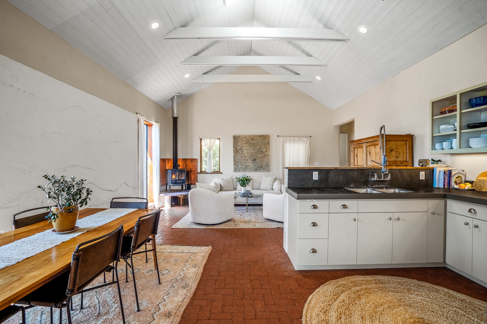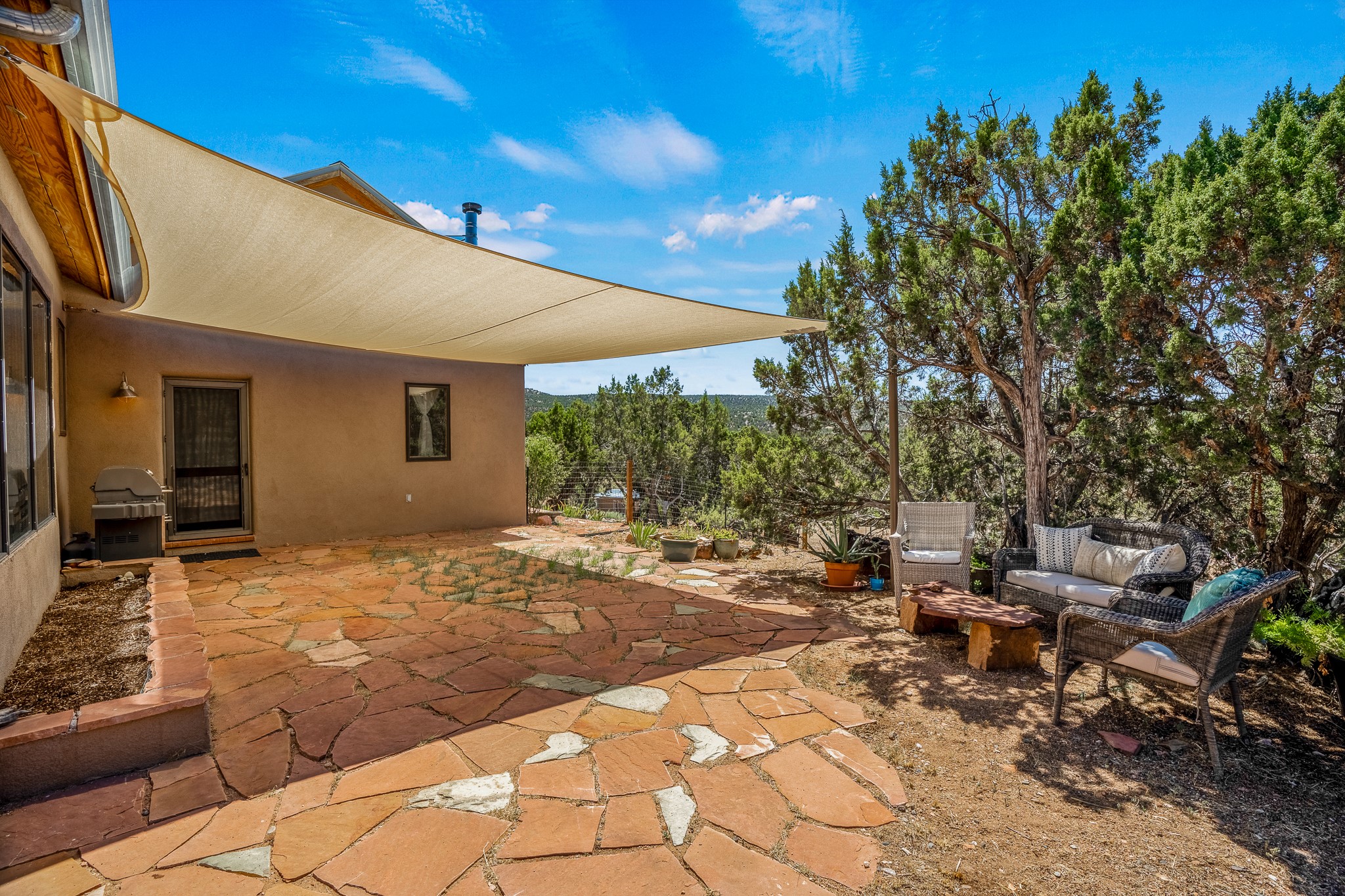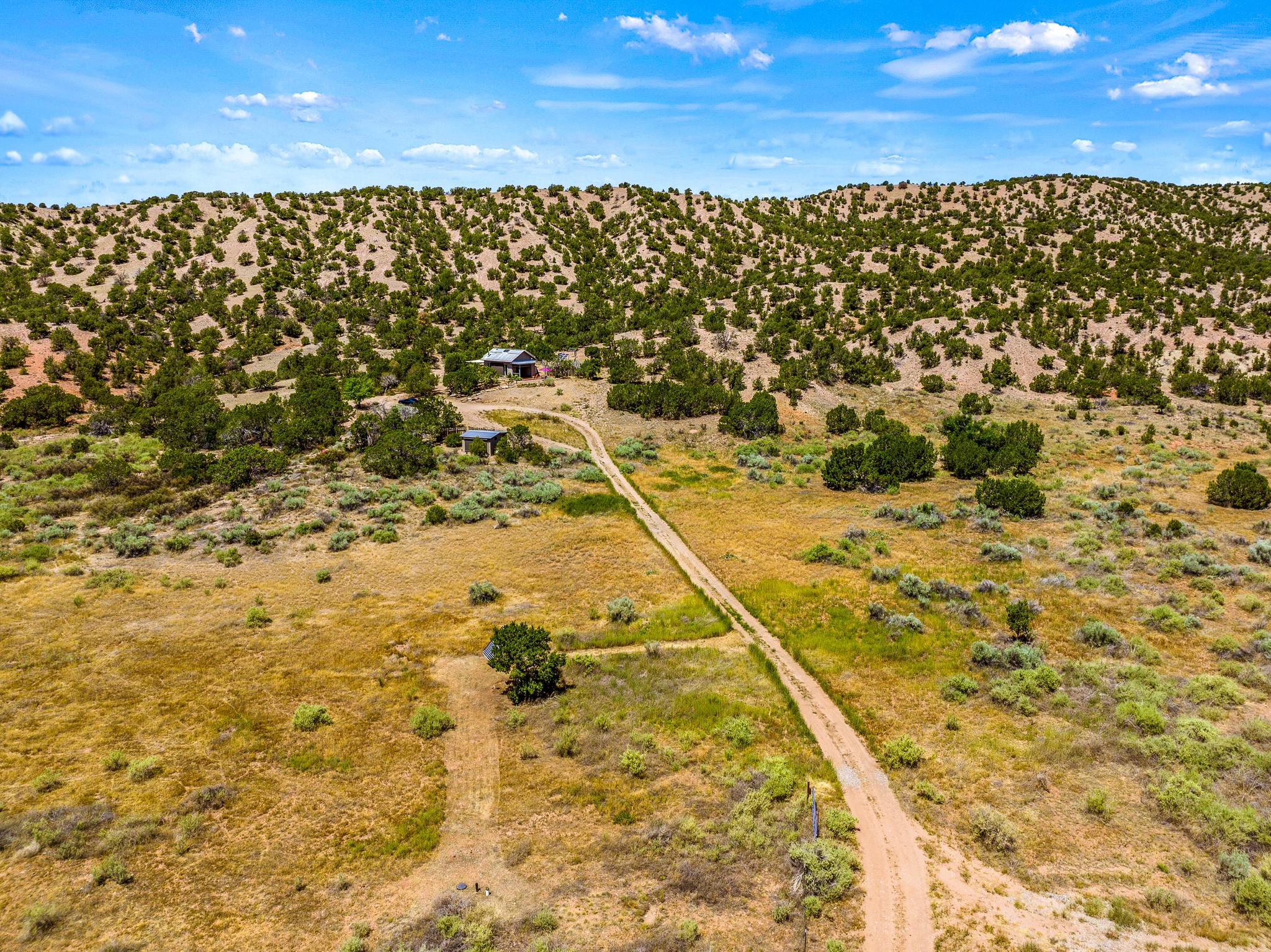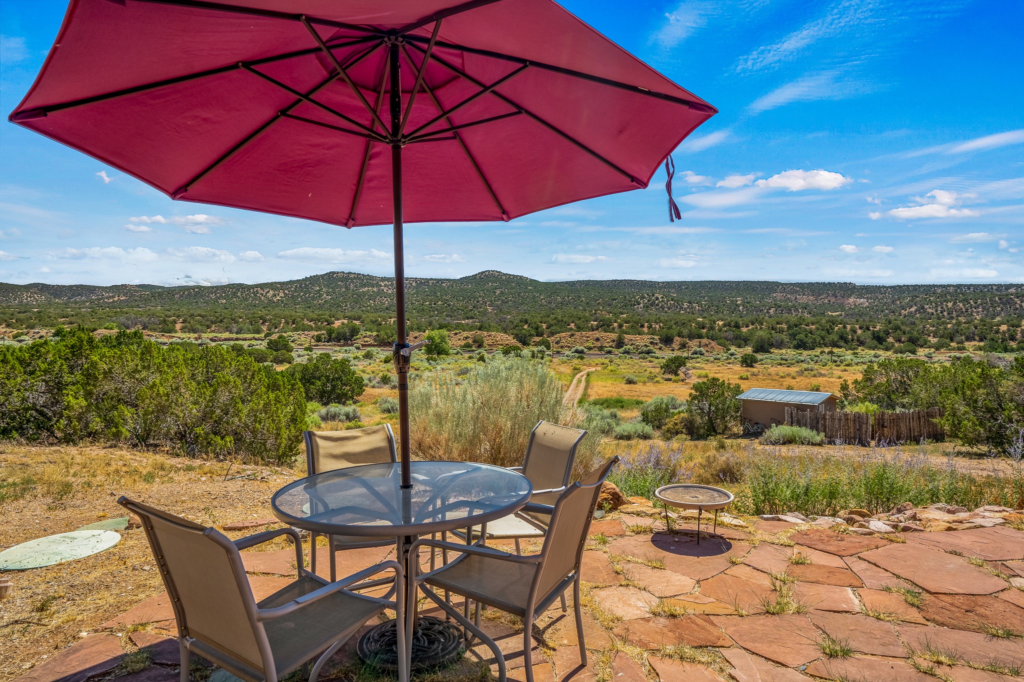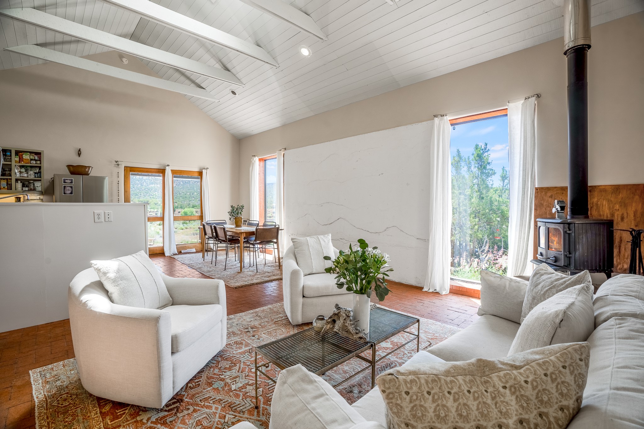 Gracious off-grid living in Lamy only 1 mile East of the Legal Tender and the heart of the Lamy village. This elegant 2bed/1 bath home with a separate studio is beautifully sited on 5 acres with broad views down Lamy's valley. Built in 2004by Karen Terry, a highly respected eco-friendly builder, this property is completely self-sufficient: a shared well (thewell is on the property of the owners of 73 Los Hornos), solar-powered with a 2+ year old battery bank, E-creteconstruction, 3 hand-poured trombe walls for warmth in the winter, 3 cisterns for water catchment, and a Morso wood stove in the beautiful main living area. The main house has an open concept living/dining/kitchen with high ceilings andskylights in every room. Brick flooring throughout the house. Established native pollinator plant beds. There are 3wonderful outdoor areas and 5 raised vegetable garden beds. The art studio is separate and has also been used as a guest casita/office. This special property is 25 minutes to Santa Fe's Plaza and yet another world and time period away.