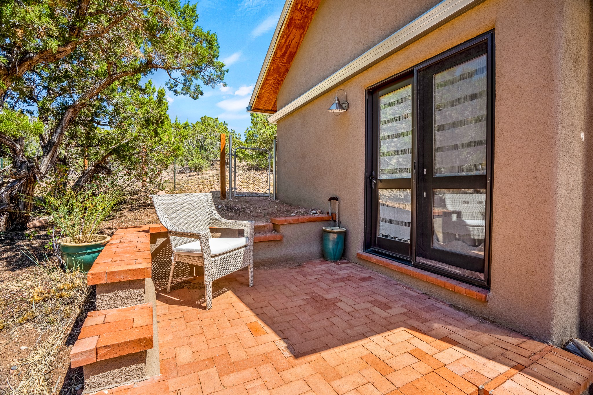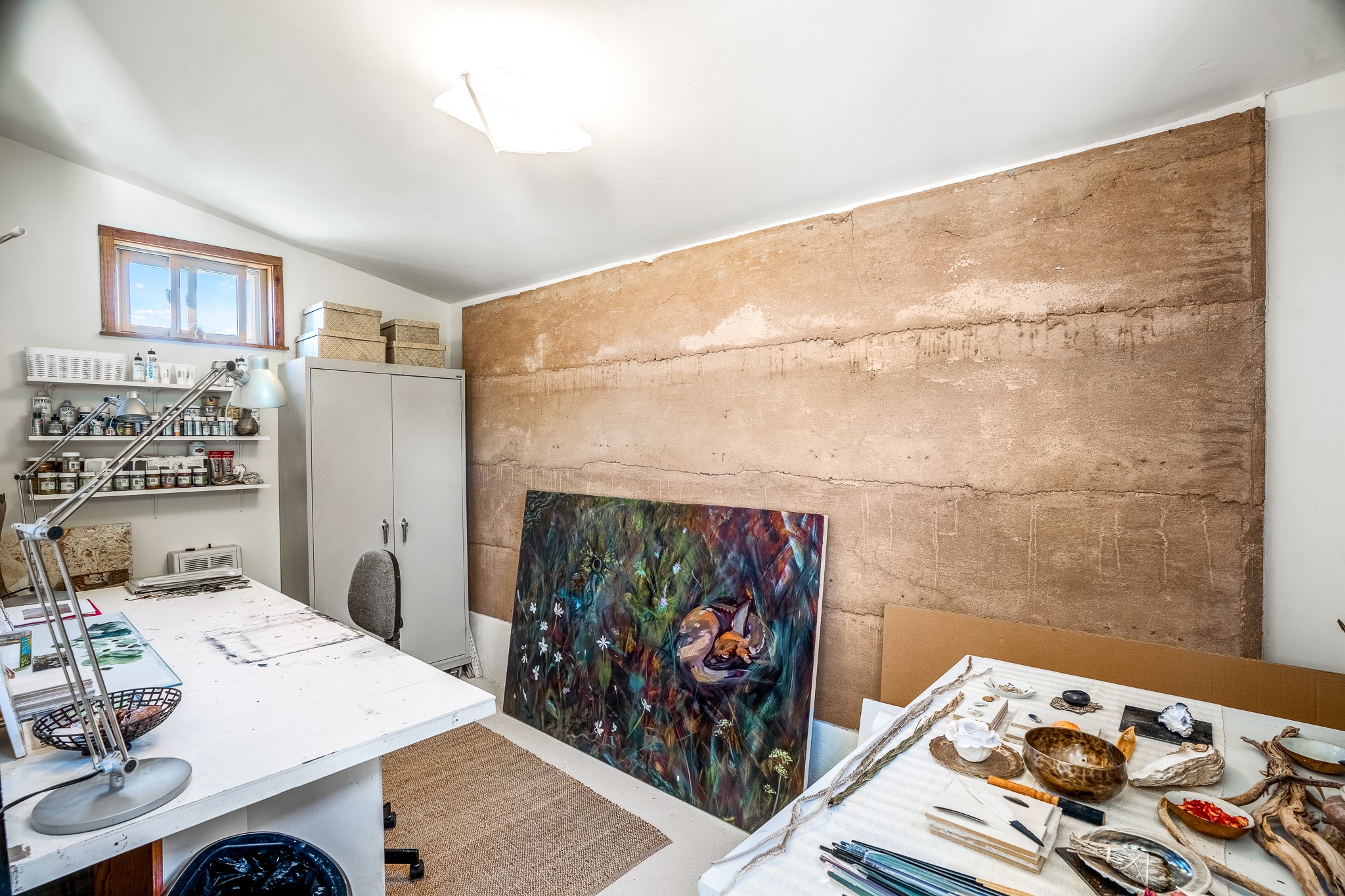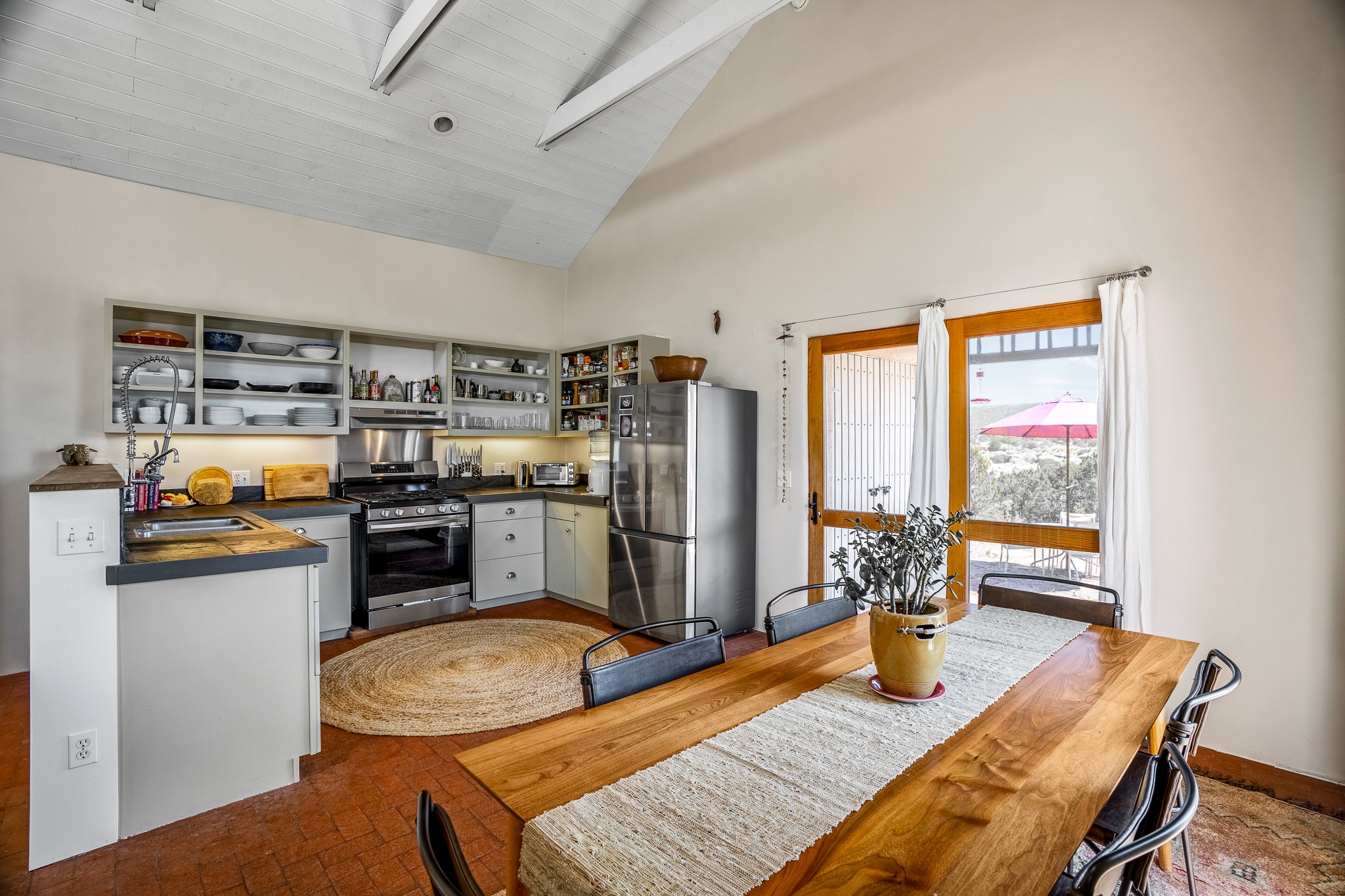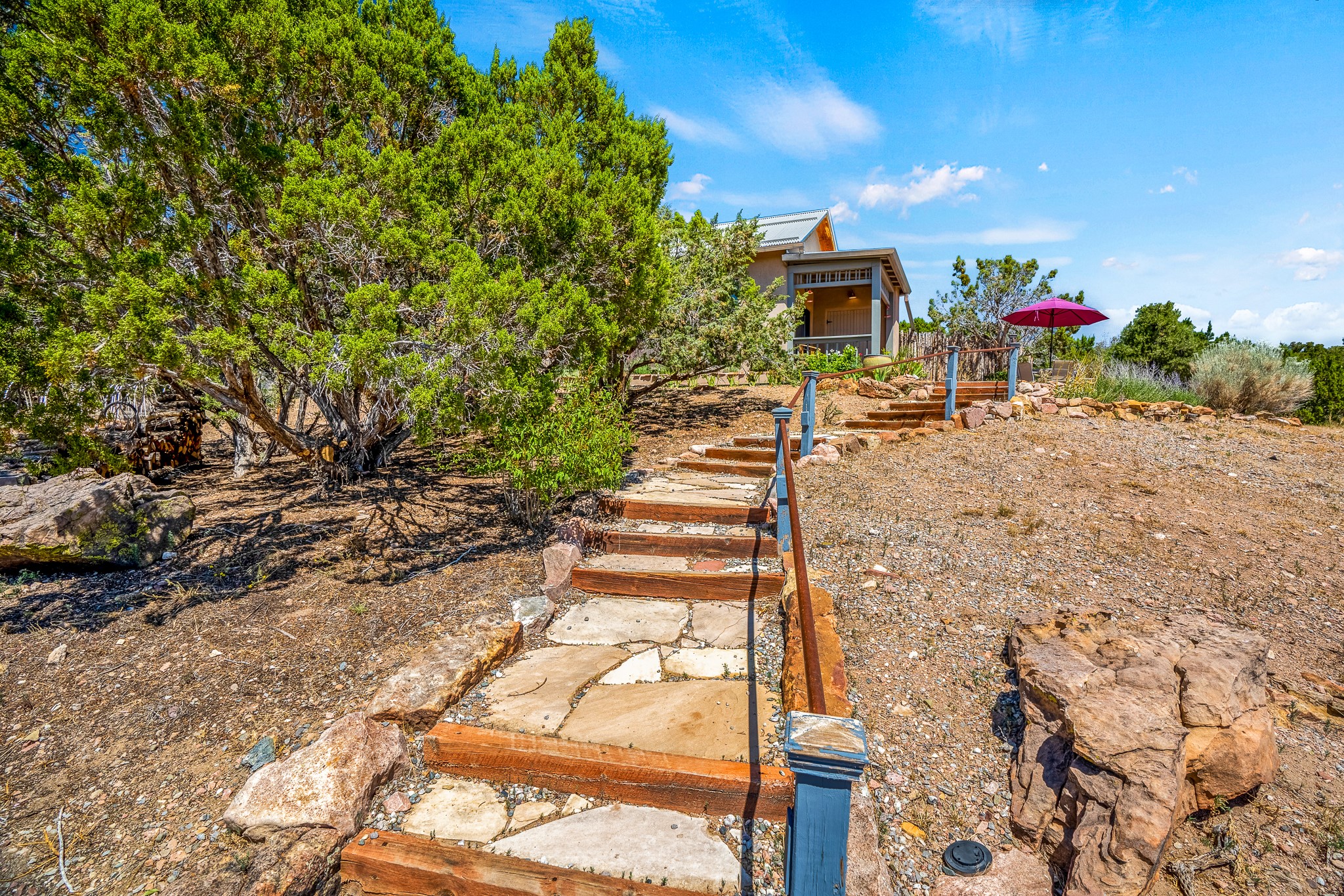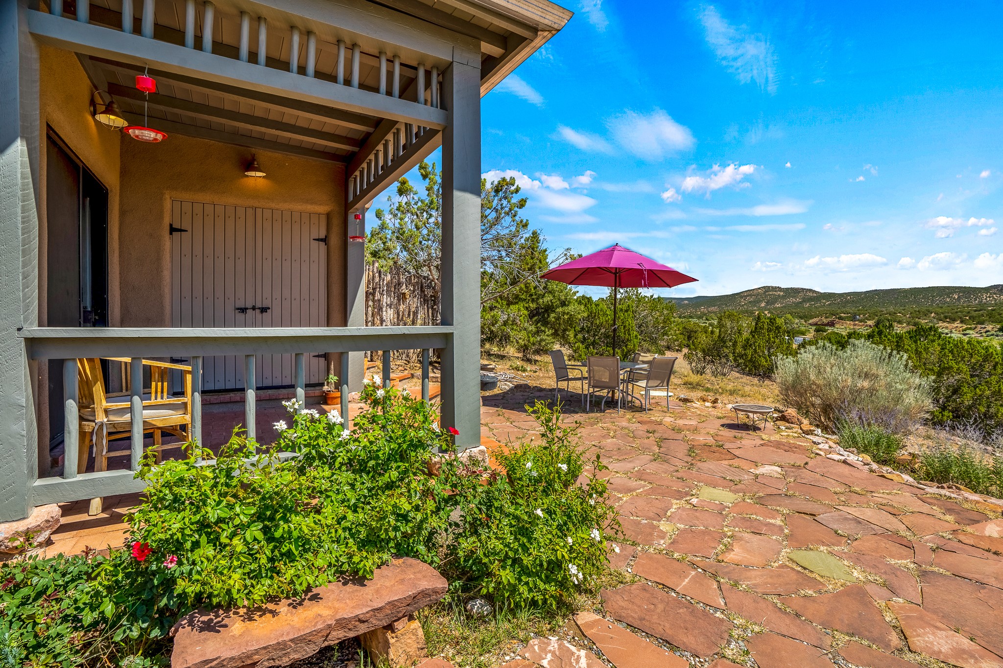 Gracious off-grid living in Lamy only 1 mile East of the Legal Tender and the heart of the Lamy village. This elegant 2bed/1 bath home with a separate studio is beautifully sited on 5 acres with broad views down Lamy's valley. Built in 2004by Karen Terry, a highly respected eco-friendly builder, this property is completely self-sufficient: a shared well (thewell is on the property of the owners of 73 Los Hornos), solar-powered with a 2+ year old battery bank, E-creteconstruction, 3 hand-poured trombe walls for warmth in the winter, 3 cisterns for water catchment, and a Morso wood stove in the beautiful main living area. The main house has an open concept living/dining/kitchen with high ceilings andskylights in every room. Brick flooring throughout the house. Established native pollinator plant beds. There are 3wonderful outdoor areas and 5 raised vegetable garden beds. The art studio is separate and has also been used as a guest casita/office. This special property is 25 minutes to Santa Fe's Plaza and yet another world and time period away.
