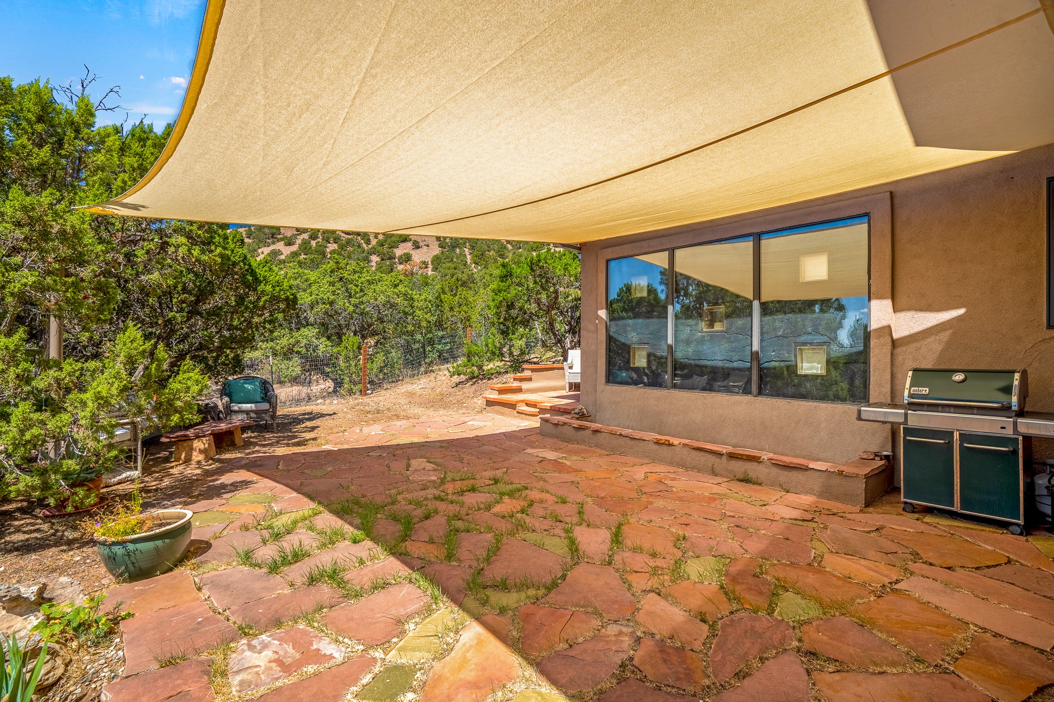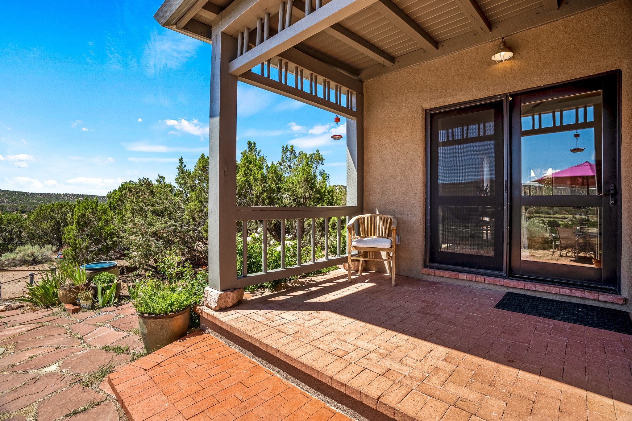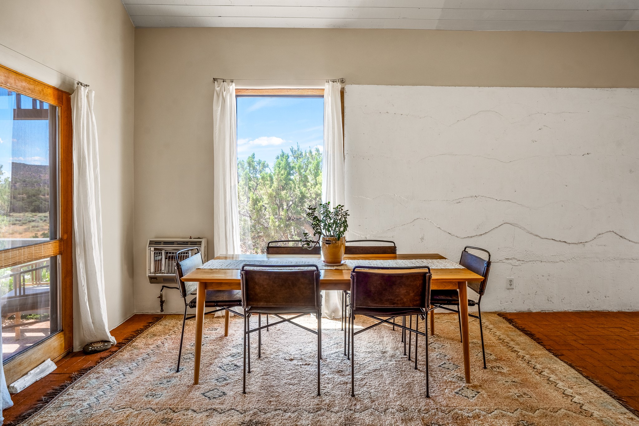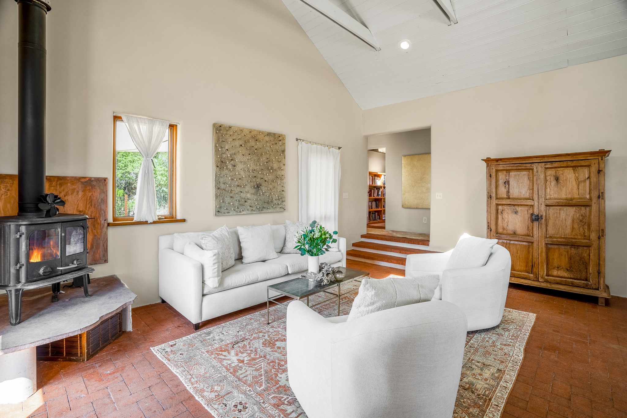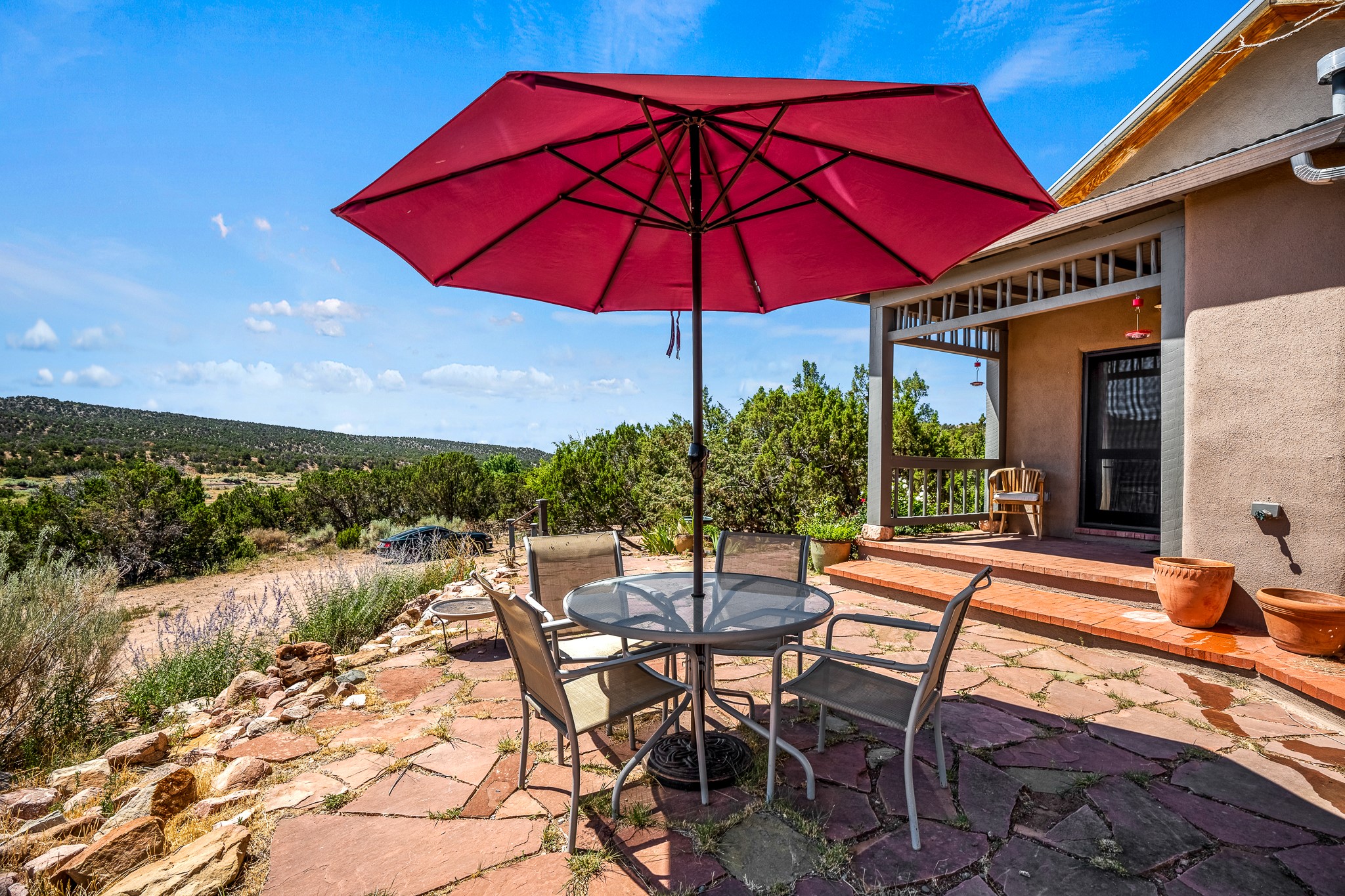 Gracious off-grid living in Lamy only 1 mile East of the Legal Tender and the heart of the Lamy village. This elegant 2bed/1 bath home with a separate studio is beautifully sited on 5 acres with broad views down Lamy's valley. Built in 2004by Karen Terry, a highly respected eco-friendly builder, this property is completely self-sufficient: a shared well (thewell is on the property of the owners of 73 Los Hornos), solar-powered with a 2+ year old battery bank, E-creteconstruction, 3 hand-poured trombe walls for warmth in the winter, 3 cisterns for water catchment, and a Morso wood stove in the beautiful main living area. The main house has an open concept living/dining/kitchen with high ceilings andskylights in every room. Brick flooring throughout the house. Established native pollinator plant beds. There are 3wonderful outdoor areas and 5 raised vegetable garden beds. The art studio is separate and has also been used as a guest casita/office. This special property is 25 minutes to Santa Fe's Plaza and yet another world and time period away.