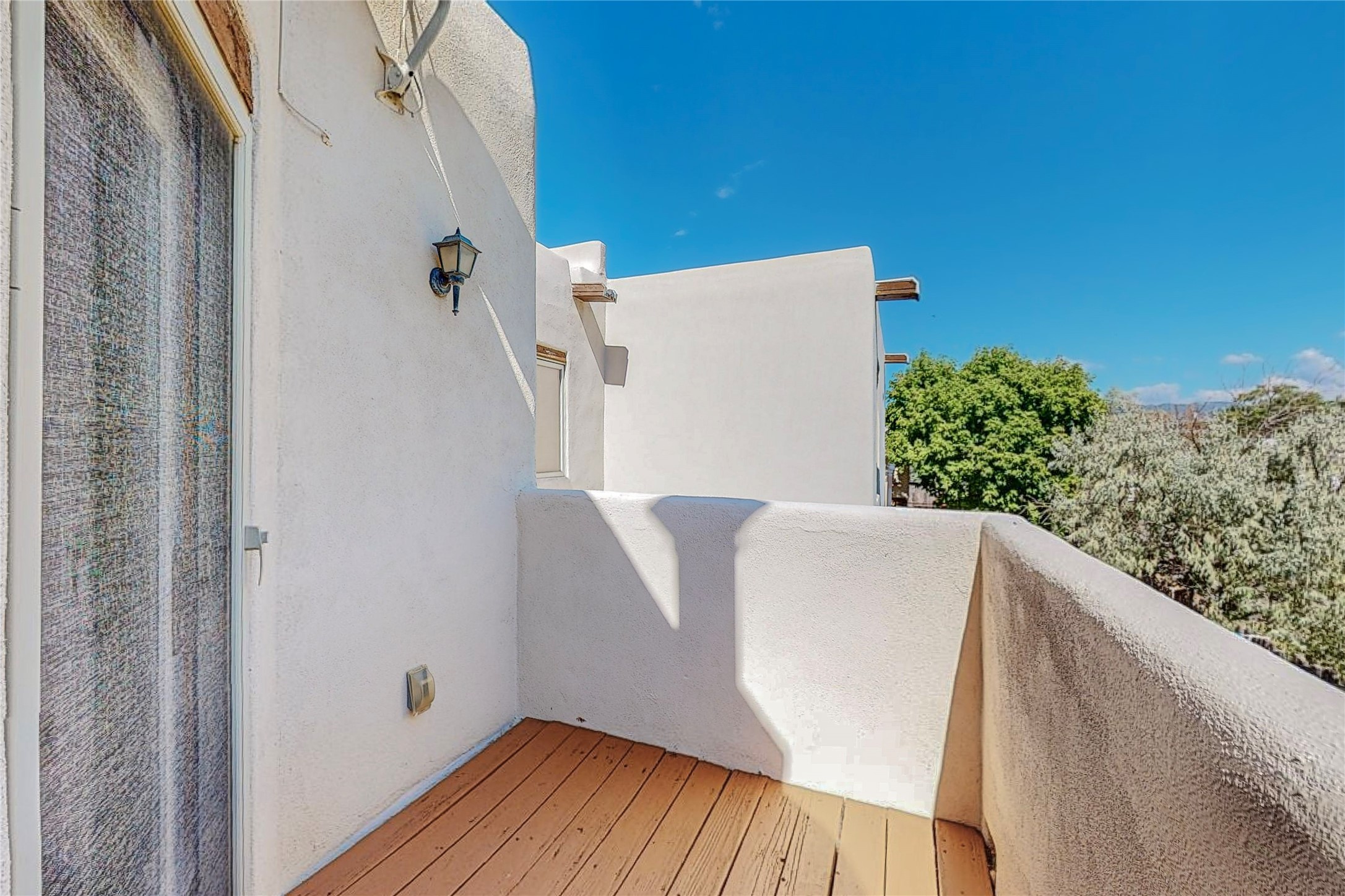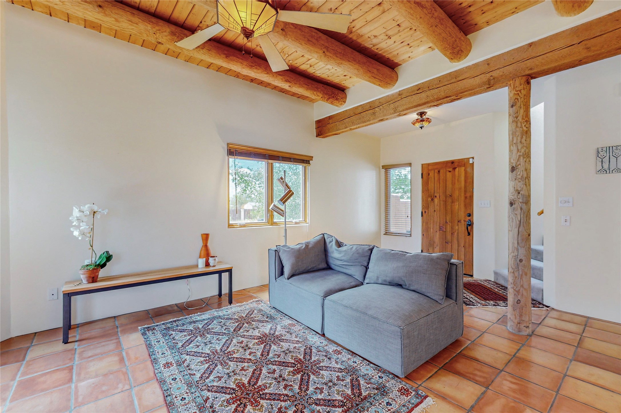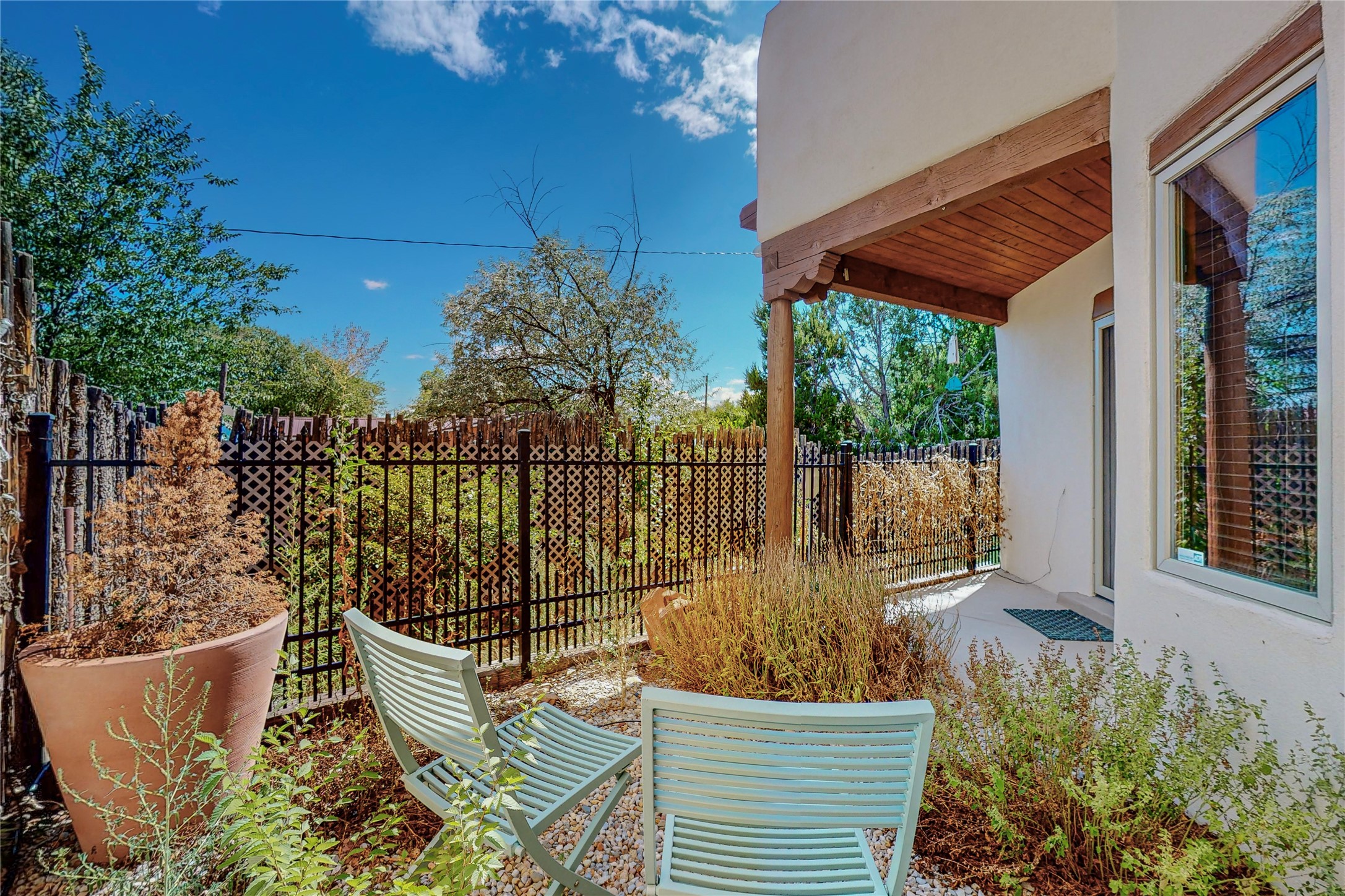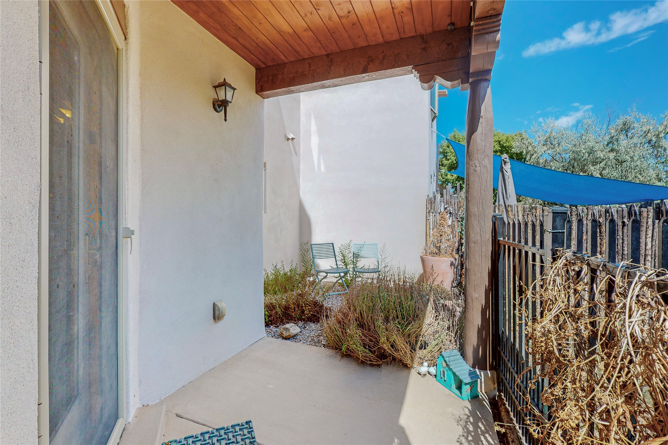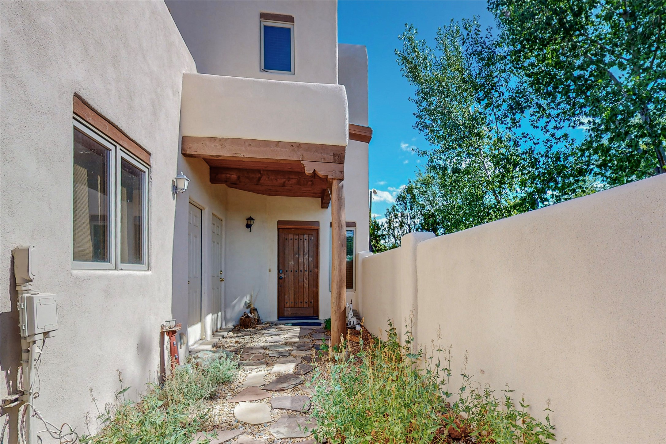 Don't miss the beautiful end unit, it overlooks green space with aspen. Full of Santa Fe Charm- Saltillo tile floors throughout the ground floor, kiva fireplaces and vigas. Bathrooms have beautiful traditional tile. Upstairs there are 2 decks, the larger one becomes an outdoor room in spring, summer and fall with beautiful views of the Sangre de Cristo and Jemez Mountains.2 car garage, with a small terraced garden off the living room.