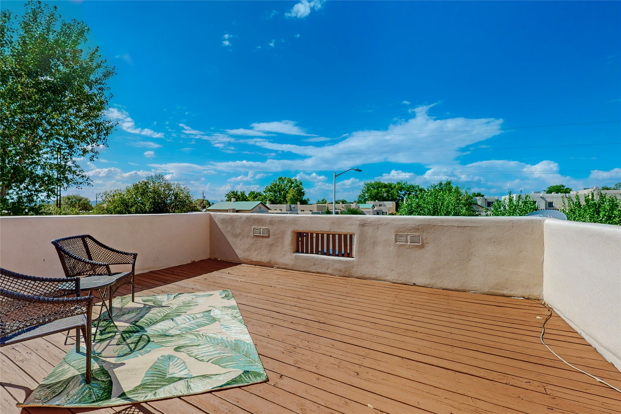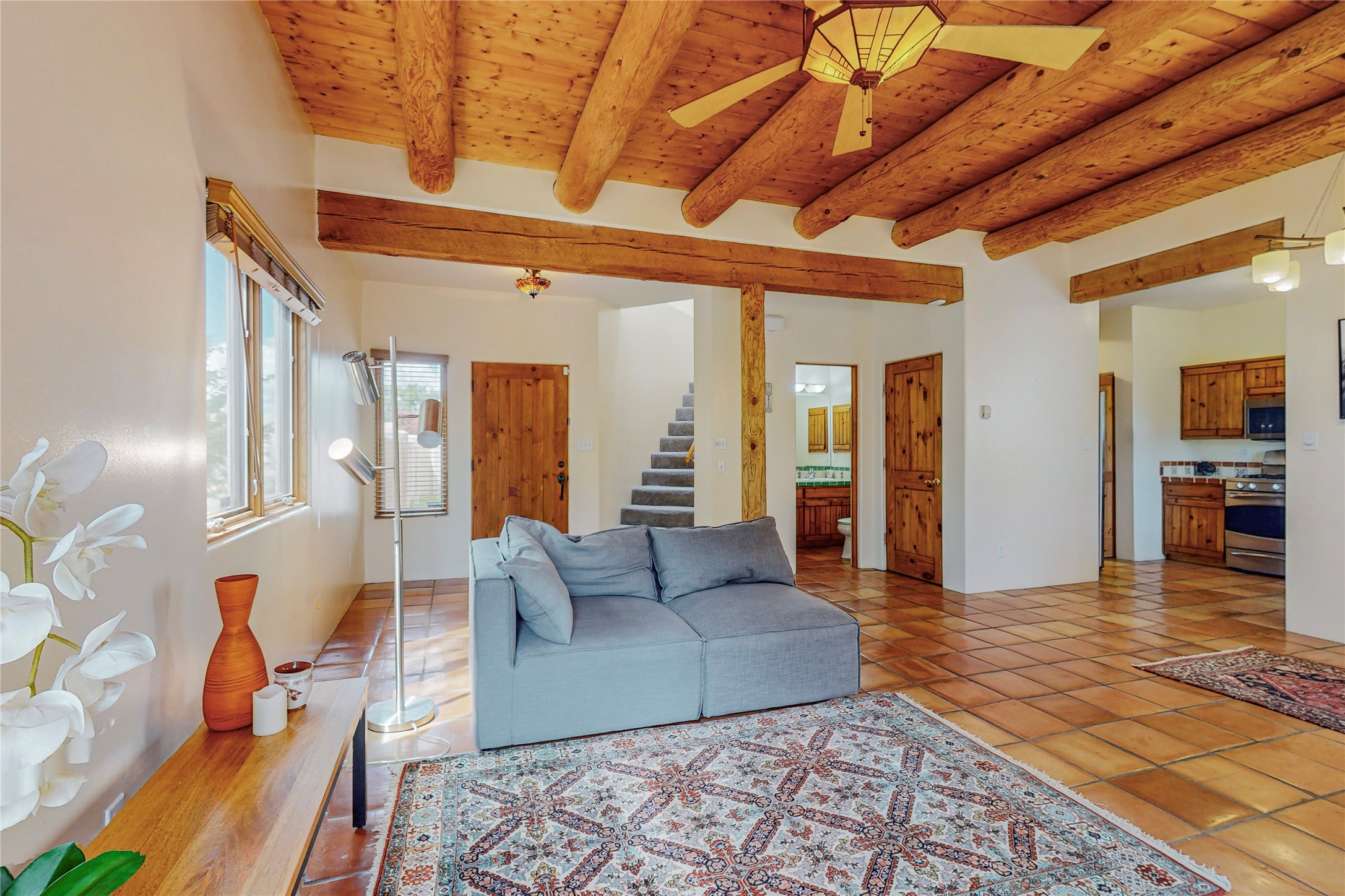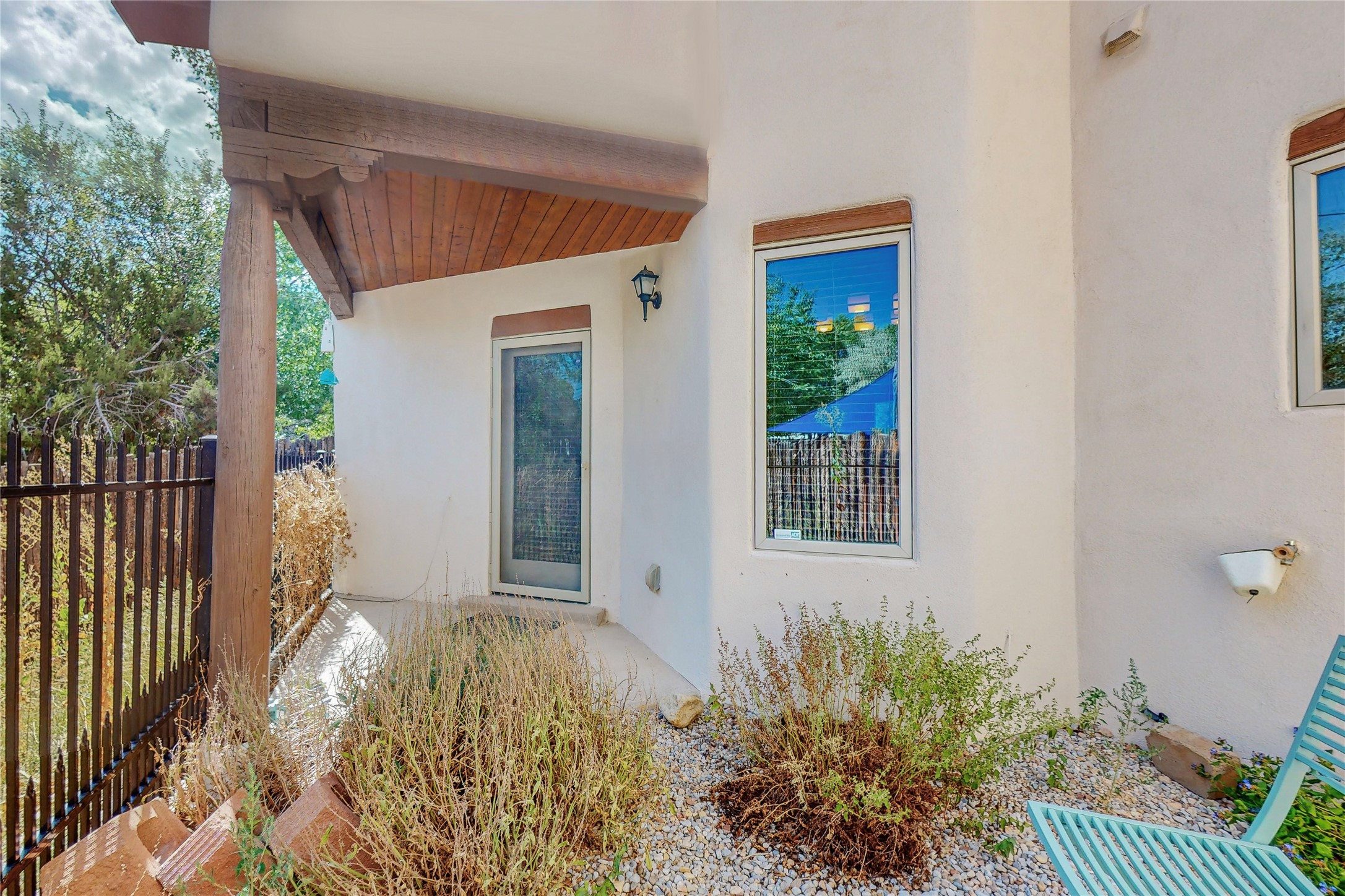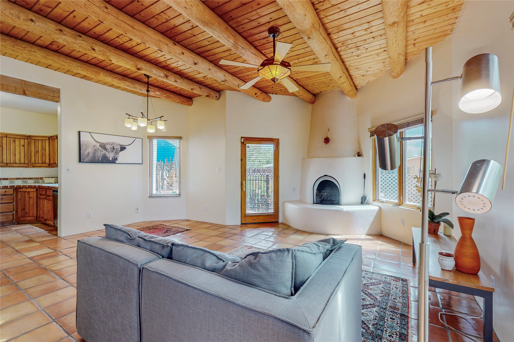 Don't miss the beautiful end unit, it overlooks green space with aspen. Full of Santa Fe Charm- Saltillo tile floors throughout the ground floor, kiva fireplaces and vigas. Bathrooms have beautiful traditional tile. Upstairs there are 2 decks, the larger one becomes an outdoor room in spring, summer and fall with beautiful views of the Sangre de Cristo and Jemez Mountains.2 car garage, with a small terraced garden off the living room.
