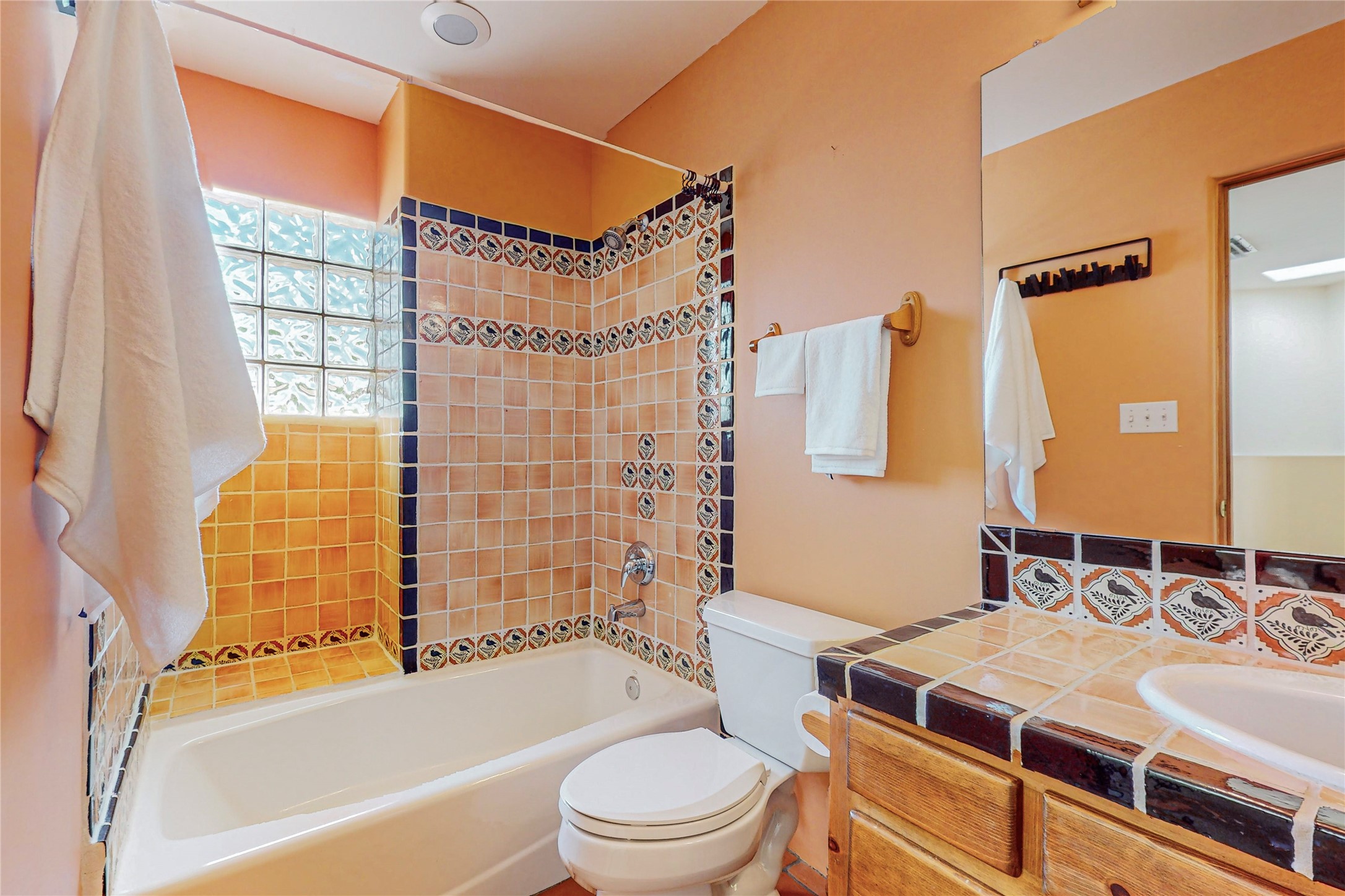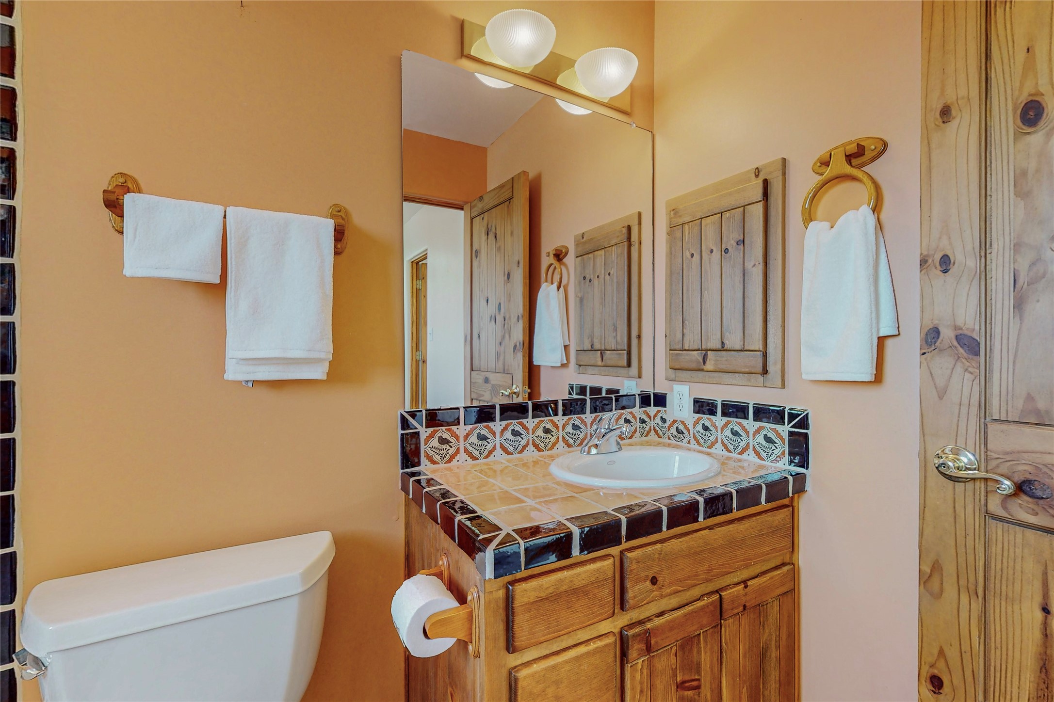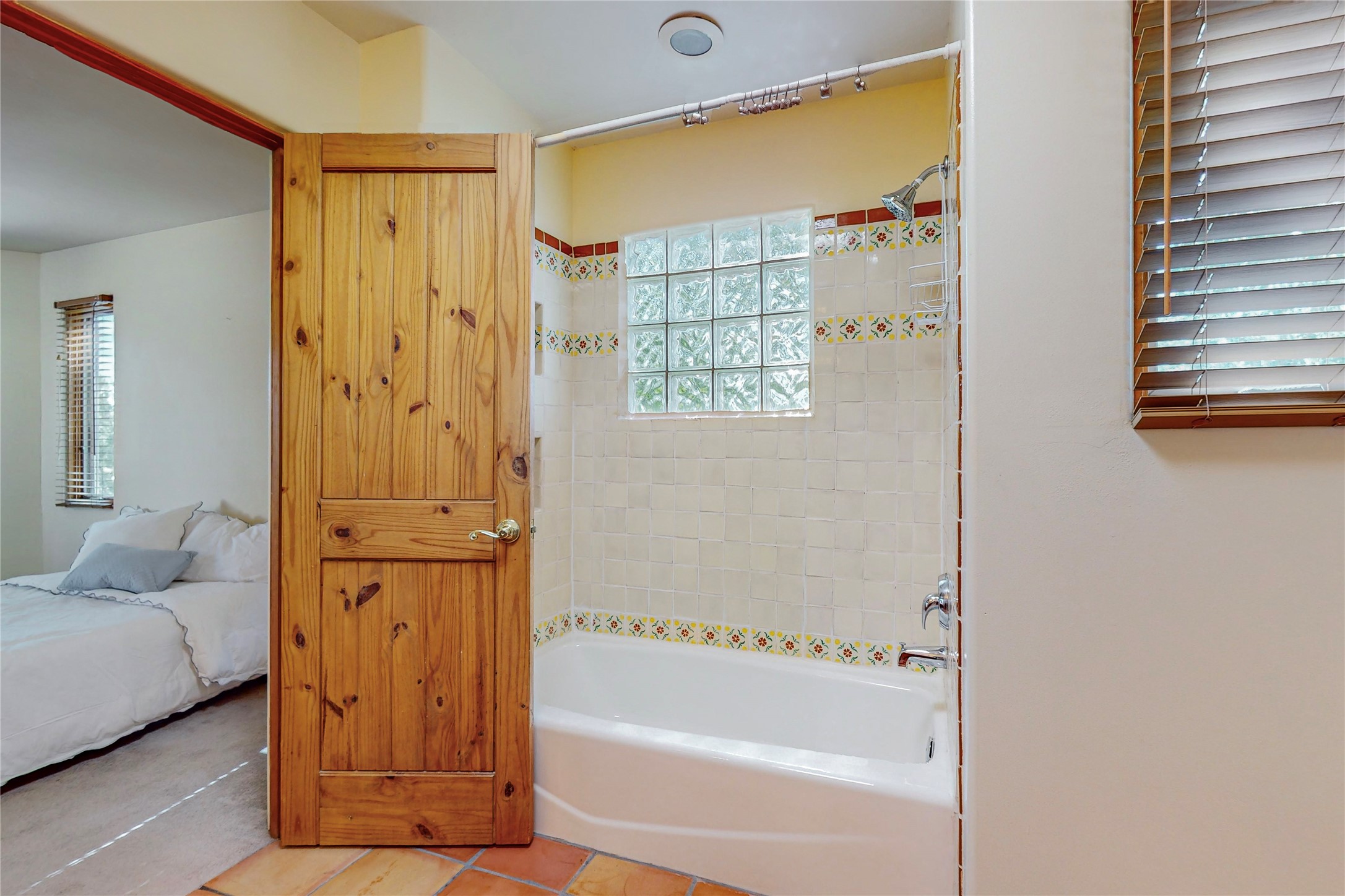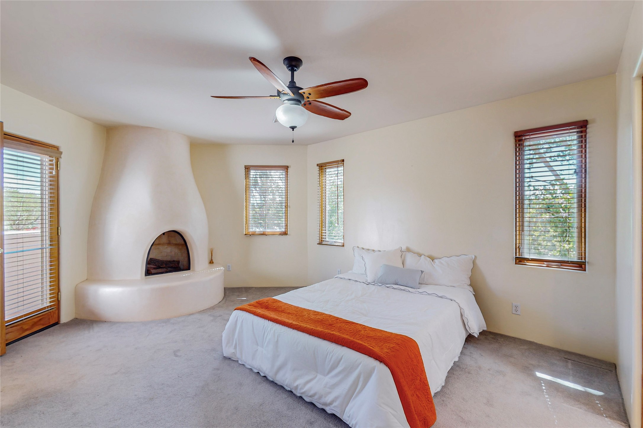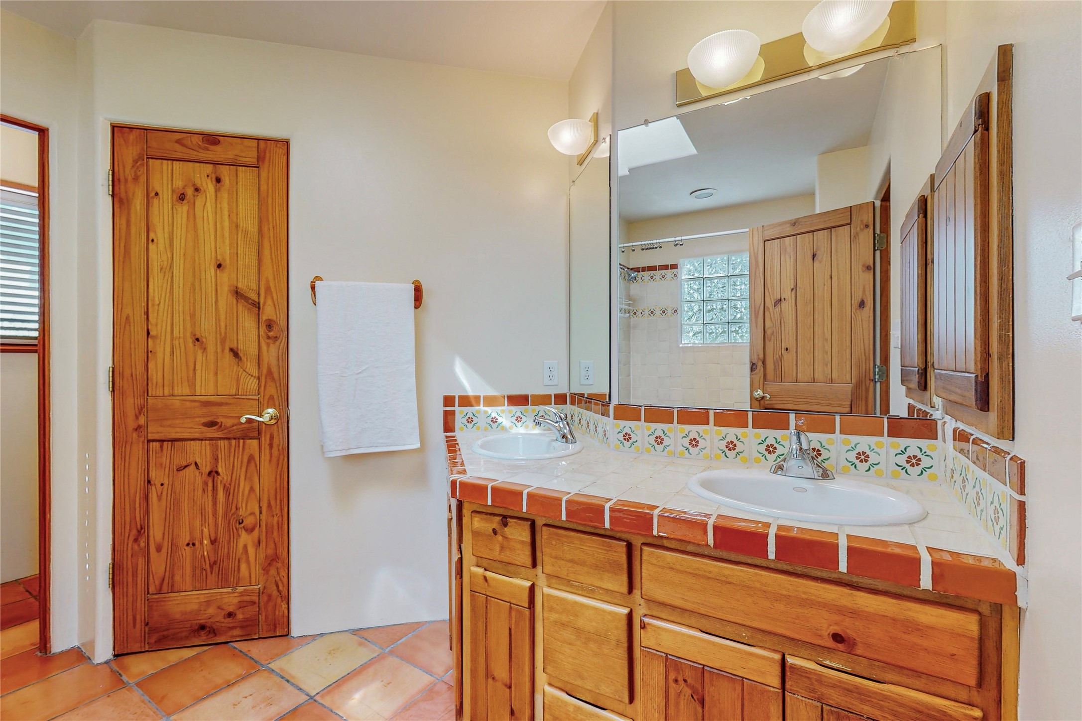 Don't miss the beautiful end unit, it overlooks green space with aspen. Full of Santa Fe Charm- Saltillo tile floors throughout the ground floor, kiva fireplaces and vigas. Bathrooms have beautiful traditional tile. Upstairs there are 2 decks, the larger one becomes an outdoor room in spring, summer and fall with beautiful views of the Sangre de Cristo and Jemez Mountains.2 car garage, with a small terraced garden off the living room.