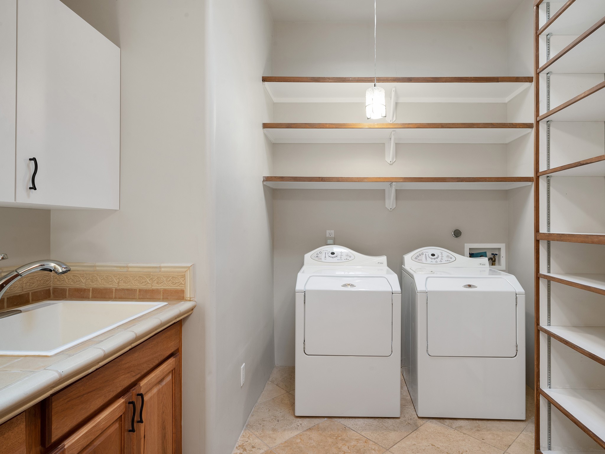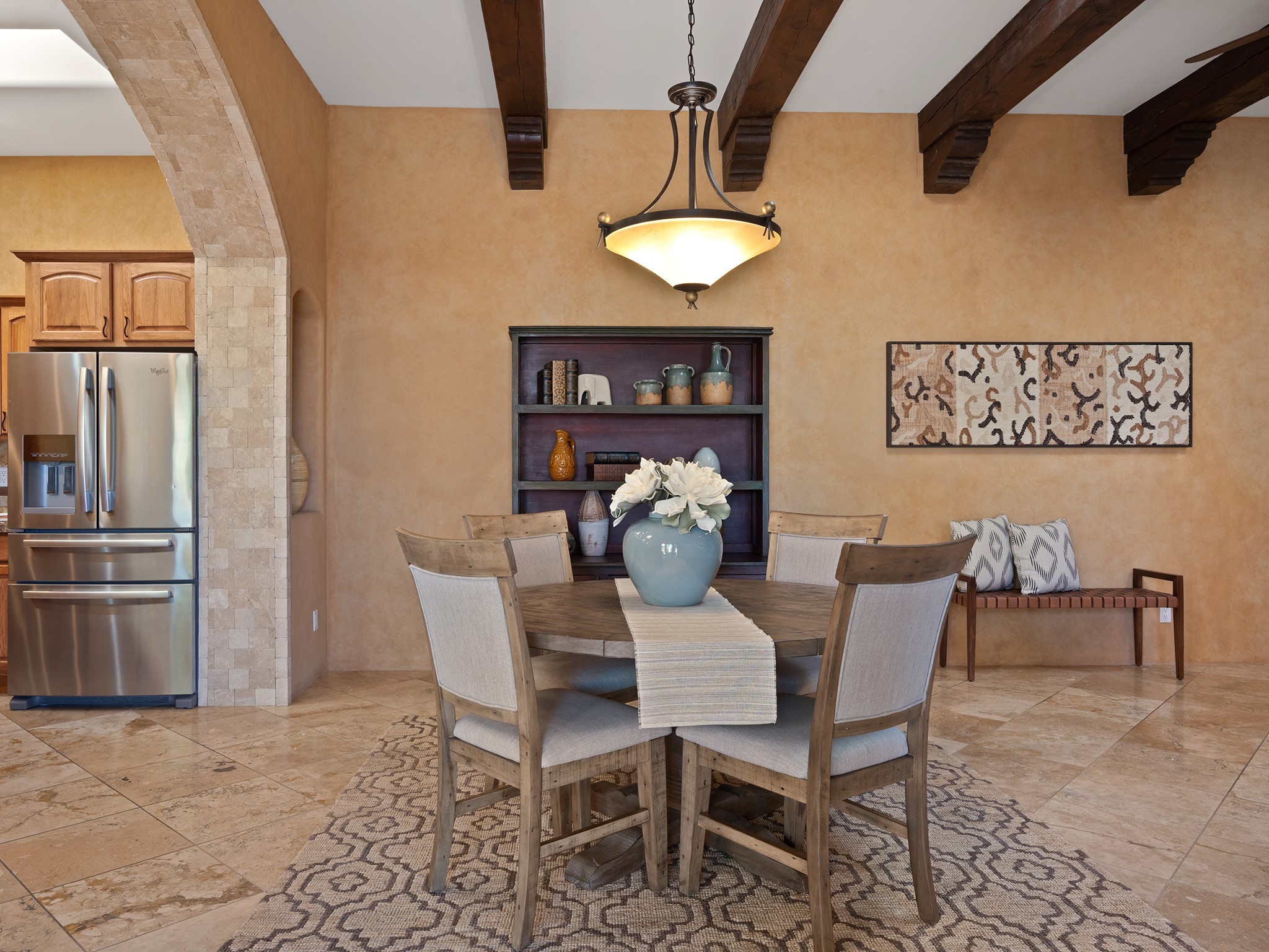Enter through the front door into this Old Mexico inspired courtyard home. Here you will find 2371 sf, 3 bedroom and 3/1/2 Baths. This romantic home features and open floor plan with 12 foot beamed ceilings, travertine floors a gas fireplace in the living room,lovely golden plaster walls and cantera stone accents found in the corbels and on the fireplace hearth. Off of the dining room there are french doors that lead to a lovely courtyard that lives like a outdoor living room where you can relax and entertain under the covered portal. You will also enjoy the calming sound of the bubbling fountain from stone forest. The kitchen has granite tile counters a gas range and tile backsplash. There are plenty of warm honey color cabinets and a bar that looks out into the courtyard. This is a great area to do work at home and take advantage of the high speed internet Aldea offers. There are two bedroom at the front of the house are spacious. One leads to the courtyard and the other has a separate entrance so you can use it as an office. The Primary bedroom is in the opposite side of the house and also has french doors that also lead to the courtyard. The primary bathroom has been upgraded with a walk in shower and a solid surface countertop. The laundry room is also conveniently located and includes cabinets, shelving and a nice sized sink.The 2 car garage is located off of the ally way with direct entry into the house. The house was stuccoed by Tesuque Stucco in April of 2014 and has some time left on the 10 year warranty. Here there is also another courtyard where you can view the sunset over the mountains. This gorgeous home finishes add to the ambiance of a special place set apart.