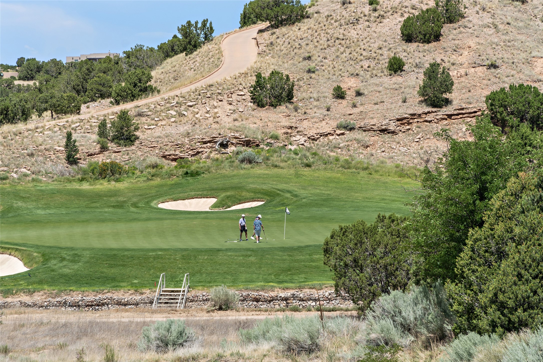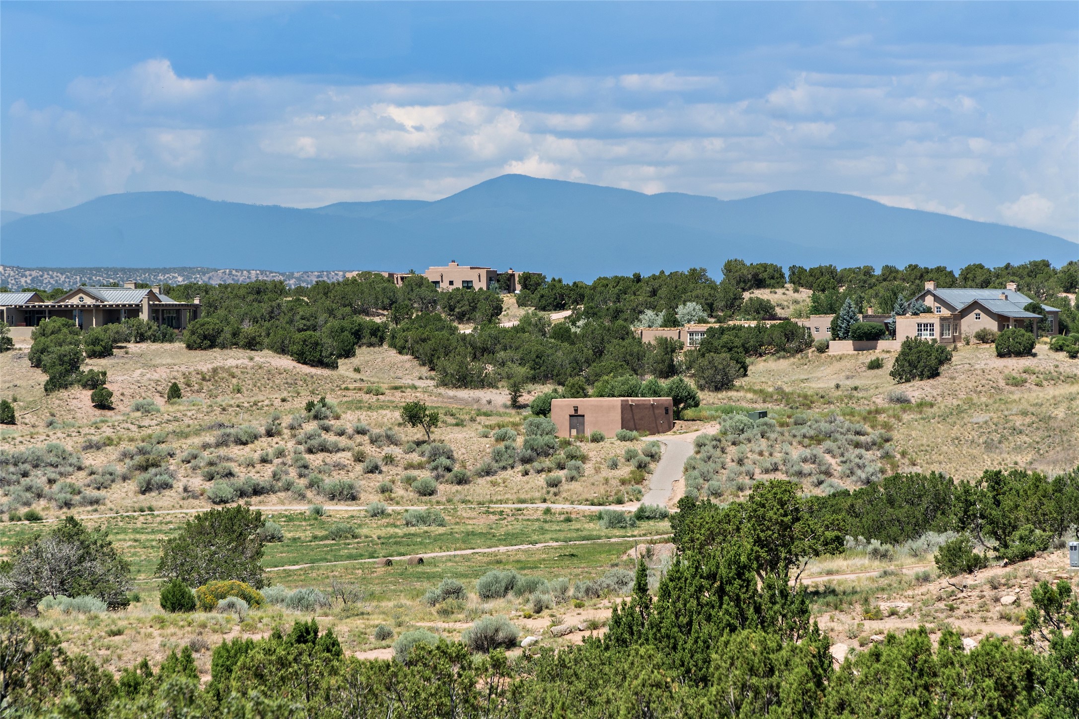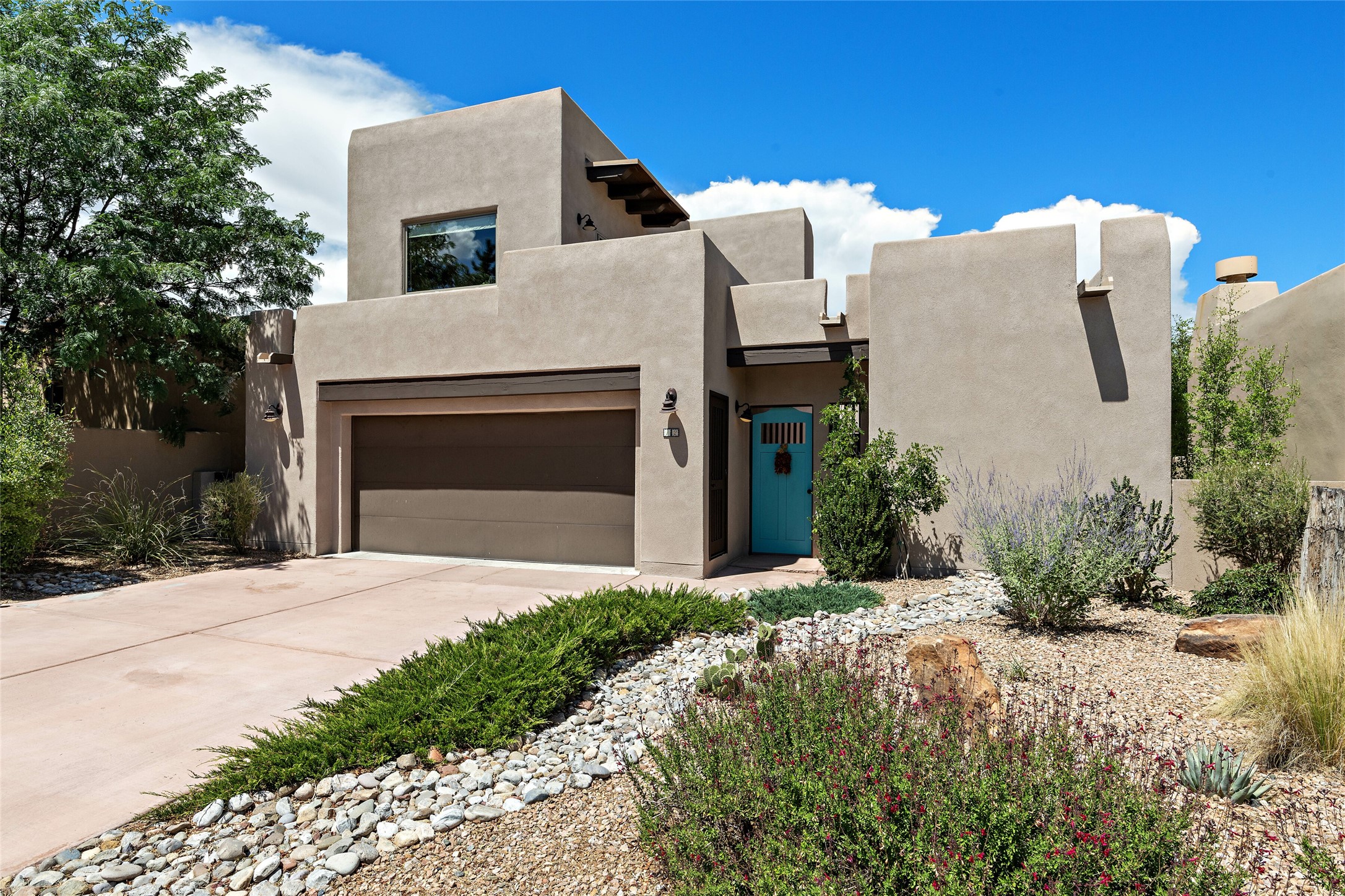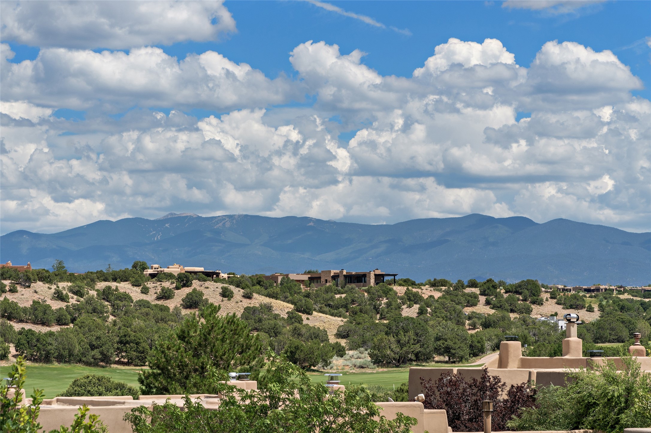 Fabulous Golf Course and Jemez Mountain Views await you from this Traditional Pueblo-style 3 Bedroom, 3 Bath home with an Office Plus private, detached space for Storage or Art & Crafts on a quiet, elevated location in the Los Santeros area of Gated Las Campanas. A Private entry gate leads you to a welcoming courtyard with space for entertaining friends & family. The home has 3 Bedrooms & 3 Baths, with one of them sequestered upstairs for the privacy of your guests. The Great Room is an Open Concept layout w/Golf Course and Jemez views plus a gas log fireplace in the Living area. The Kitchen offers quality Jenn-Air stainless steel appliances plus a large island for entertaining friend & family while you cook as well as a spot to enjoy a casual meal. The Back Portal enjoys the same great Golf Course & Jemez Western views as well as space for dining & entertaining. The Master Bedroom also has Golf Course & Jemez views with an en-suite bath including 2 separate sinks, walk-in closet, separate tub & shower plus compartmented water closet. Bedroom Two / Den / Media is sequestered from the Master and has two spacious closets plus an adjacent full bath. The Third bedroom with en-suite 3/4 bath is located upstairs and has a deck with a fabulous Sangre de Cristo View. The Laundry Room has room for a side-by-side Washer / Dryer set, as well a handy closet. The private, detached Storage Space / Arts & Crafts area is outfitted with lots of shelving for hobbies or additional storage, but is not heated or cooled. The 2-car garage has shelves on both sides for very generous storage. This home is a Great value, with Panoramic Golf Course and Jemez Mountain Views, a private Storage Space / Arts & Crafts area and a quiet, elevated location.