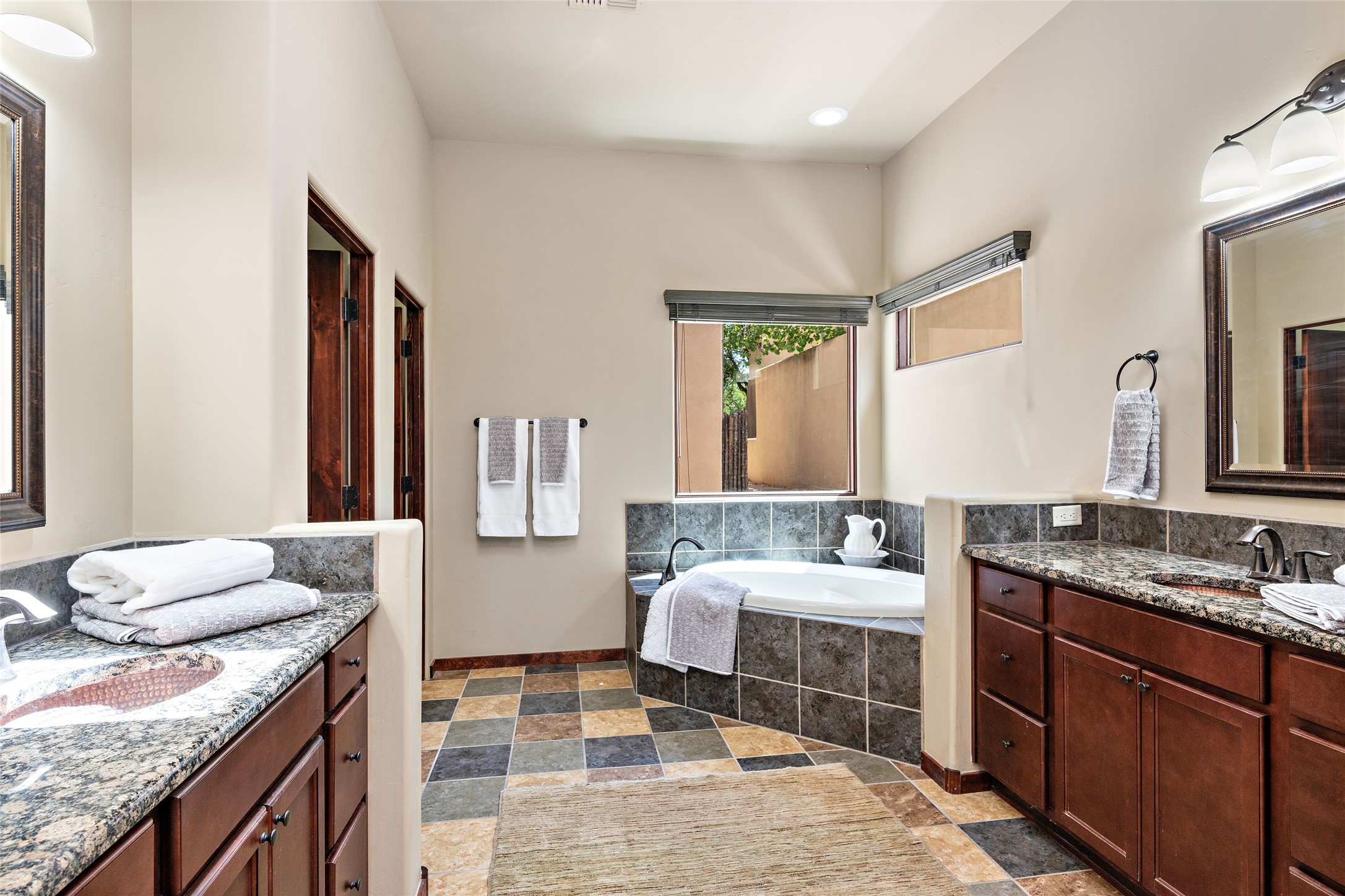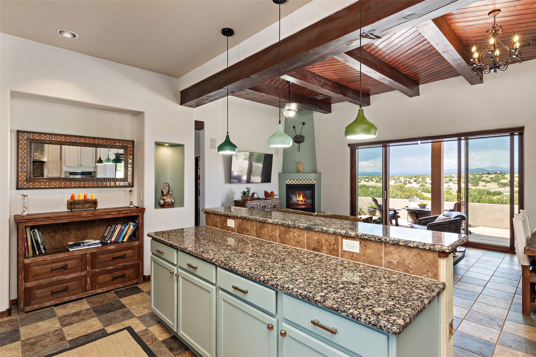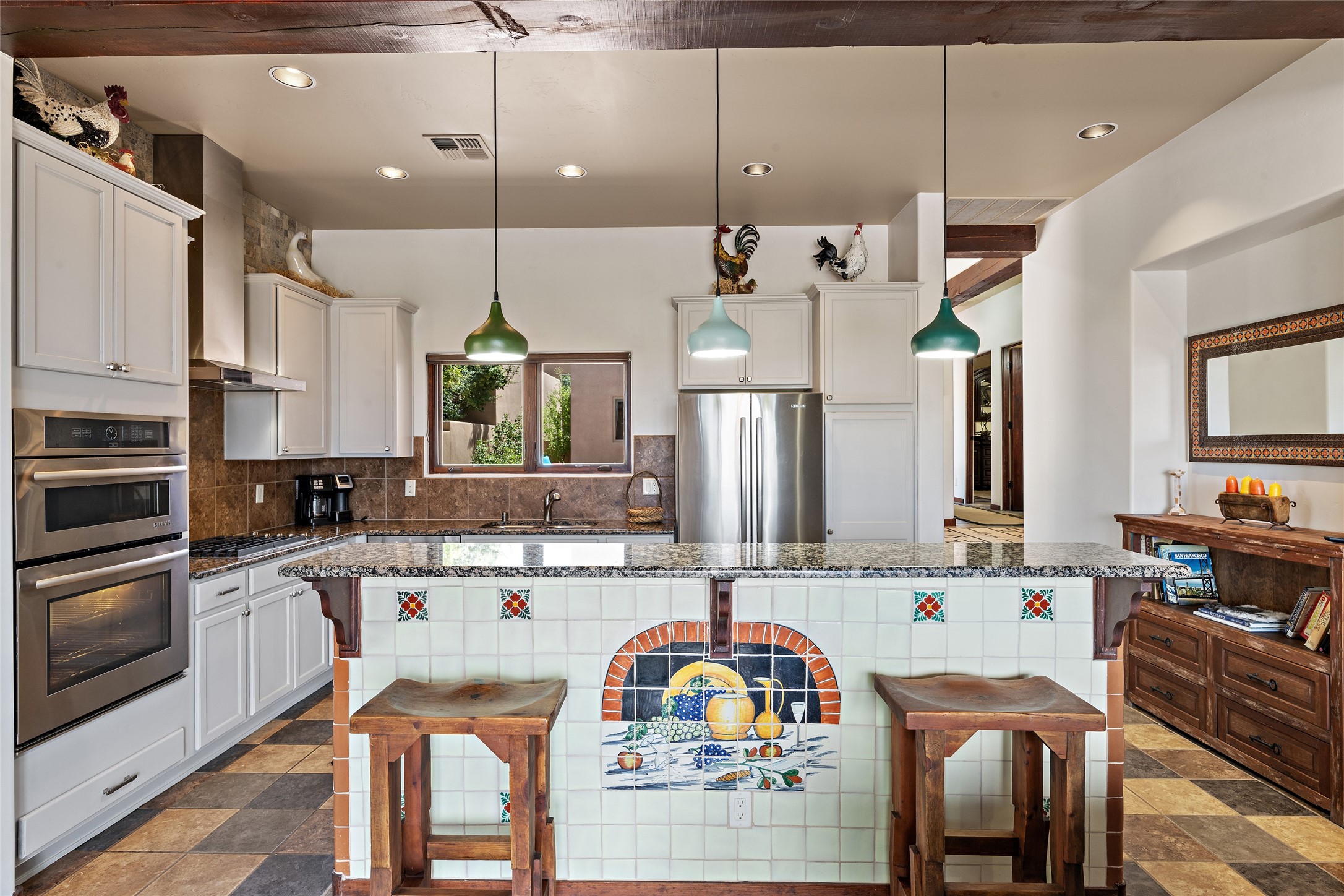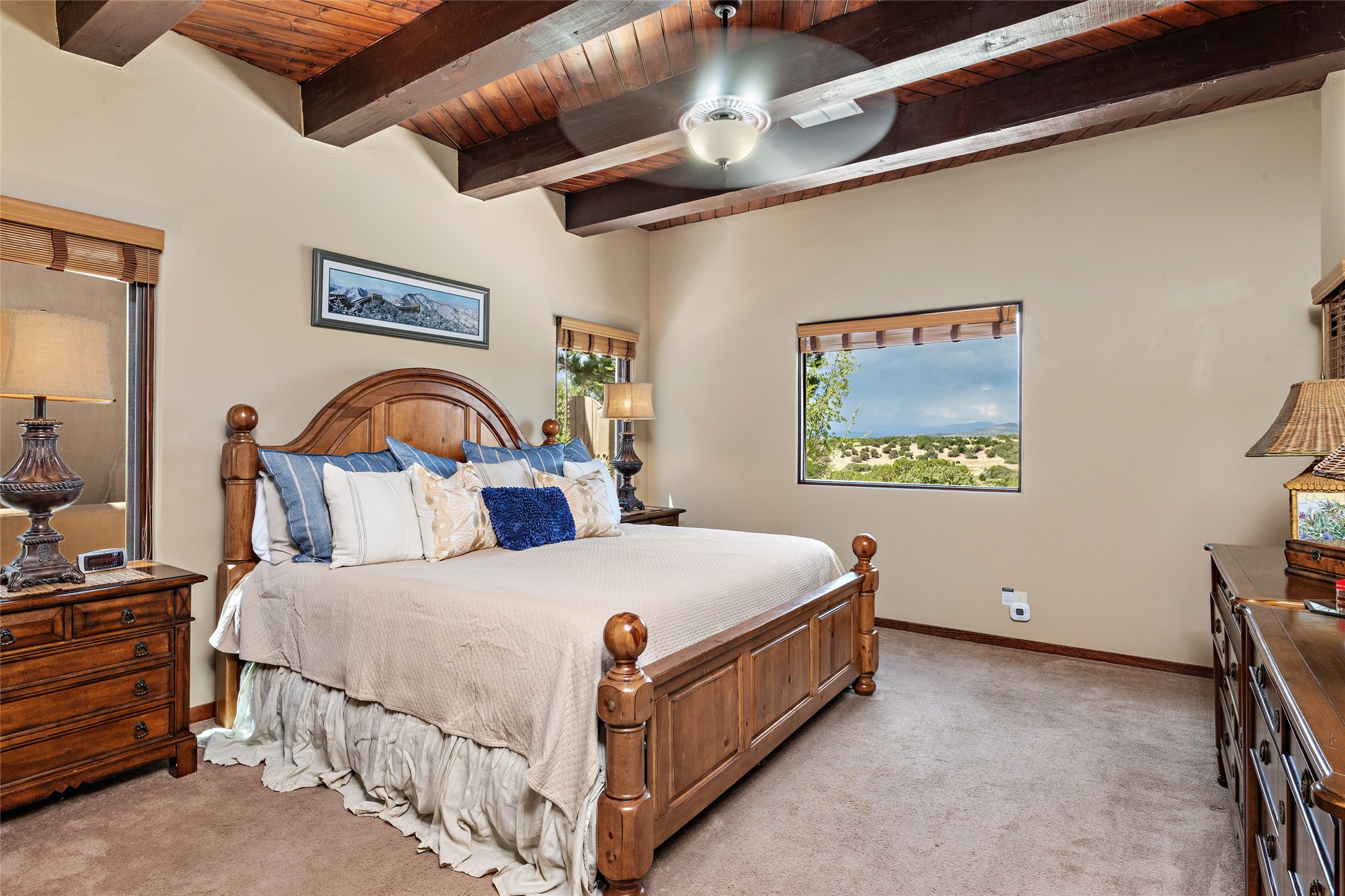 Fabulous Golf Course and Jemez Mountain Views await you from this Traditional Pueblo-style 3 Bedroom, 3 Bath home with an Office Plus private, detached space for Storage or Art & Crafts on a quiet, elevated location in the Los Santeros area of Gated Las Campanas. A Private entry gate leads you to a welcoming courtyard with space for entertaining friends & family. The home has 3 Bedrooms & 3 Baths, with one of them sequestered upstairs for the privacy of your guests. The Great Room is an Open Concept layout w/Golf Course and Jemez views plus a gas log fireplace in the Living area. The Kitchen offers quality Jenn-Air stainless steel appliances plus a large island for entertaining friend & family while you cook as well as a spot to enjoy a casual meal. The Back Portal enjoys the same great Golf Course & Jemez Western views as well as space for dining & entertaining. The Master Bedroom also has Golf Course & Jemez views with an en-suite bath including 2 separate sinks, walk-in closet, separate tub & shower plus compartmented water closet. Bedroom Two / Den / Media is sequestered from the Master and has two spacious closets plus an adjacent full bath. The Third bedroom with en-suite 3/4 bath is located upstairs and has a deck with a fabulous Sangre de Cristo View. The Laundry Room has room for a side-by-side Washer / Dryer set, as well a handy closet. The private, detached Storage Space / Arts & Crafts area is outfitted with lots of shelving for hobbies or additional storage, but is not heated or cooled. The 2-car garage has shelves on both sides for very generous storage. This home is a Great value, with Panoramic Golf Course and Jemez Mountain Views, a private Storage Space / Arts & Crafts area and a quiet, elevated location.