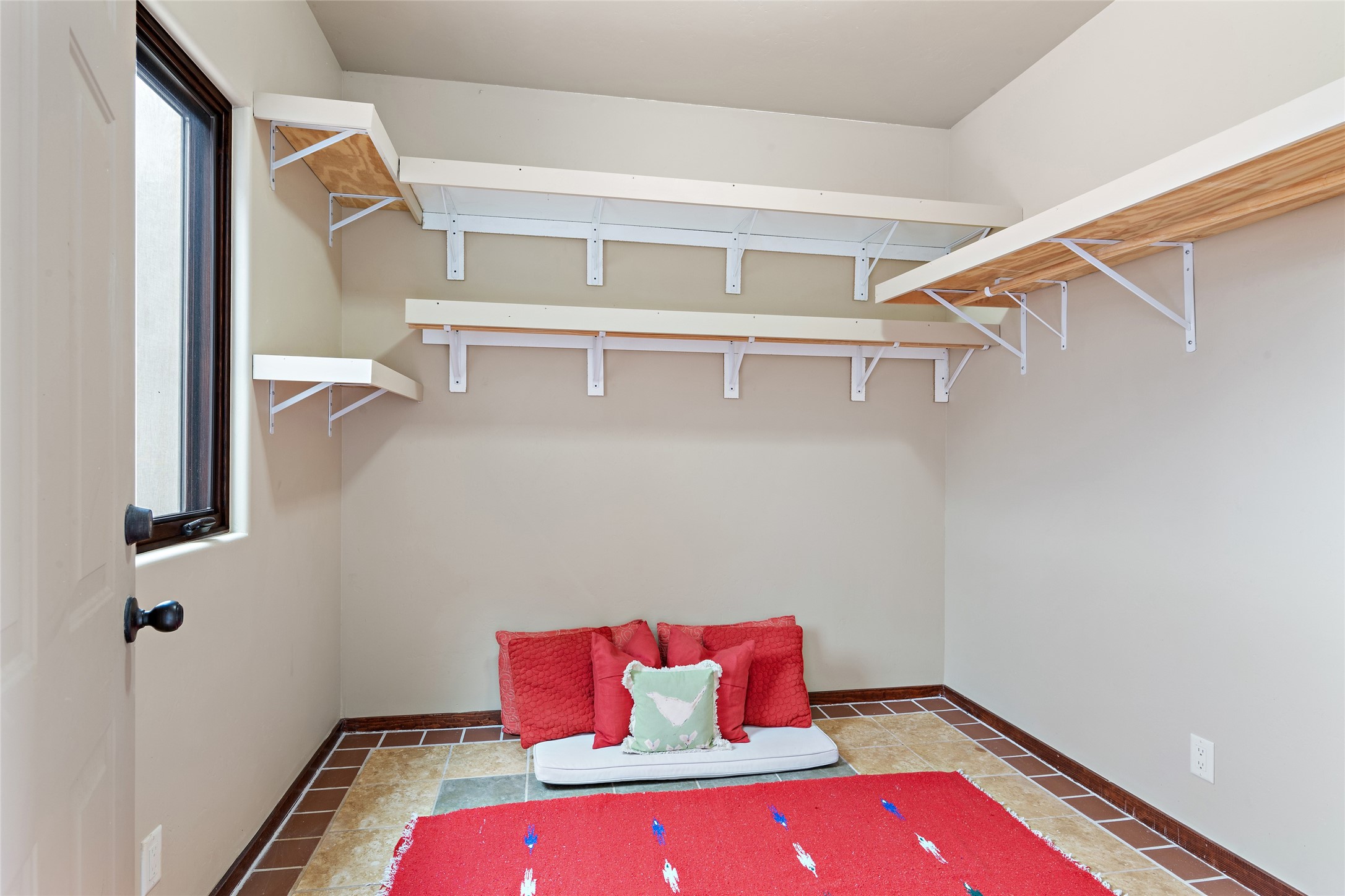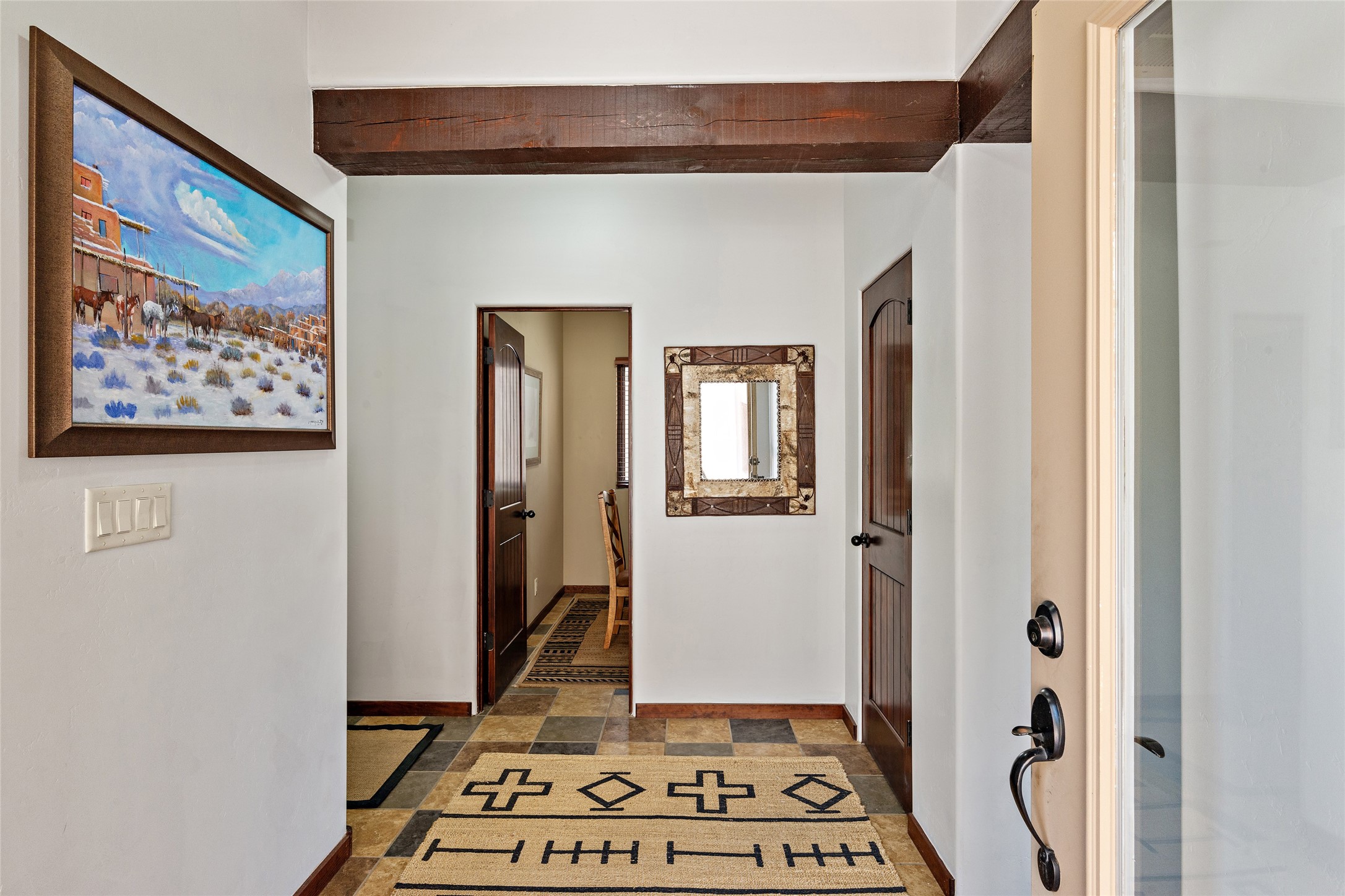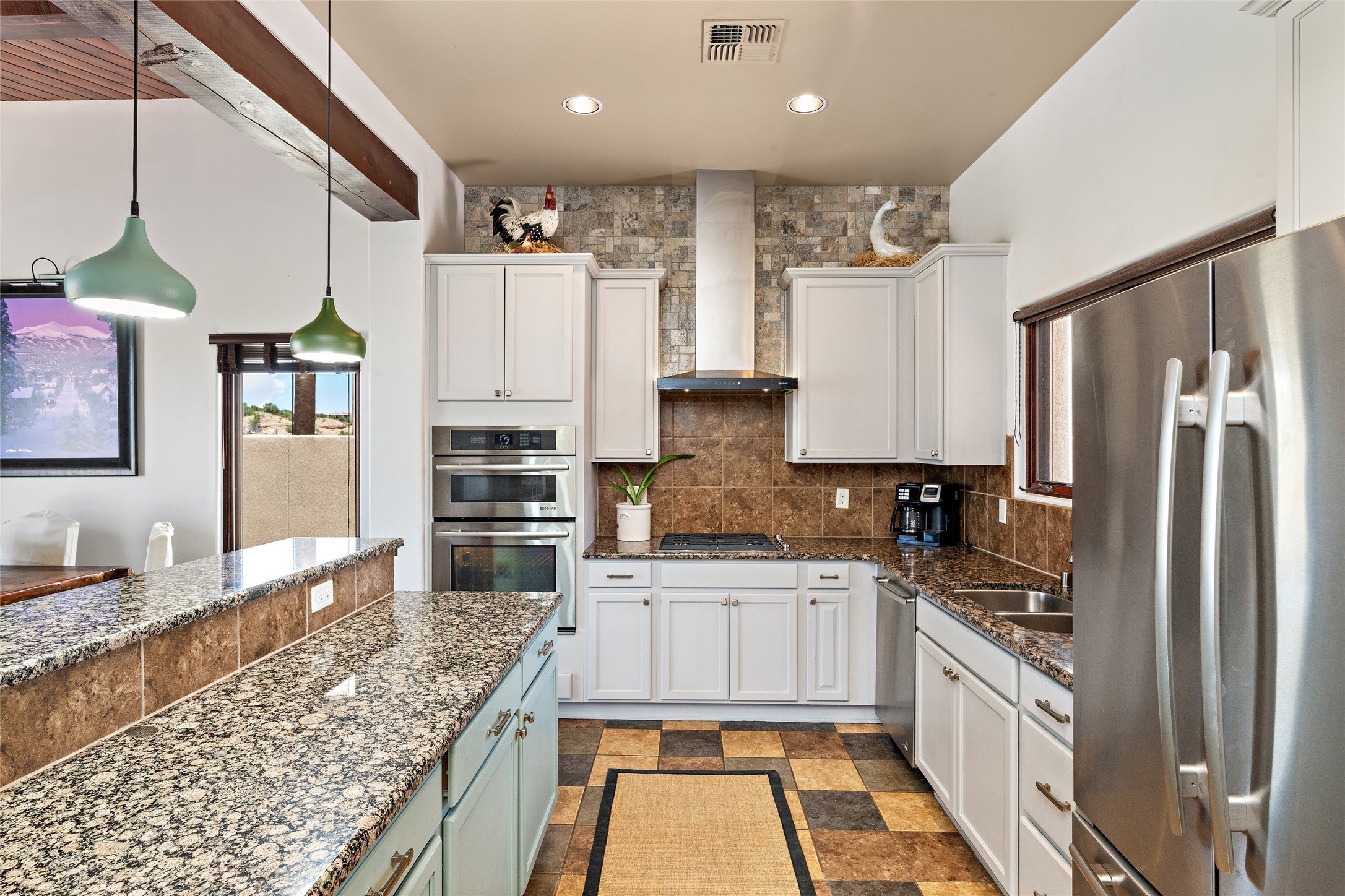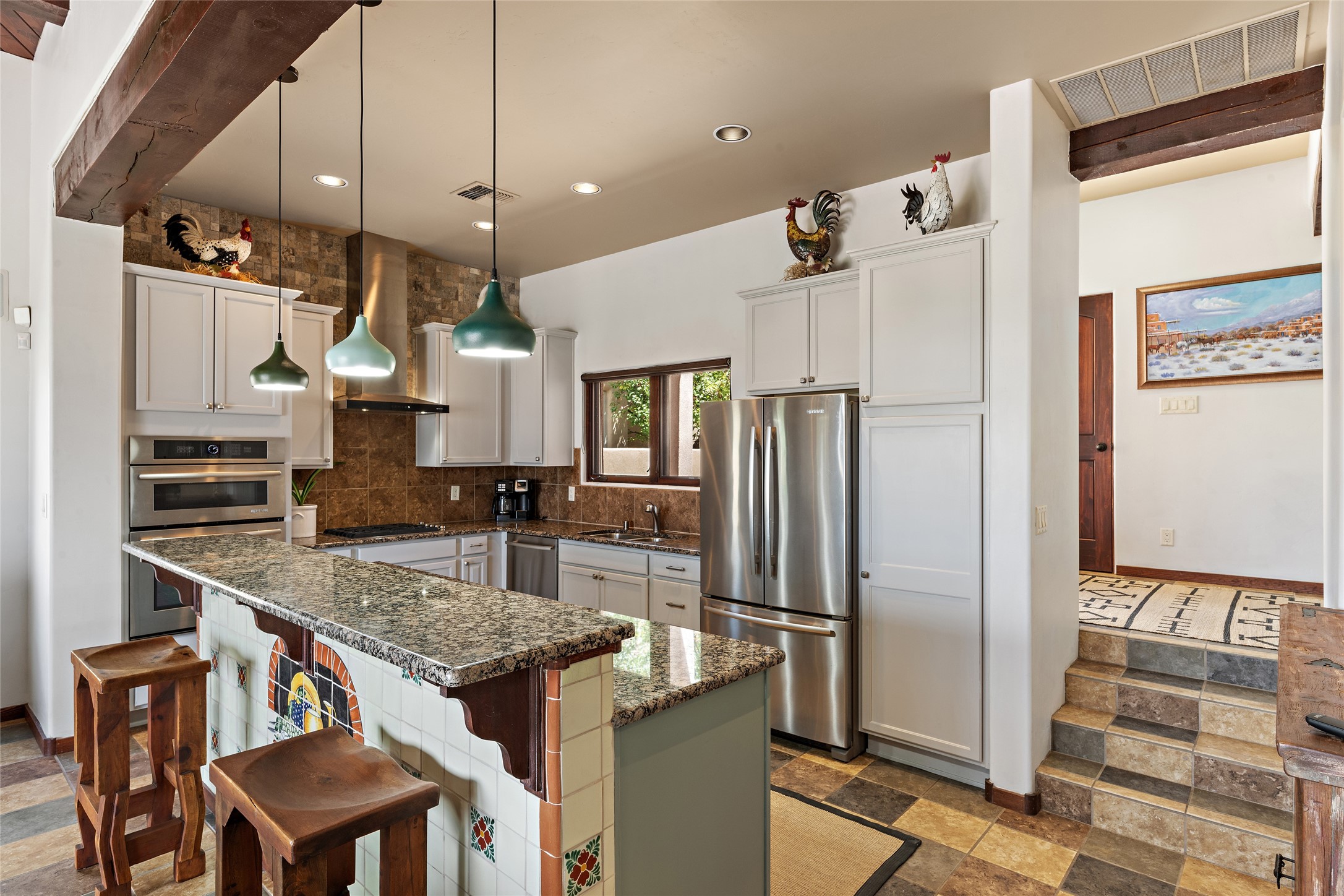 Fabulous Golf Course and Jemez Mountain Views await you from this Traditional Pueblo-style 3 Bedroom, 3 Bath home with an Office Plus private, detached space for Storage or Art & Crafts on a quiet, elevated location in the Los Santeros area of Gated Las Campanas. A Private entry gate leads you to a welcoming courtyard with space for entertaining friends & family. The home has 3 Bedrooms & 3 Baths, with one of them sequestered upstairs for the privacy of your guests. The Great Room is an Open Concept layout w/Golf Course and Jemez views plus a gas log fireplace in the Living area. The Kitchen offers quality Jenn-Air stainless steel appliances plus a large island for entertaining friend & family while you cook as well as a spot to enjoy a casual meal. The Back Portal enjoys the same great Golf Course & Jemez Western views as well as space for dining & entertaining. The Master Bedroom also has Golf Course & Jemez views with an en-suite bath including 2 separate sinks, walk-in closet, separate tub & shower plus compartmented water closet. Bedroom Two / Den / Media is sequestered from the Master and has two spacious closets plus an adjacent full bath. The Third bedroom with en-suite 3/4 bath is located upstairs and has a deck with a fabulous Sangre de Cristo View. The Laundry Room has room for a side-by-side Washer / Dryer set, as well a handy closet. The private, detached Storage Space / Arts & Crafts area is outfitted with lots of shelving for hobbies or additional storage, but is not heated or cooled. The 2-car garage has shelves on both sides for very generous storage. This home is a Great value, with Panoramic Golf Course and Jemez Mountain Views, a private Storage Space / Arts & Crafts area and a quiet, elevated location.